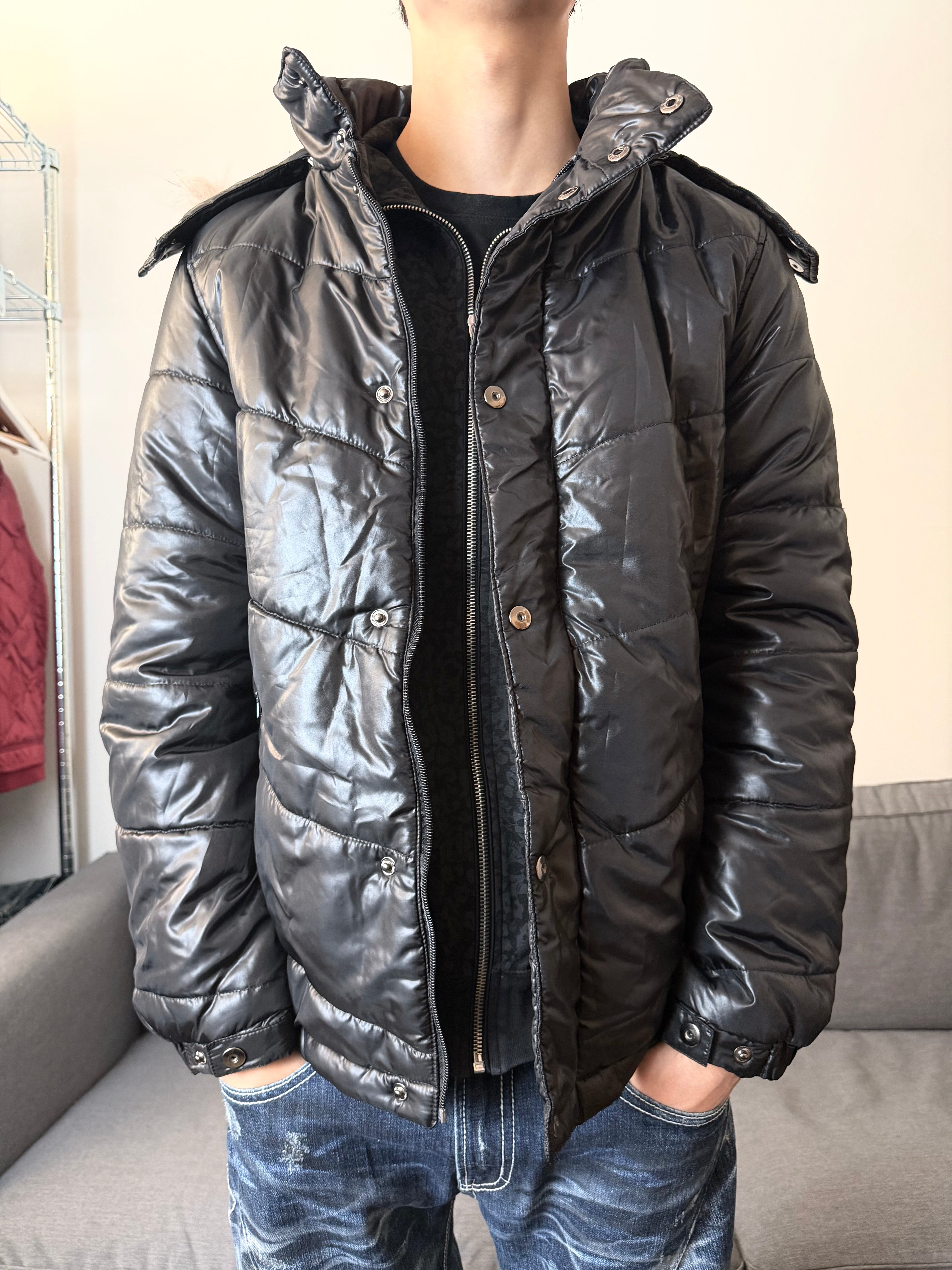 A moody, heavy-weather essential infused with that unmistakable Japanese archive aura. This AMORTE puffer in deep, glossy black carries the same cinematic cool found in early 2000s Harajuku outerwear—mysterious, functional, and quietly intense.