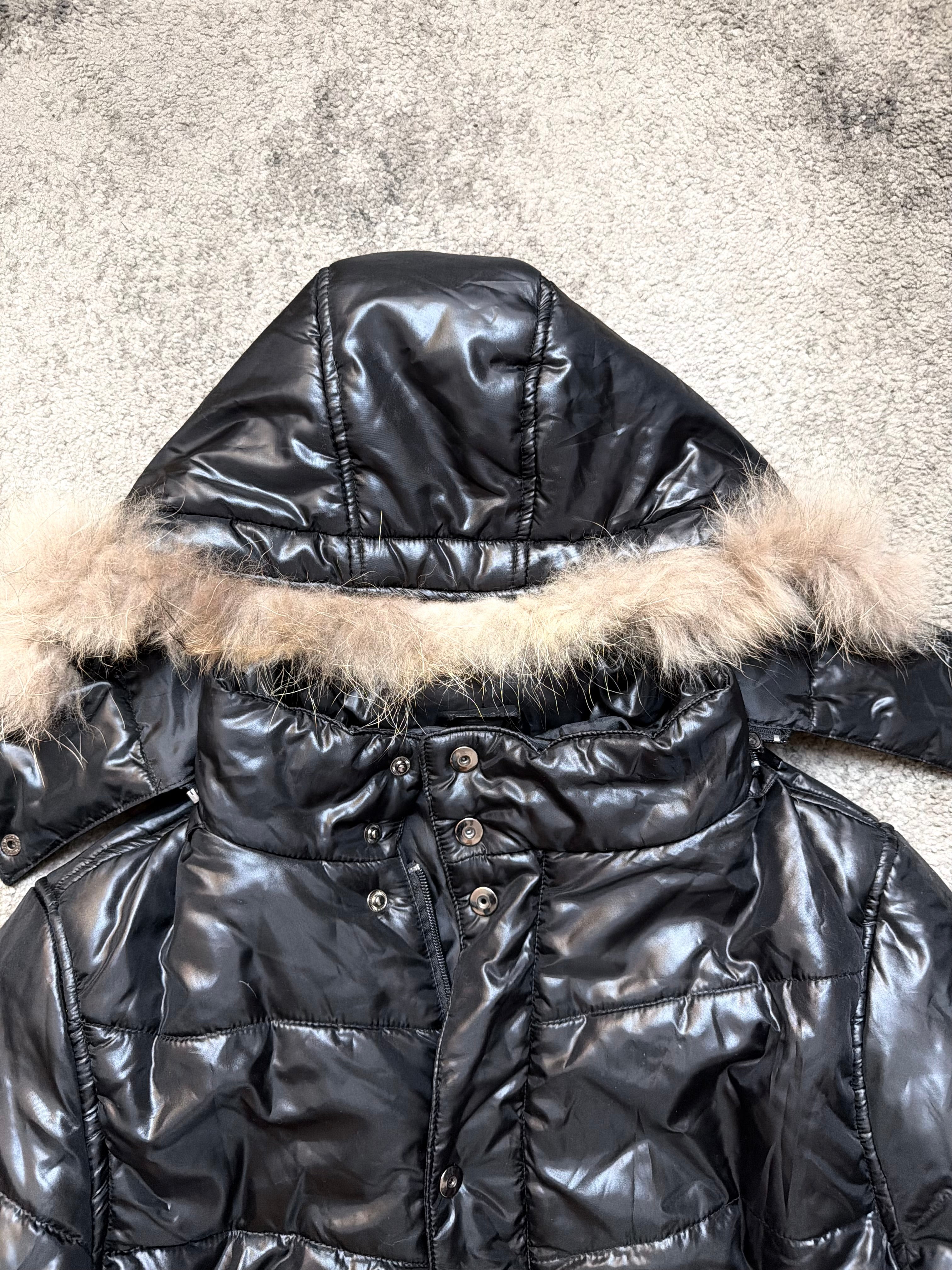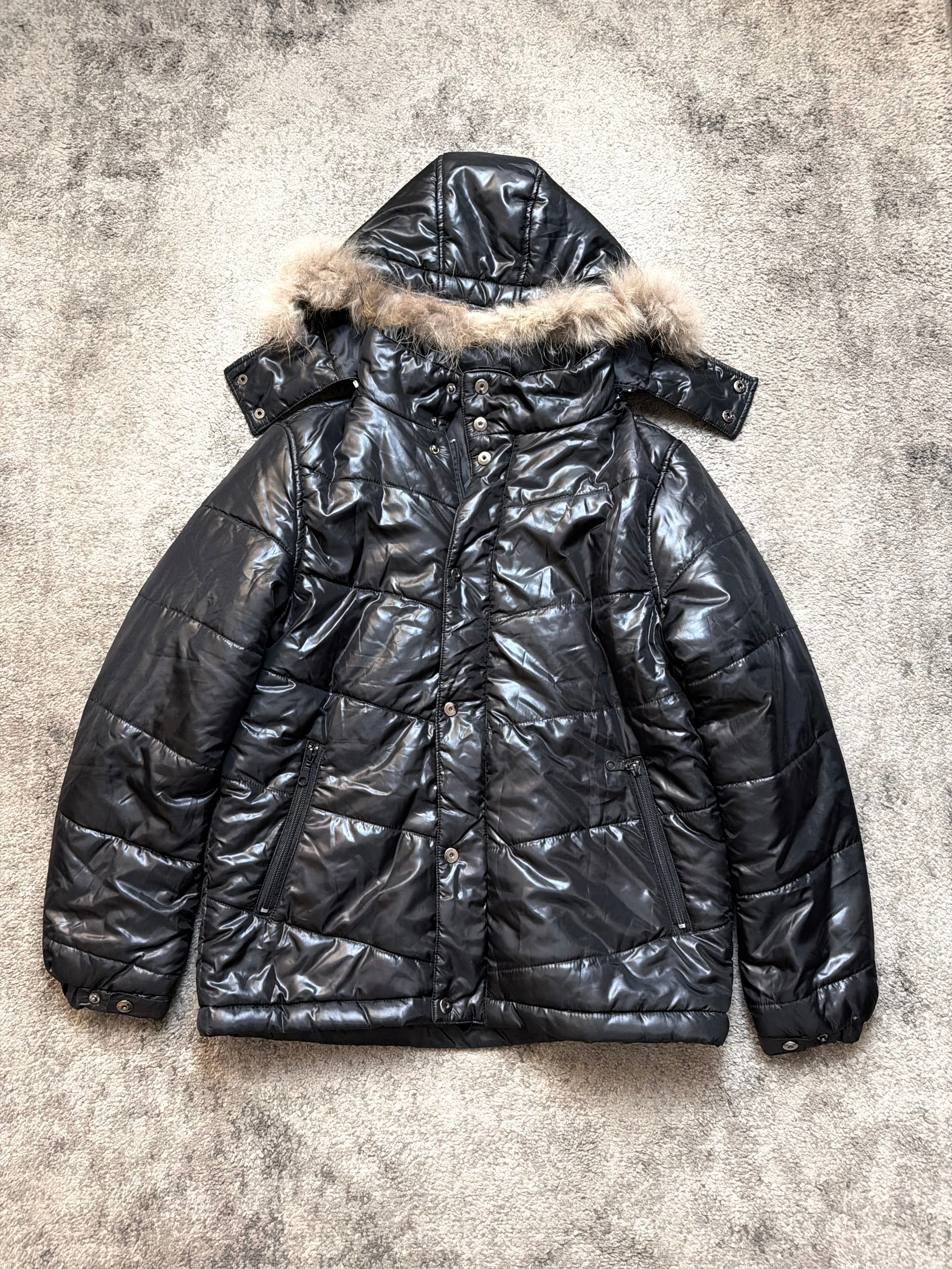 Built from a durable quilted nylon shell with a warm down-style fill, the jacket features a detachable fur-trimmed hood, metal snaps, and angular paneling that gives it a structured, almost tactical silhouette. Two zipped side pockets keep it practical while maintaining the sleek, archive-forward look.