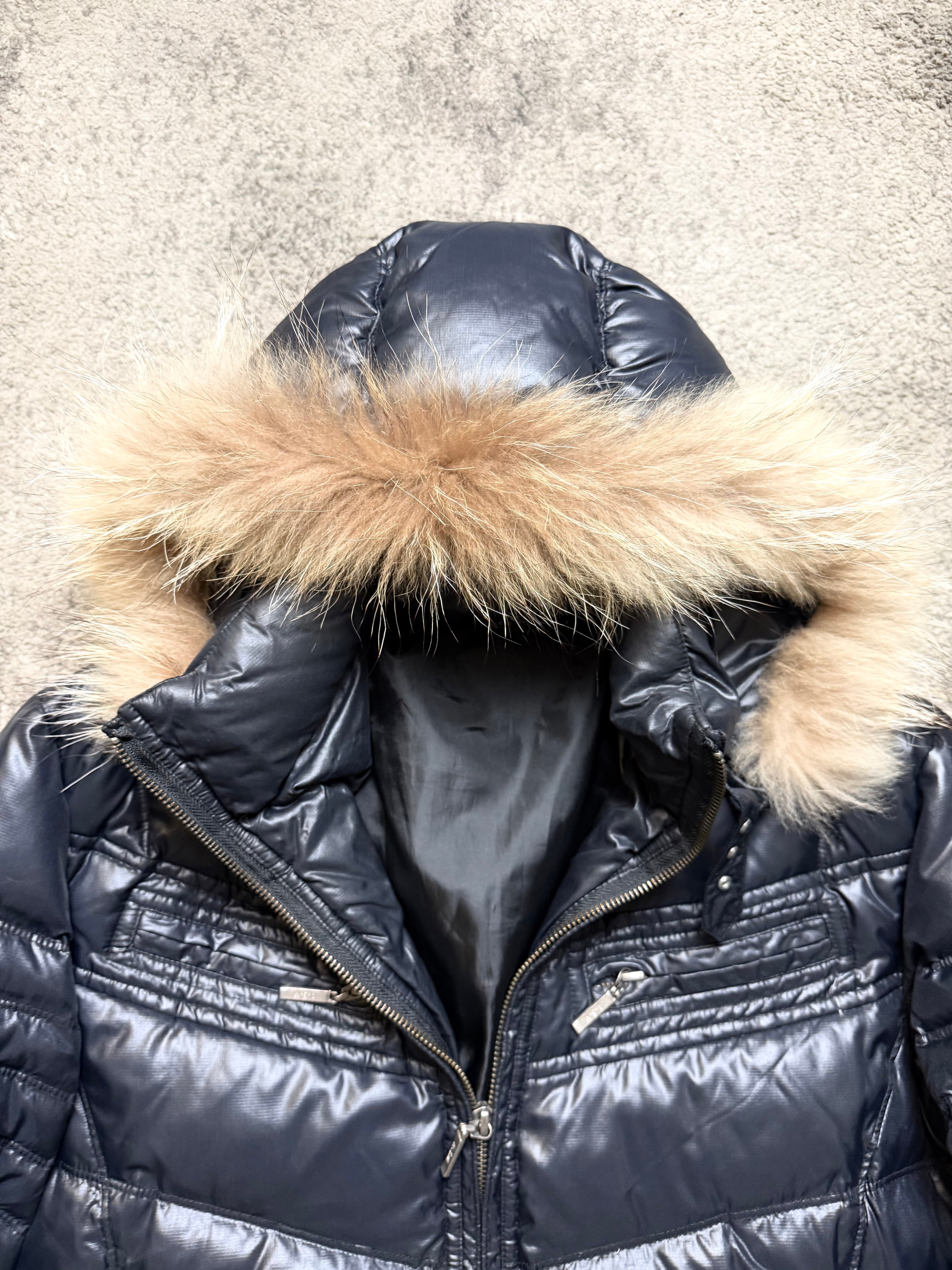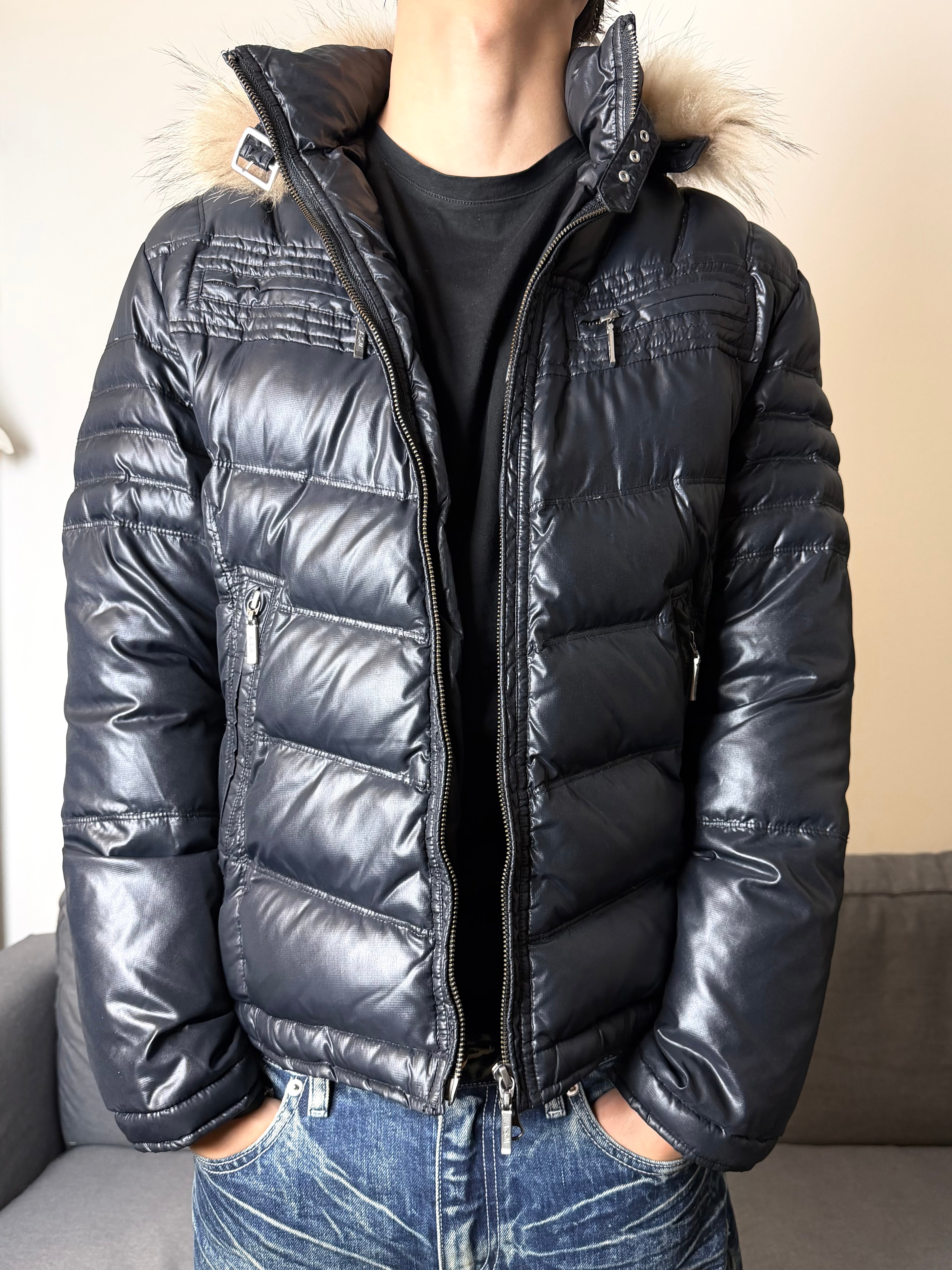 A dark, emotional archive piece from ASM, channeling the sleek aggression and melancholic mood of early Number Nine and ifsixwasnine. The glossy black shell, sharp quilting, and fur-trimmed hood give this jacket a cold, urban energy — quiet but powerful.