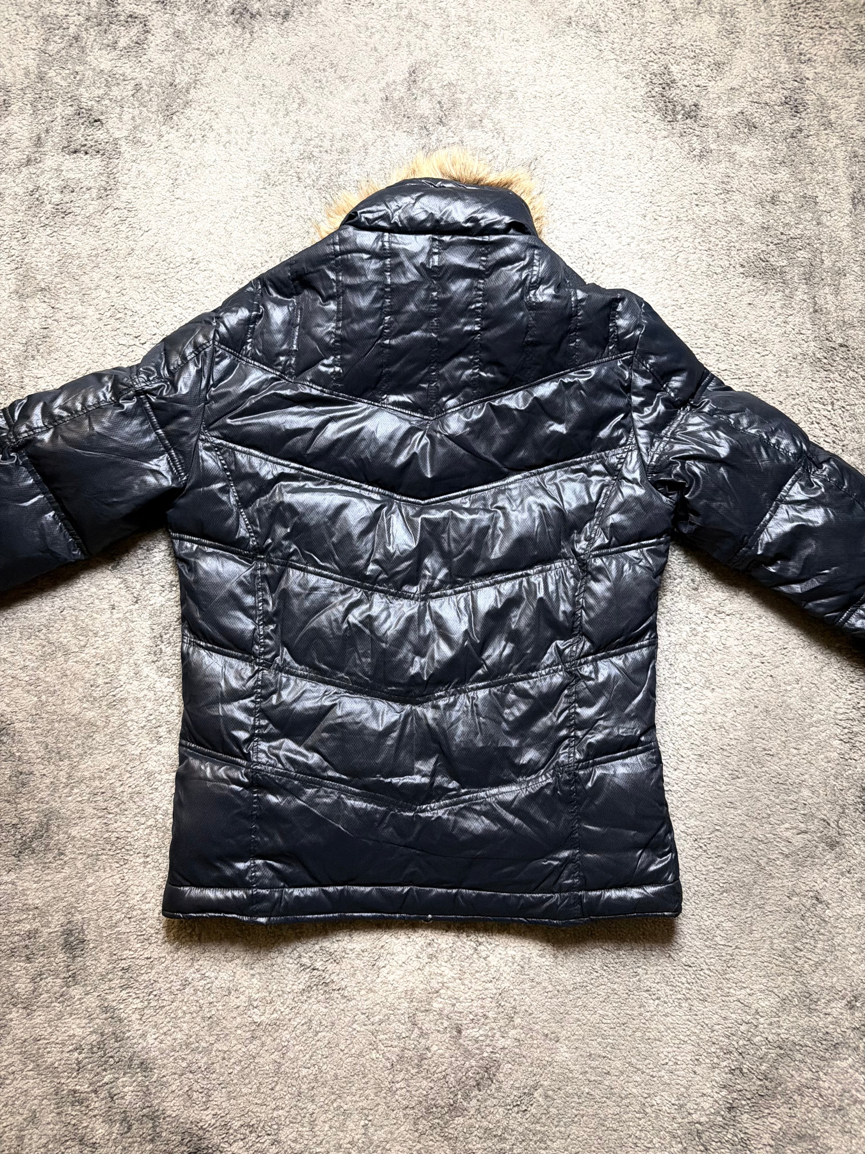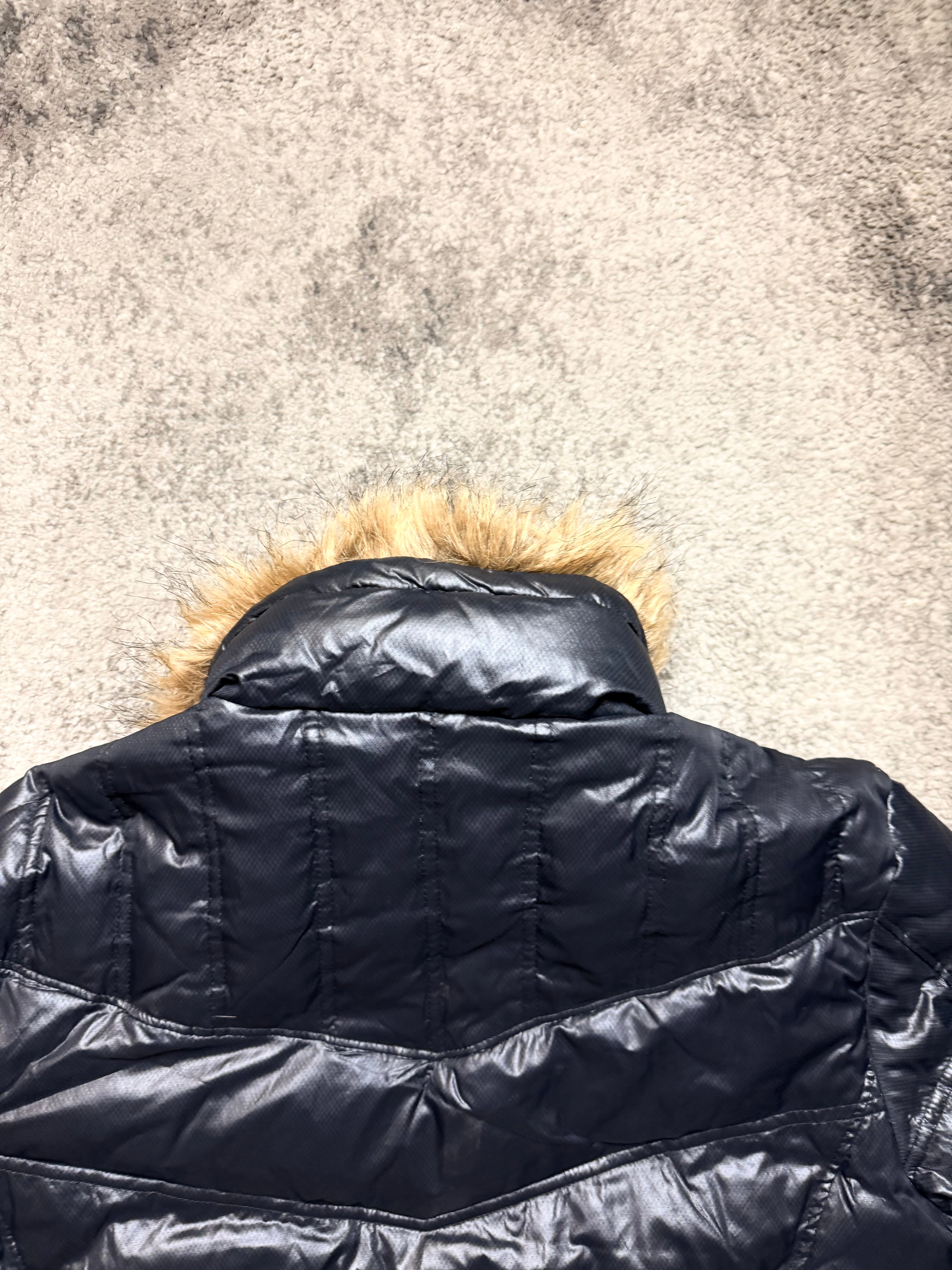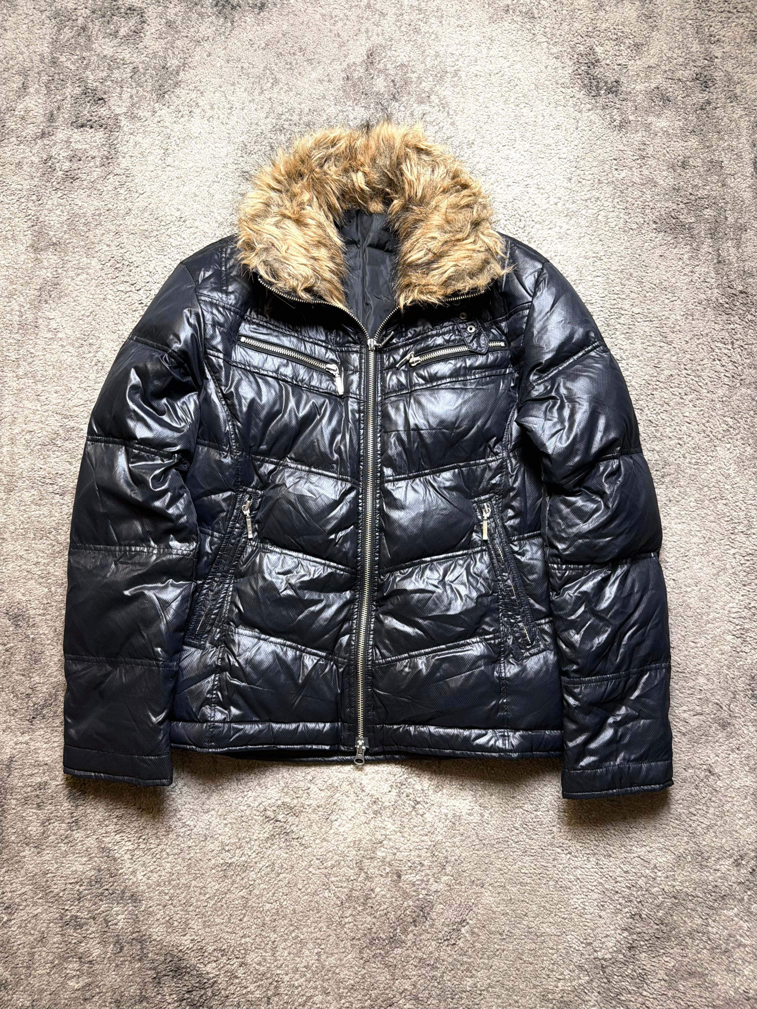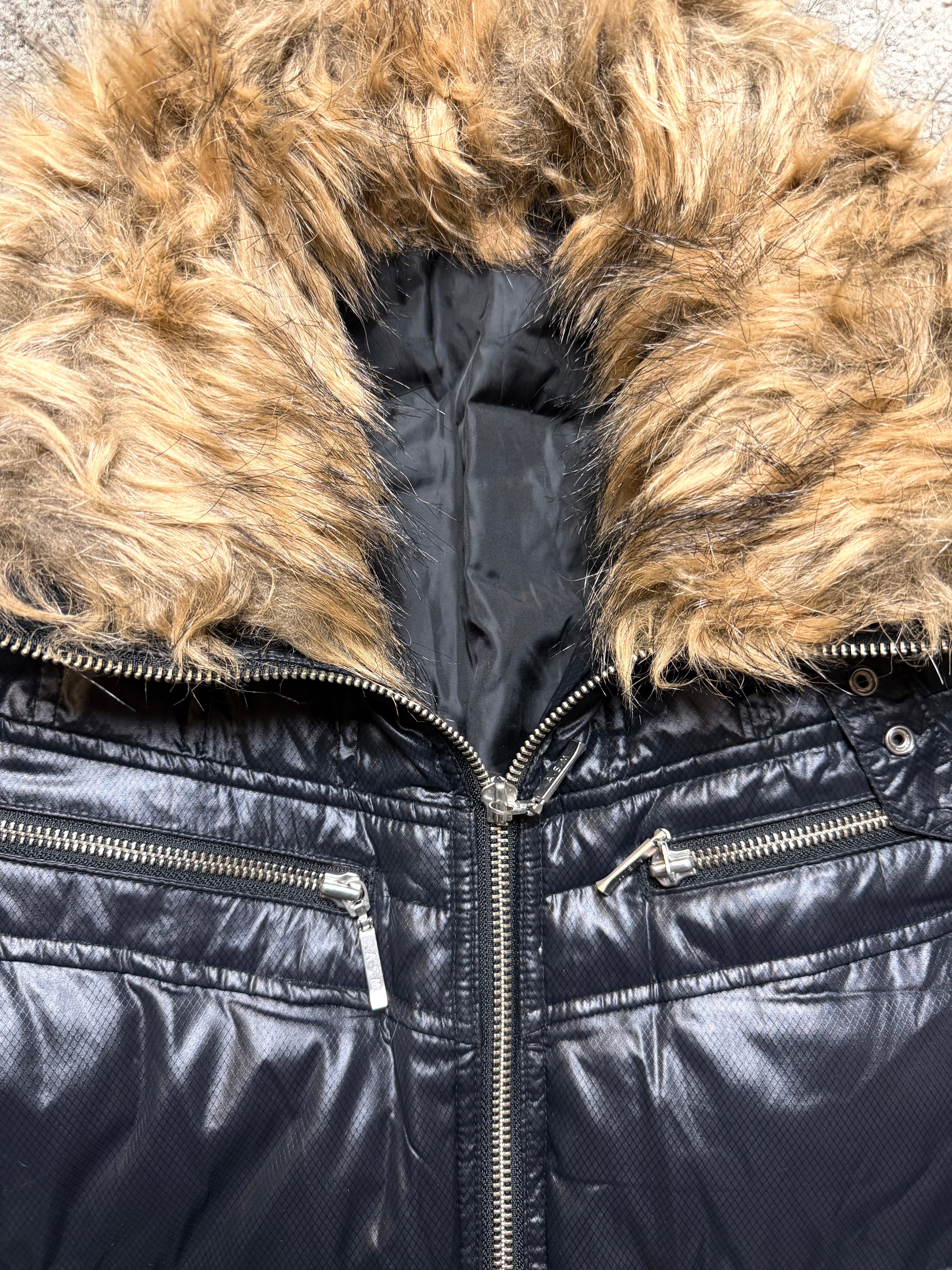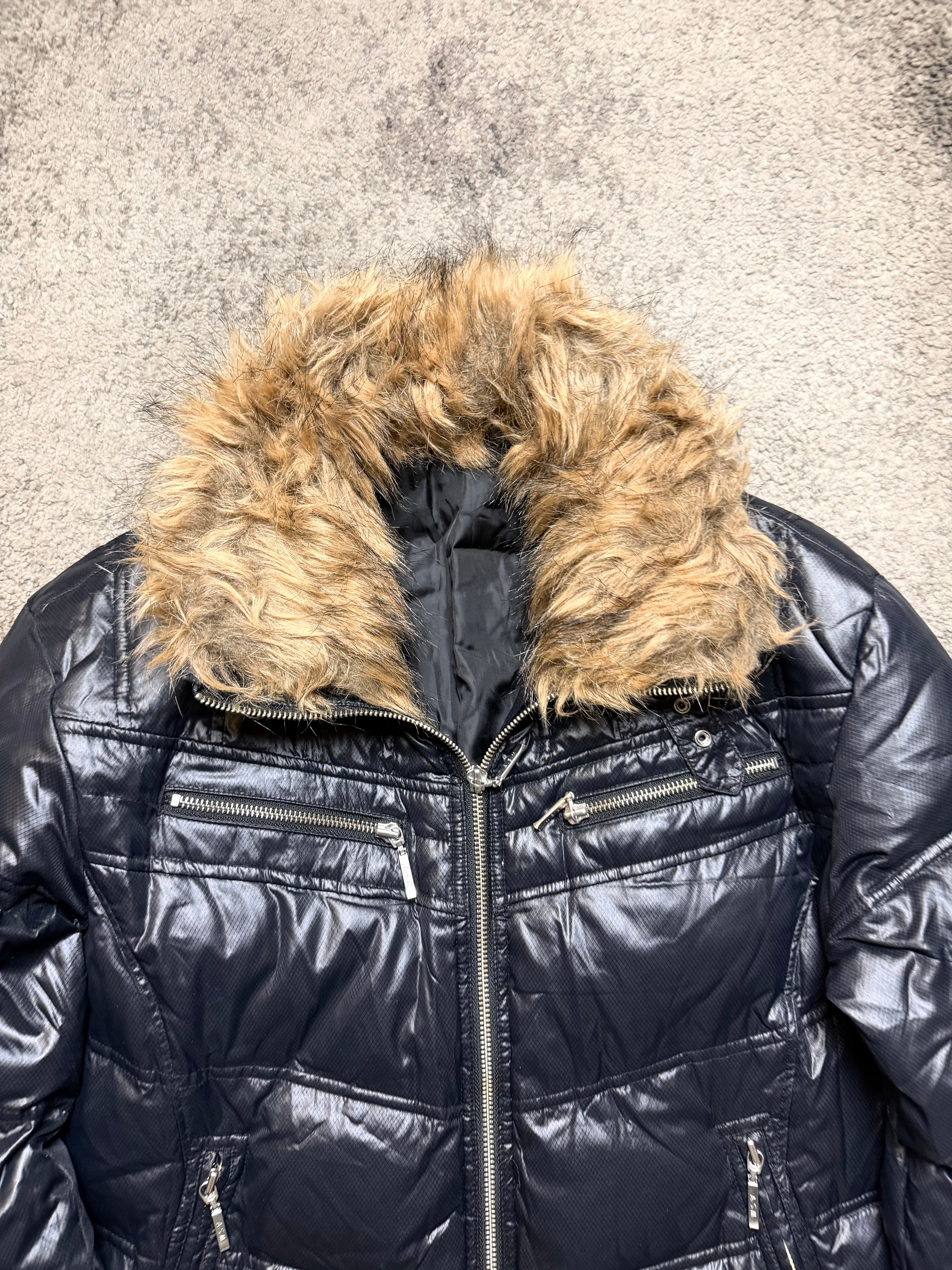 Material: Glossy synthetic shell with insulated padding. Faux-fur collar adds warmth and a touch of decadent contrast. Smooth, reflective finish with a slightly worn-in archive feel.