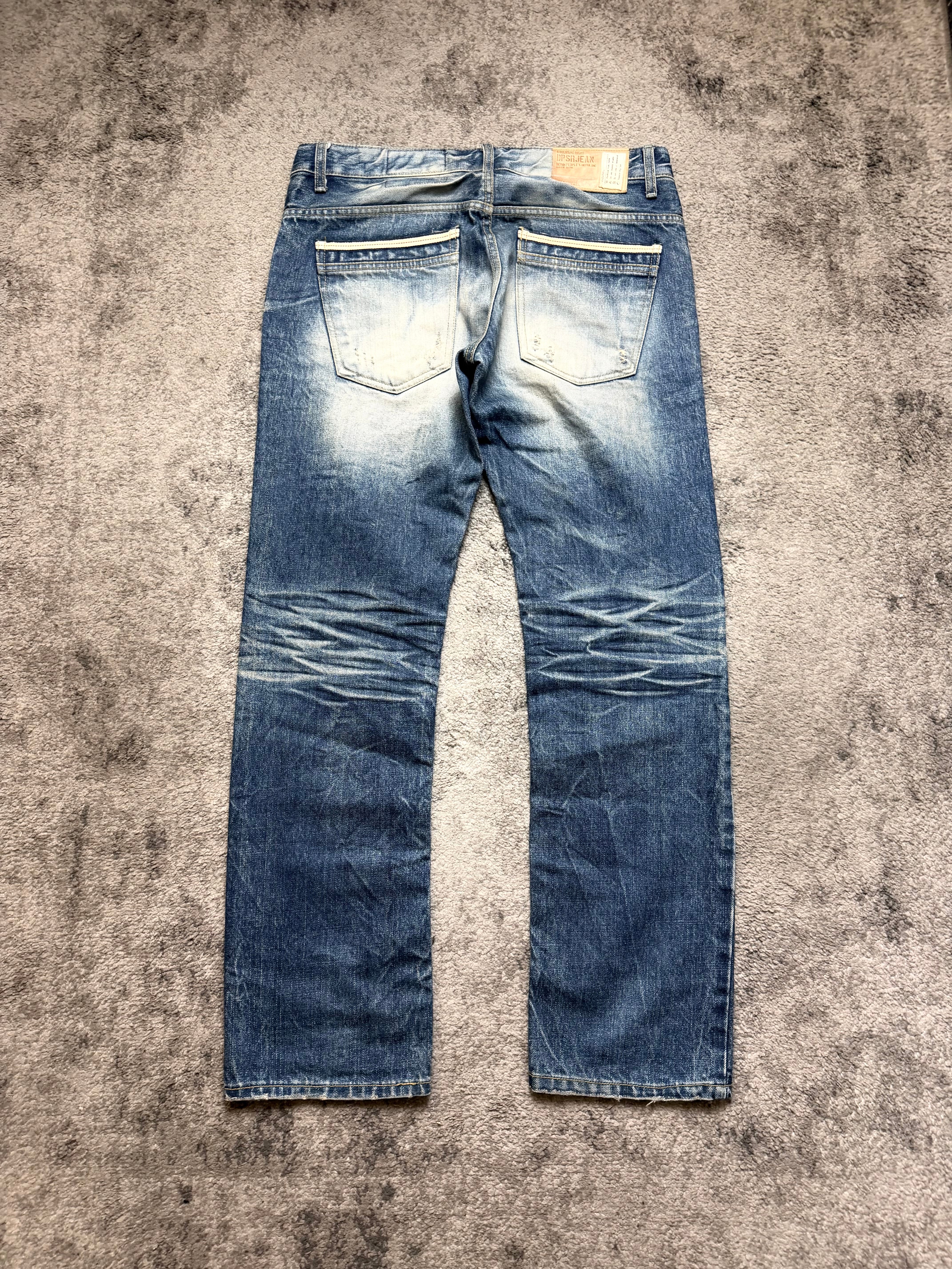 A high-contrast archive pair that leans into emotion and wear. Intense thigh fading, soft distressing, and deep blue edges echo late Number (N)ine sensitivity with a restrained ifsixwasnine rawness — expressive, worn, and honest.