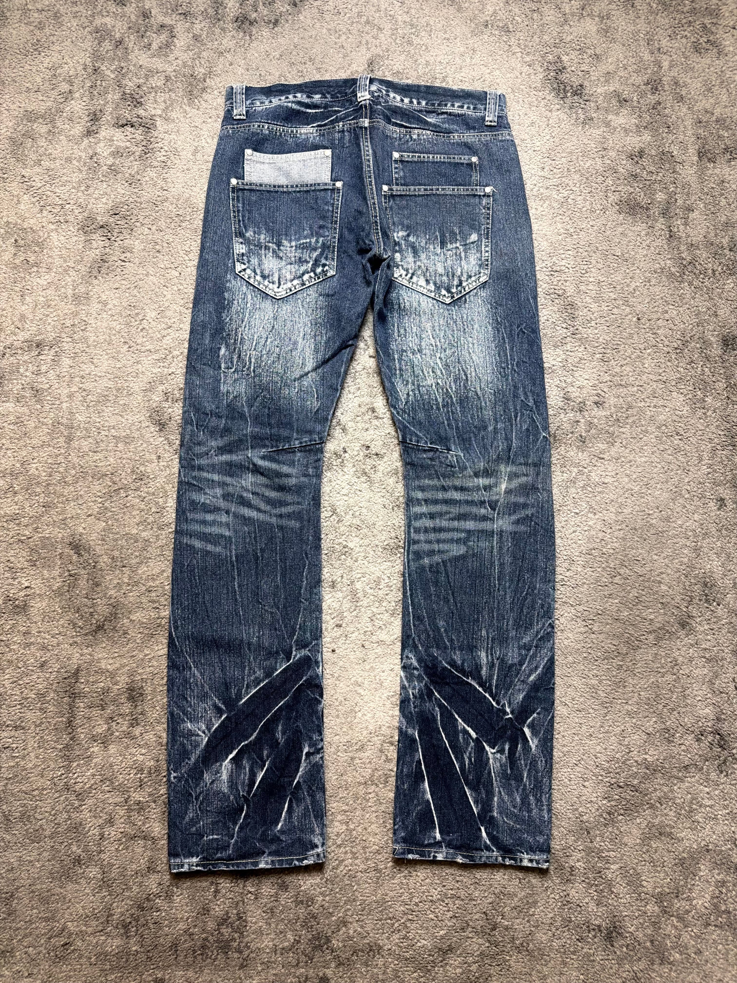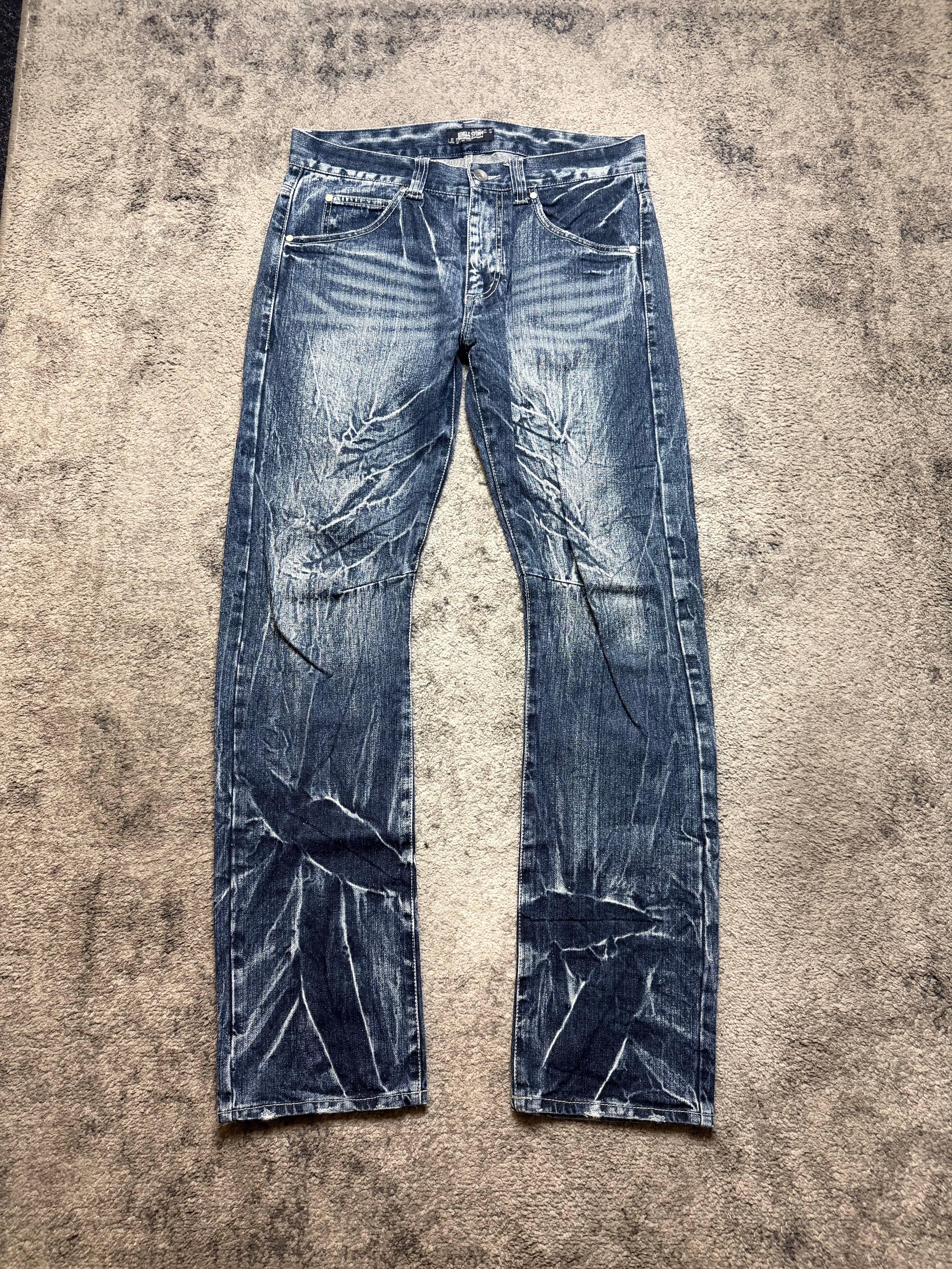 A raw and emotional archive denim from JUNGLE STORM, deeply rooted in early Japanese street and rock aesthetics. The heavy indigo base is washed down with intense whiskering and dramatic crease fading, creating a worn, almost poetic texture that feels naturally aged.