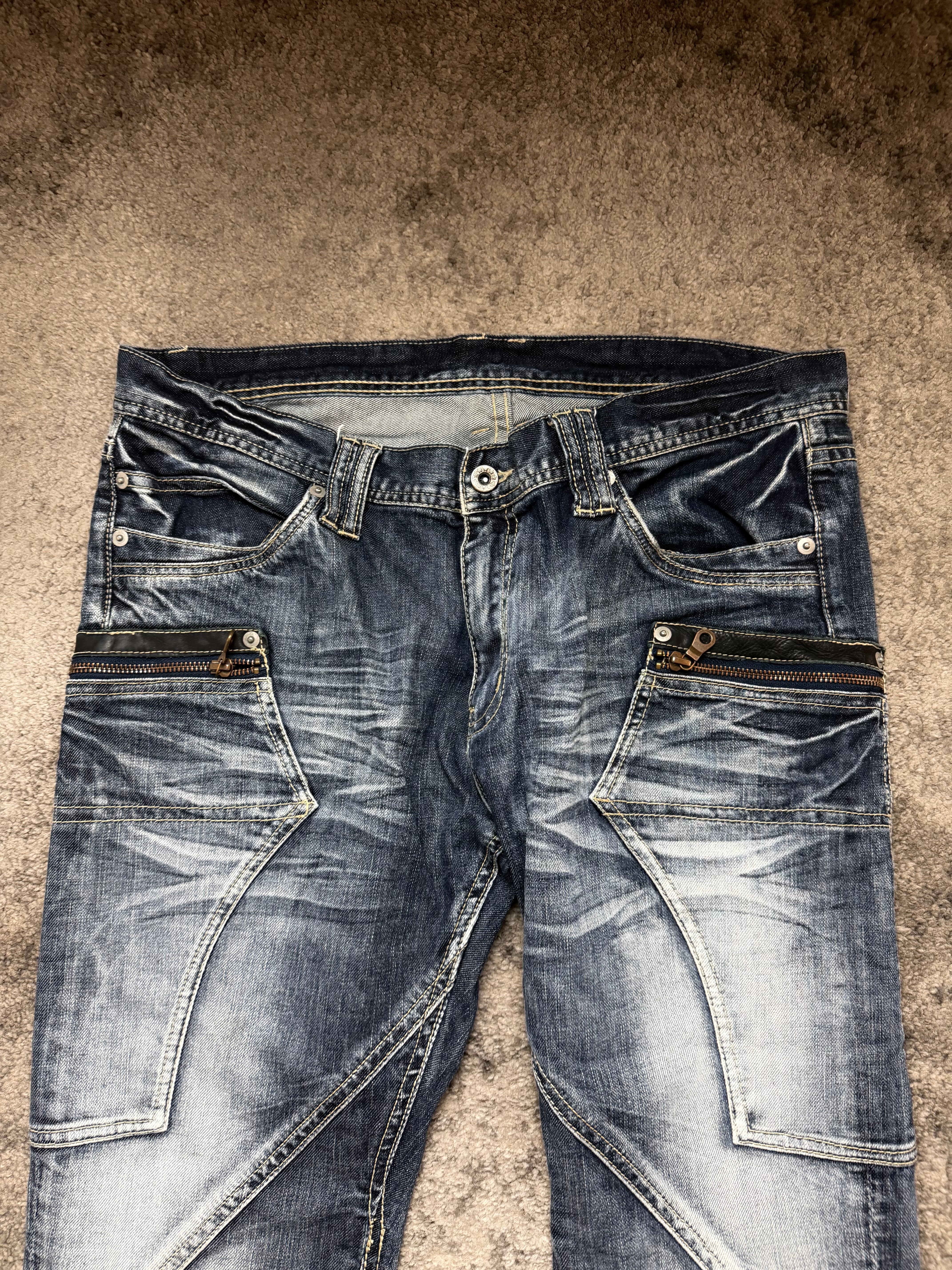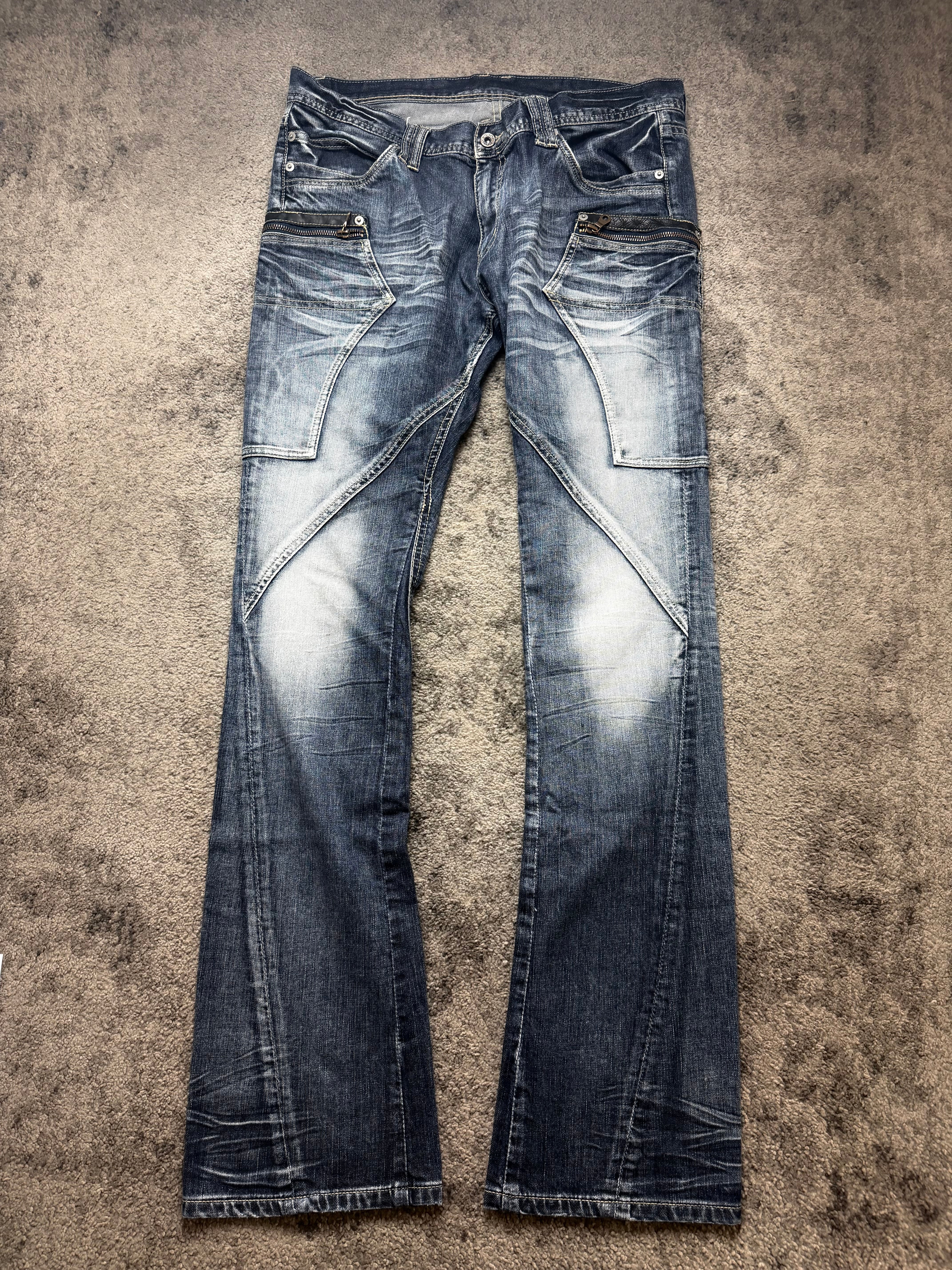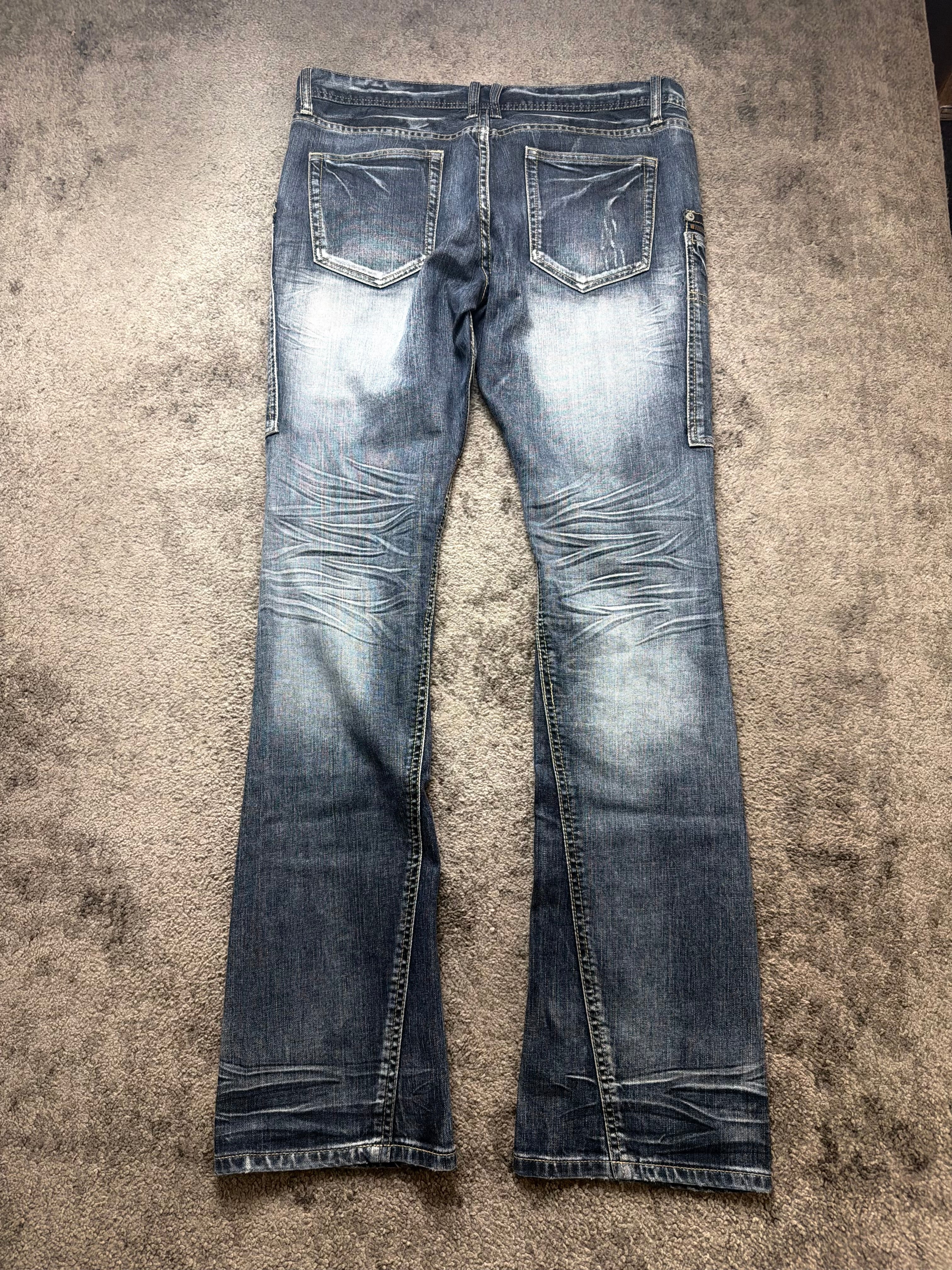 A striking archive-era piece from MICHEL KLEIN, blending sharp construction with emotional wear. Sculpted paneling, aggressive whiskering, and icy fades give these jeans that unmistakable early-2000s Japanese edge—technical, expressive, and quietly intense.