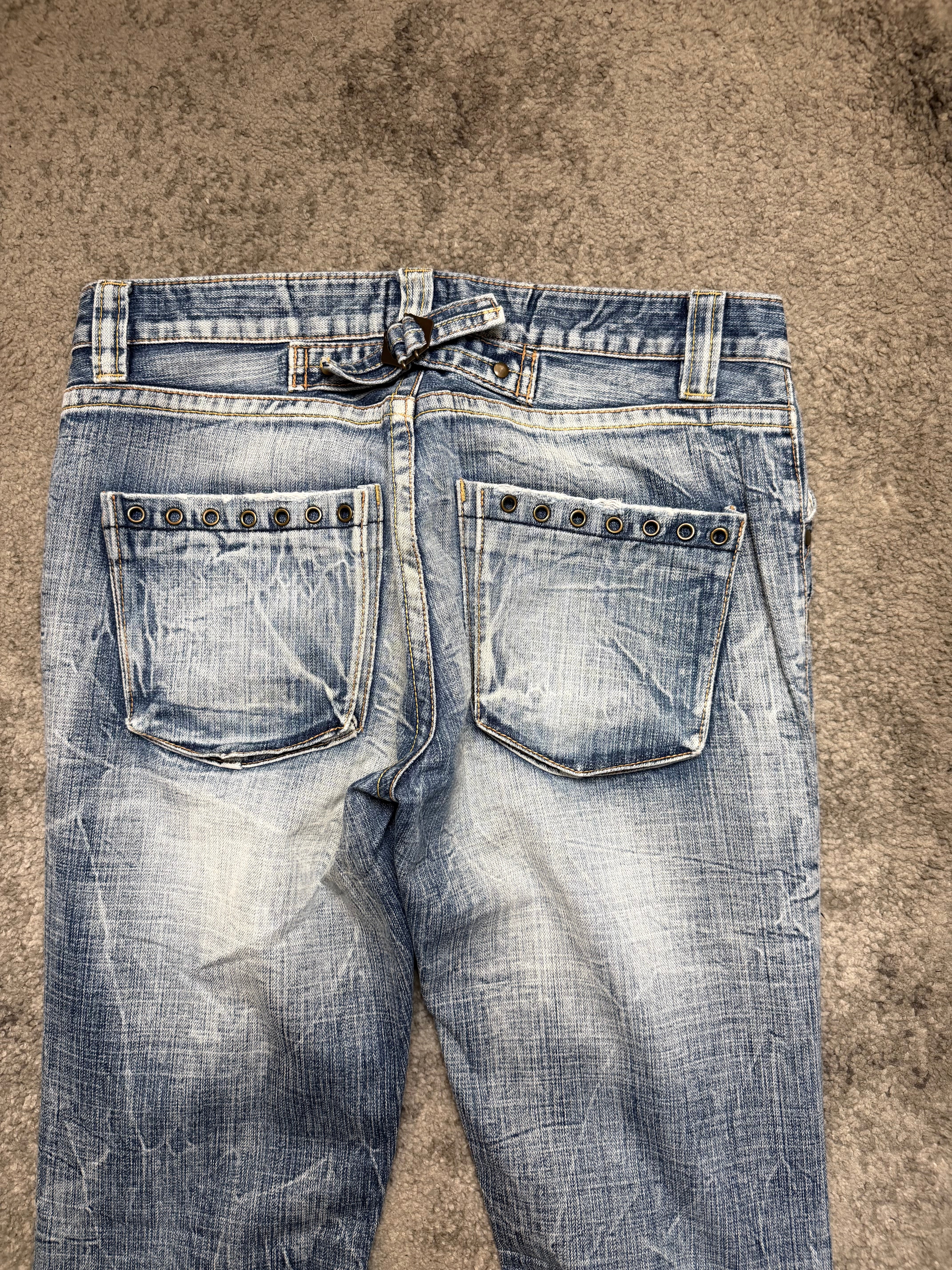 A sun-faded archive piece that captures the softer side of Japanese denim rebellion. Pale washes, fine creasing, and subtle distressing give this pair that late Number (N)ine sensitivity, balanced with a quiet ifsixwasnine rawness.