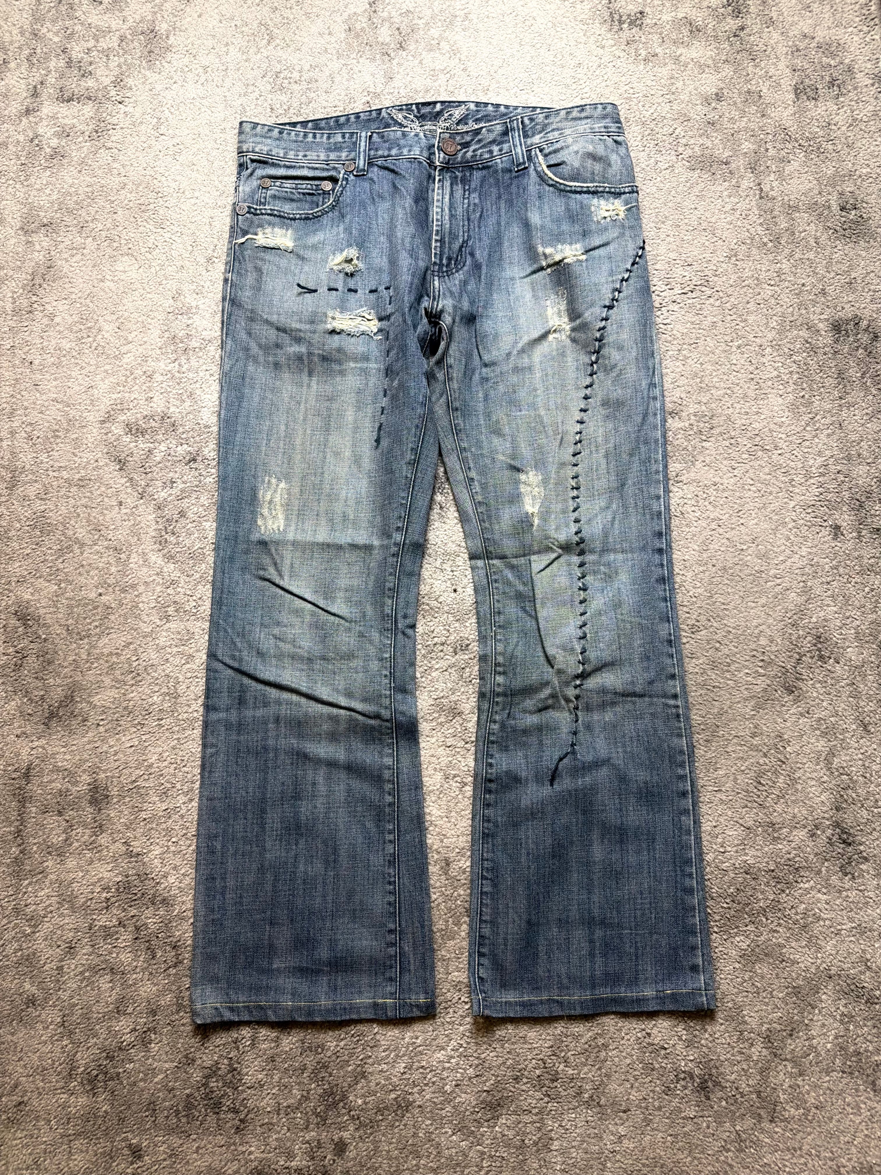 Condition: Pre-loved with heavy distressing and repair details that appear intentional and design-driven. No structural issues; denim remains wearable and solid.
