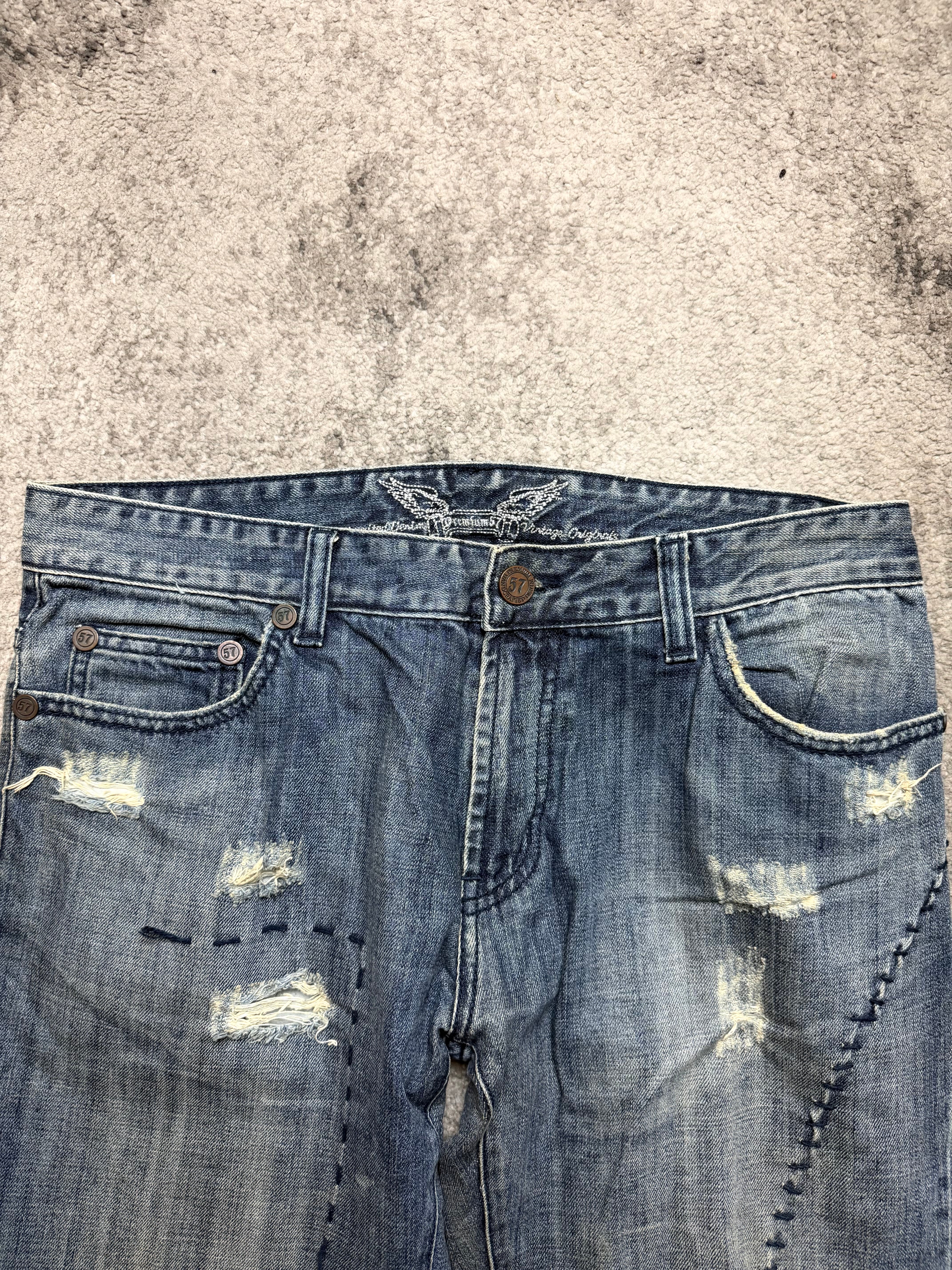 A raw expression of early-2000s Japanese archive denim culture. PREMIUM57 leans into imperfection – torn fabric, visible repairs, and uneven fading that feels personal rather than produced. This is denim with history written into every seam.