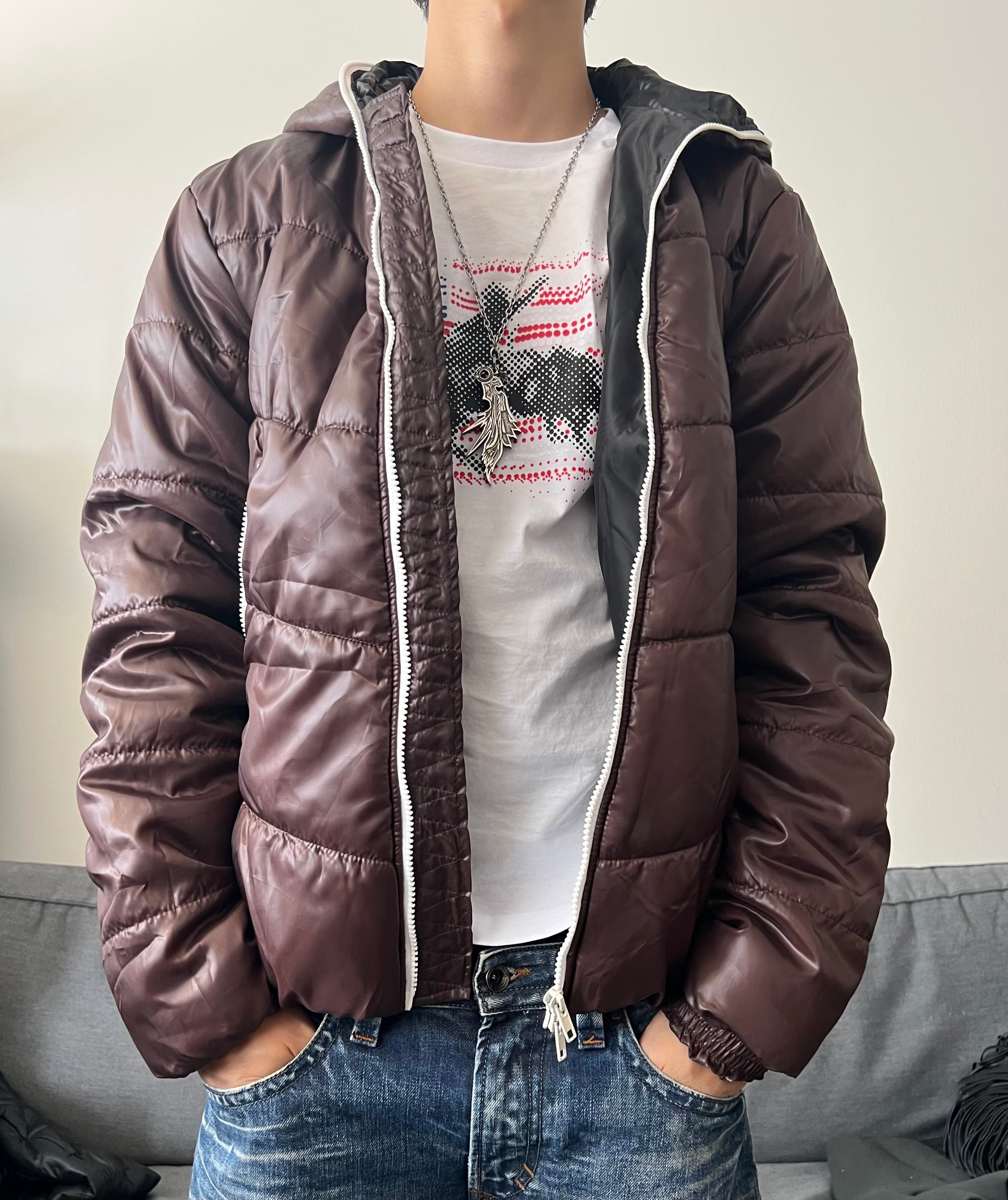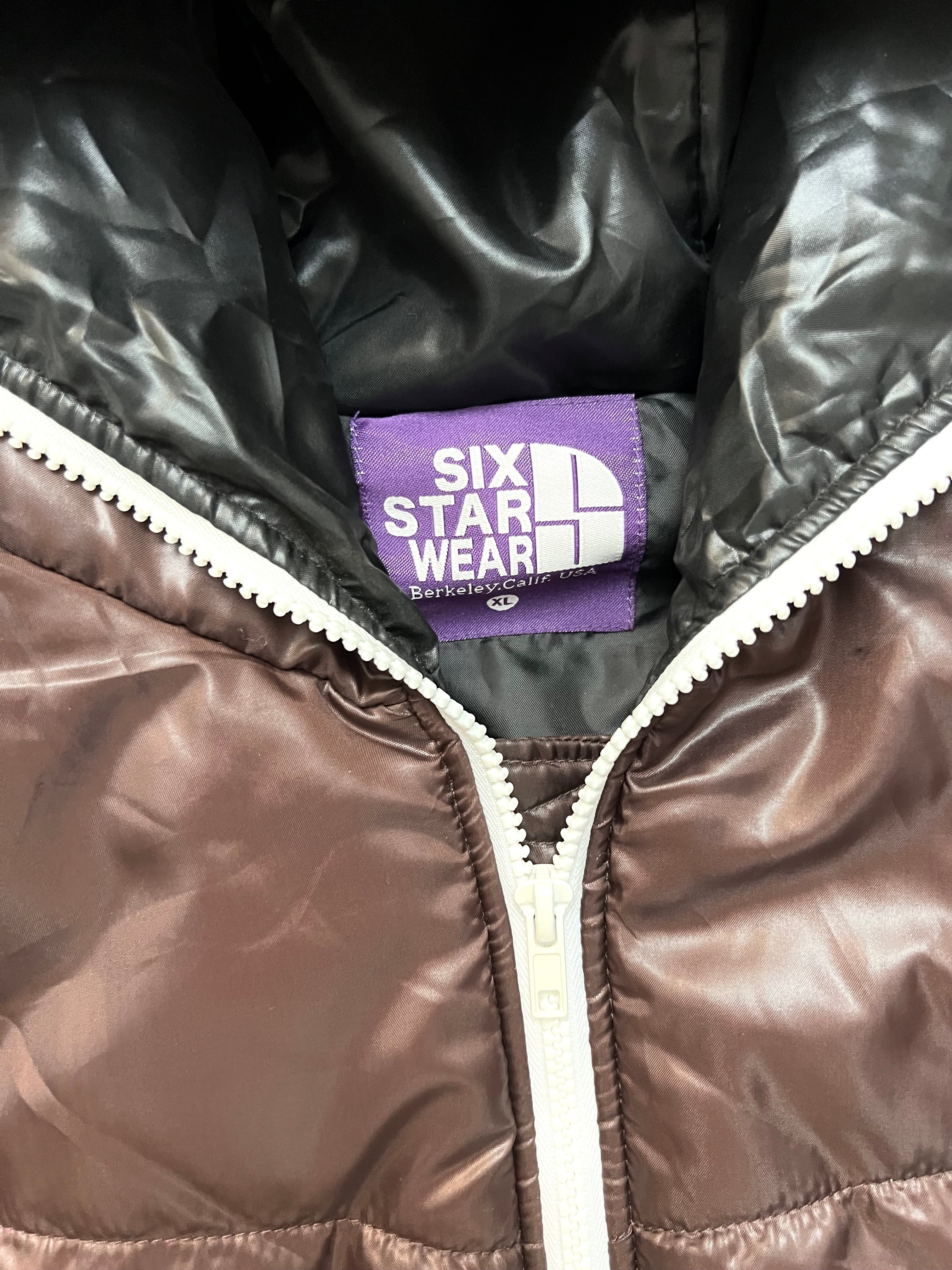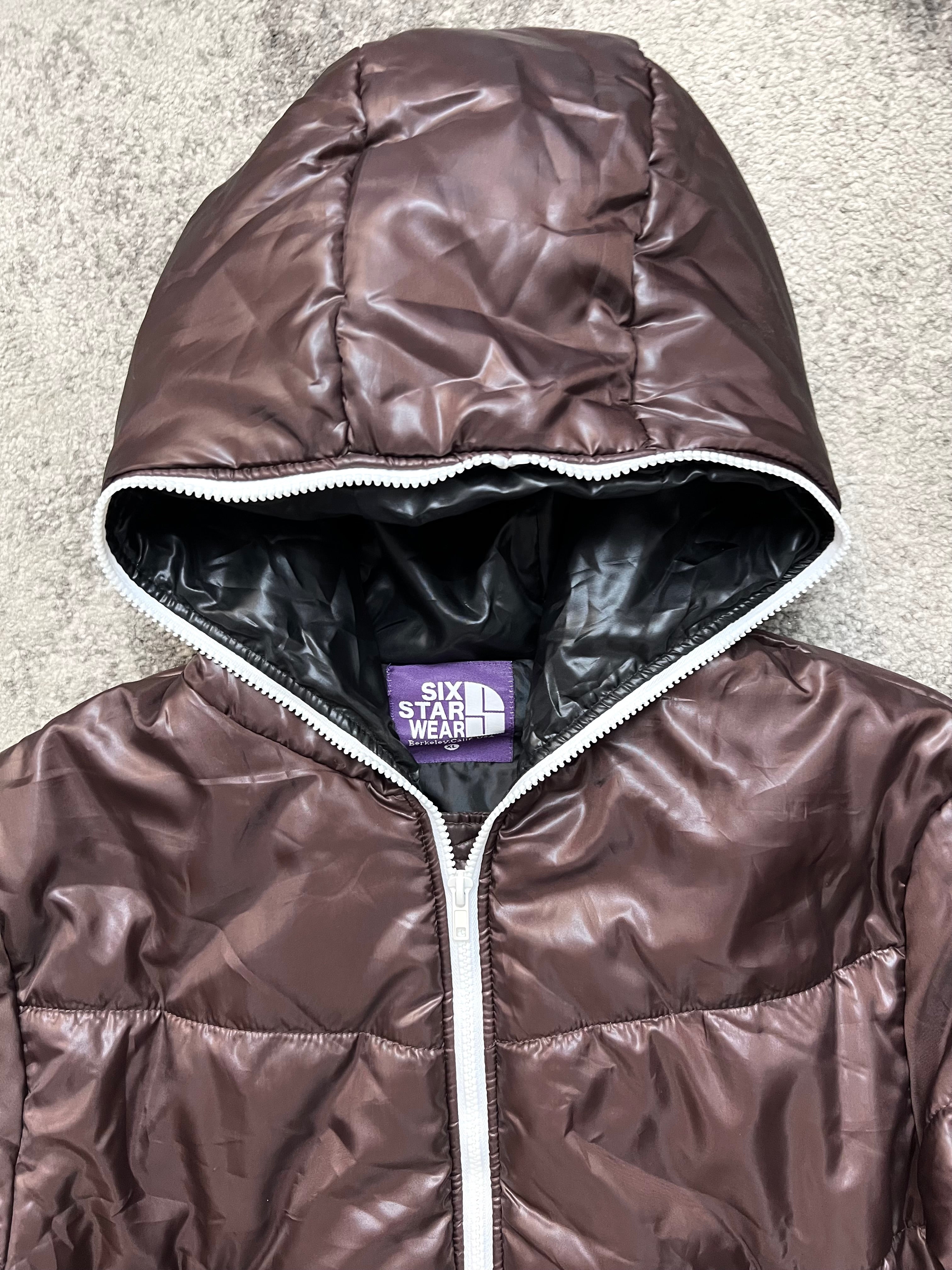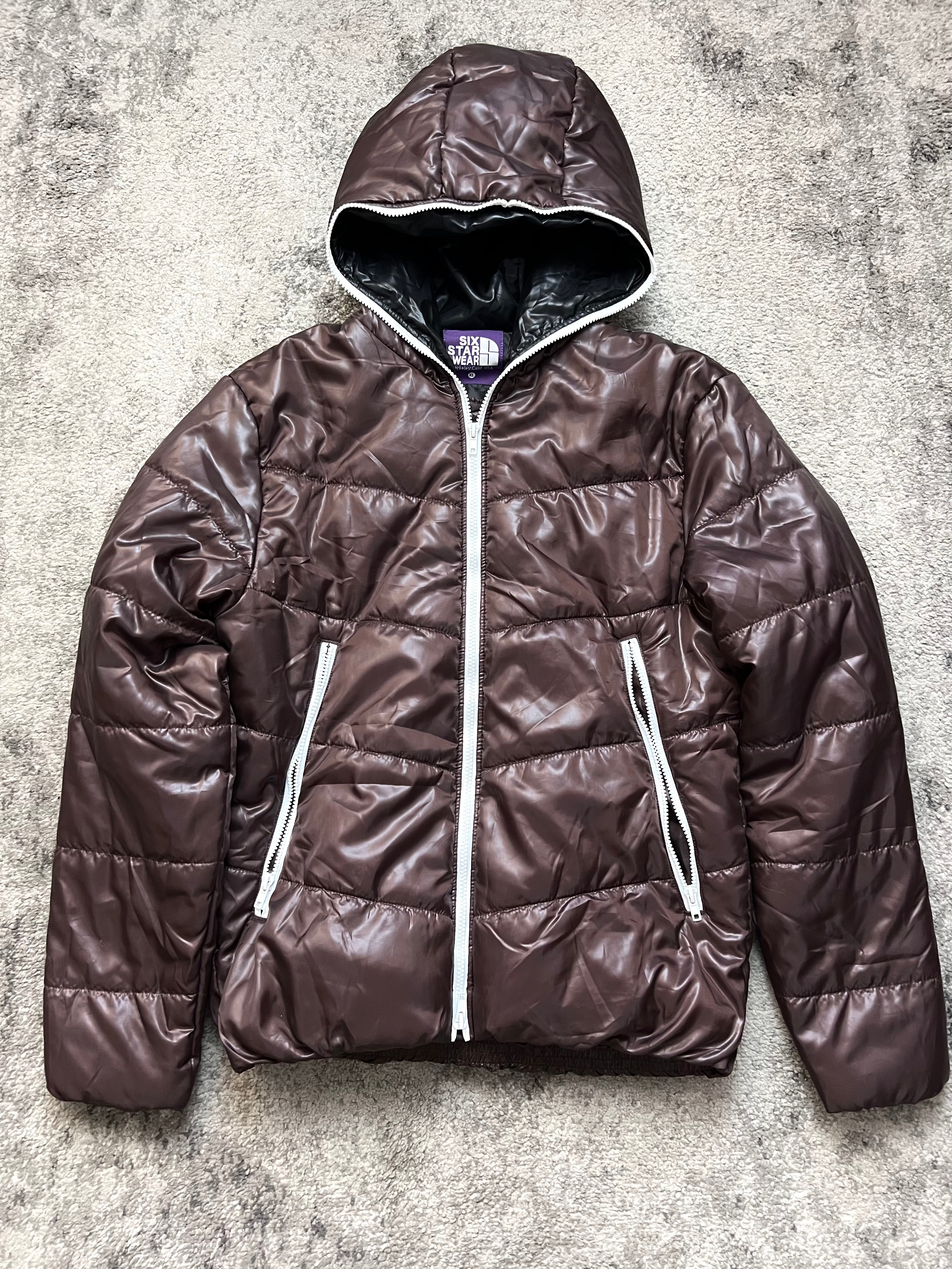 A rare Japanese archive jacket from Six Star Wear, crafted in a glossy deep brown shell with bold contrast white zippers. Light yet insulated, the piece offers that signature 2000s street–meets–avant-garde vibe. Features a structured hood, geometric padded stitching, and two angled zip pockets.