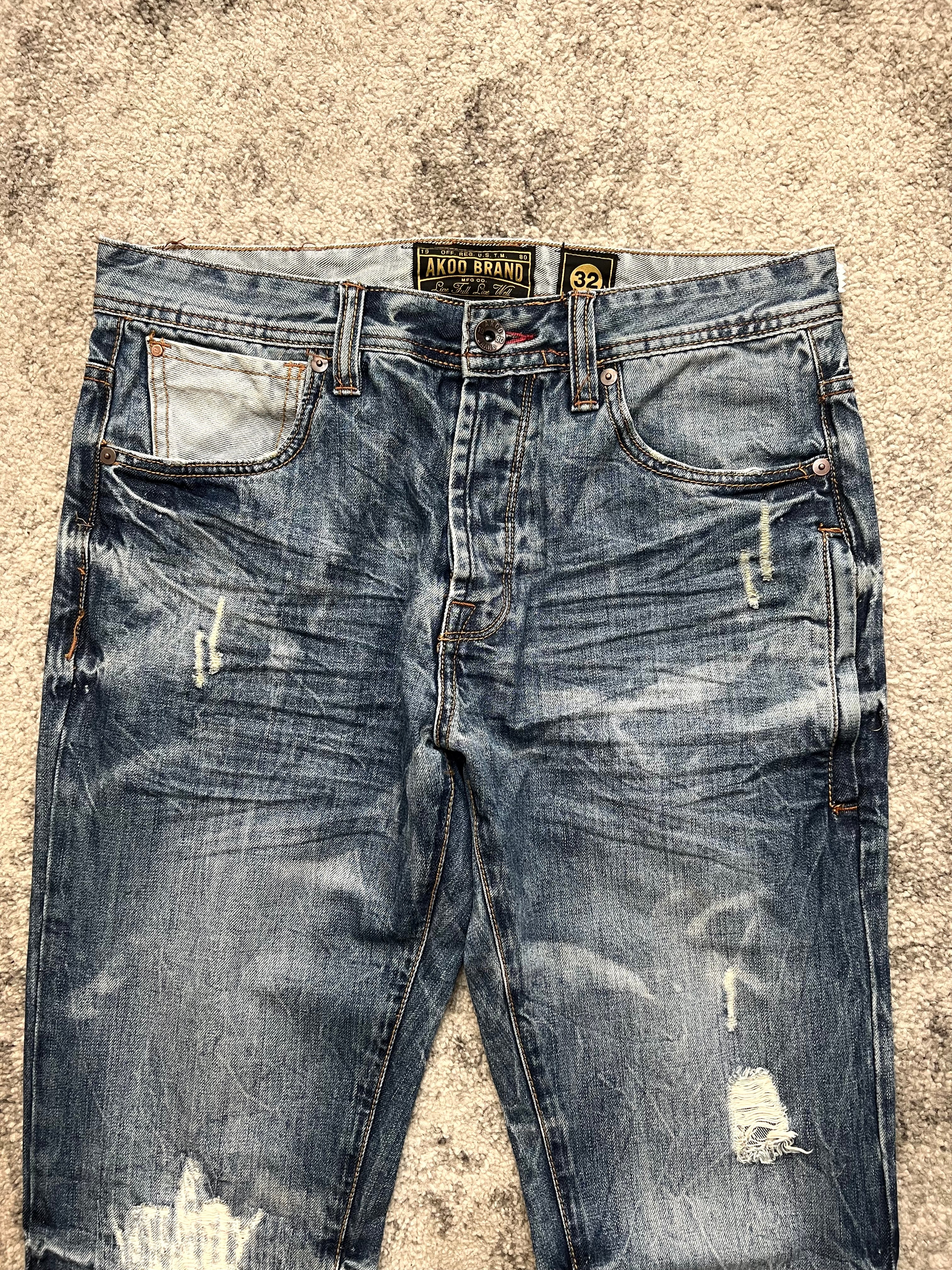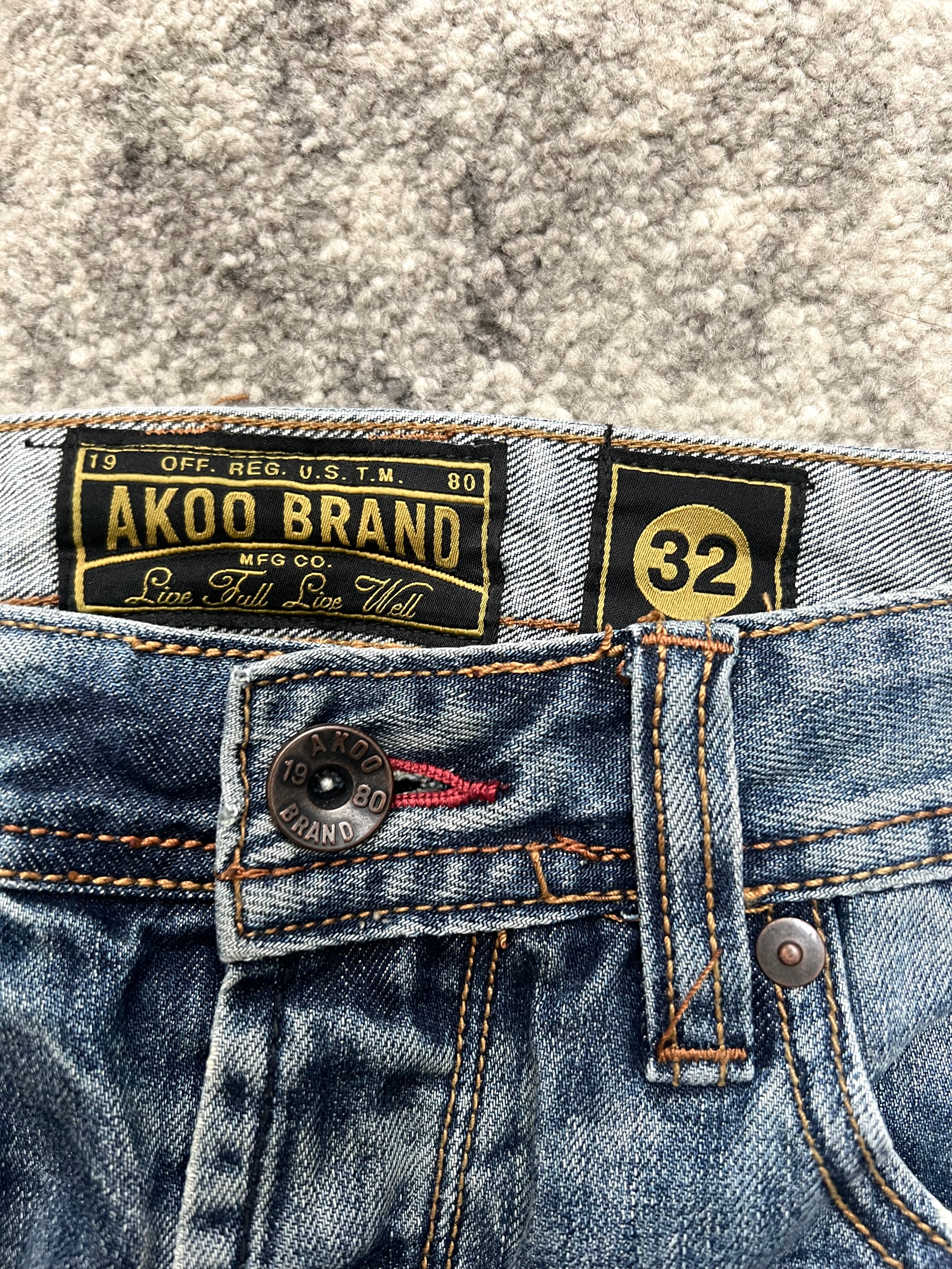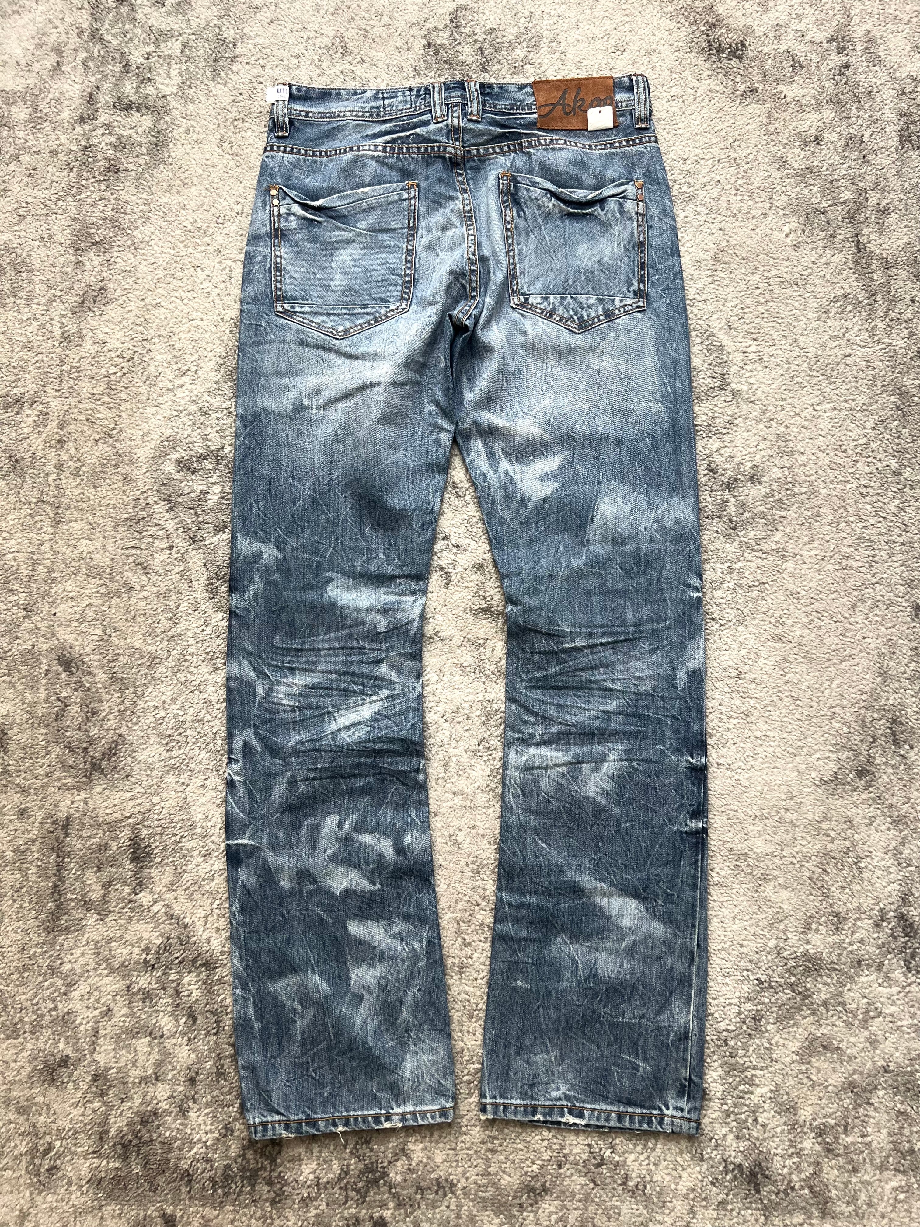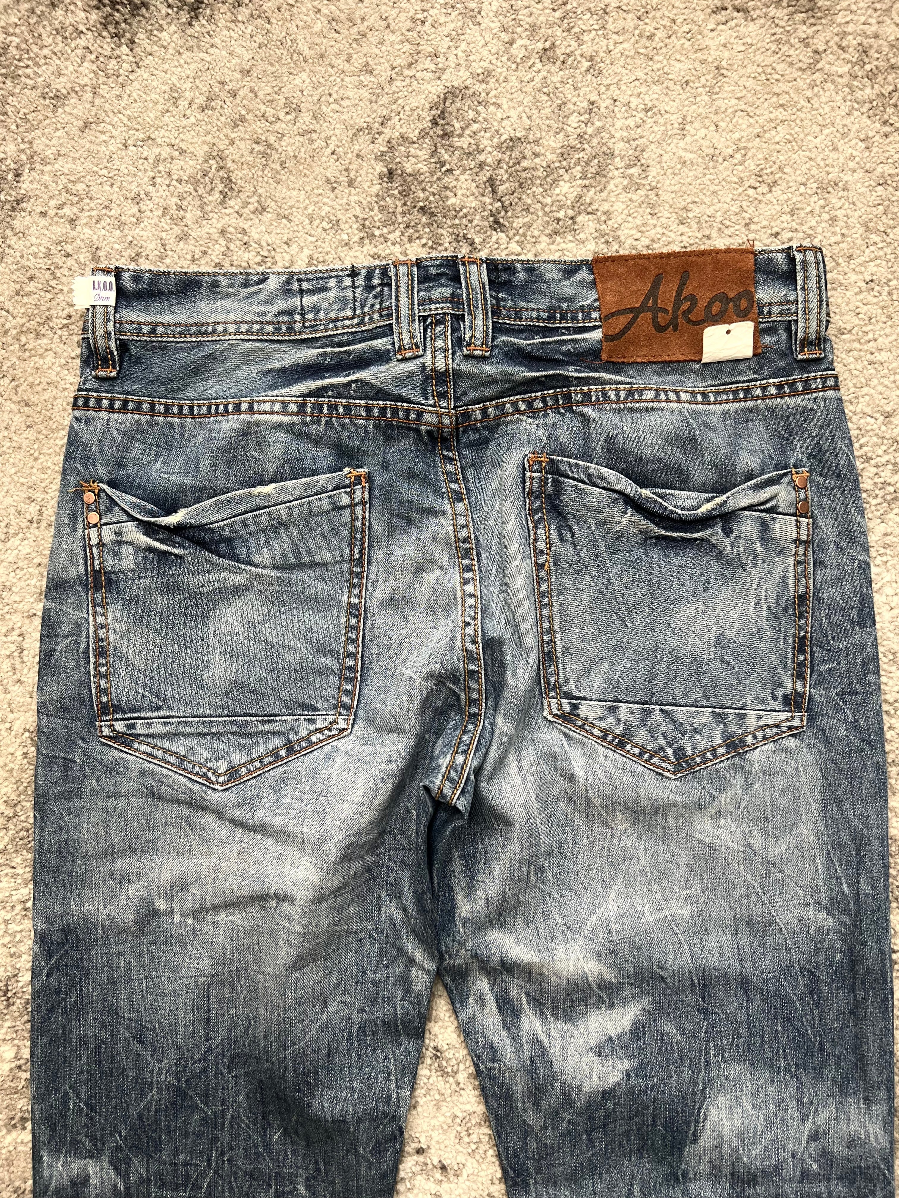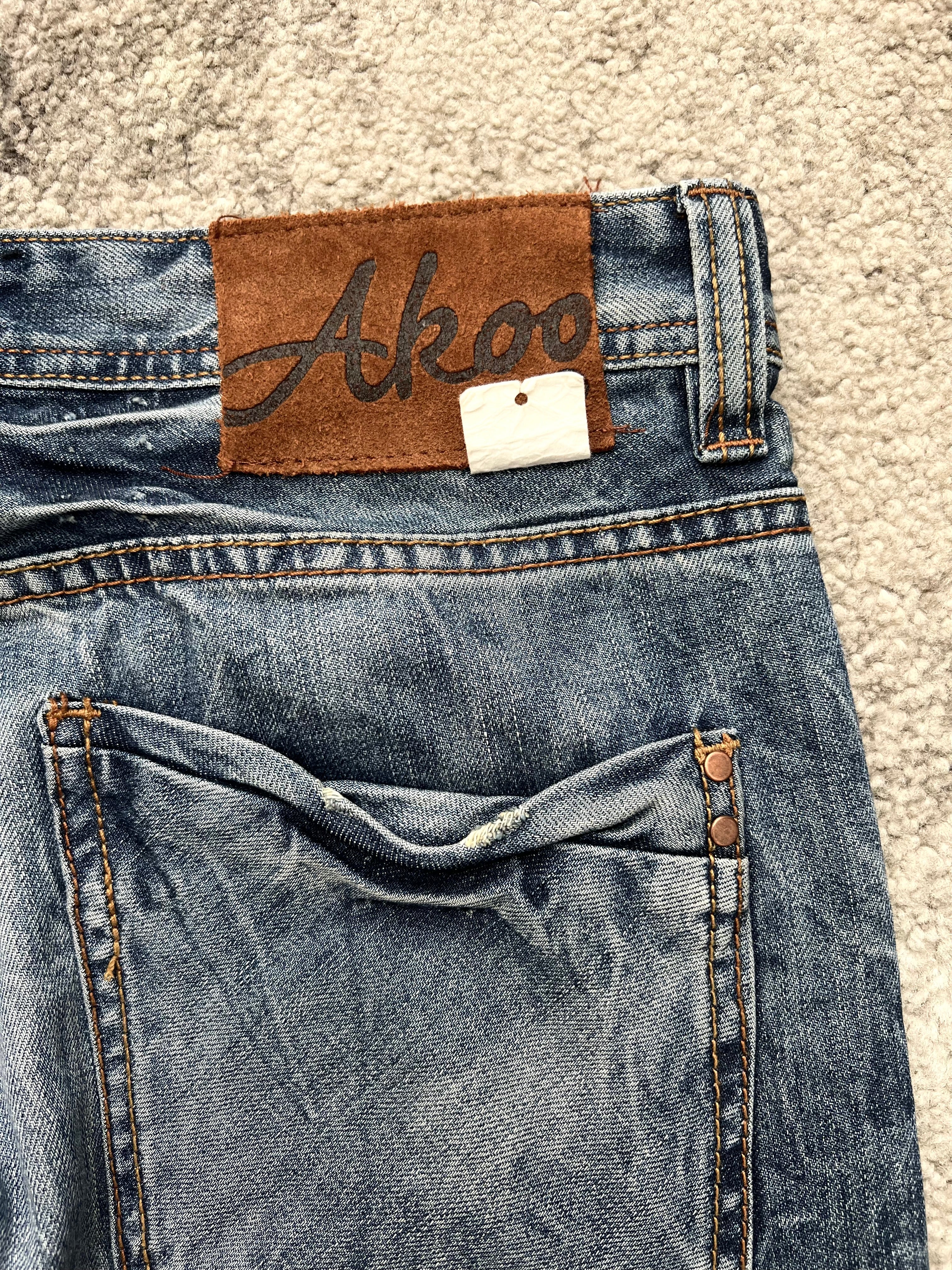 Straight leg with a regular rise. Heavy wash with unique white bleach marks throughout. Classic 5-pocket layout. Signature AKOO suede patch on rear waistband. Button fly.
