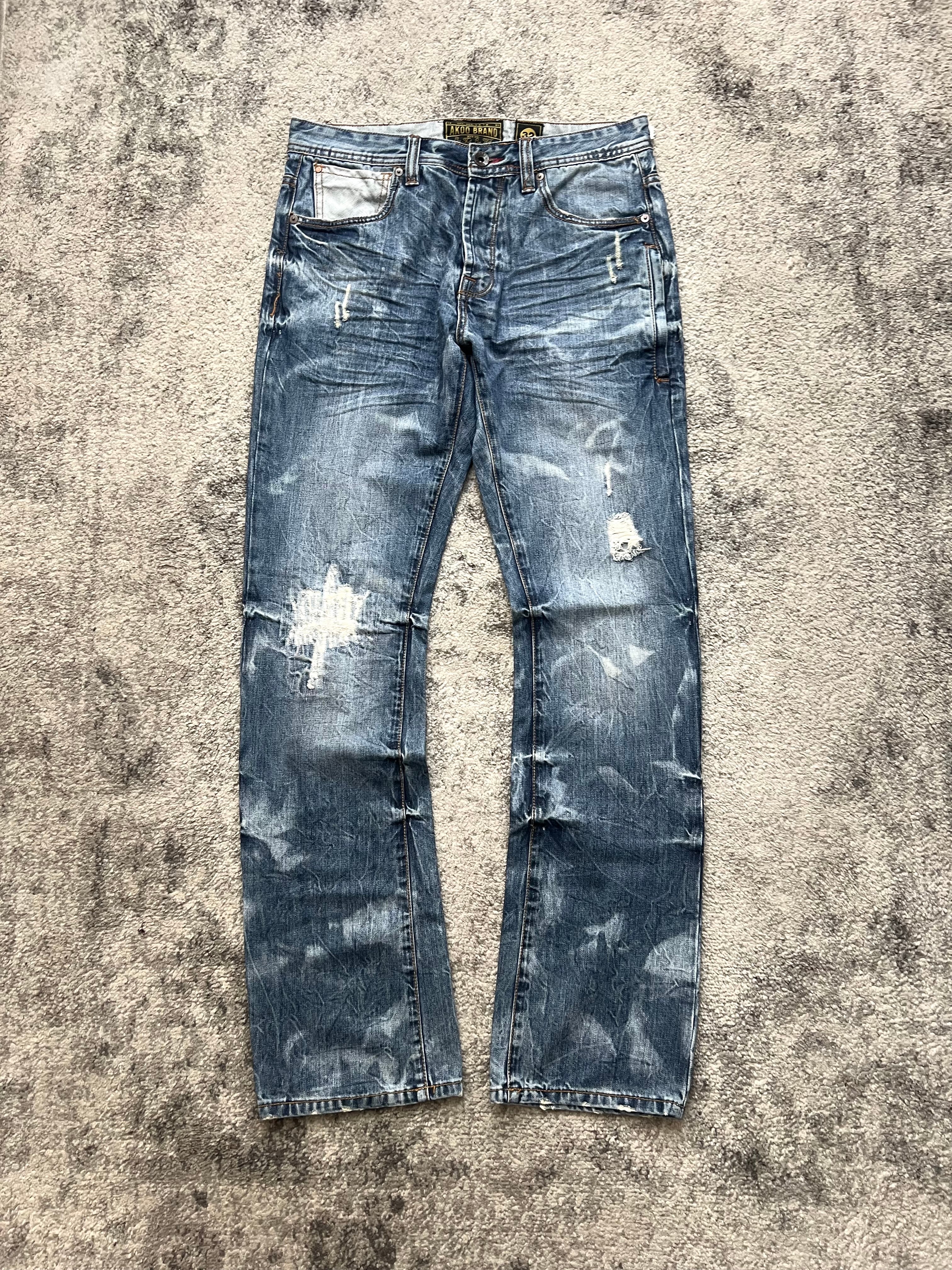 Pre-owned with intentional distress. Heavy bleach fading, frayed detailing, and structured wear. All abrasions are part of the design—no accidental damage.