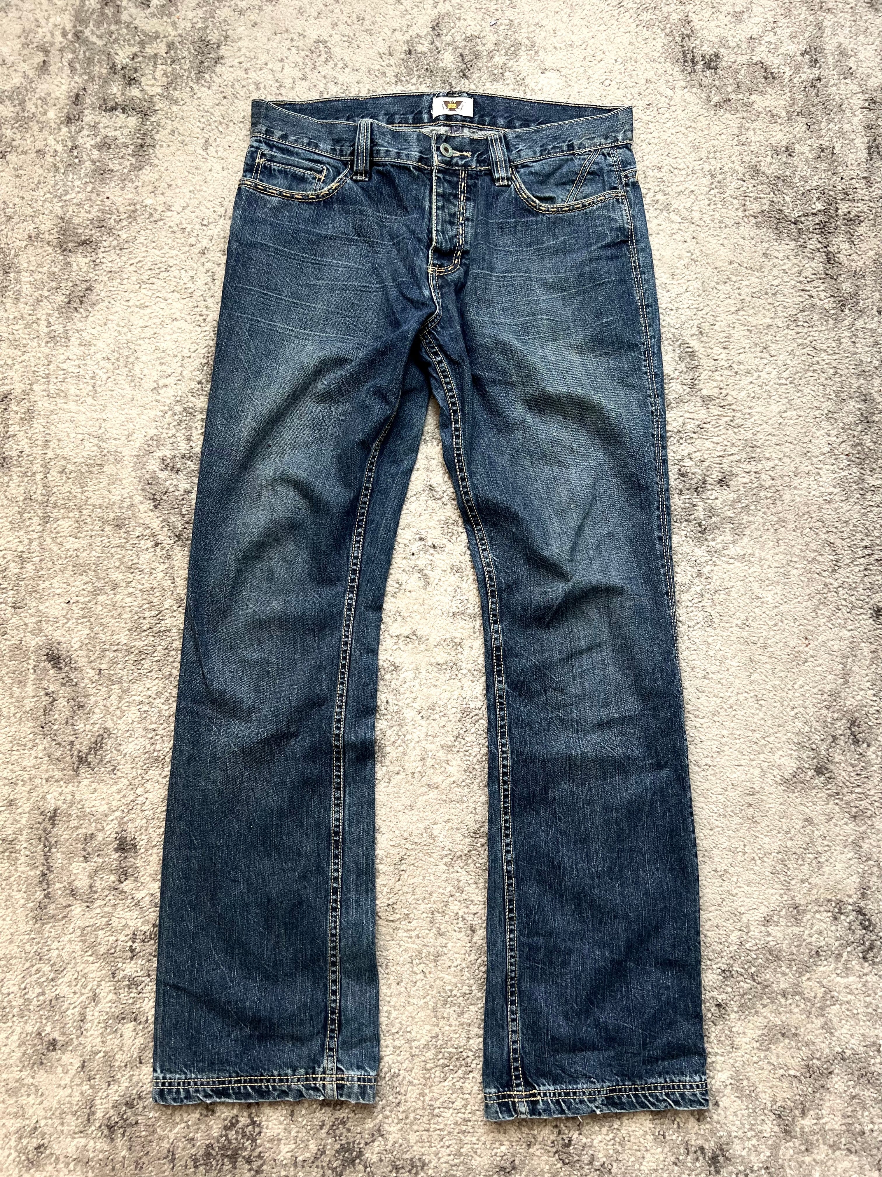 Straight cut with a relaxed bootcut vibe. Clean front, all action on the back. Works best with a vintage tee or something reckless.