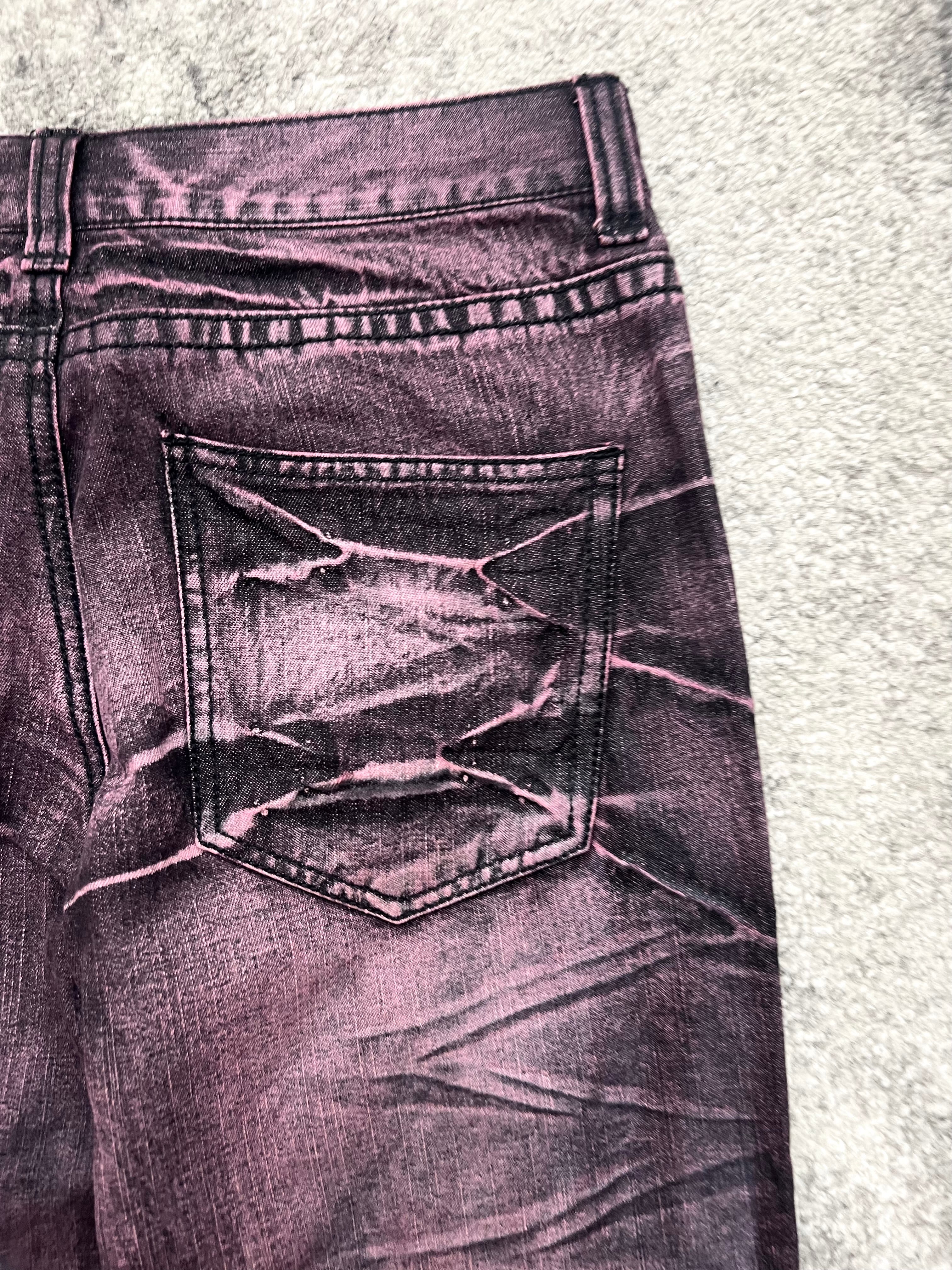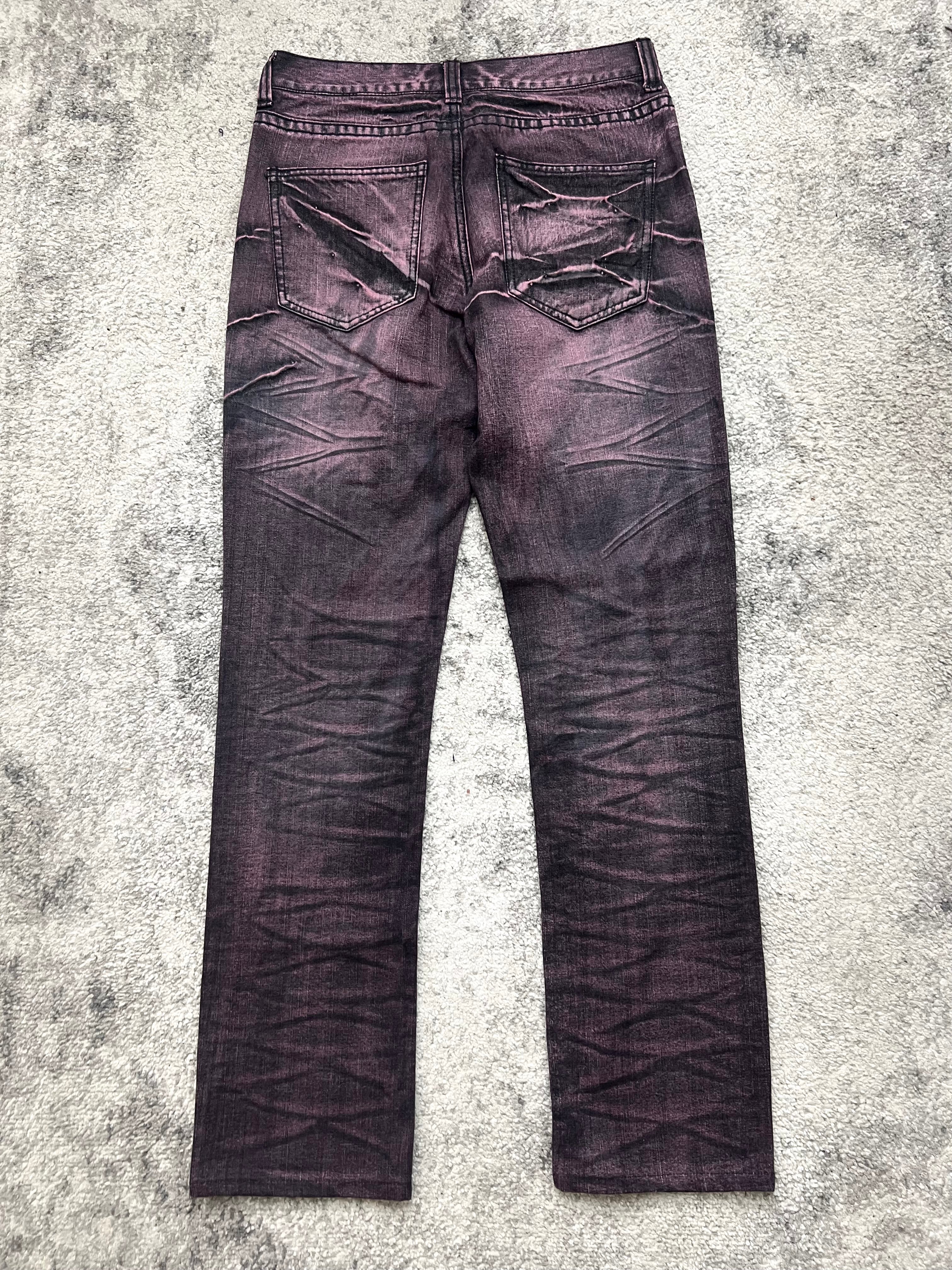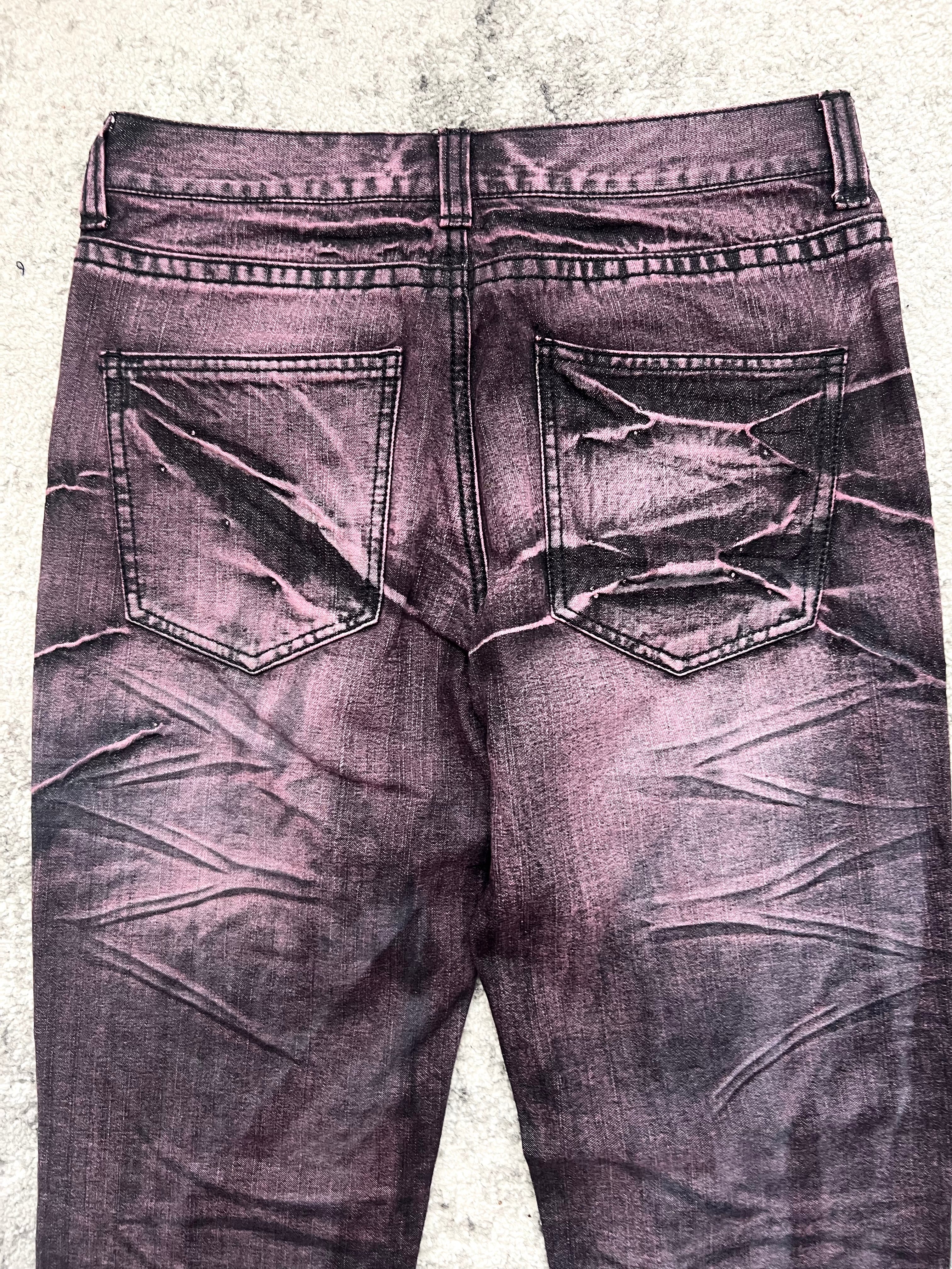 These aren’t jeans — they’re distortion. A signal warped through color and shadow, pulsing like Tokyo at night. The fade hits in surreal rhythm, like memory glitches stitched into fabric.