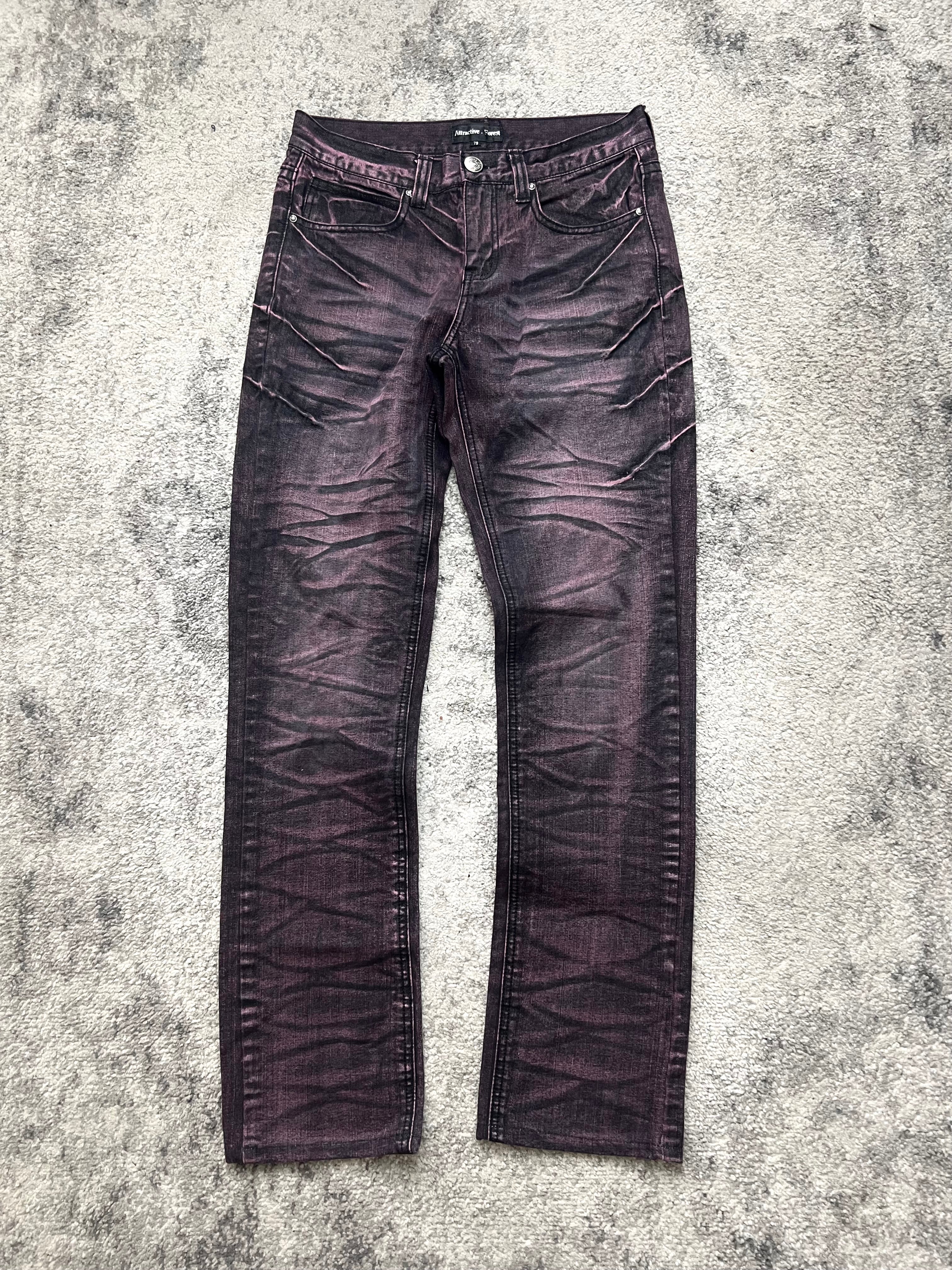 Medium-weight Japanese denim, custom-dyed in a deep plum wash with black undertones. Rugged yet soft to the touch. Every whisker and fold feels intentional.