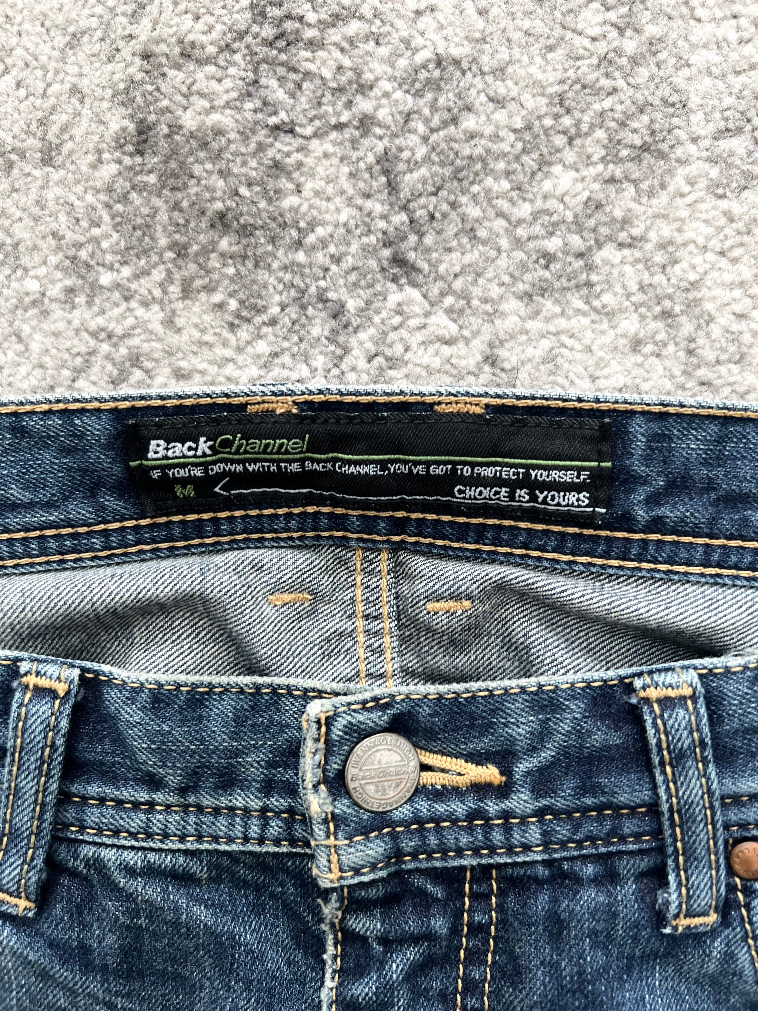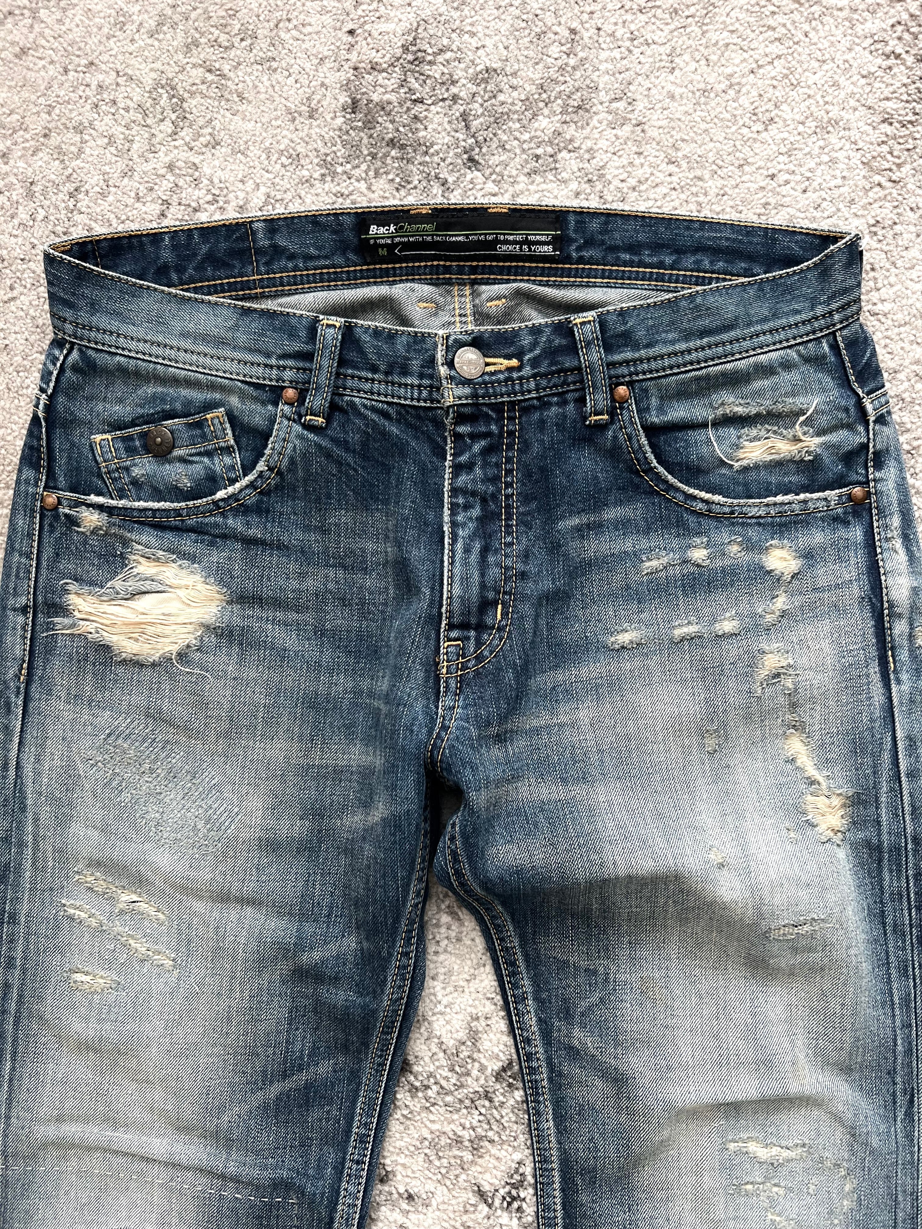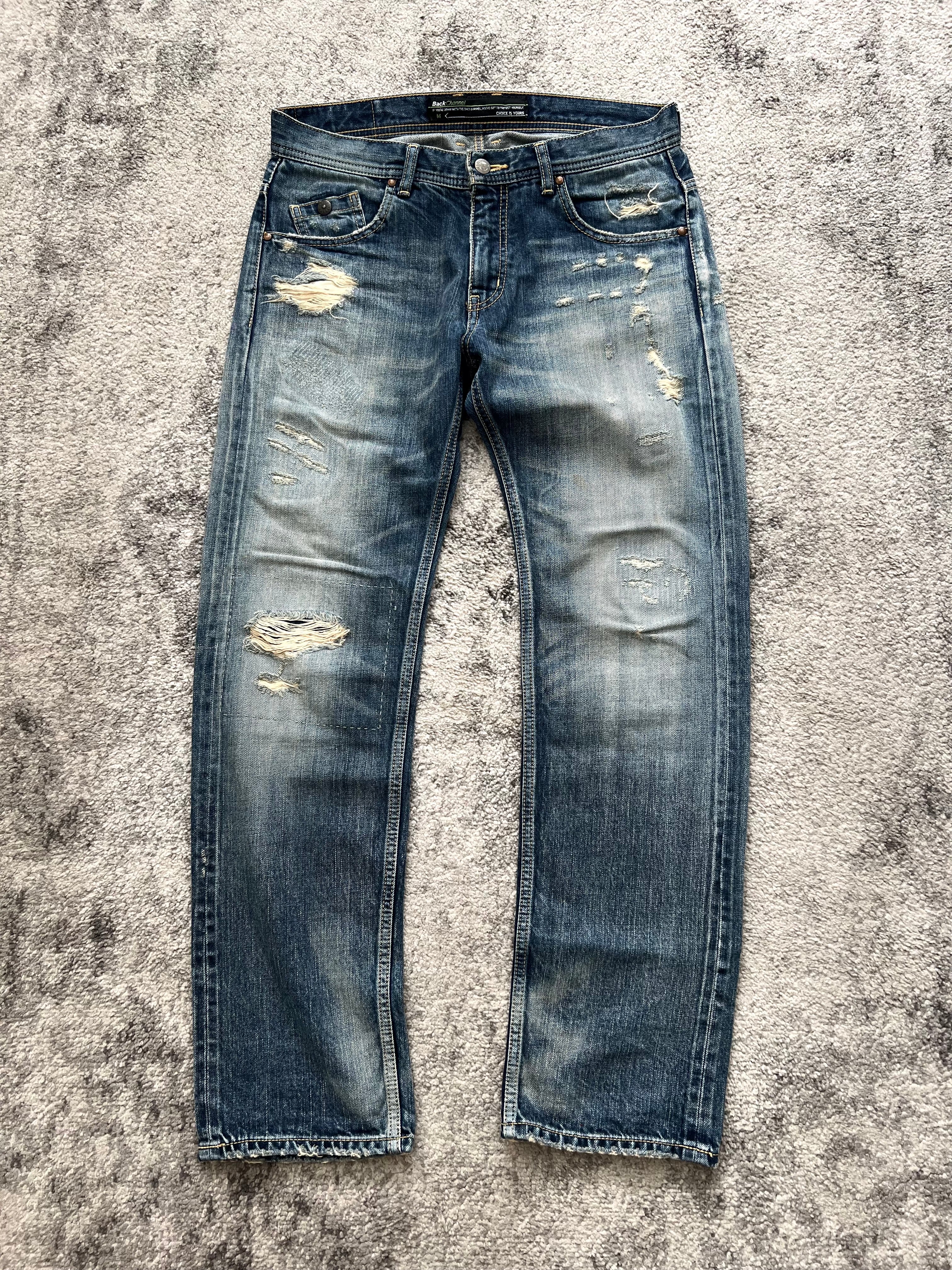 Slightly tapered straight cut. Destruction-heavy front with stacked honeycomb creasing on the back. Subtle logo stitch on the right rear pocket. Waist patch features BackChannel's cult status iconography.