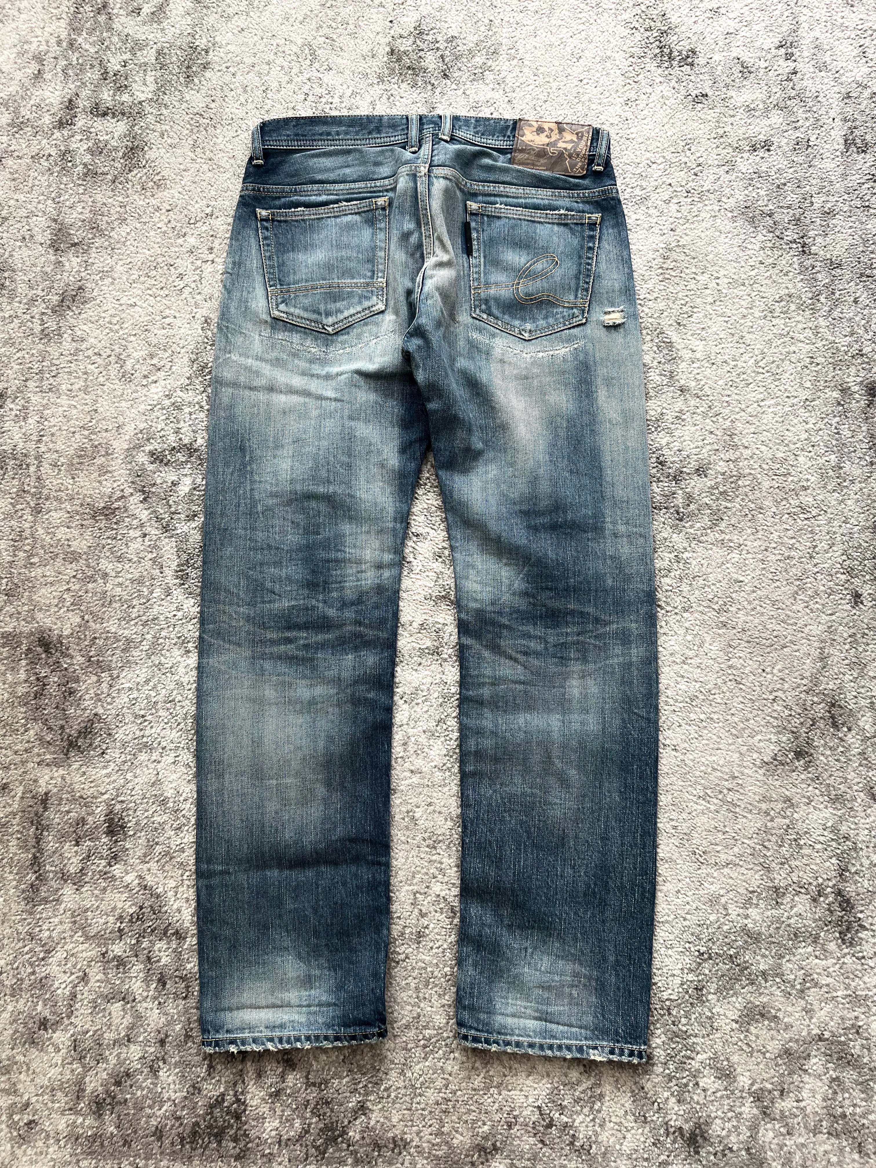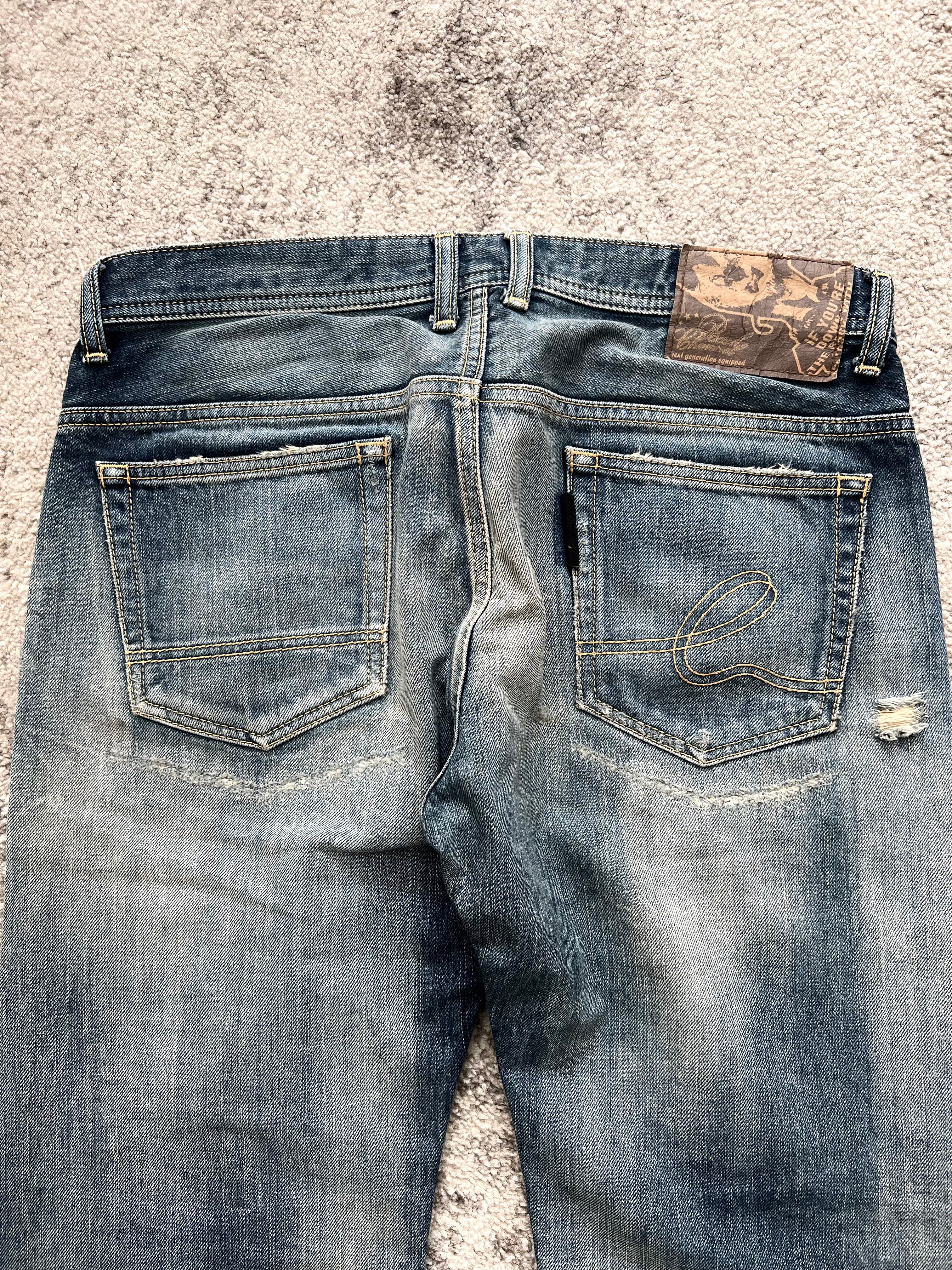 Pre-owned with heavy distressing throughout. Frays, abrasions, and raw hems—all beautifully natural. Washed to a perfect grey-blue with signs of honest wear.