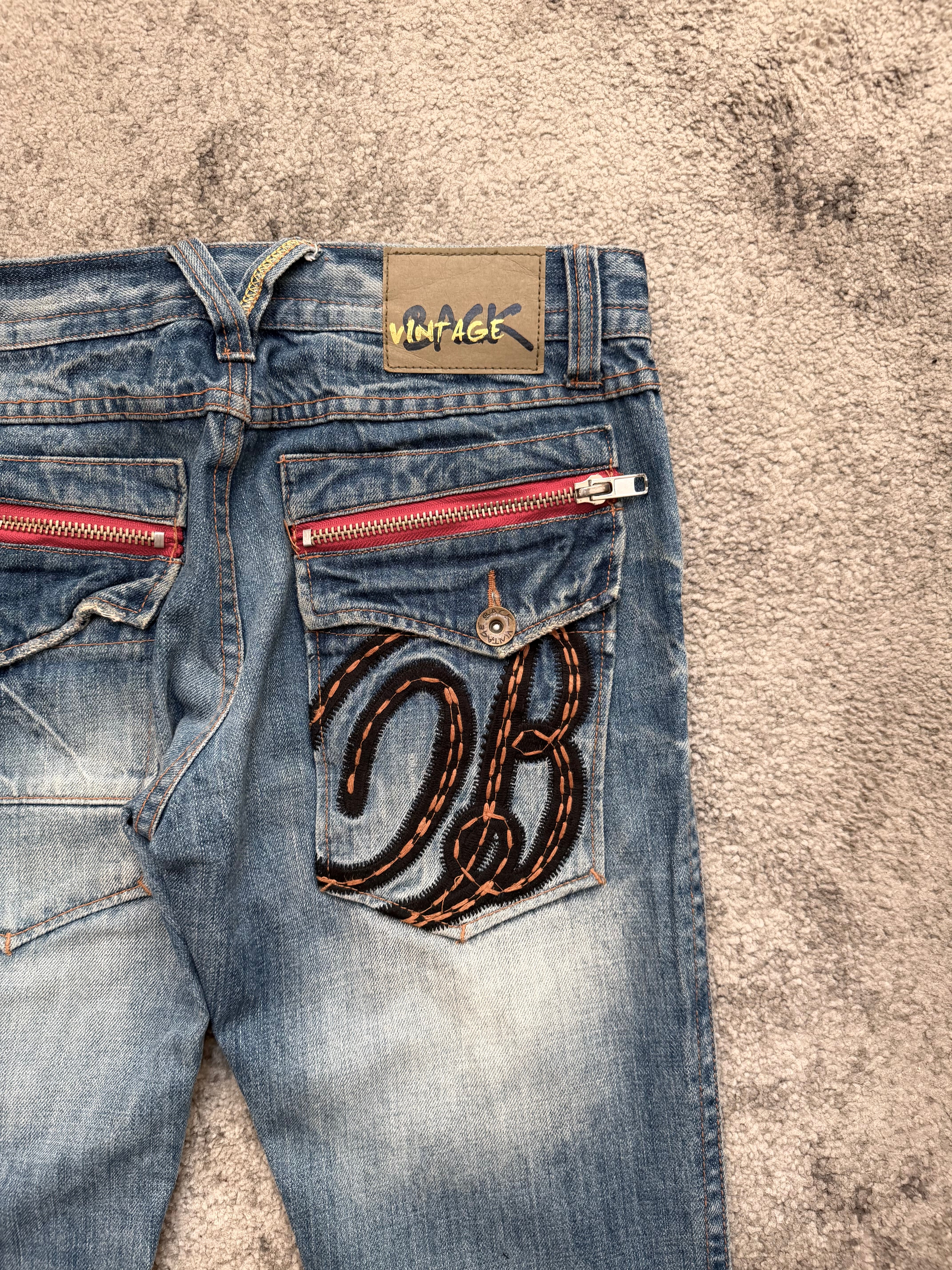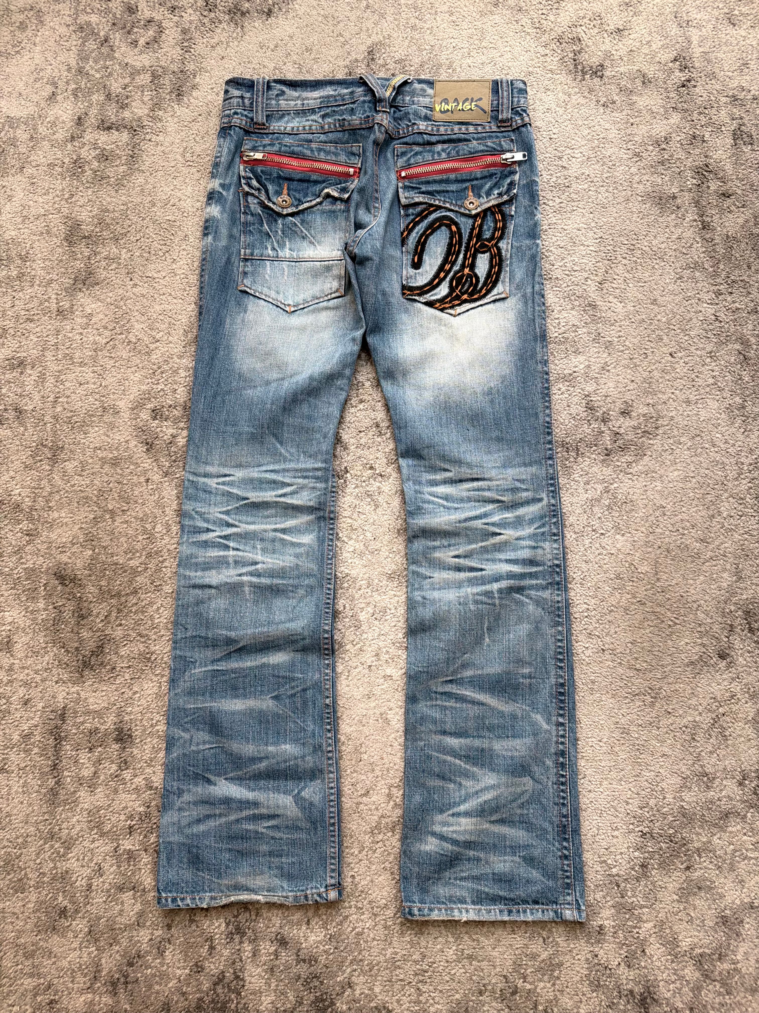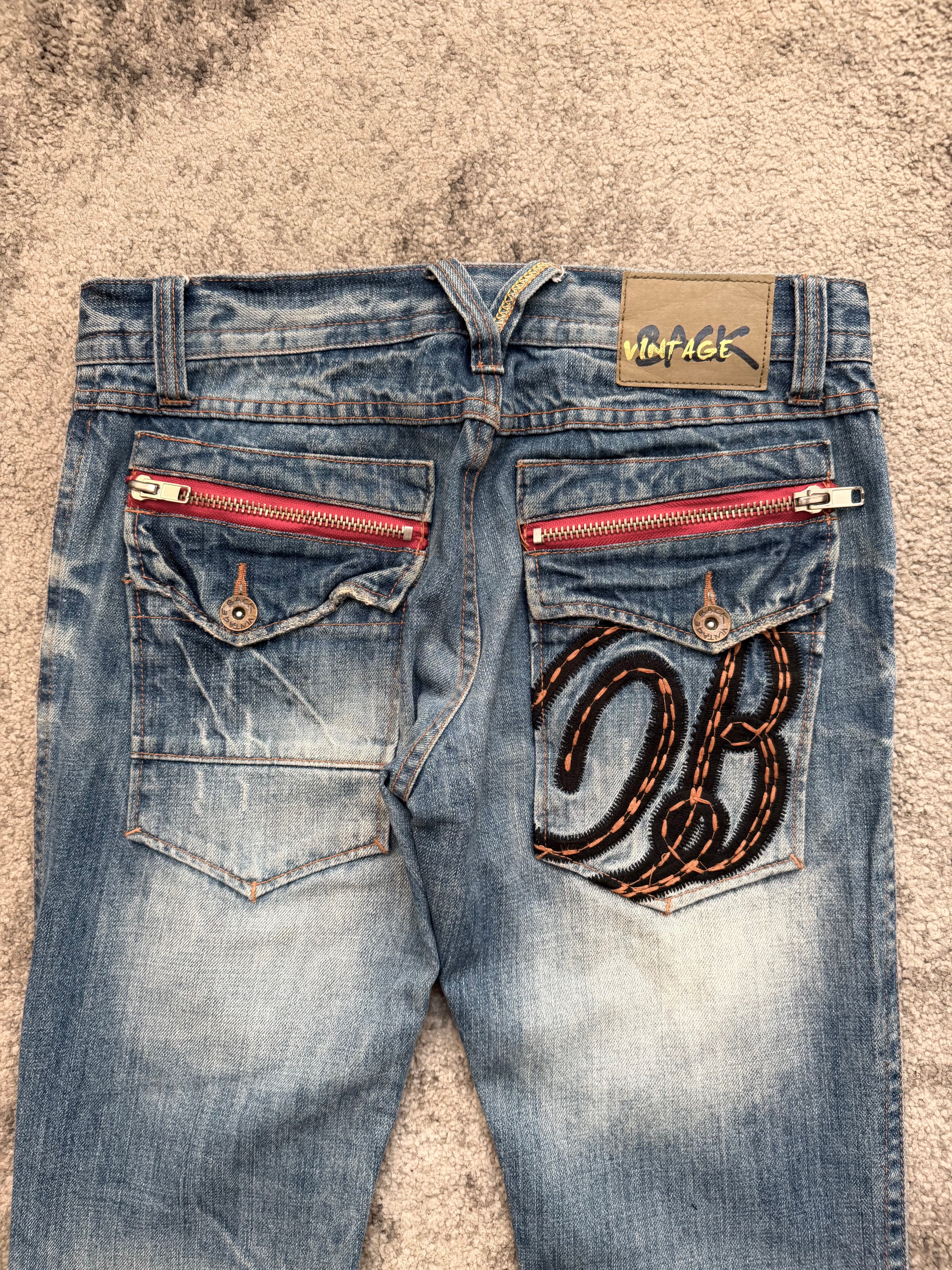 Step into that raw, unruly Japanese denim world with this BACKVINTAGE pair — a true early-2000s street-archive relic. The washed-out light blue tone, heavy whiskering, and sun-bleached fading give it that lived-in, rock-tour patina you can’t fake.