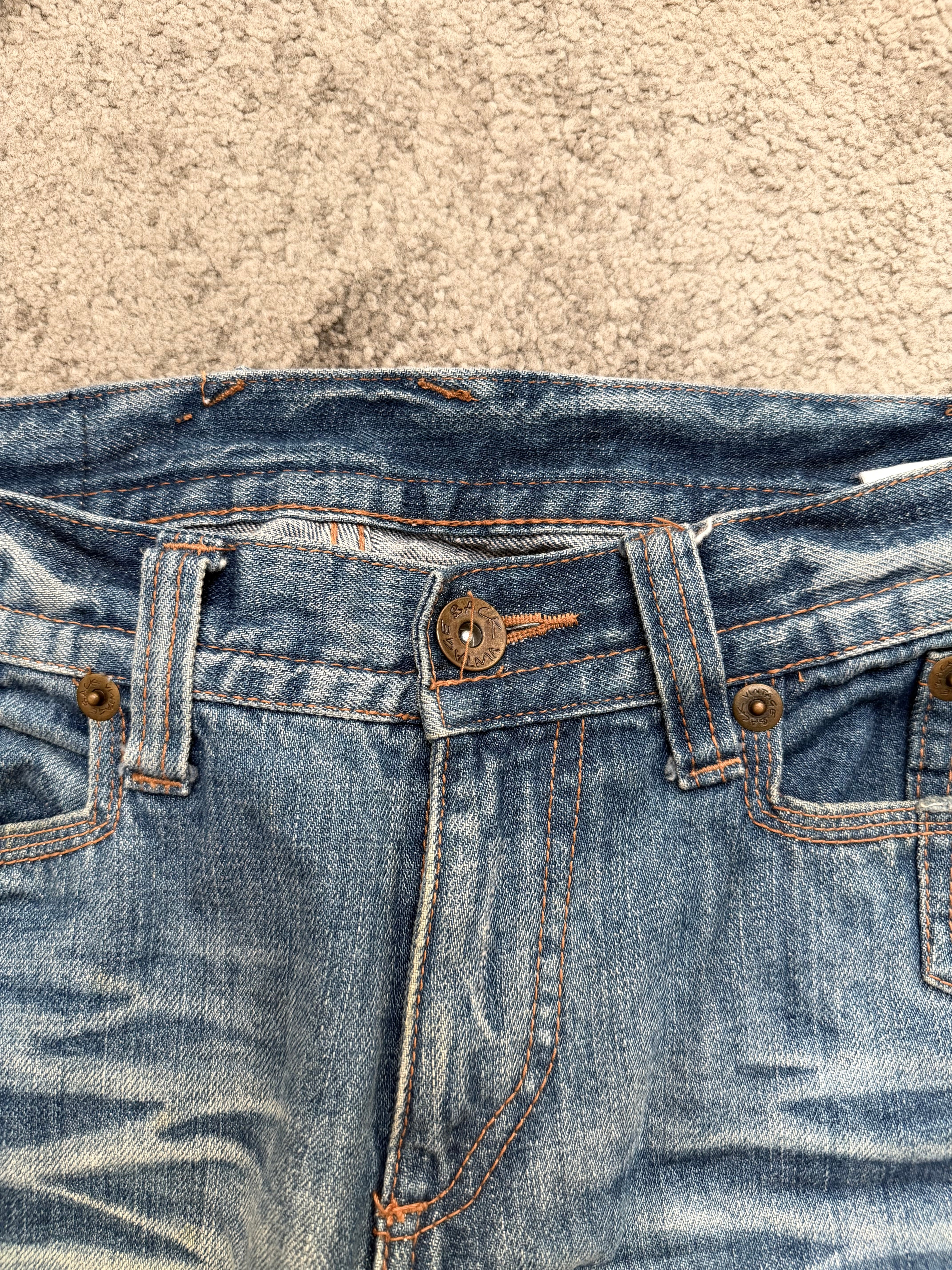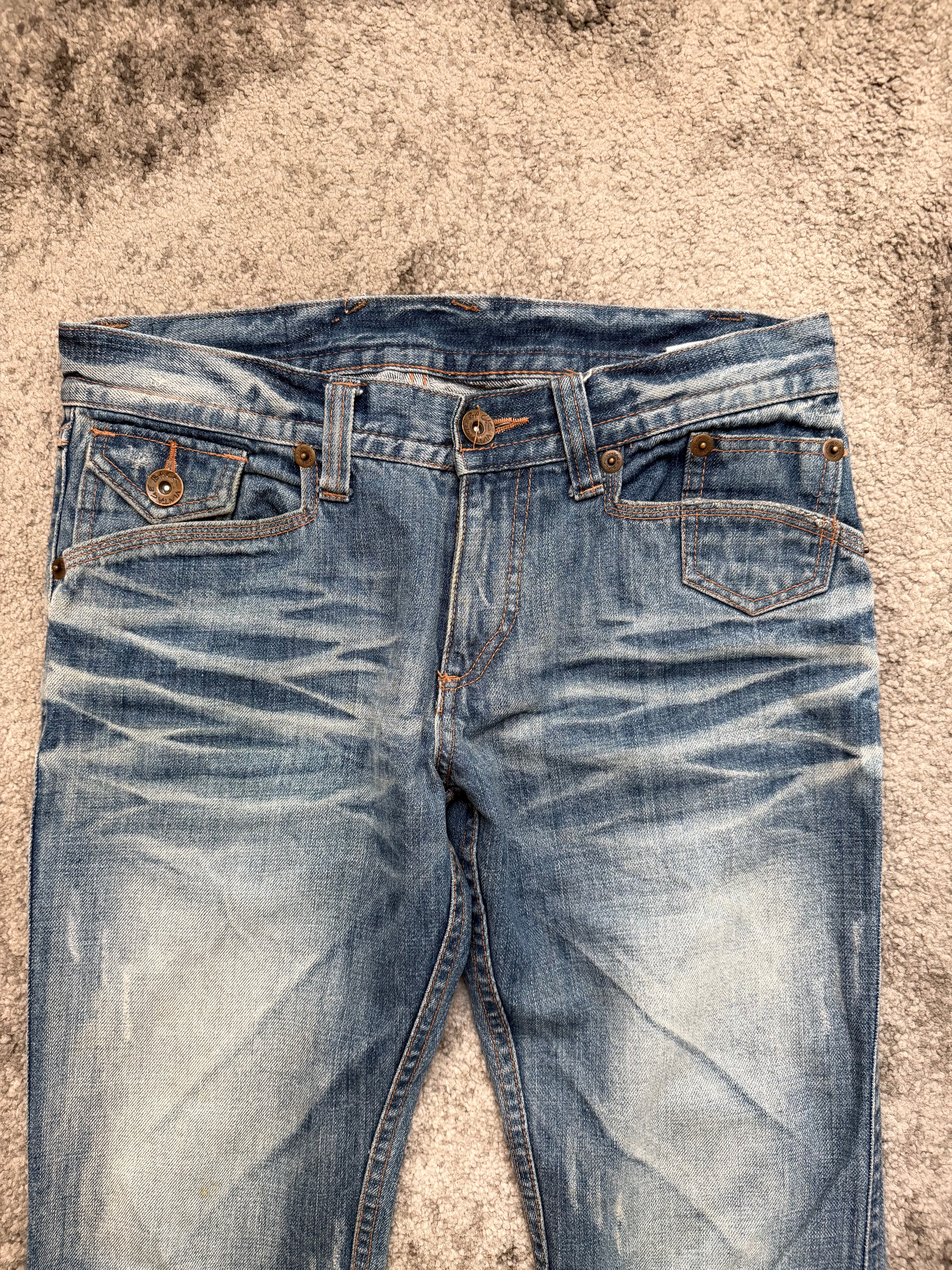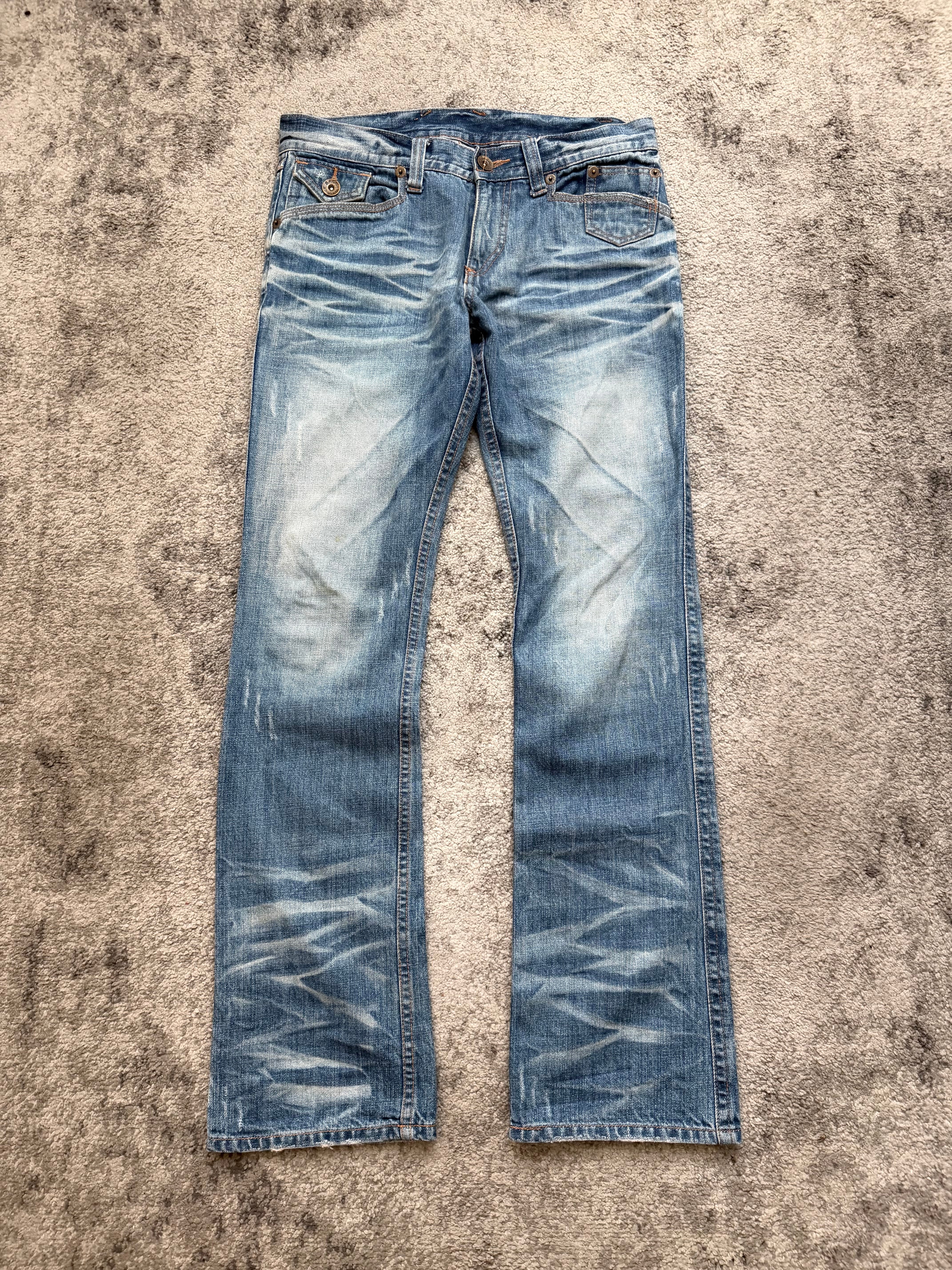 Step into that raw, unruly Japanese denim world with this BACKVINTAGE pair — a true early-2000s street-archive relic. The washed-out light blue tone, heavy whiskering, and sun-bleached fading give it that lived-in, rock-tour patina you can’t fake.