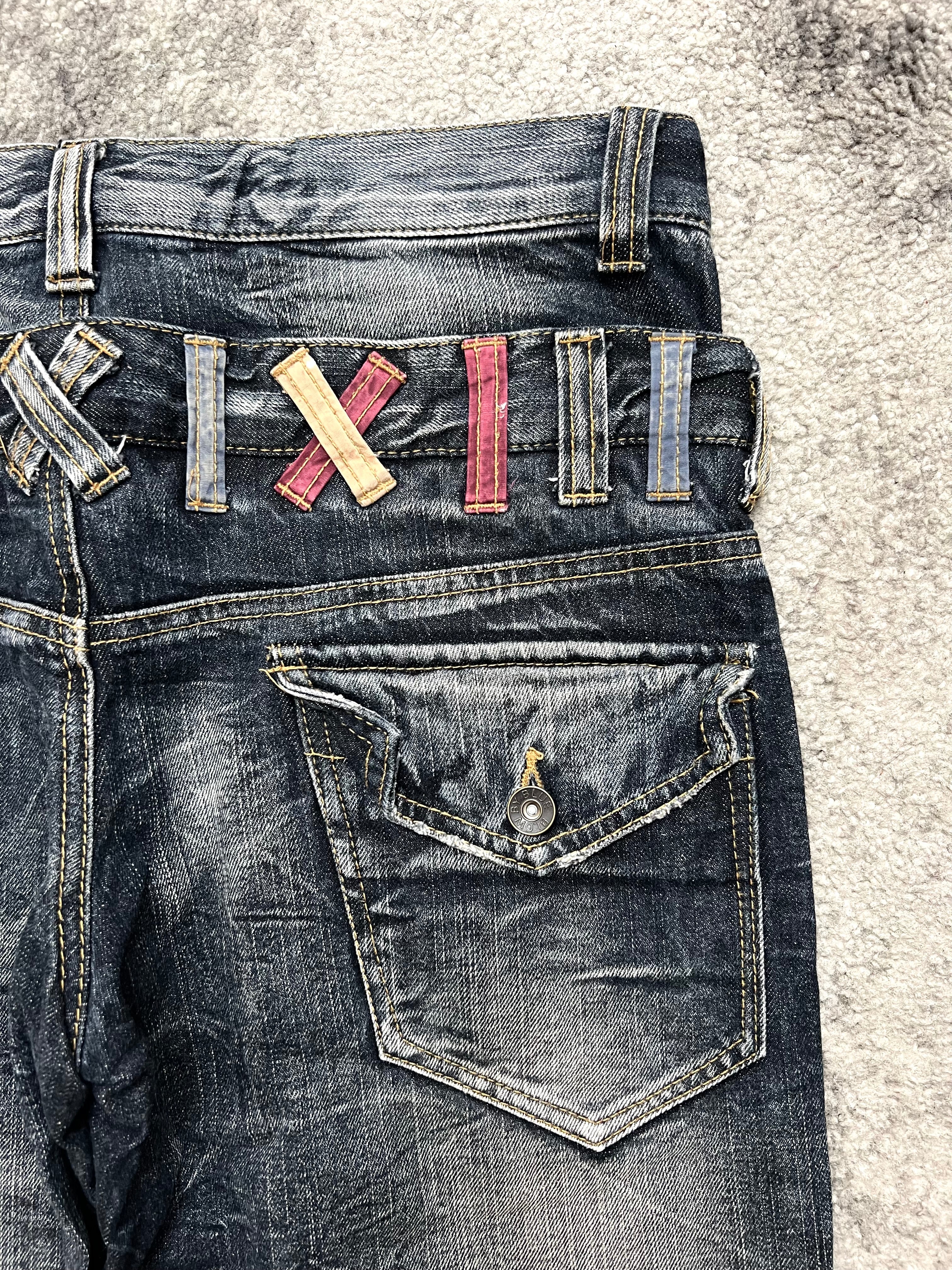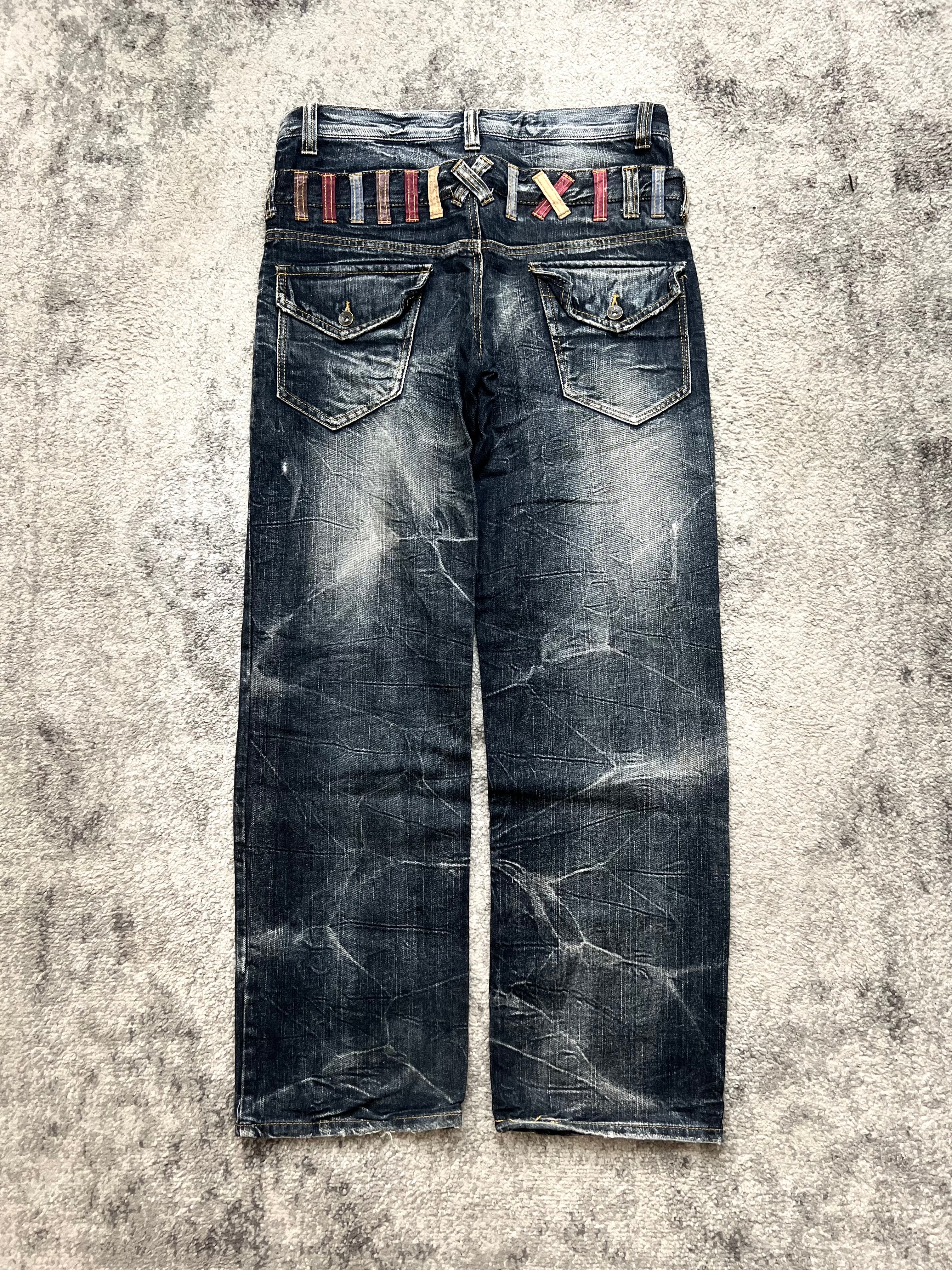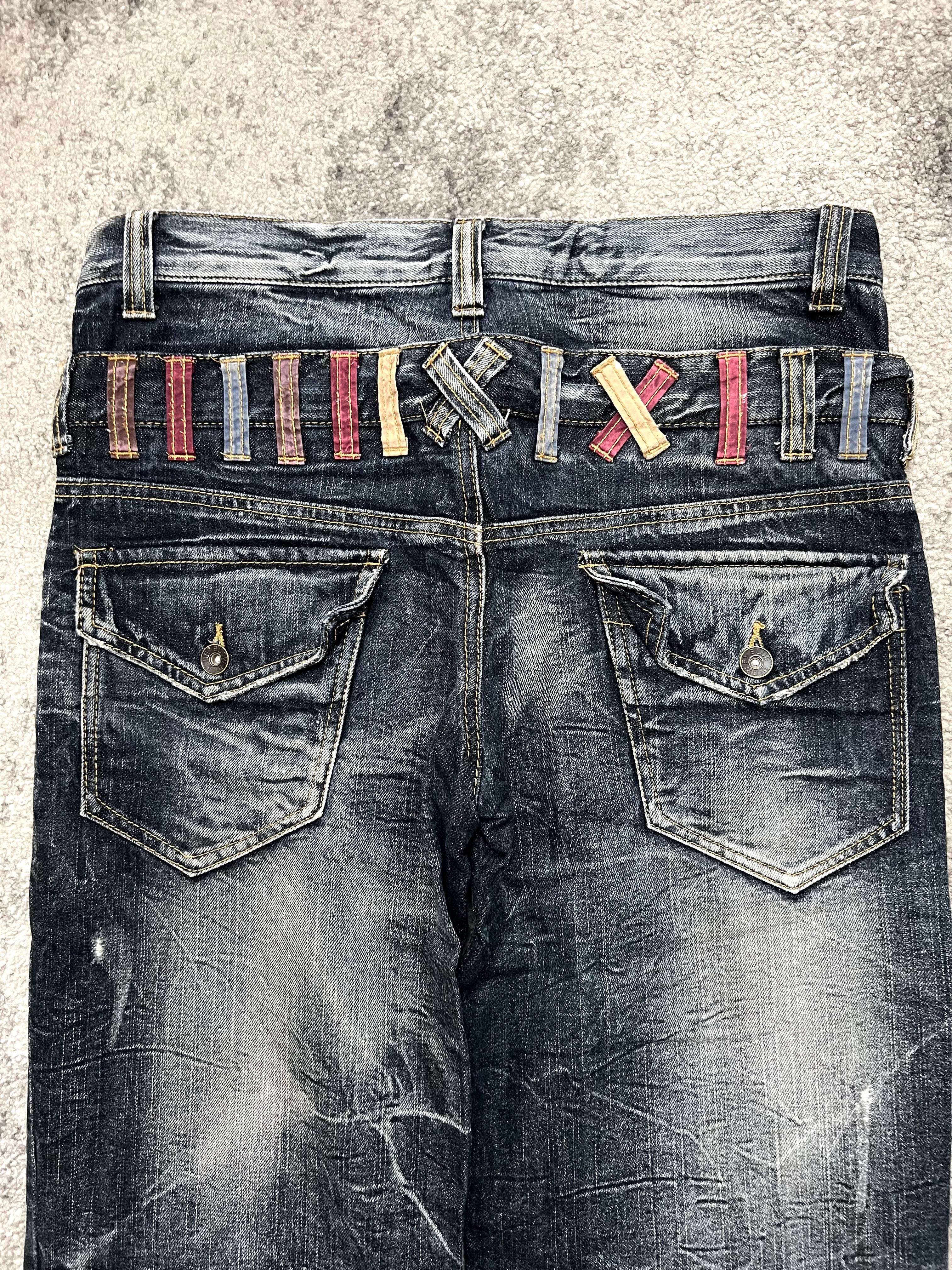A pair that laughs in the face of order — distressed, crinkled, and layered with chaos-coded belt loops in clashing shades of red, yellow, purple, and blue. This isn’t denim made for quiet moments. It’s made for alley lights, backroom shows, and anyone who refuses to blend in.