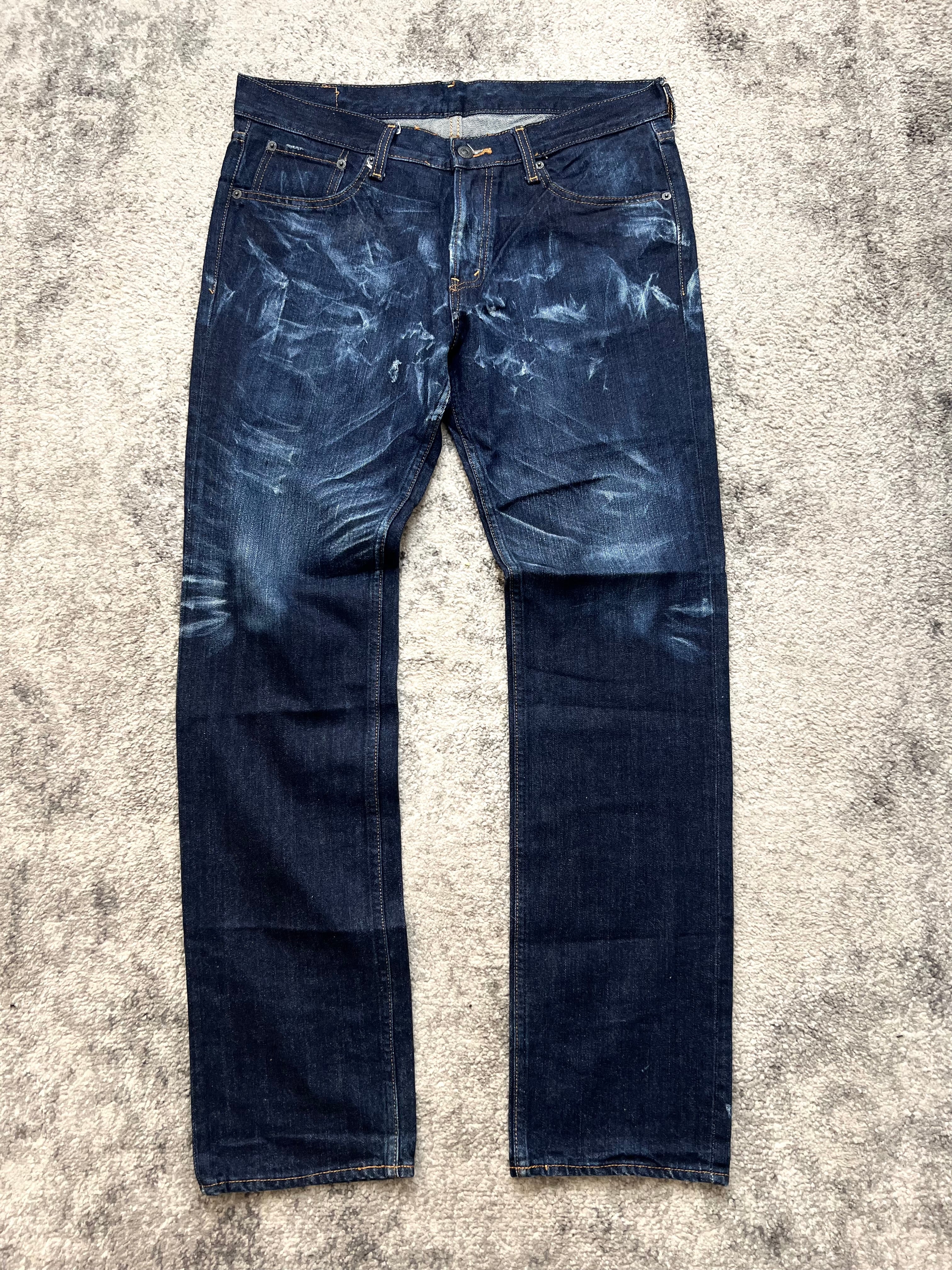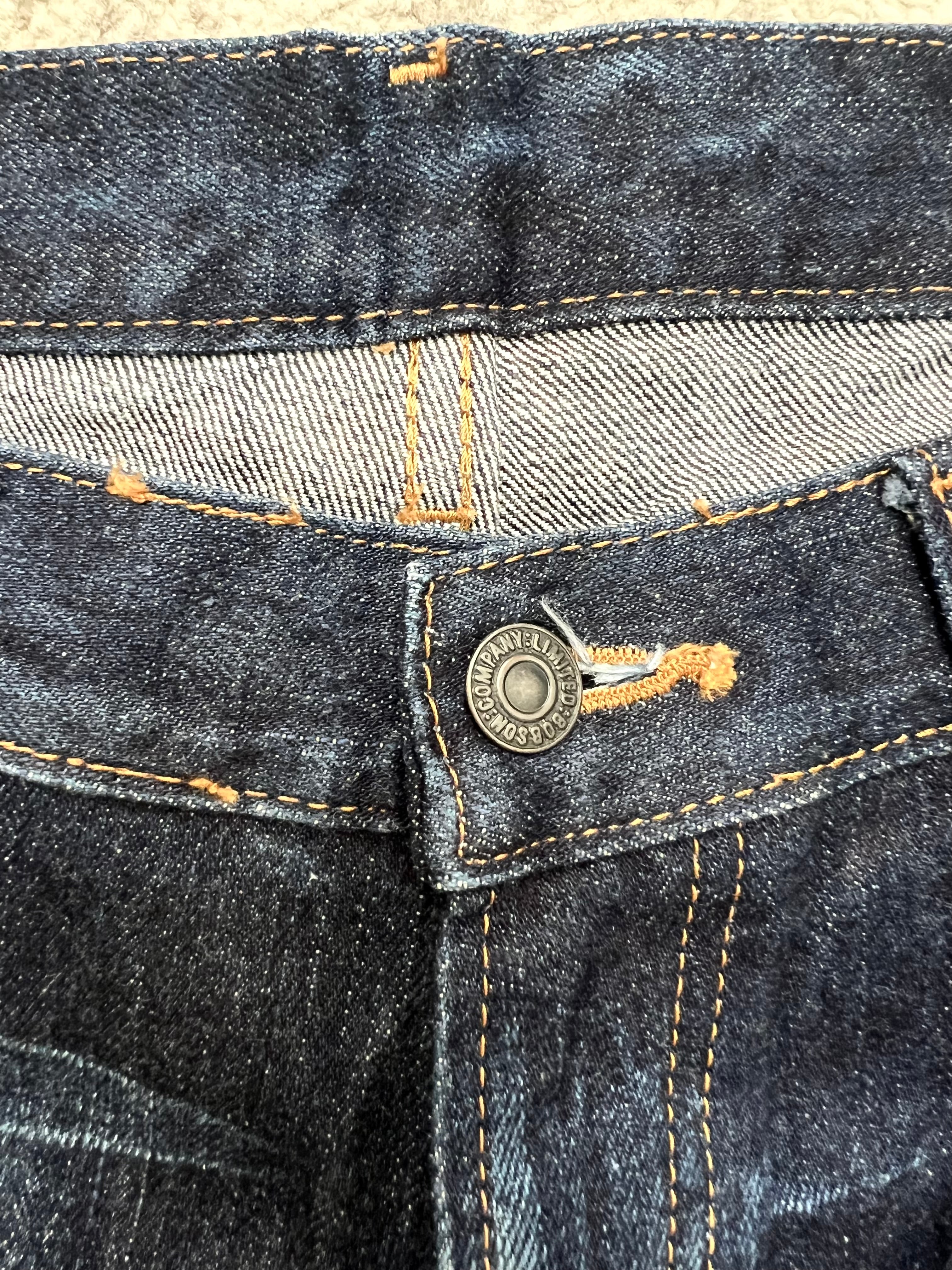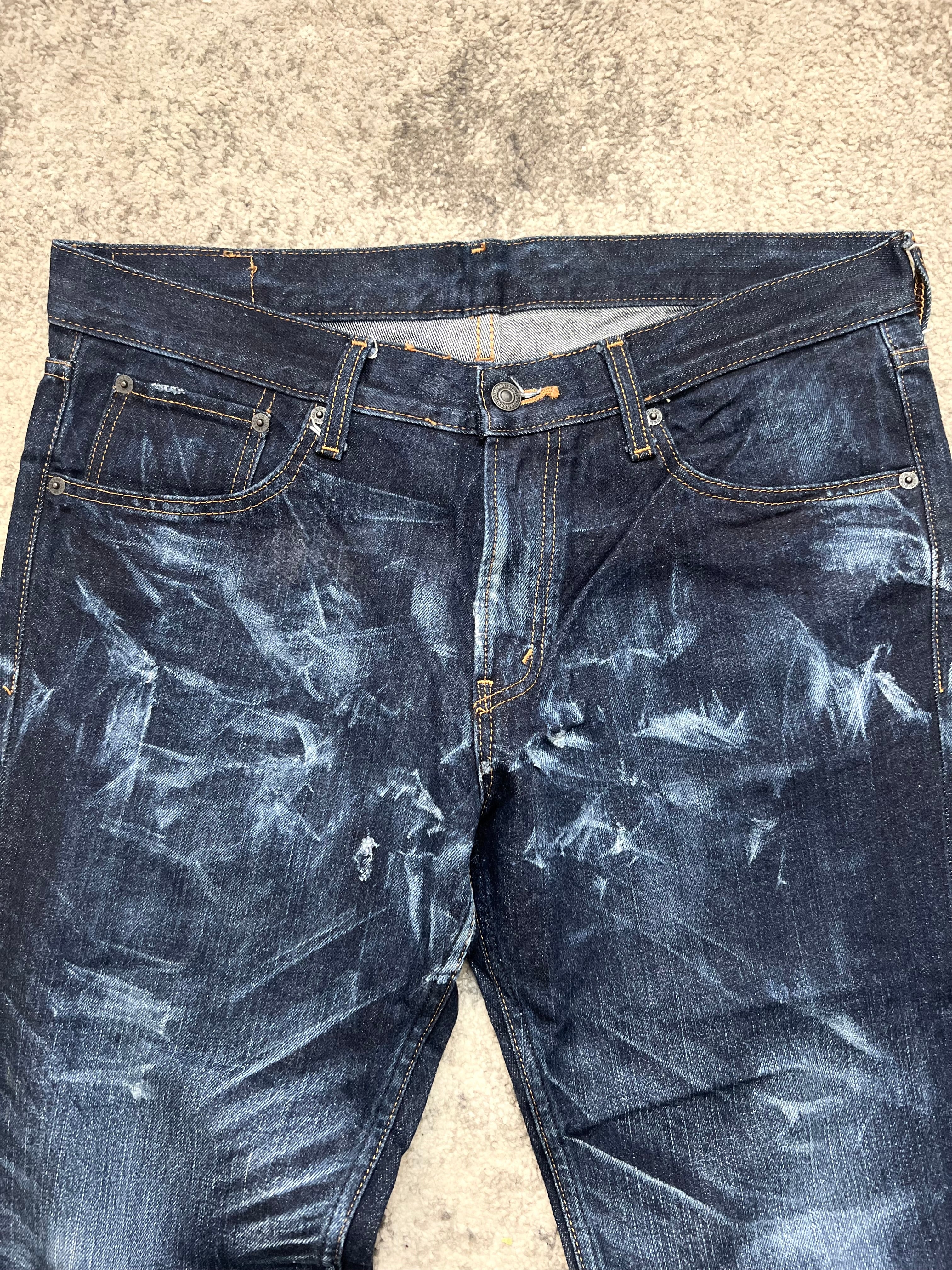 Pre-owned, excellent condition. Strong indigo base with ghost-white whiskering. No damage, no repairs—just real archive character.