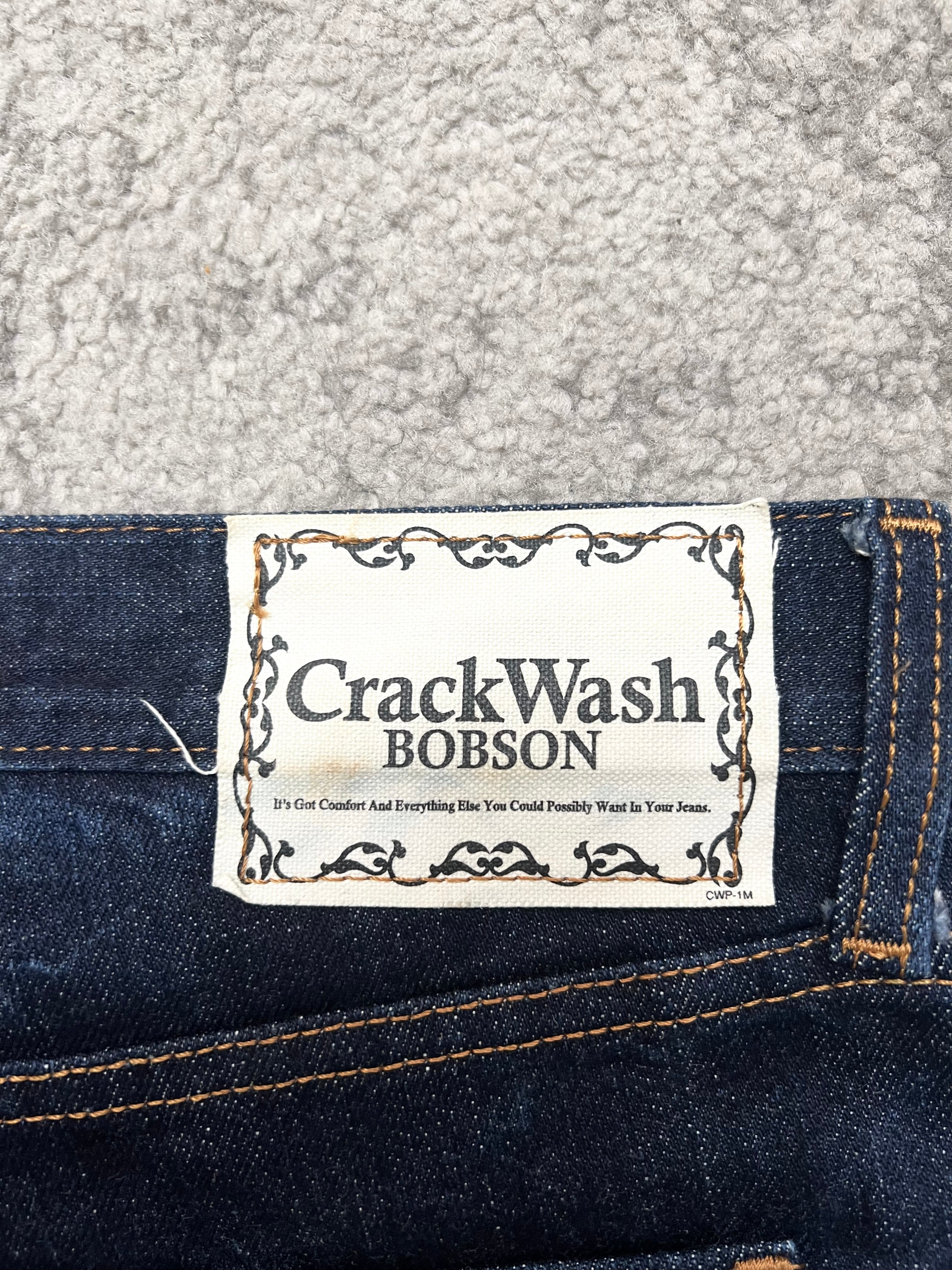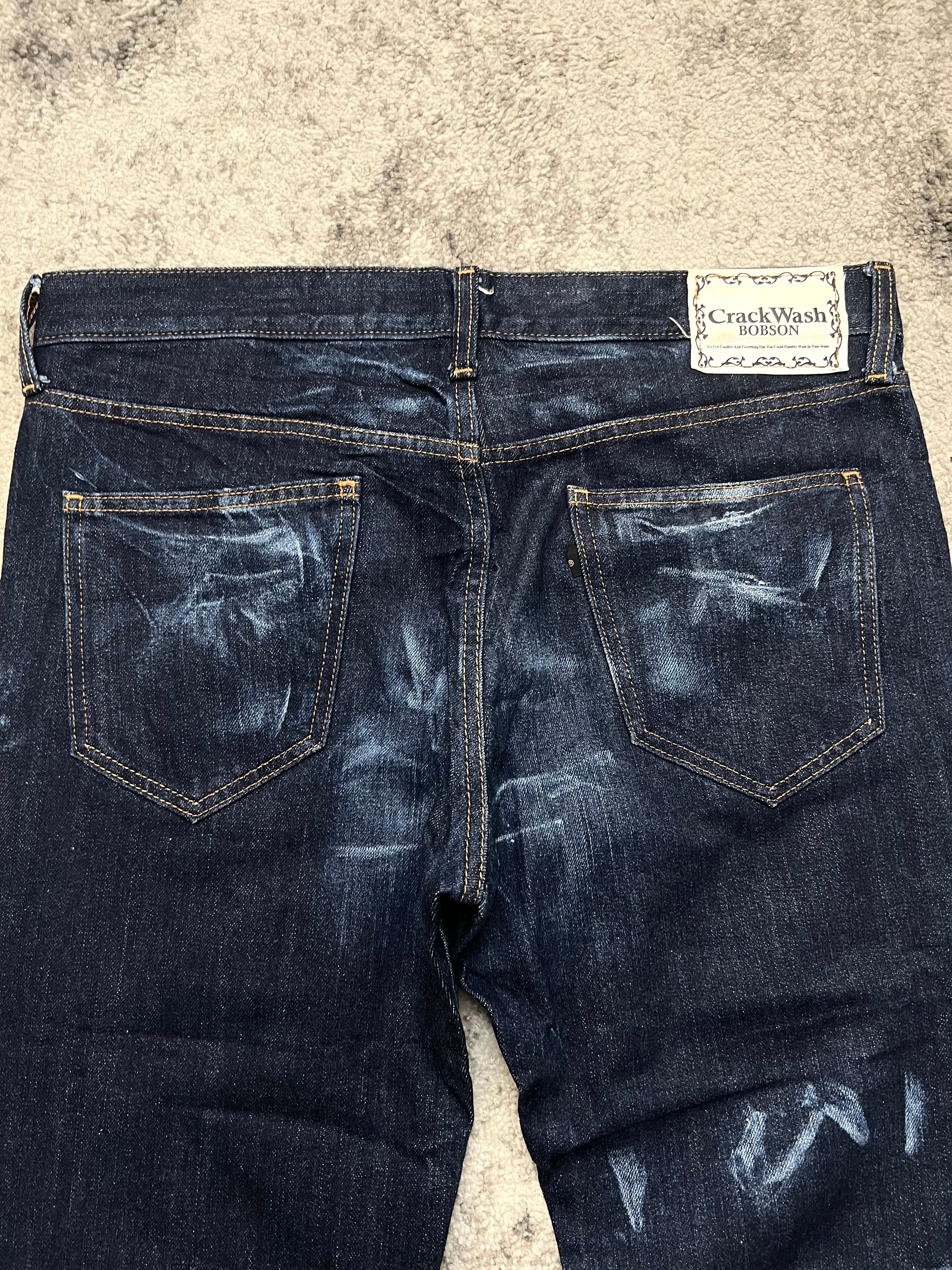 Mid-rise, straight leg. Fractured fade wash with lightning-bolt energy. Tonal stitching with contrast golden thread. Clean rear with raw abrasion highlights. White BOBSON “CrackWash” tag at waist – subtle and iconic.
