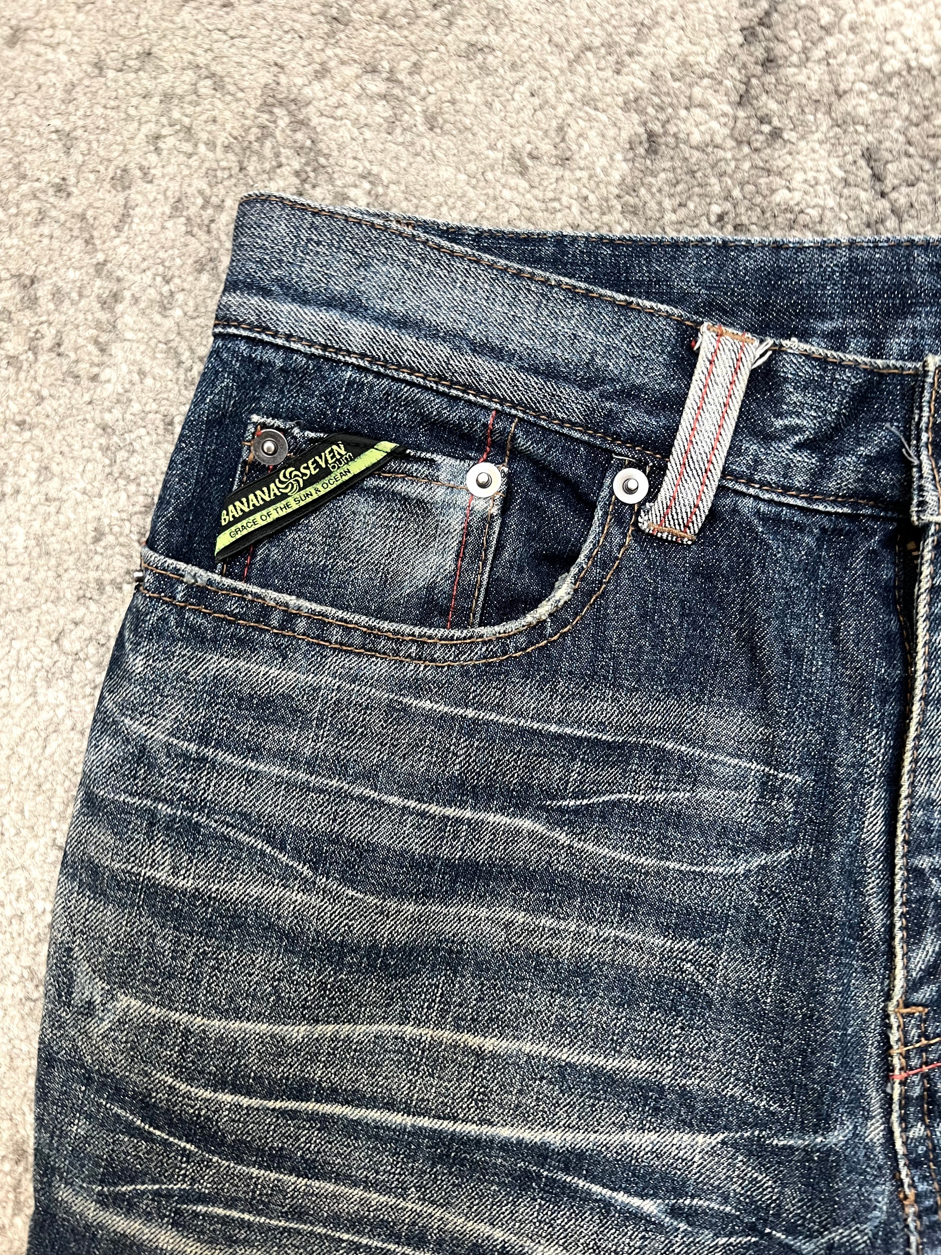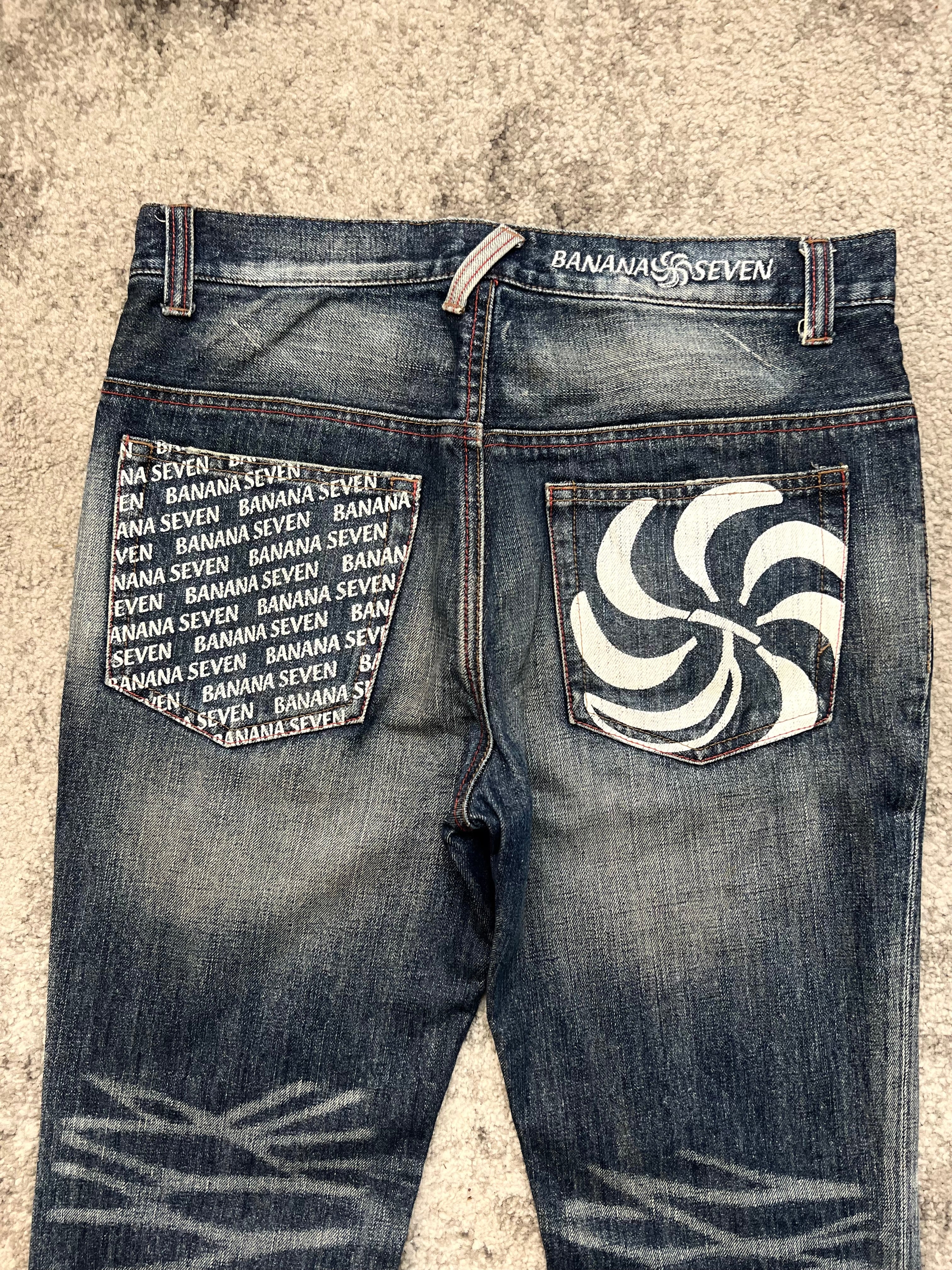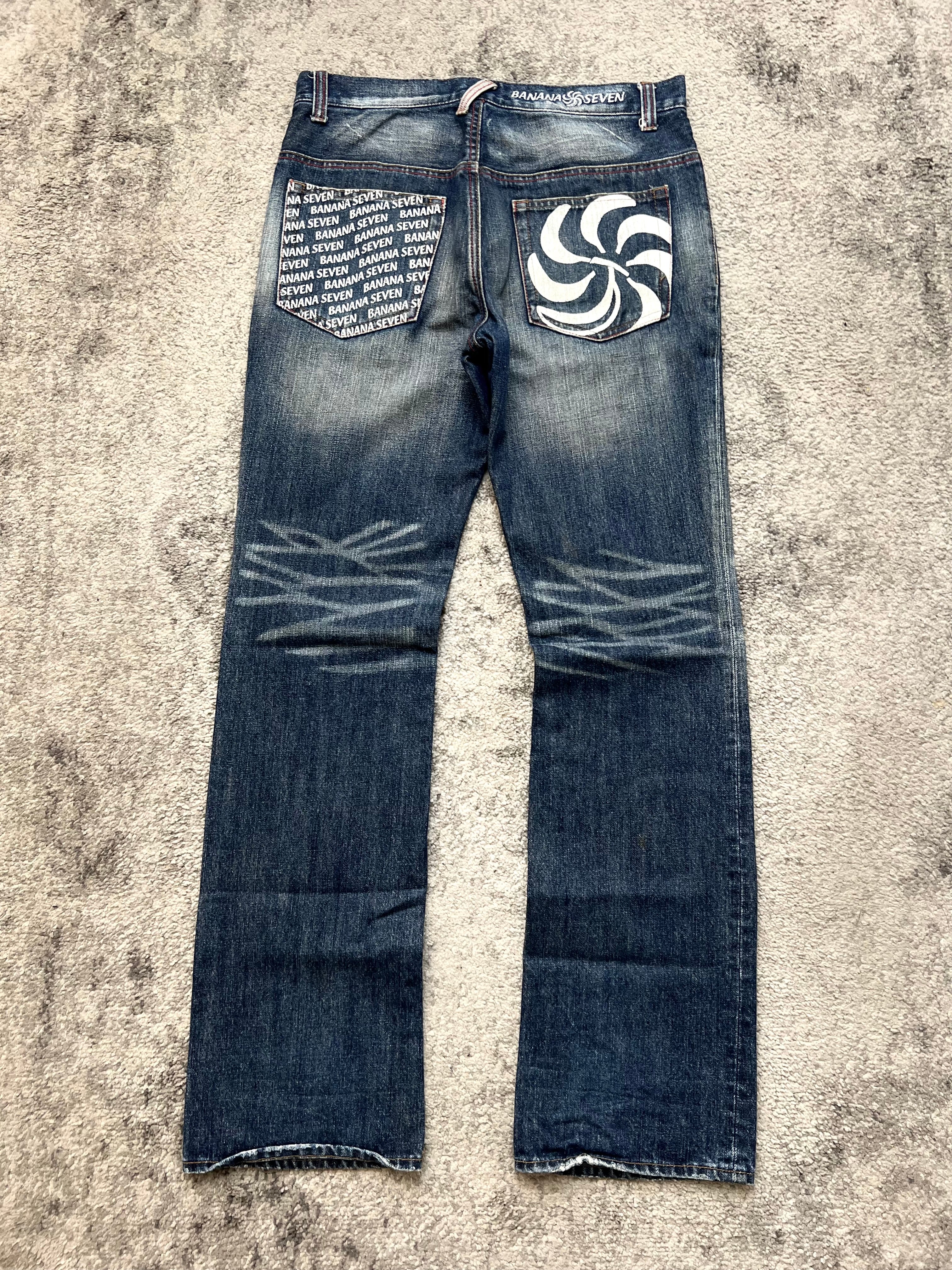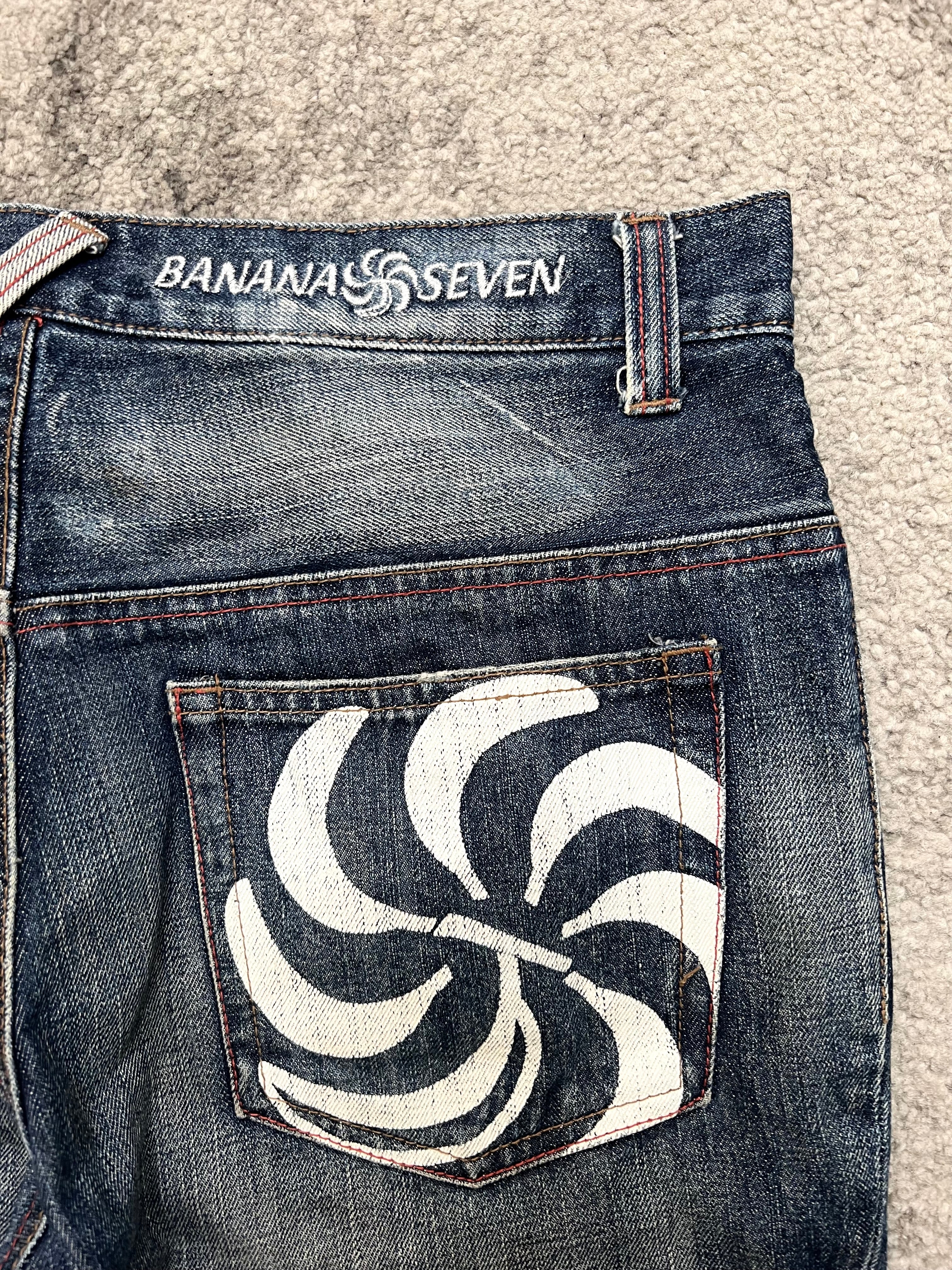 BANANA SEVEN “Psycho Swirl” Denim – chaos painted on pockets, movement frozen in indigo. A denim piece that feels like underground Tokyo graffiti turned wearable.