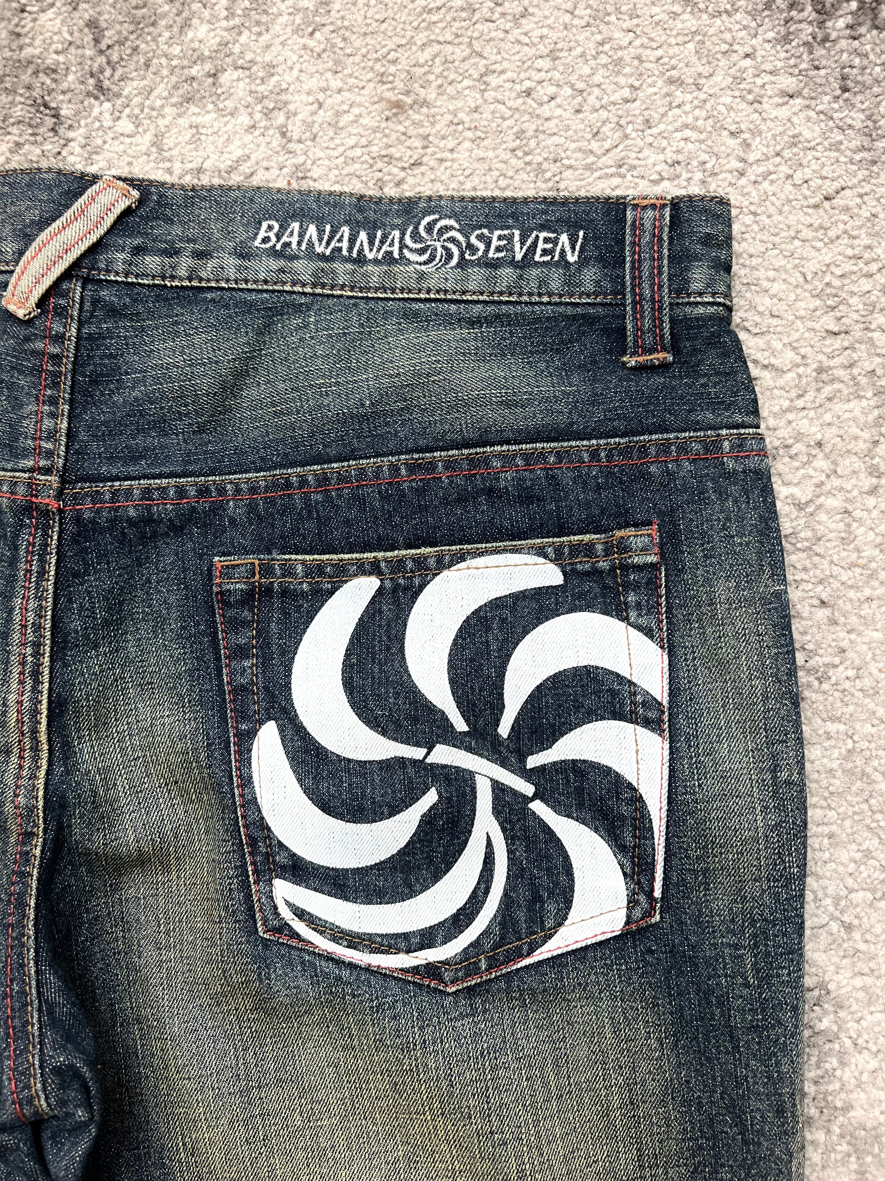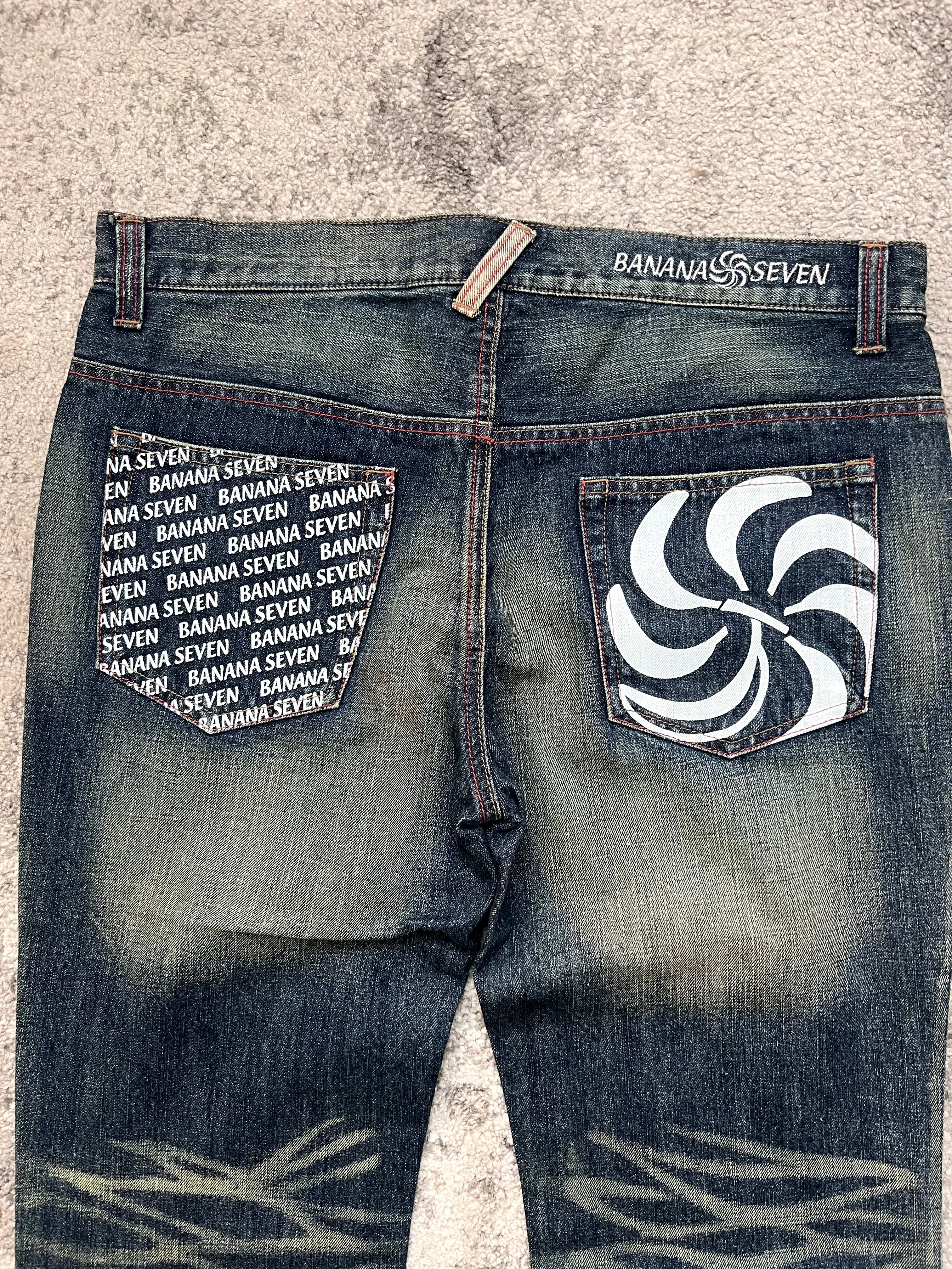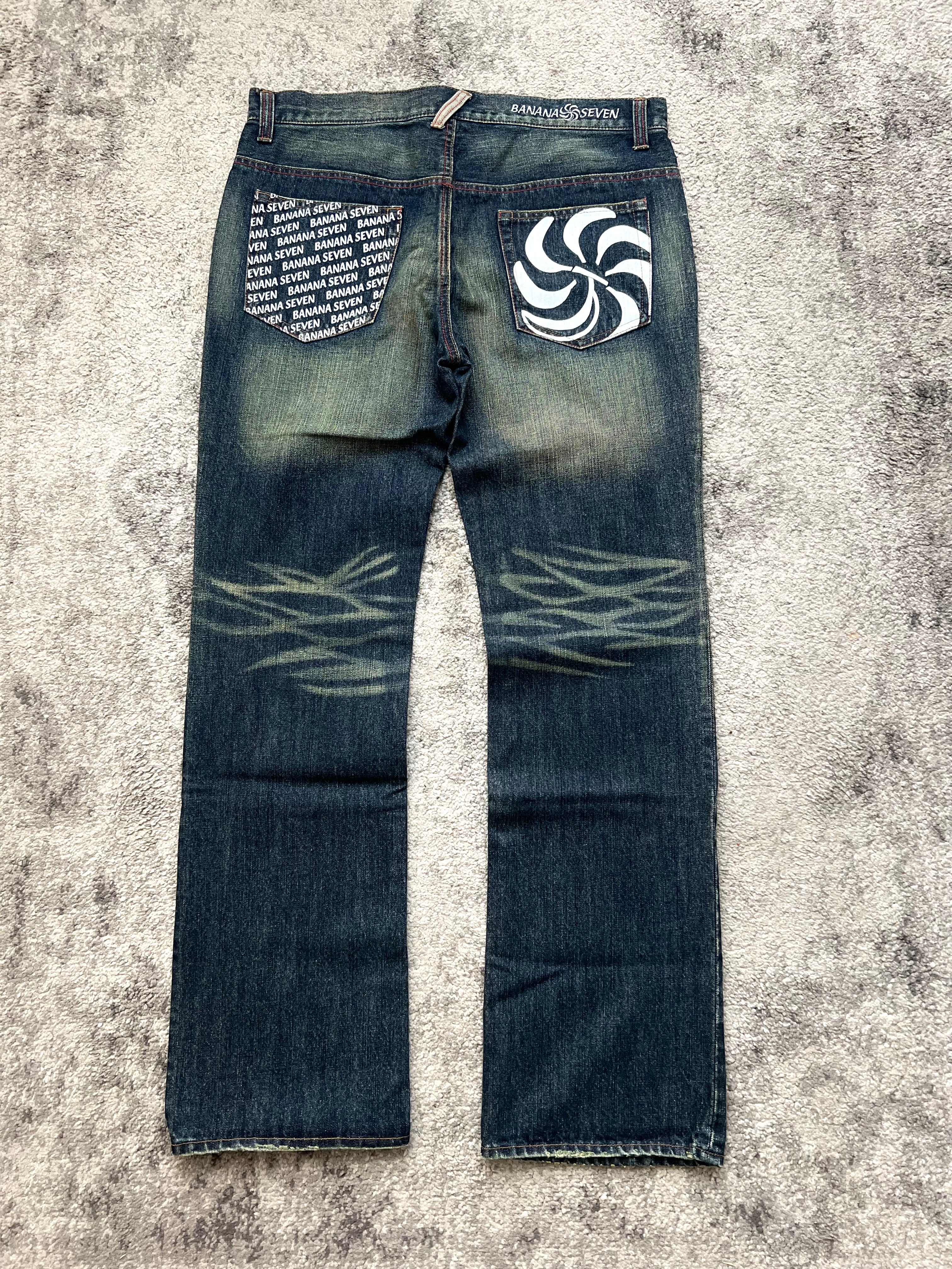 BANANA SEVEN “Backdraft Swirl” Denim – loud graphics, lived-in fades, and the edge of Japan’s early 2000s archive rebellion. A piece made for those who move against the tide.