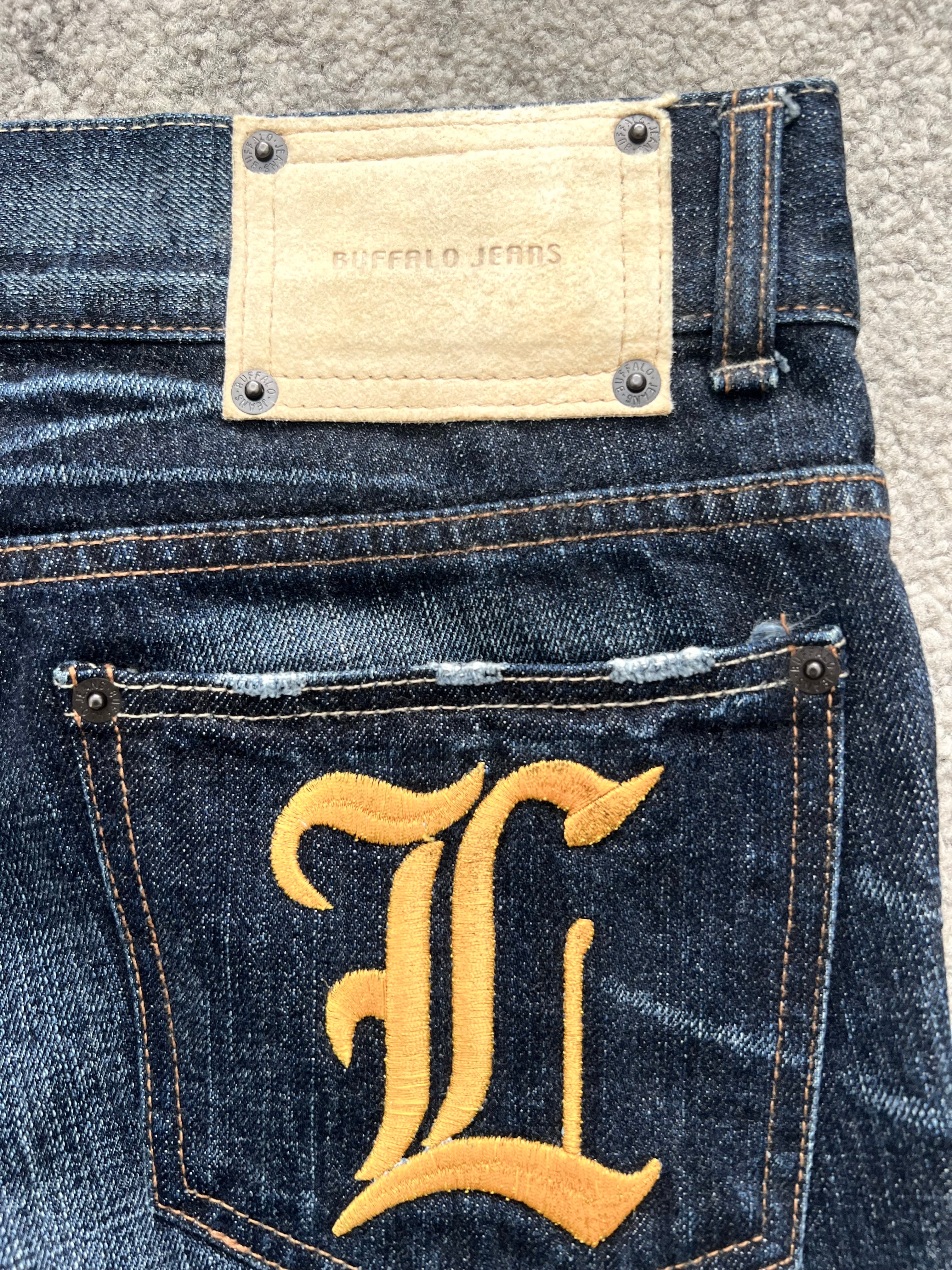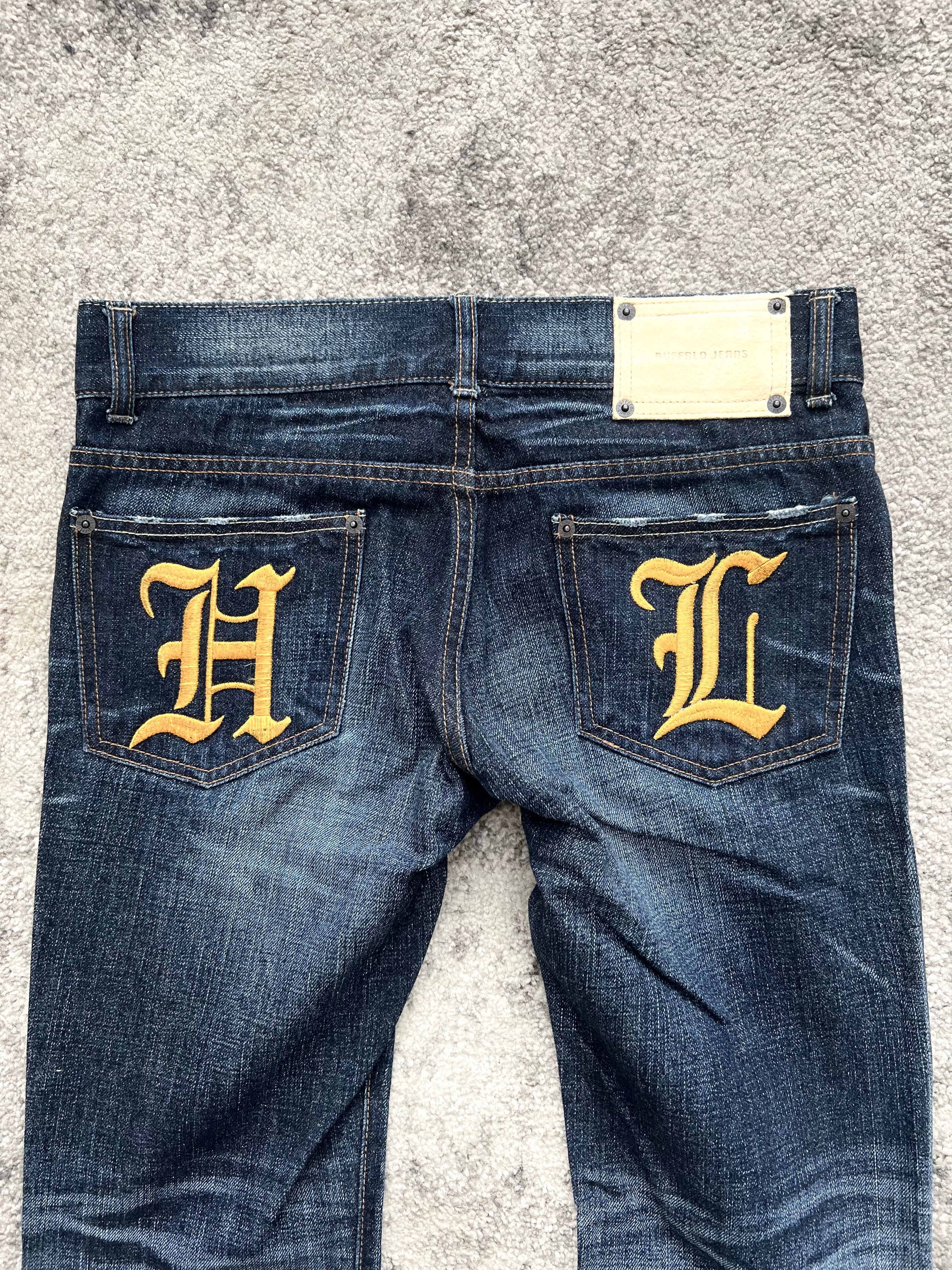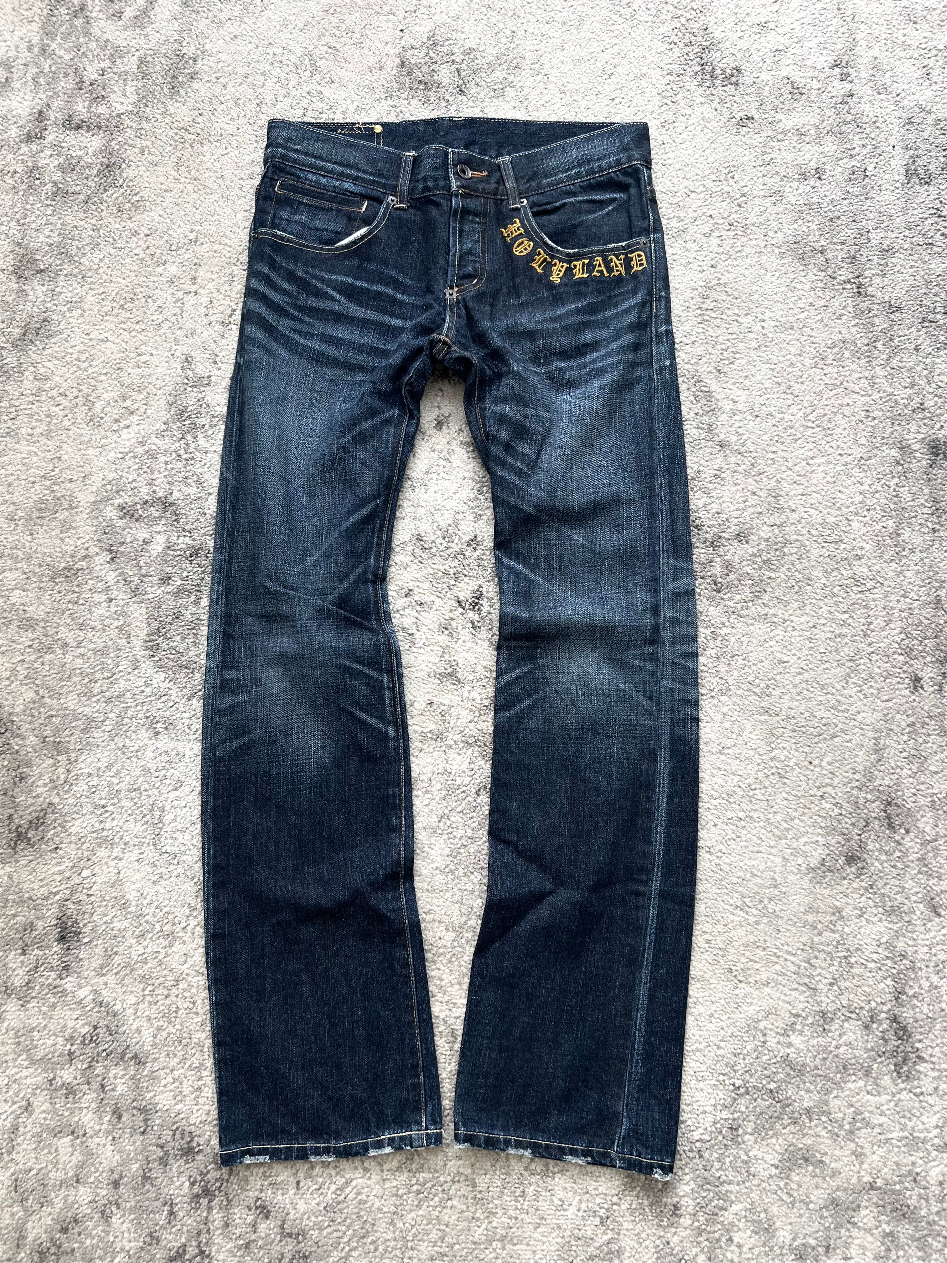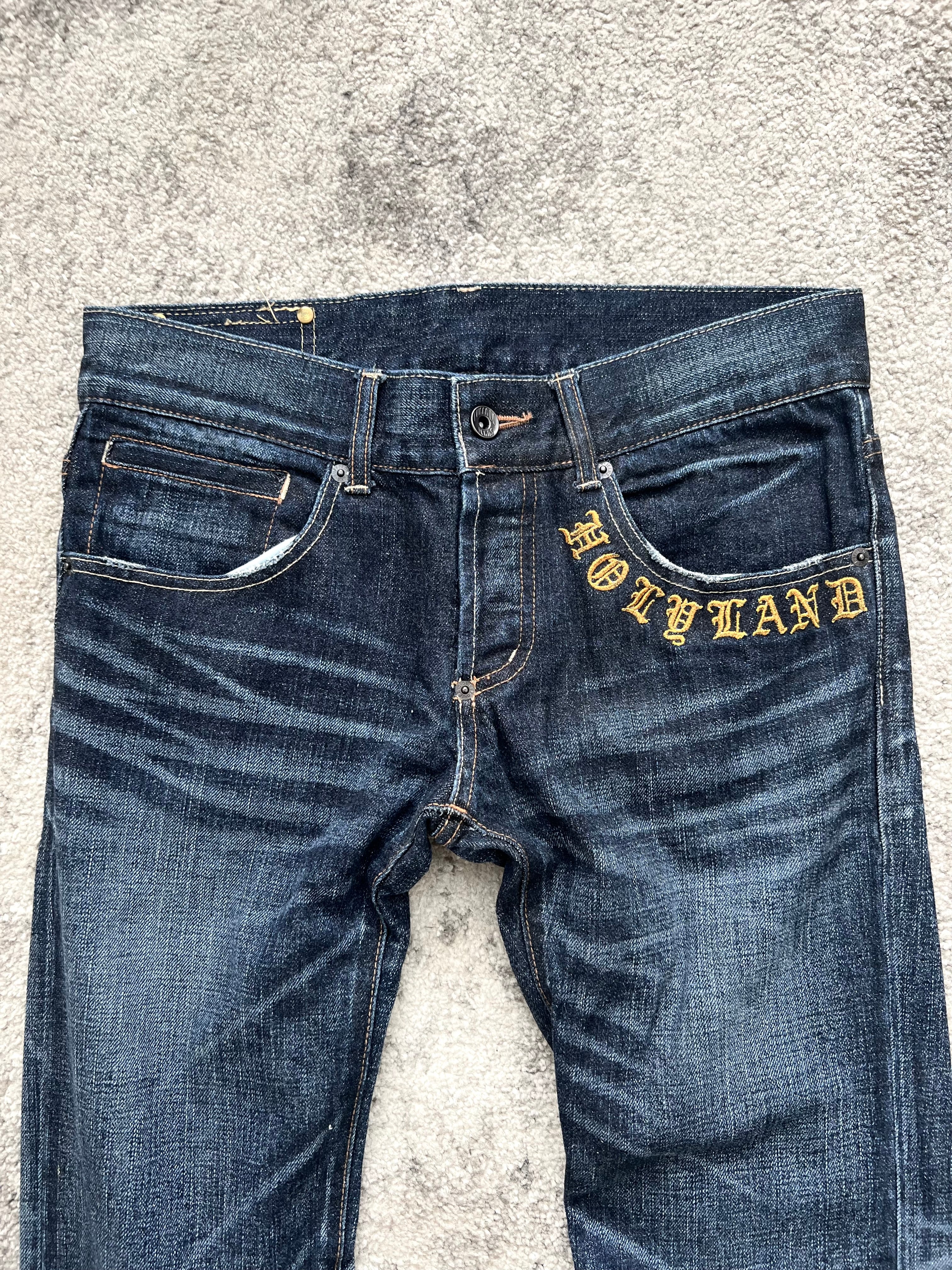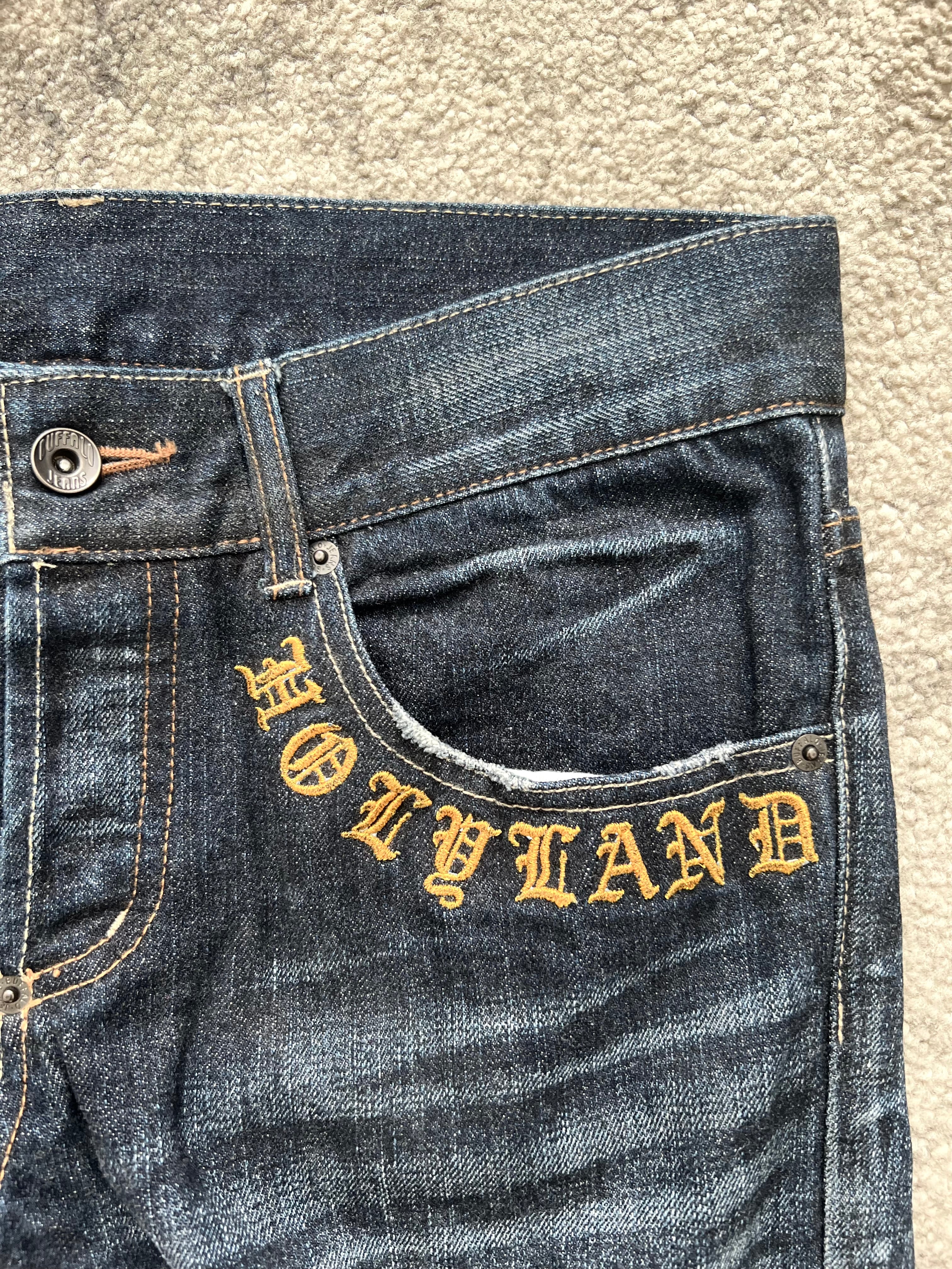 Denim scripture from the streets of Tokyo. This Buffalo Bobs pair channels archive Japan energy through clean lines, sharp fade balance, and gothic letter embroidery that screams stagewear punk meets city monk. “HOLYLAND” fronts the pocket like a whispered prophecy—while “H” and “L” blast out from the back pockets in full-blown temple font.