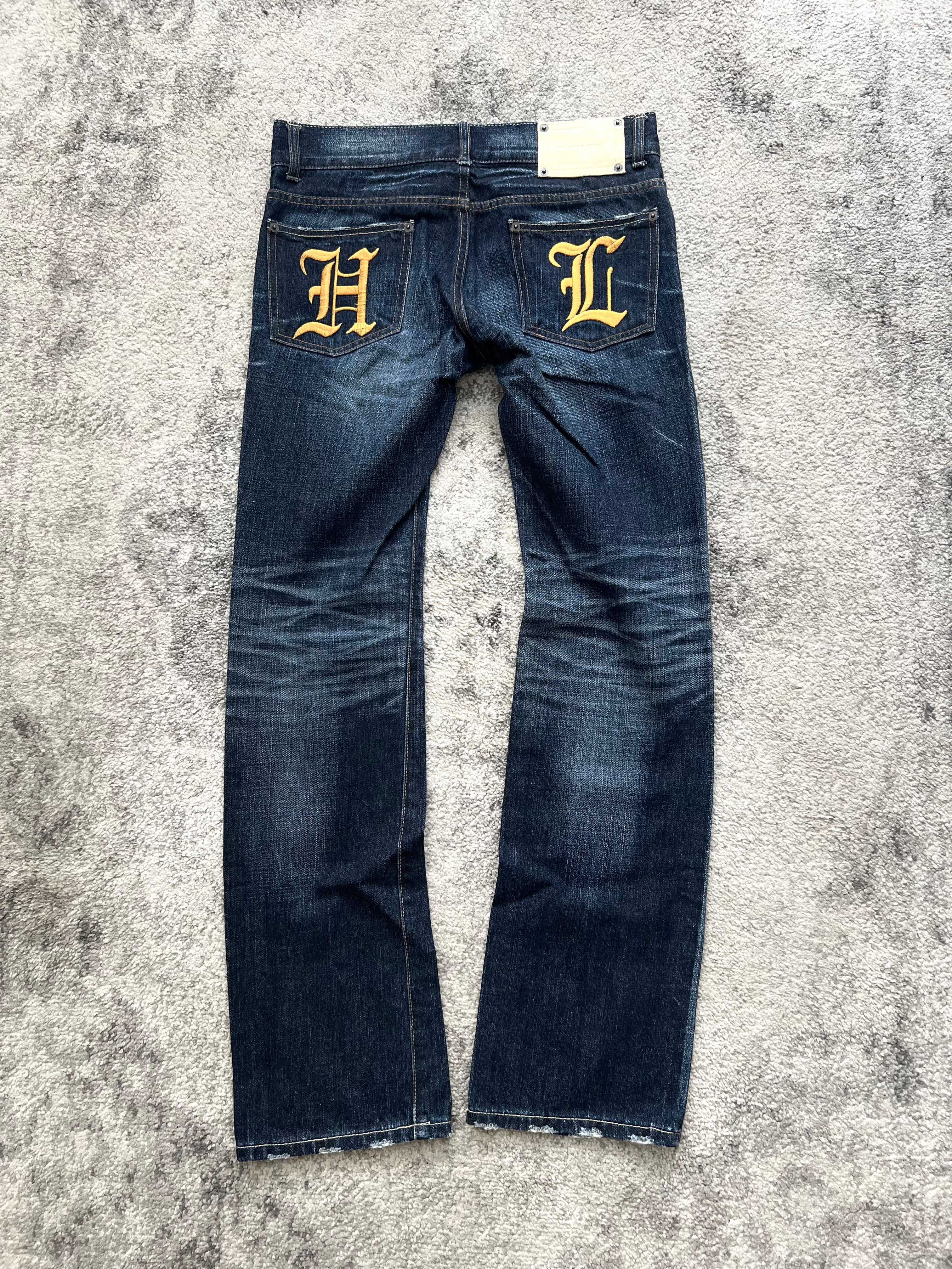 Straight fit with moderate taper, long leg break, and frayed hem finish. “HOLYLAND” yellow arc print wraps the front pocket, while the bold gothic H + L rear embroidery leaves nothing unsaid. Low-contrast fade around seams for that worn-but-kept look.