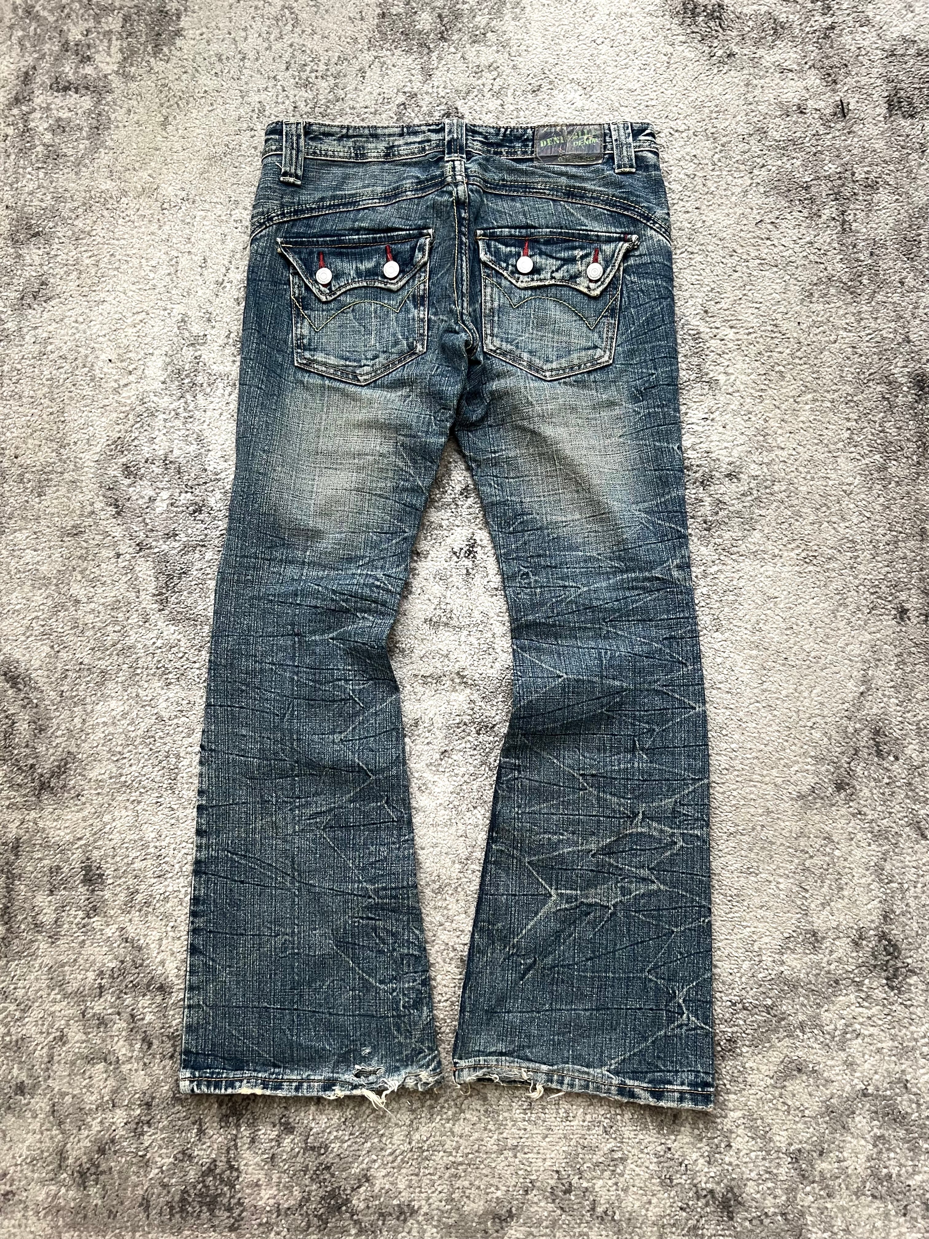 Wide-straight cut with mid-rise fit. Iconic sweeping seam pattern across the legs, creating a distorted, organic flow. Frayed hems, angled rear pockets with bold red stitch details. Looks like it came from a lost Tokyo subculture.
