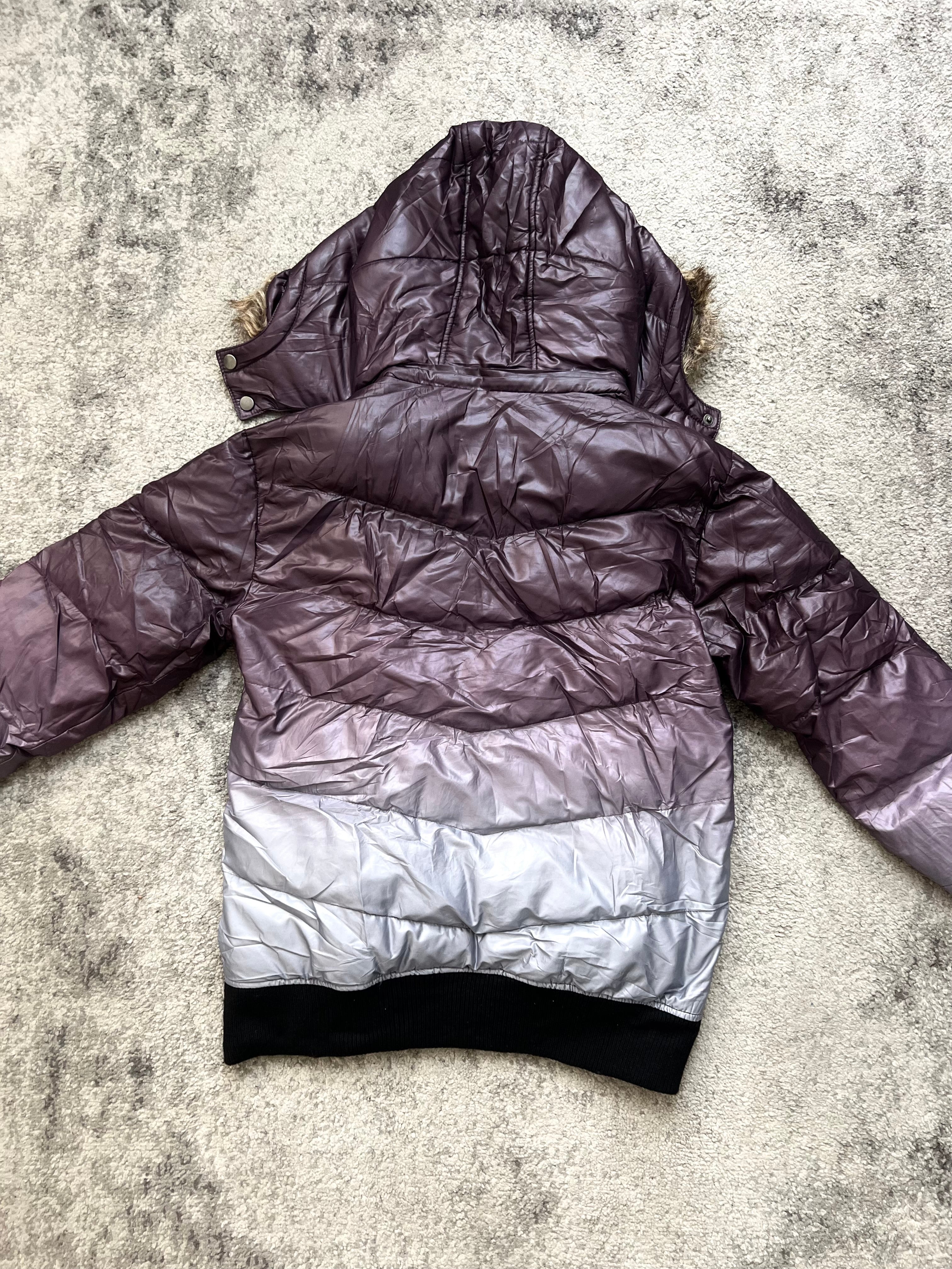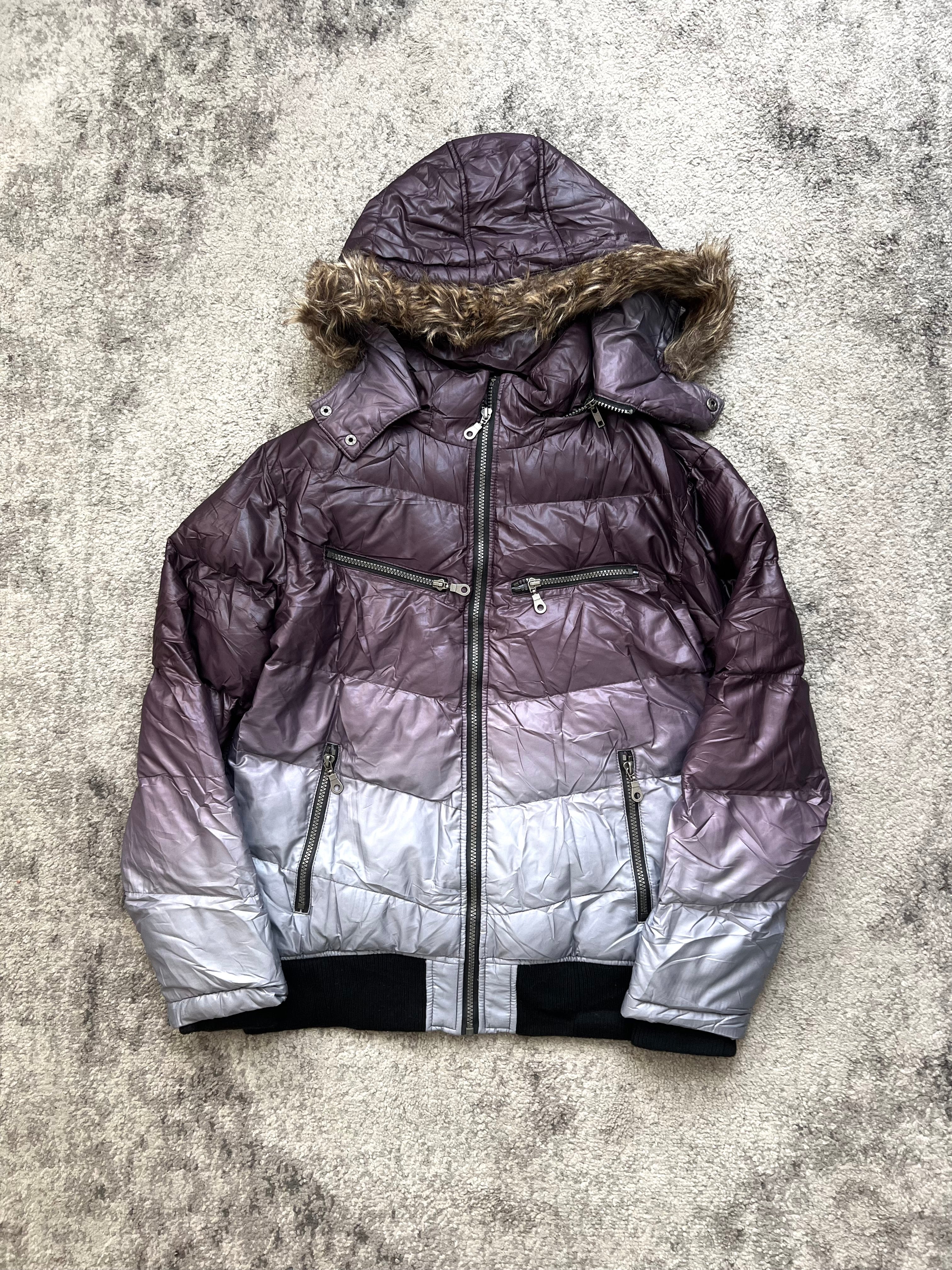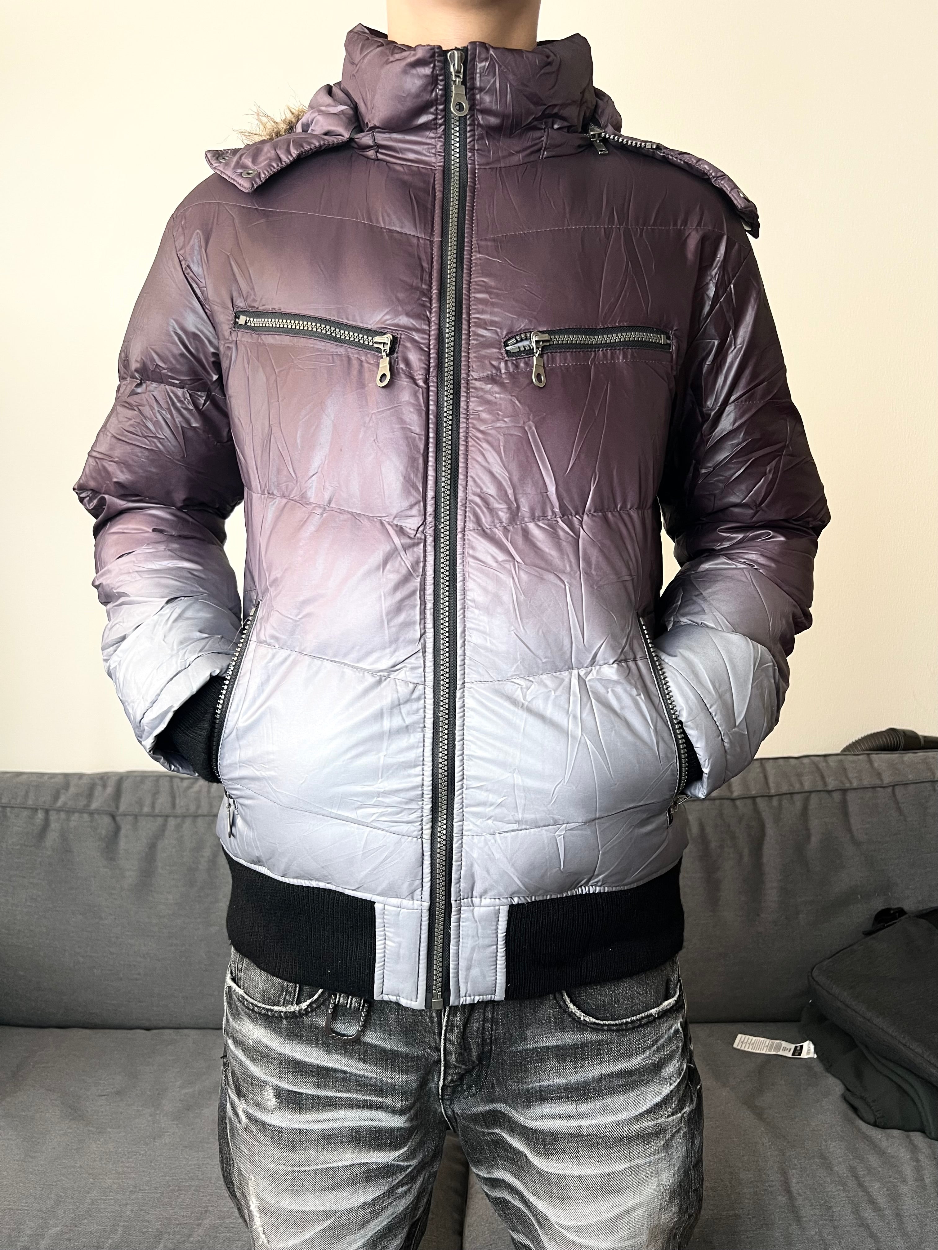 This down jacket from COLLINS feels like it was lifted straight out of the Japanese archive — a metallic fade that shifts from deep plum to silver-grey, catching light like a storm breaking through the night. The detachable fur-trimmed hood and heavy zippers give it that gritty, Number (N)ine energy, a piece that blurs the line between street and avant-garde.