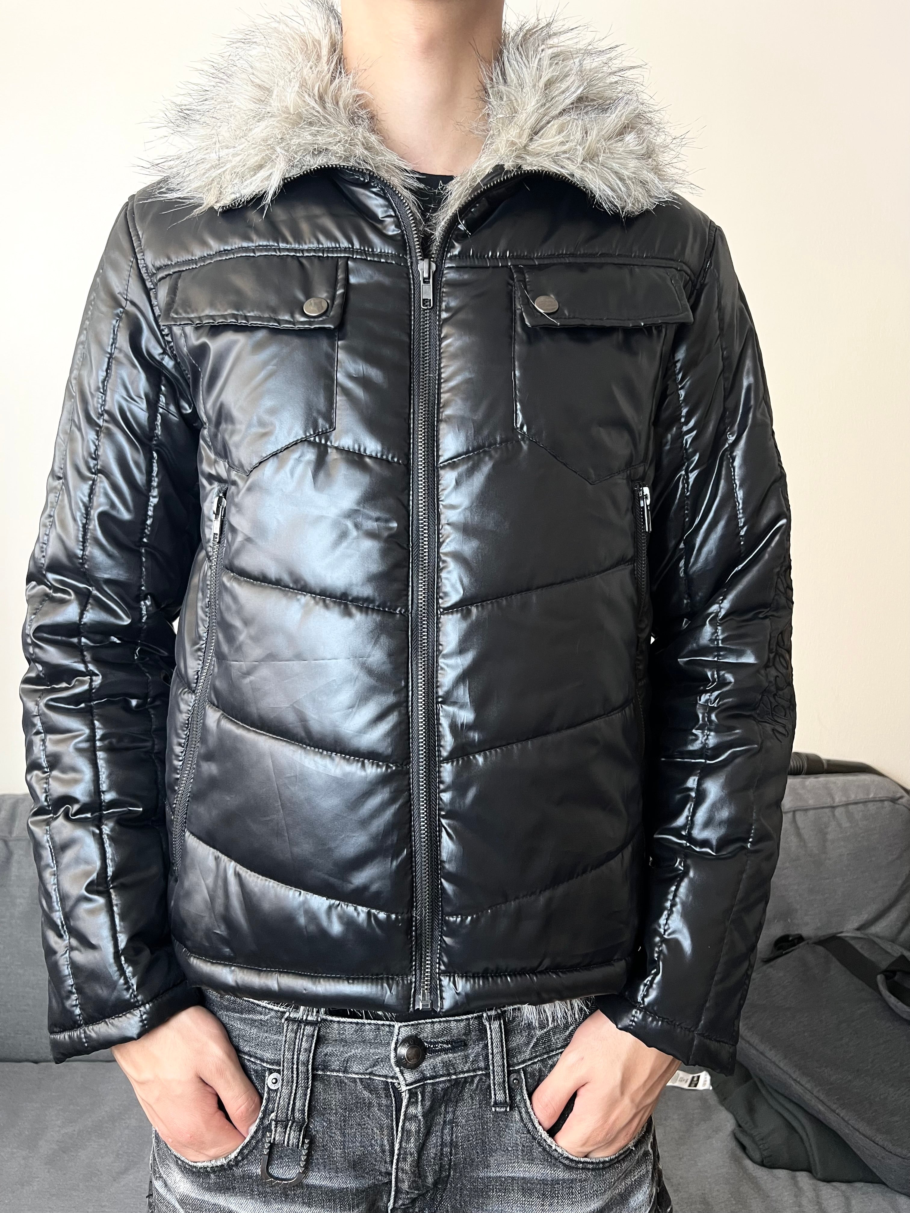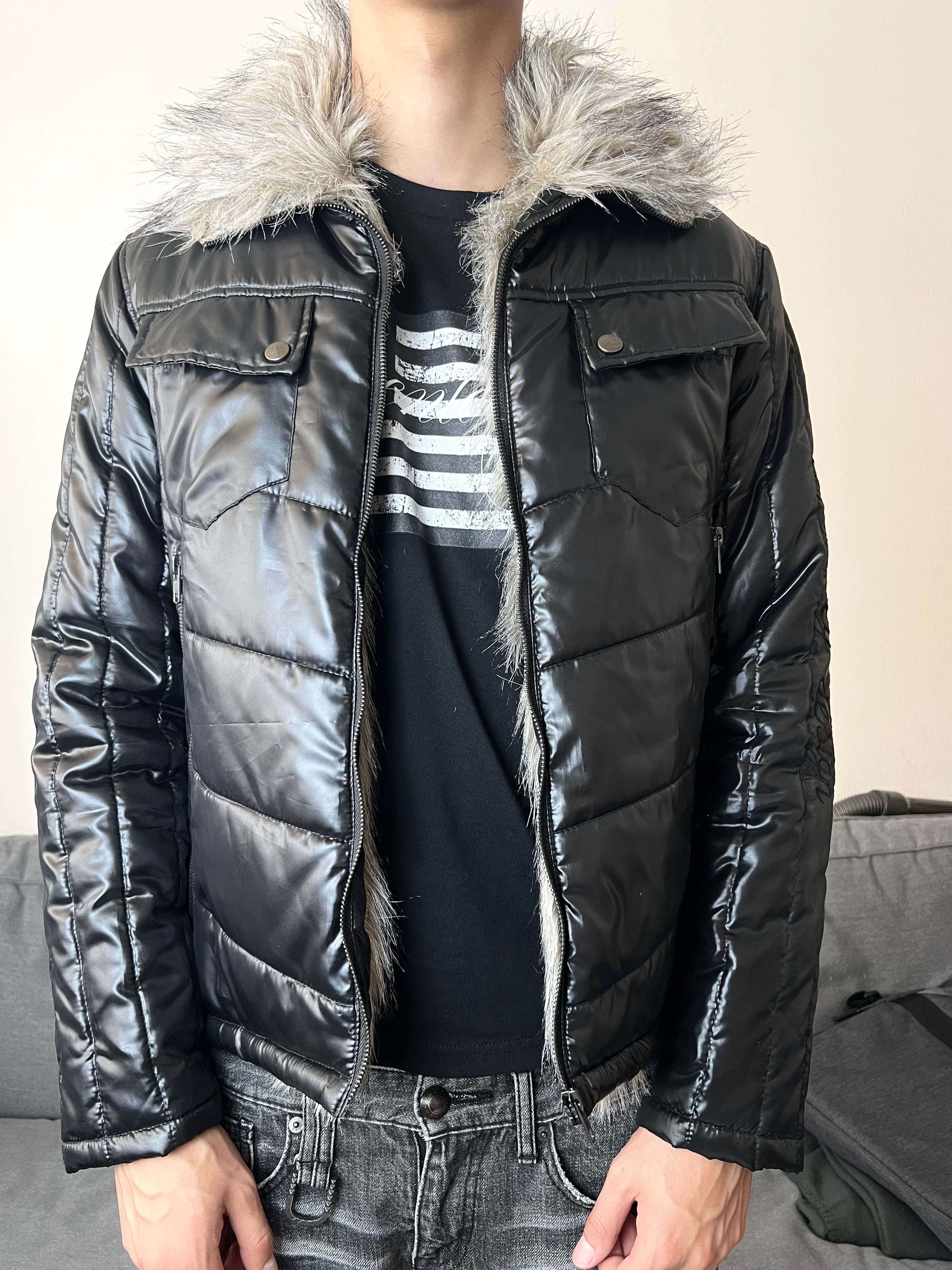 This piece from CRAFT WORKS carries that underground Japanese archive tension — a jet-black puffer finished with a sharp faux-fur collar that gives it a feral, Number (N)ine-like edge. The fabric shines with a subtle gloss, armored yet fluid, while the cut keeps things sleek and street-ready. It’s part rebel outerwear, part winter shield.