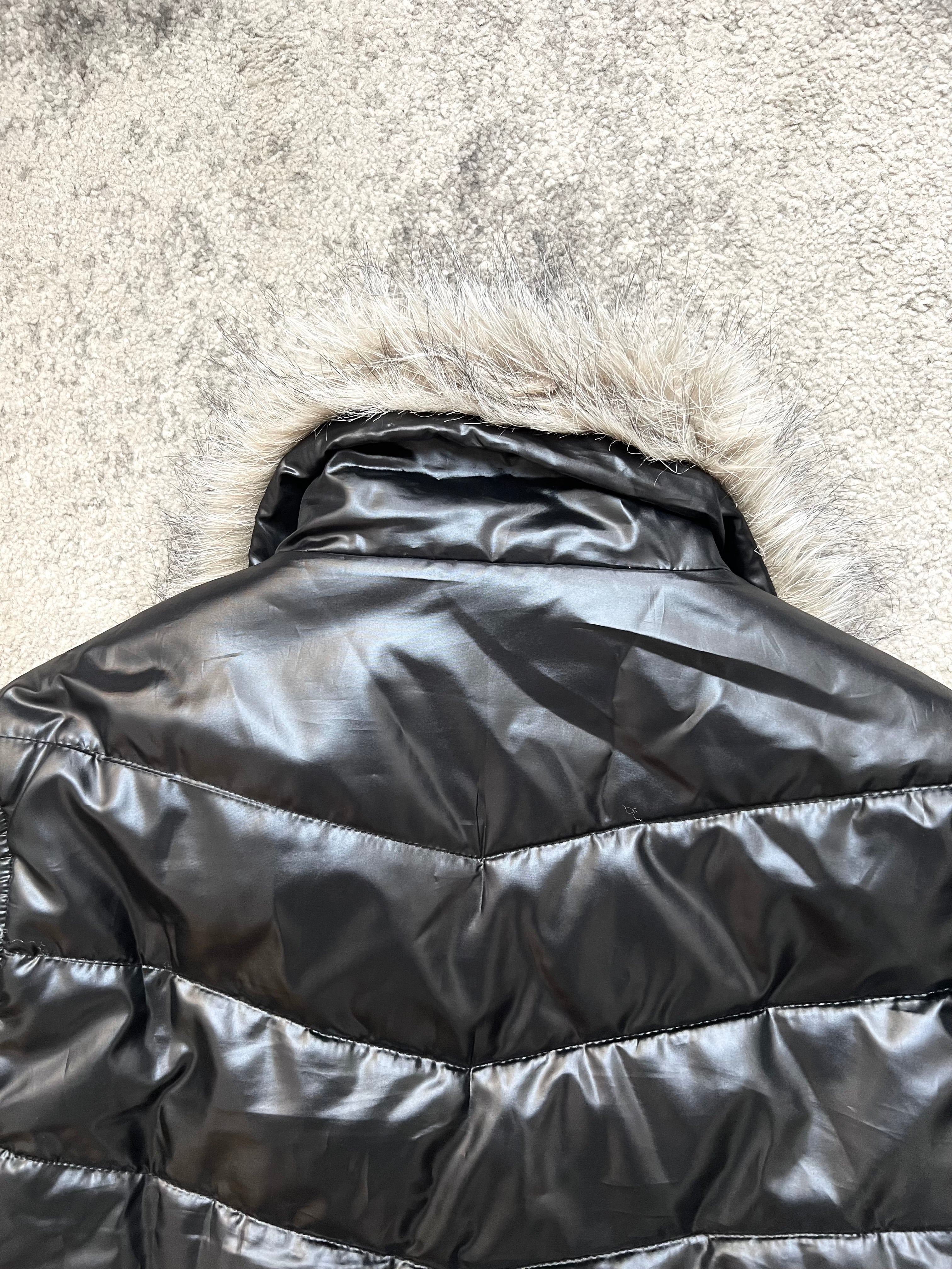 Durable nylon shell with padded down-style fill. Faux-fur collar for texture and attitude.