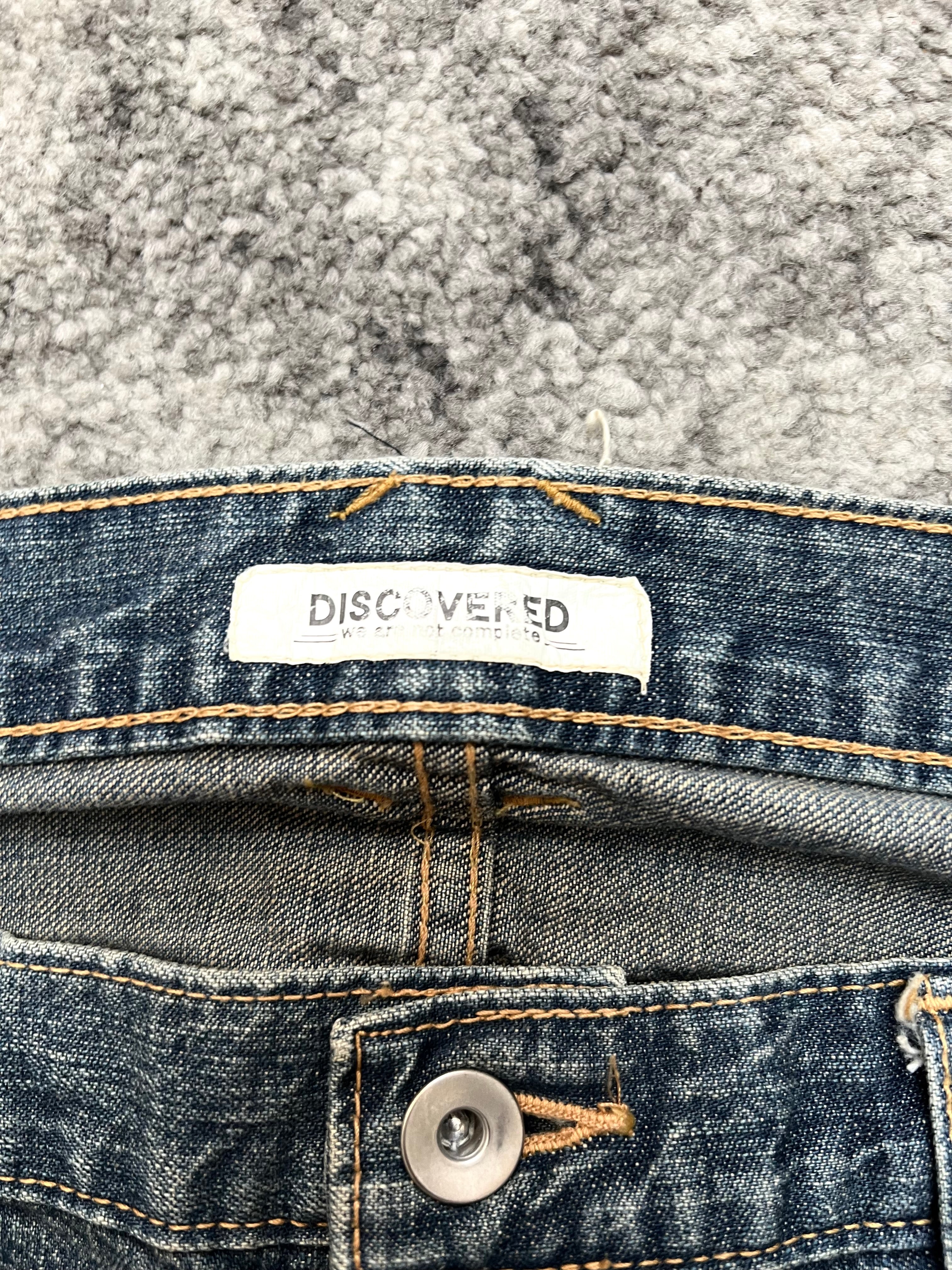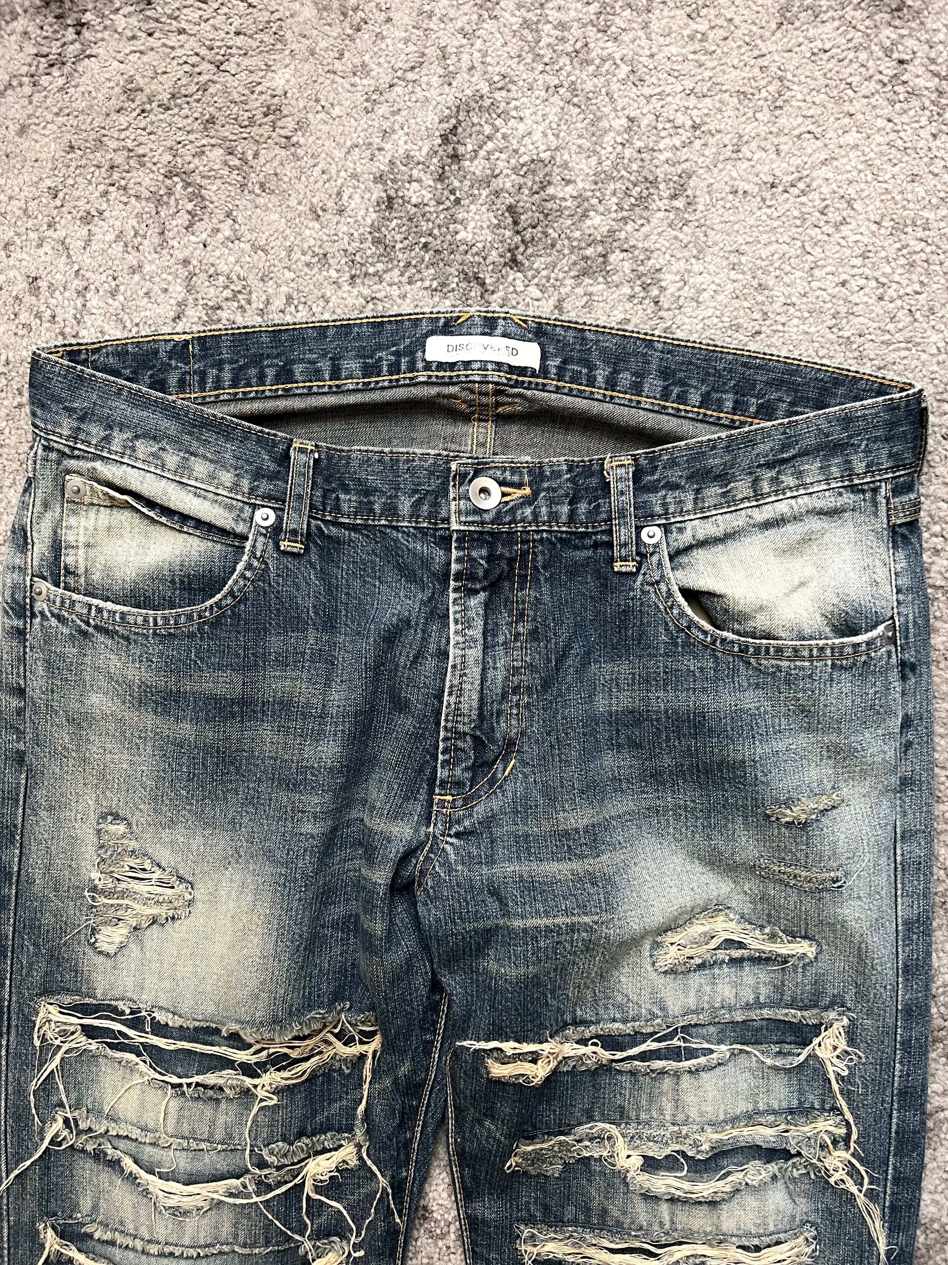 Not subtle – this is denim ripped to the bone. Discovered takes light indigo and tears it apart: shredded front, raw threads, and cropped fit screaming underground rebellion.