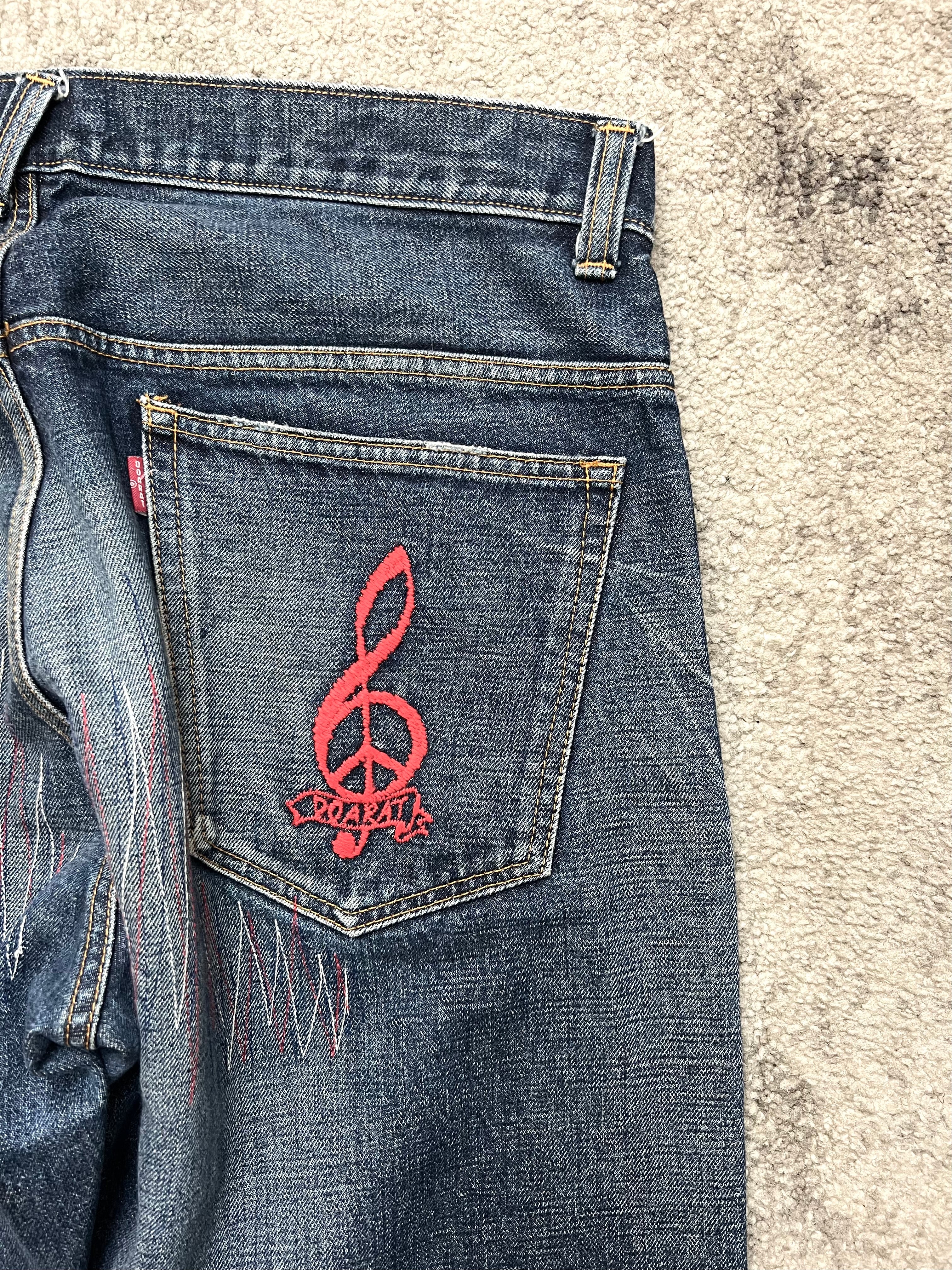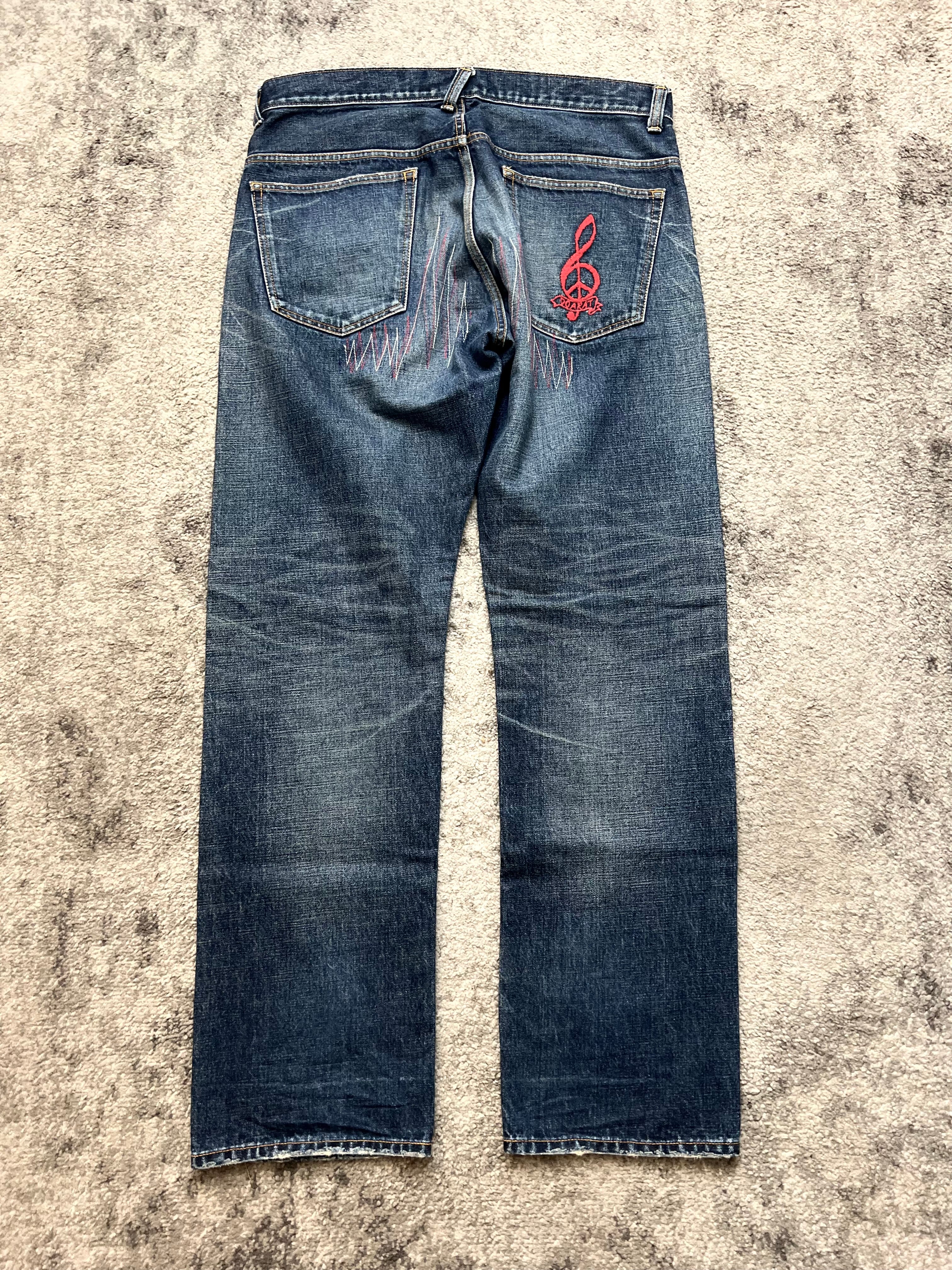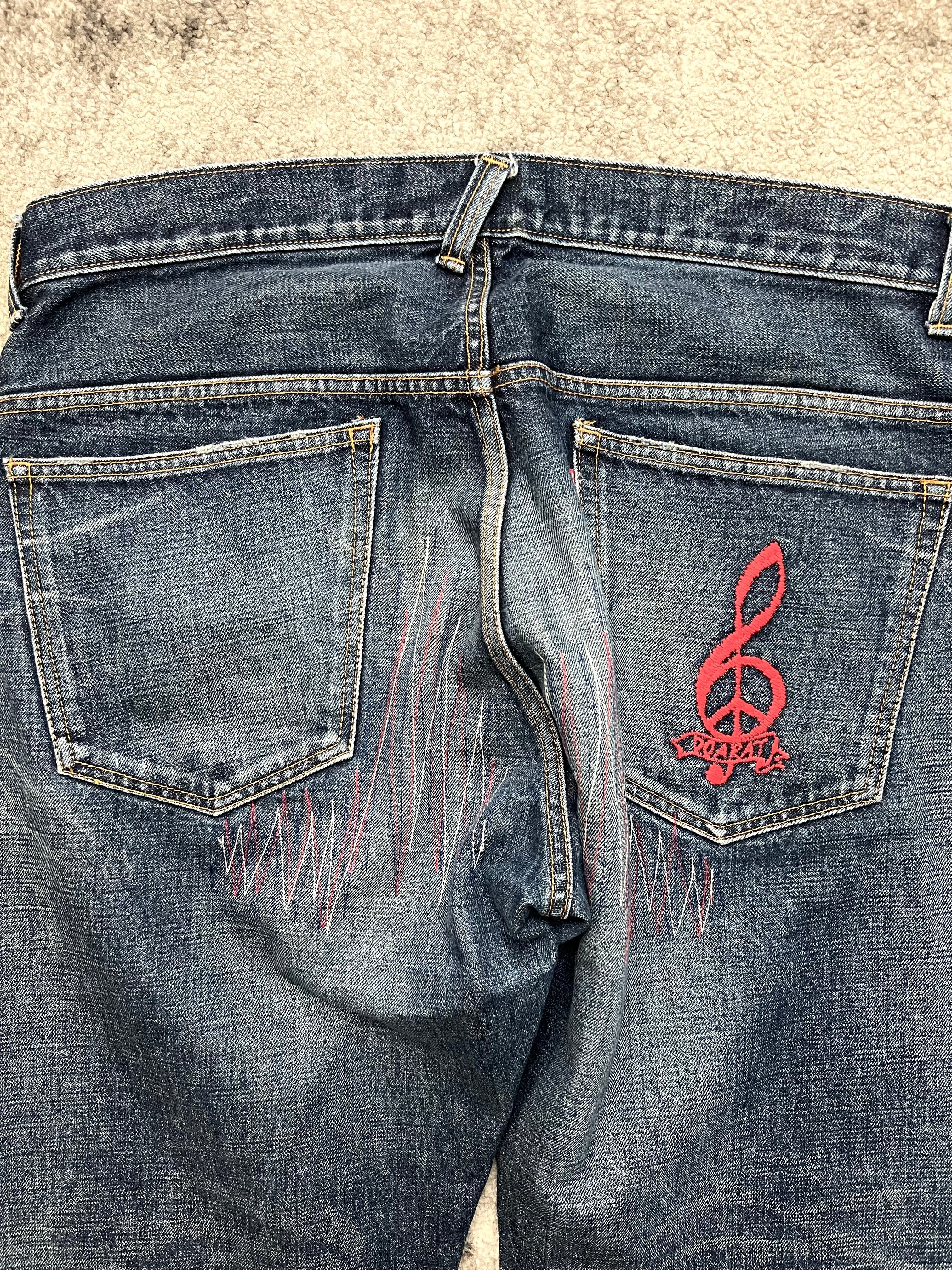 A piece that carries the pulse of Tokyo’s street underground – classic mid-blue wash, rugged fades, and a striking red treble clef embroidery at the back. Sharp vertical stitch accents run down the thighs like soundwaves, giving the denim a unique, almost experimental edge. This is more than jeans – it’s wearable rhythm.
