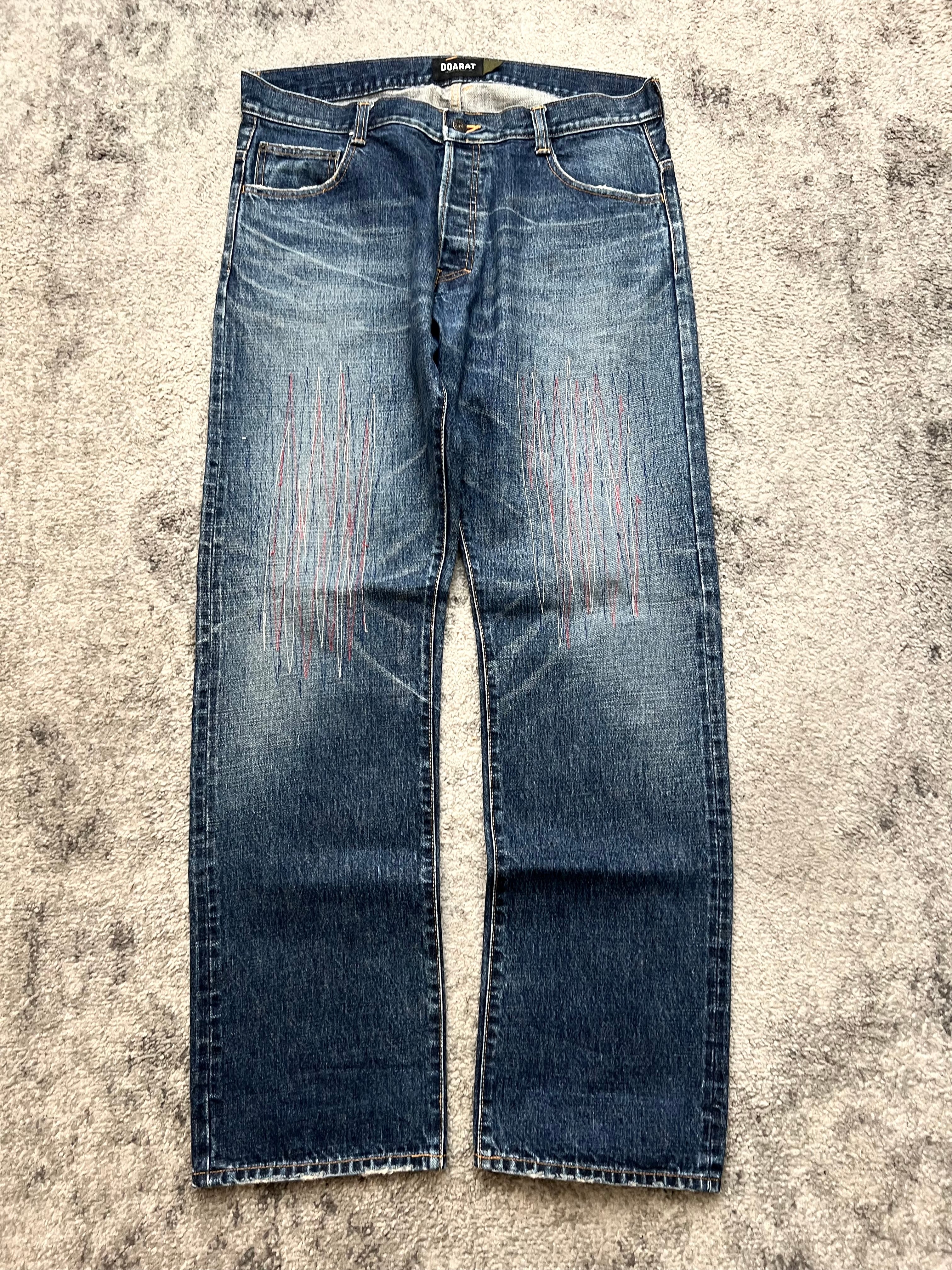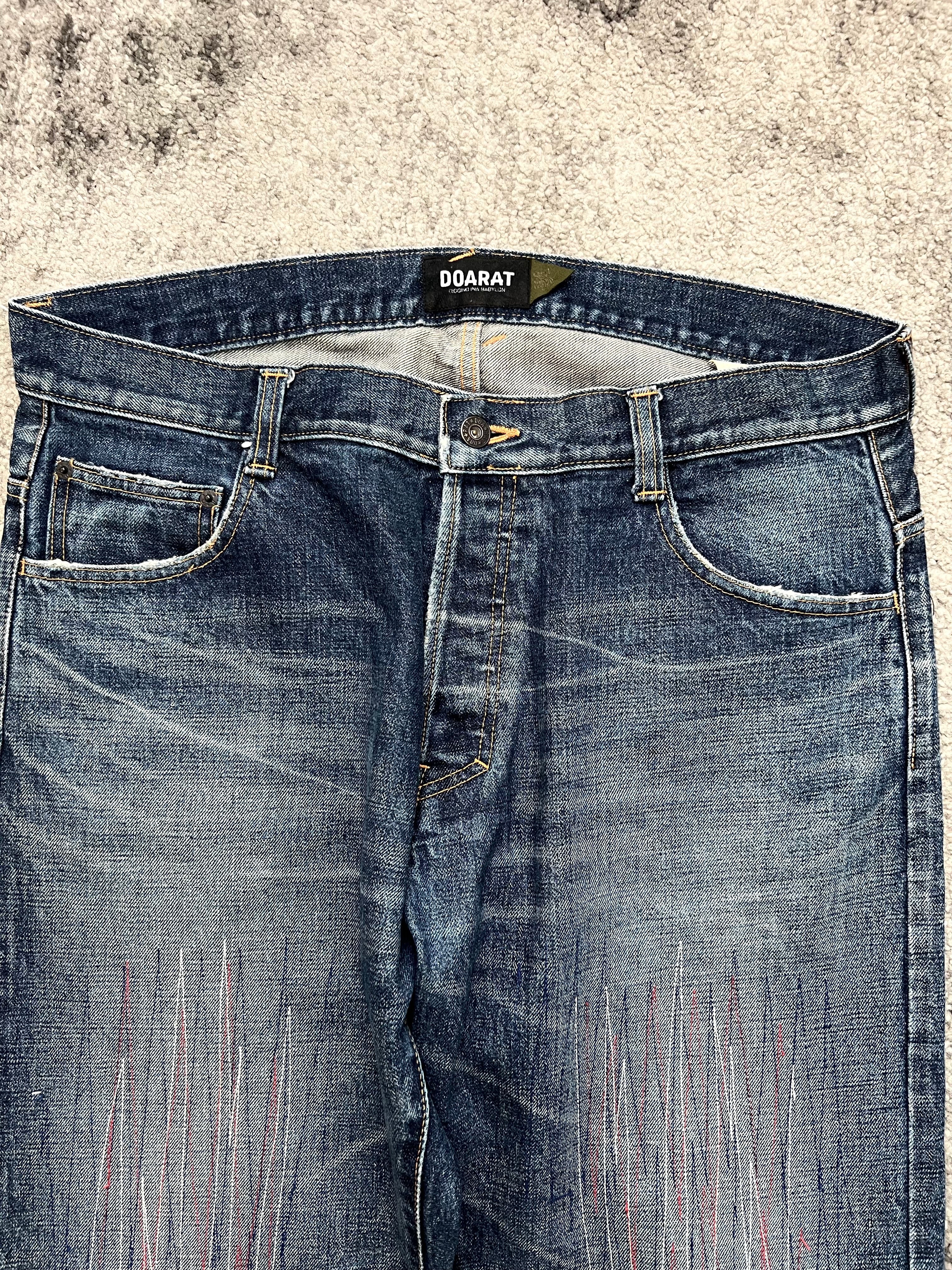 Doarat “Treble Burn” Embroidered Denim – rhythm stitched in raw indigo.