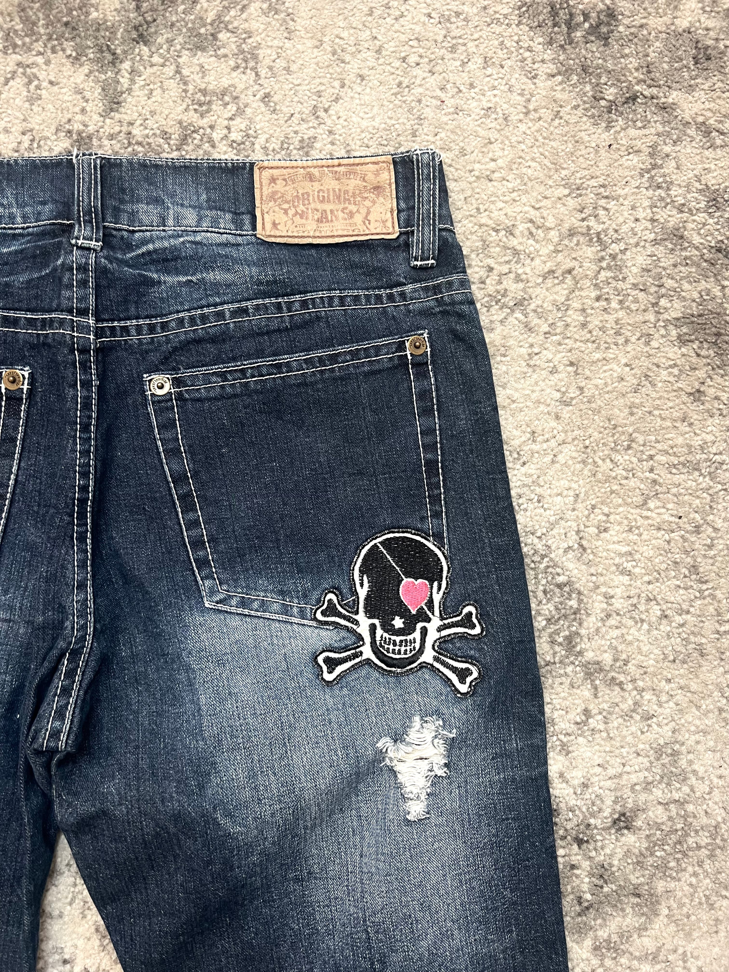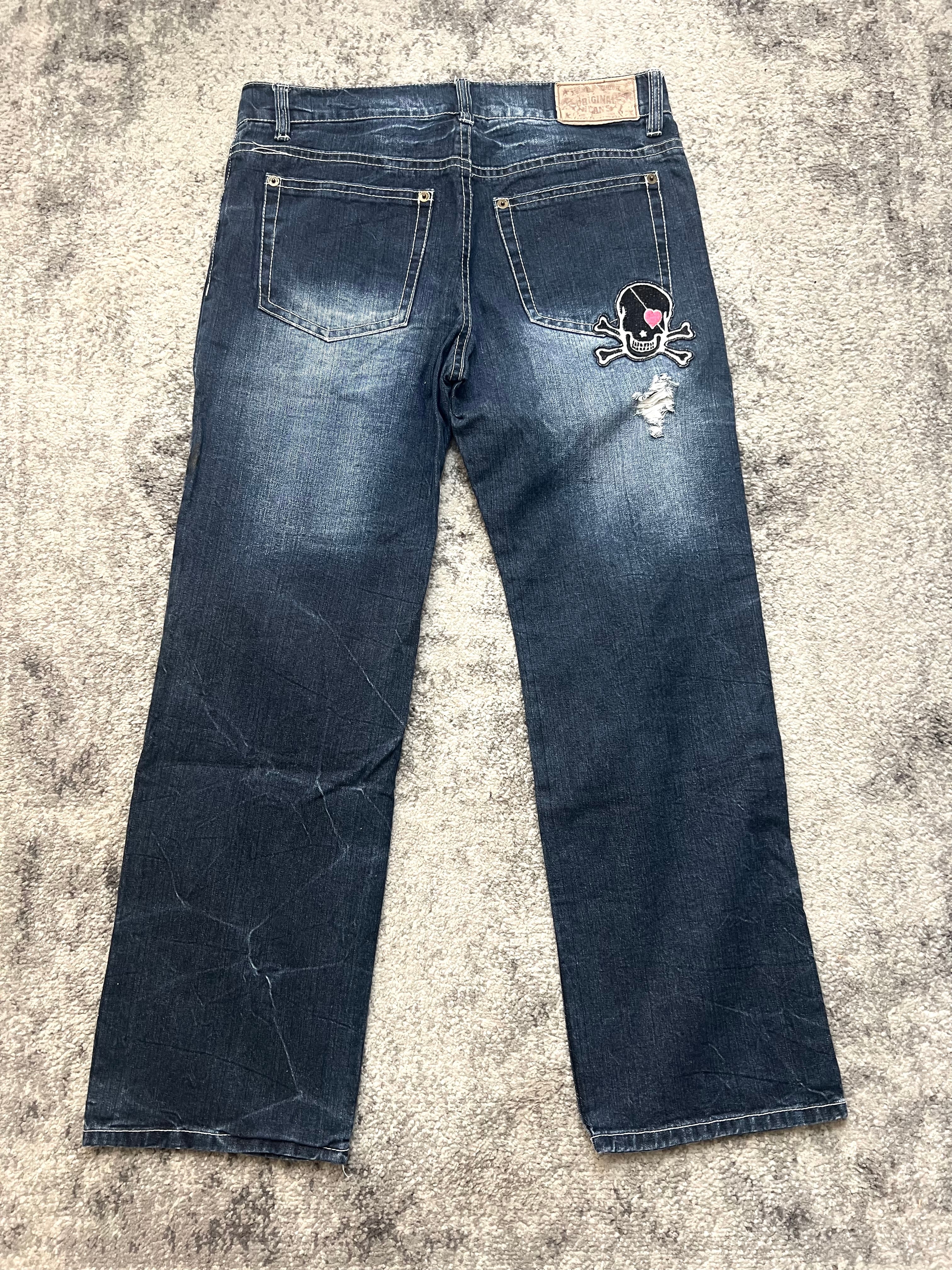 Oversized patchwork meets spray-paint punk. Front leg panels read like protest posters – stars, symbols, slogans. Back pocket skull embroidery with pink heart hit. Style it with monochrome layers, or clash louder.