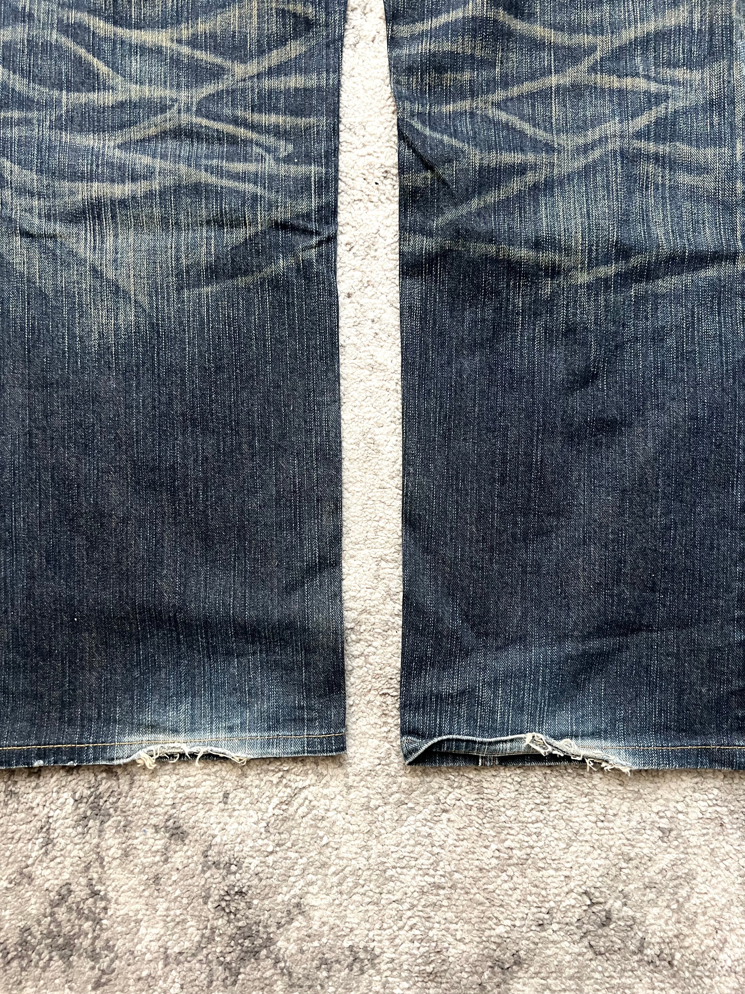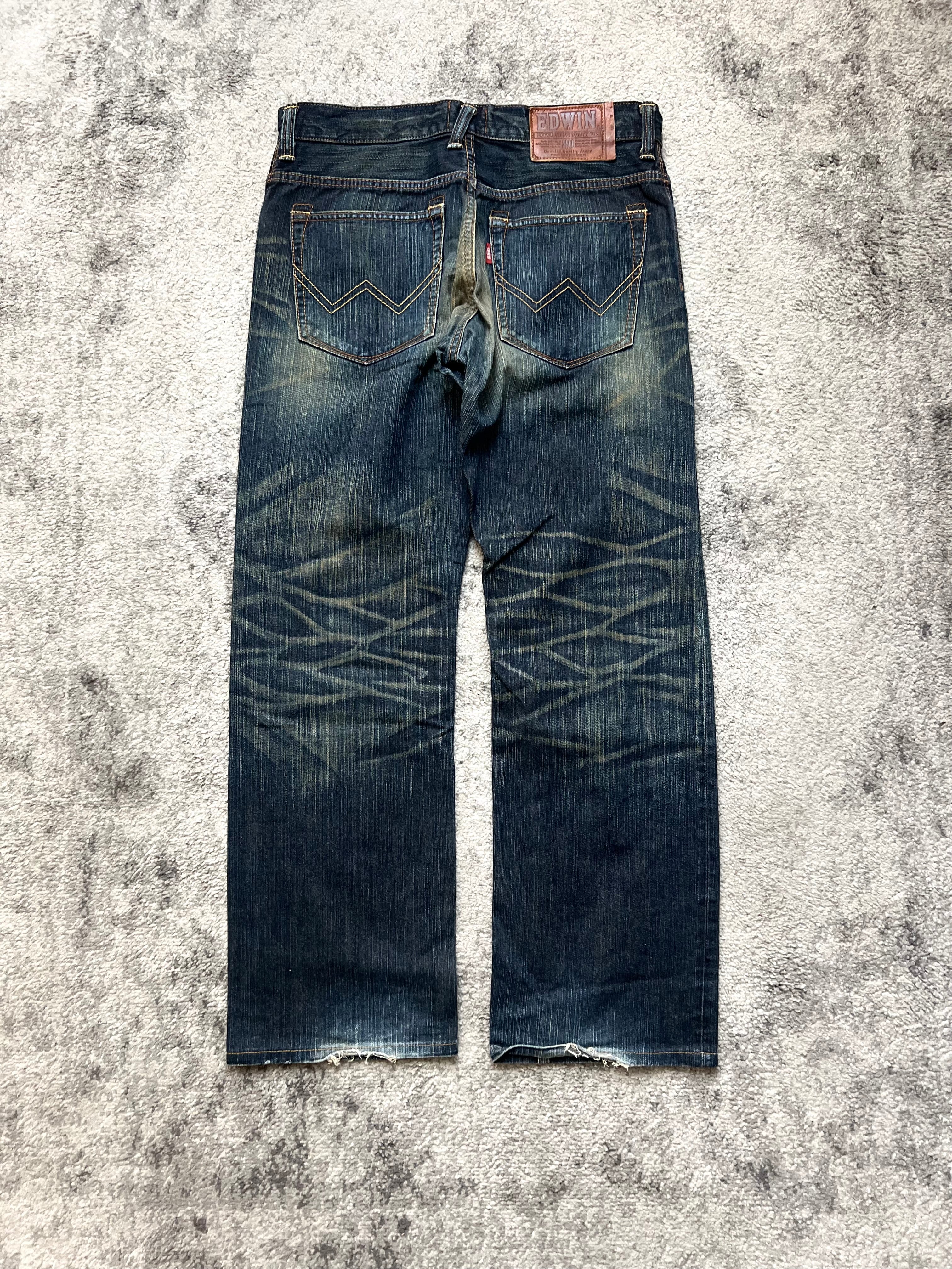 A piece that feels both raw and refined, this EDWIN XV denim carries the soul of Japanese archive energy. The front fade blooms across the thighs like light caught in motion, while the back reveals striking criss-cross fades — almost like a hidden code etched into denim. A quiet, lived-in artifact that speaks louder the longer you look.