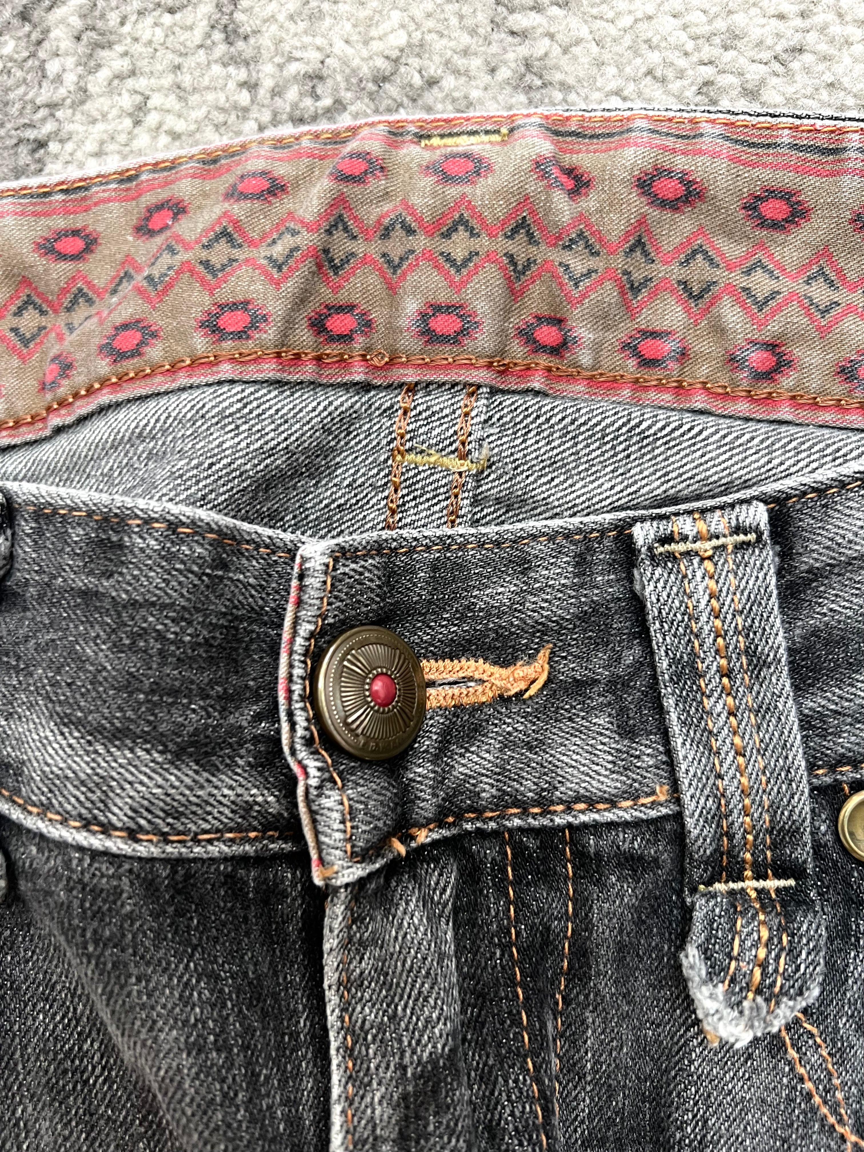 Pre-owned, perfectly broken in. Vintage-fade with visible whiskers and light honeycomb creases. Back pockets aged, stitched, and paneled. No holes, just stories.