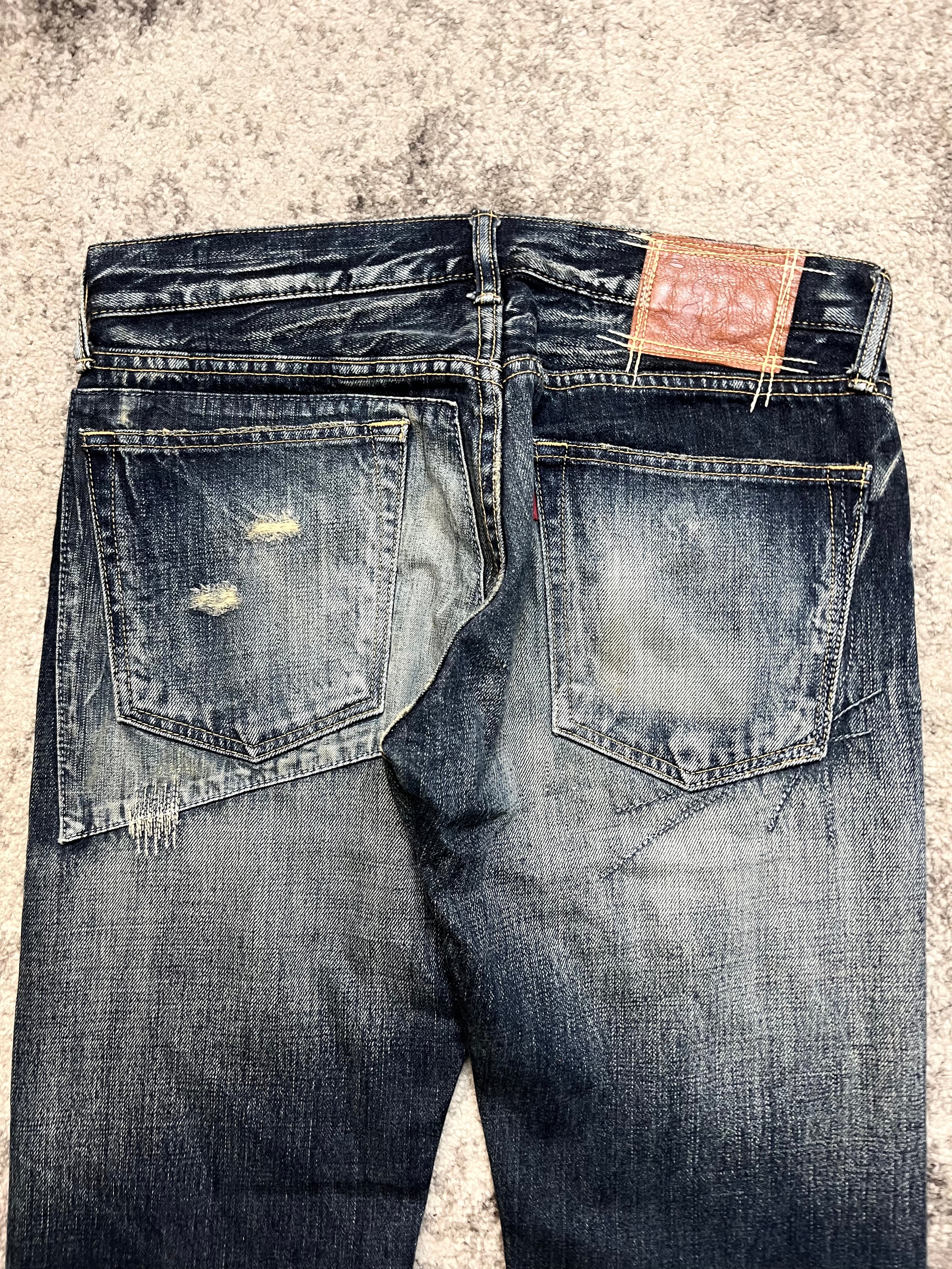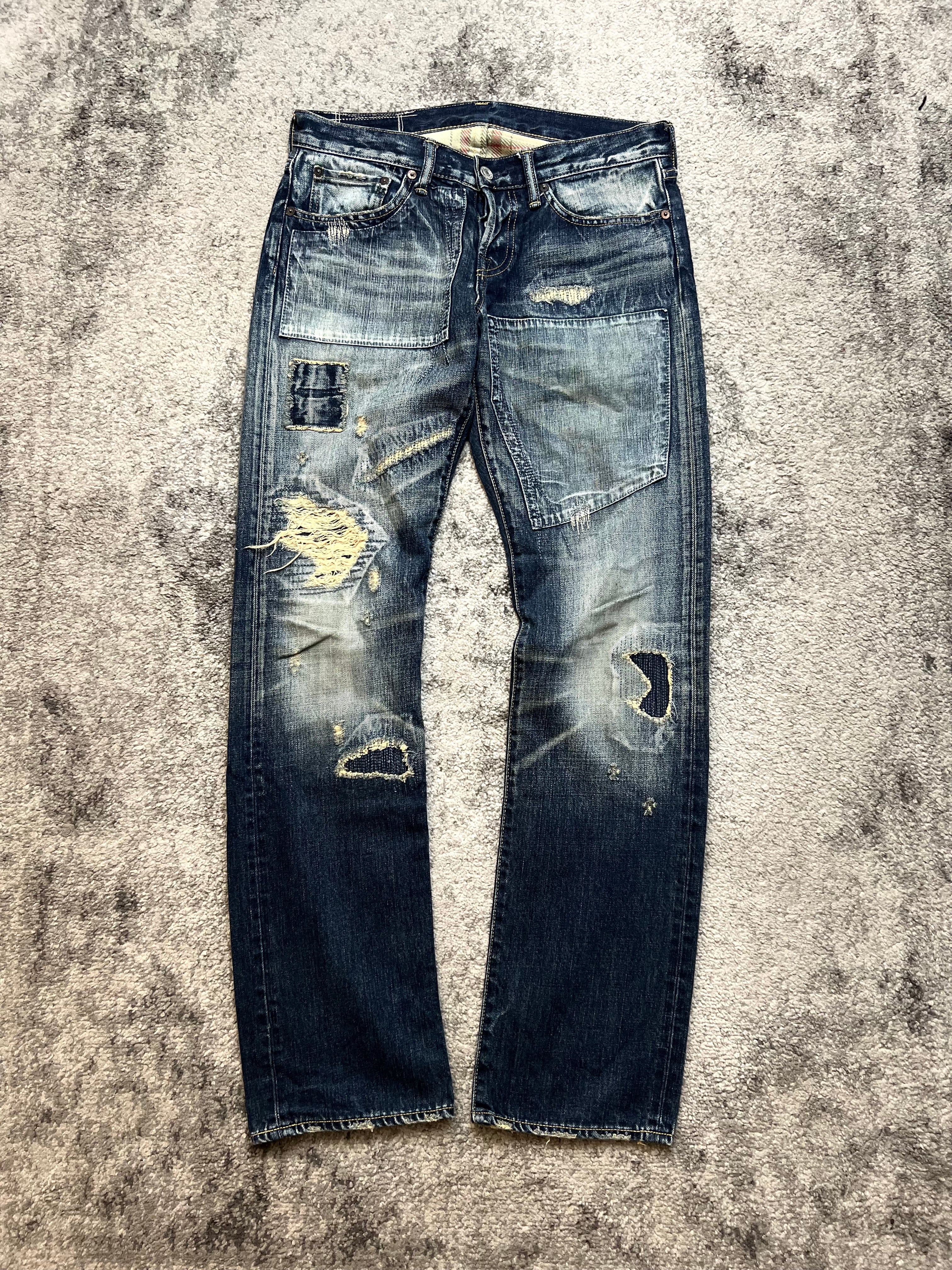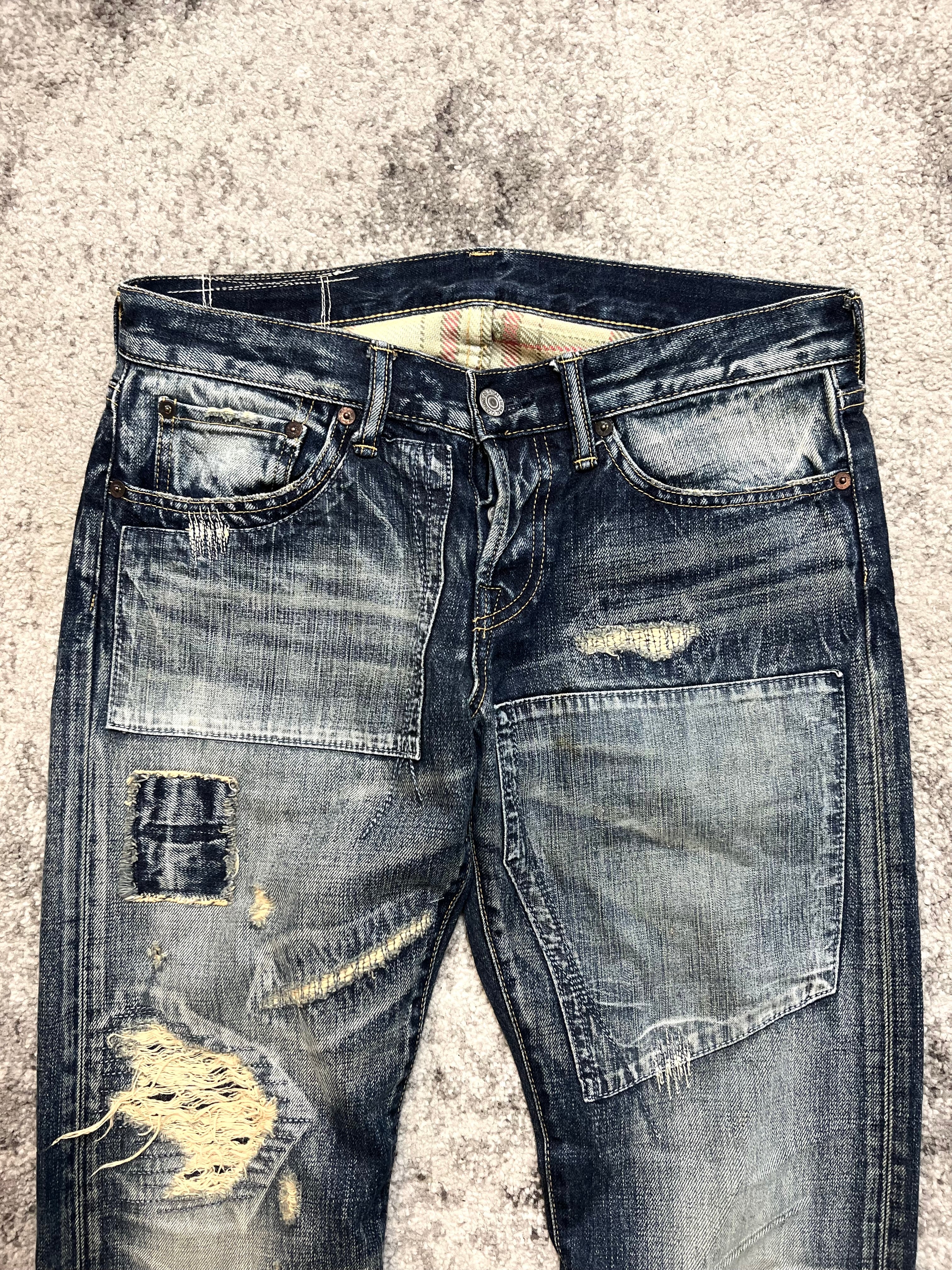 Pre-owned with intentional distress and visible patchwork. Heavy wear, repaired rips, and fraying hems – every imperfection is the design. True Japanese archive energy.