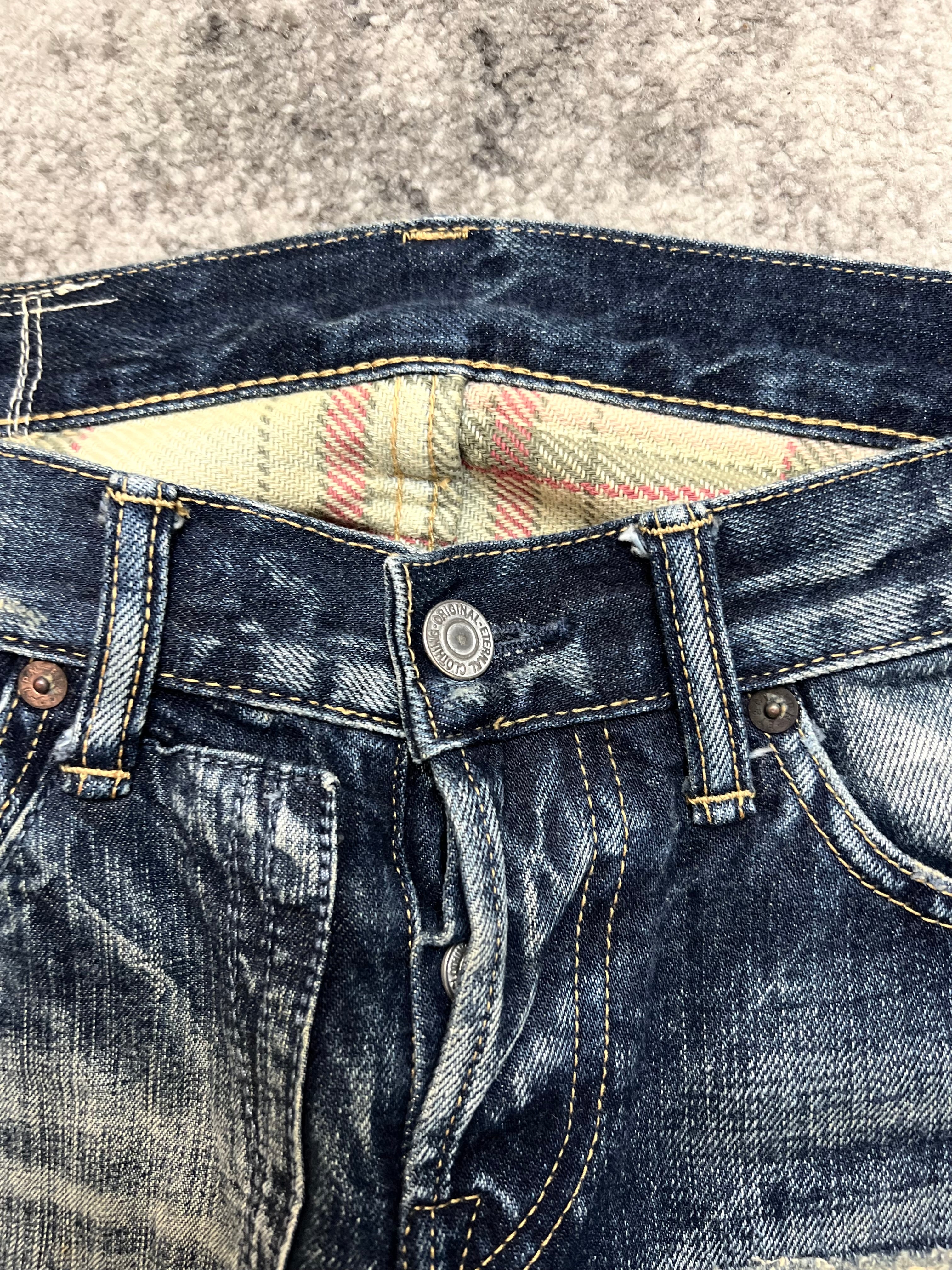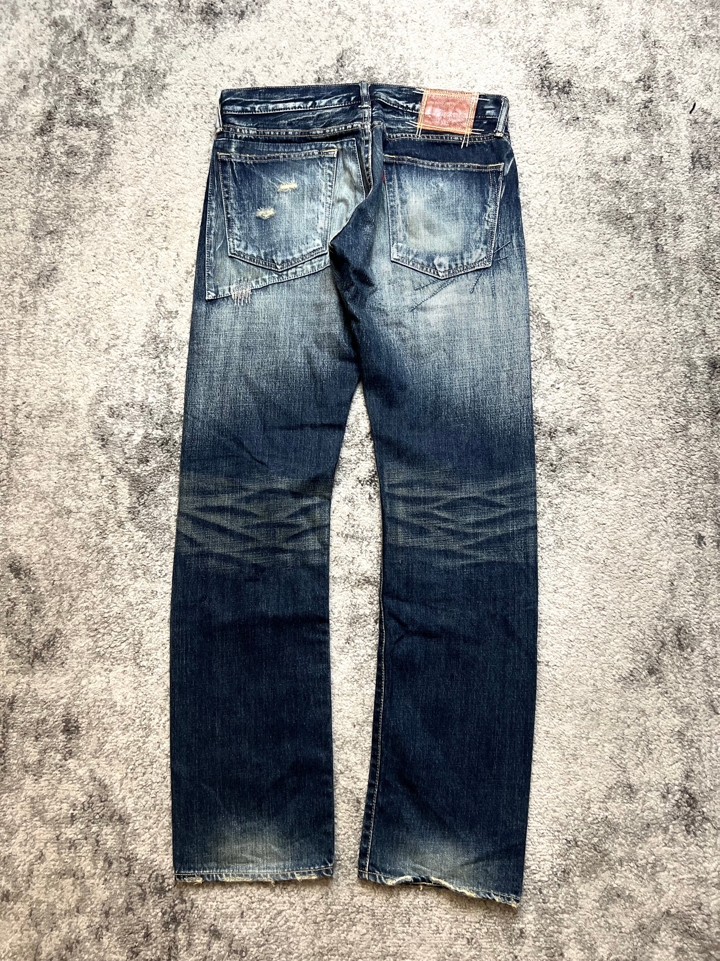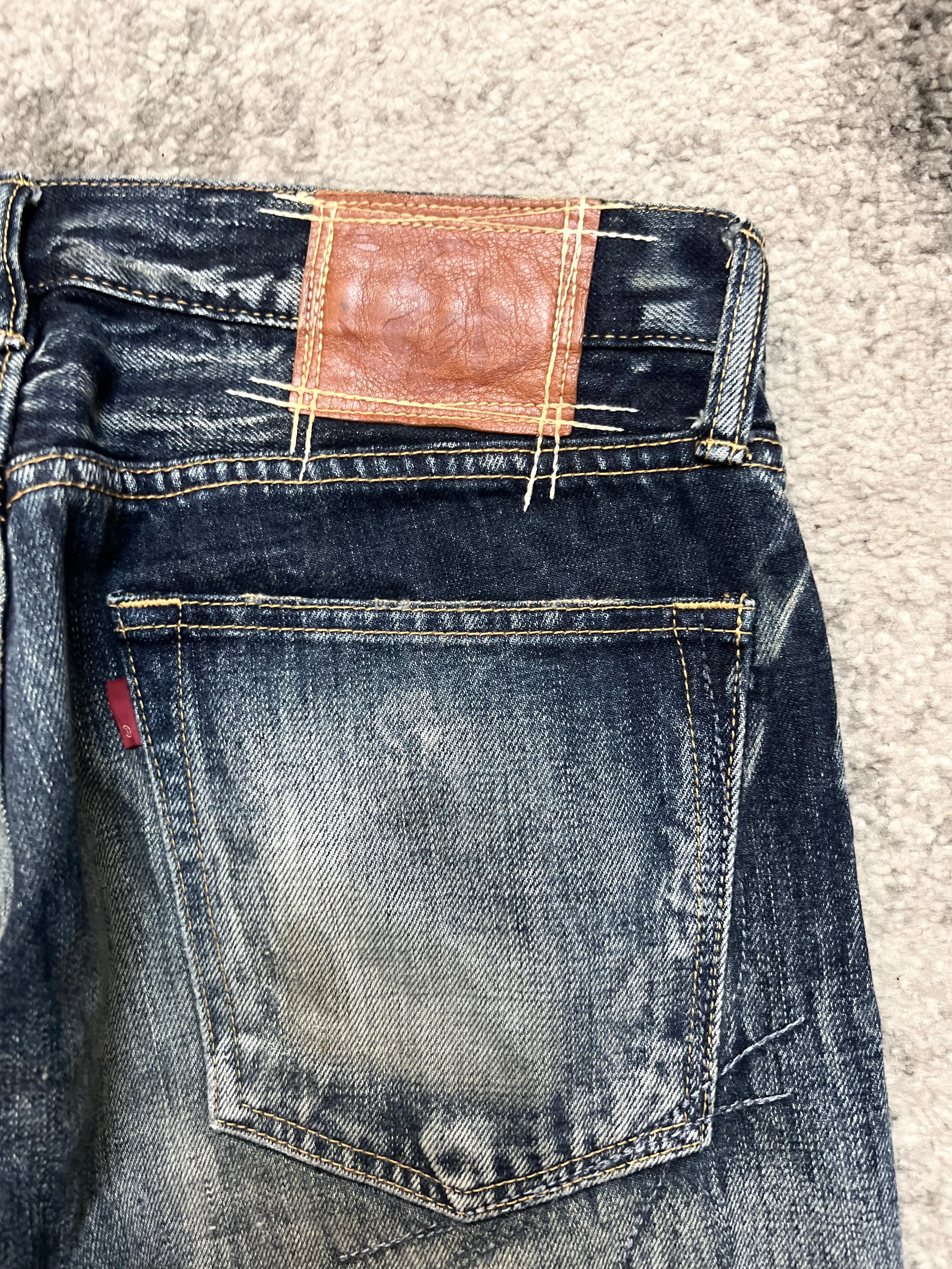 Midweight Japanese selvedge denim with deep vintage fading. Stonewashed texture, subtle slub grain, and checked flannel pocket lining peeking from inside.