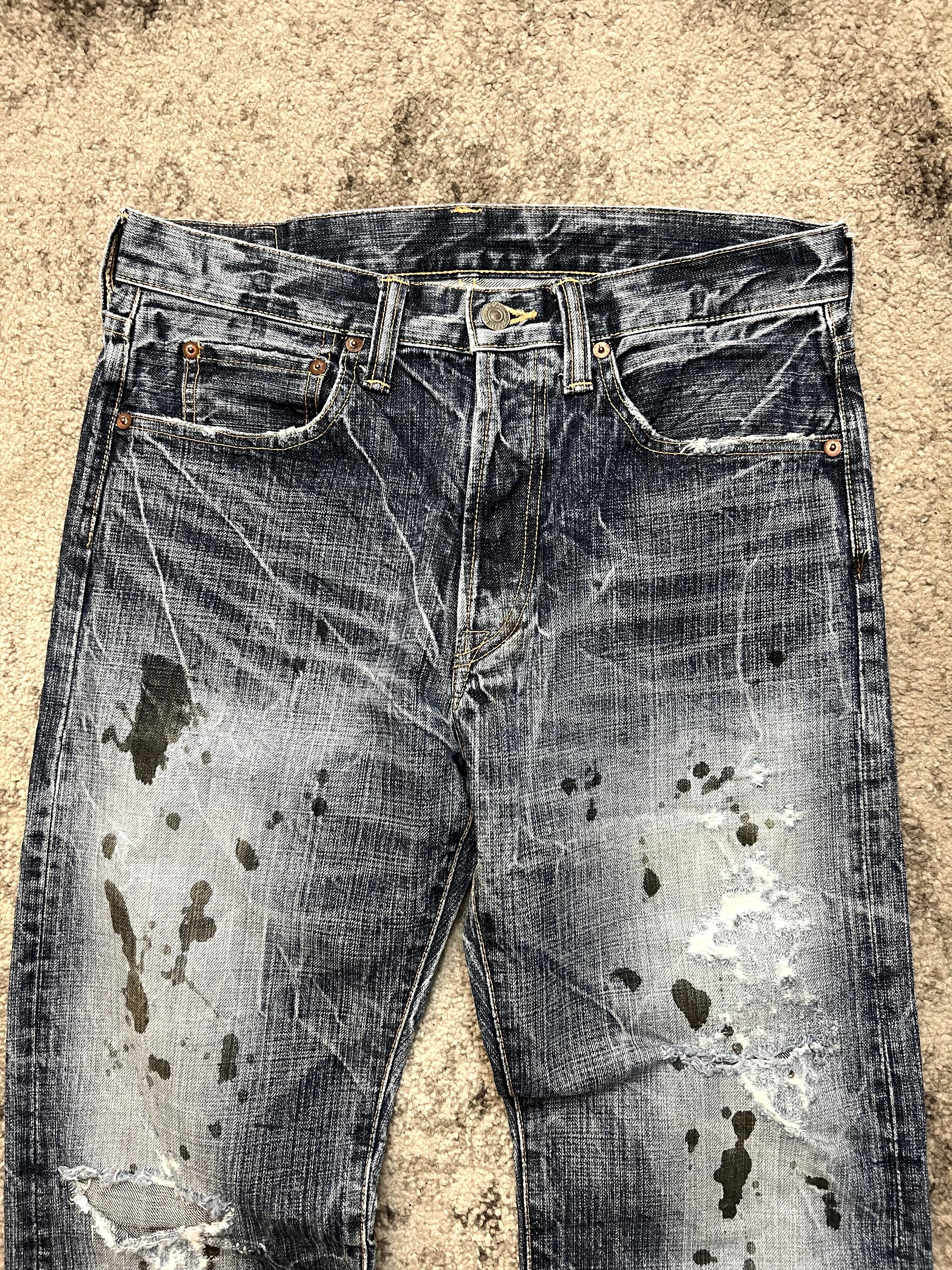 Pre-loved with intention. Heavy fading and fading lines, signature distressing across thigh and hem. Black paint splatter throughout — no damage, just energy.