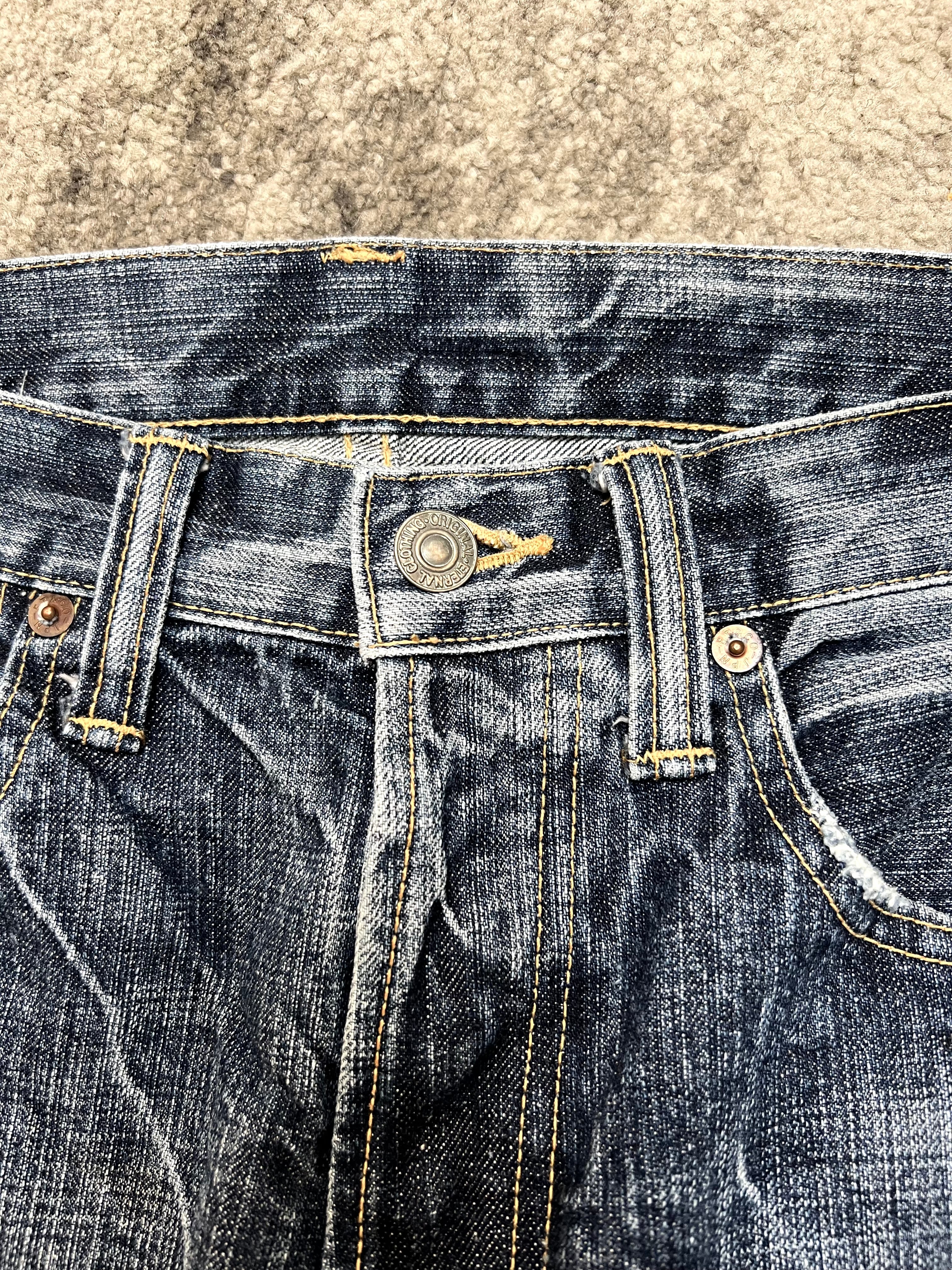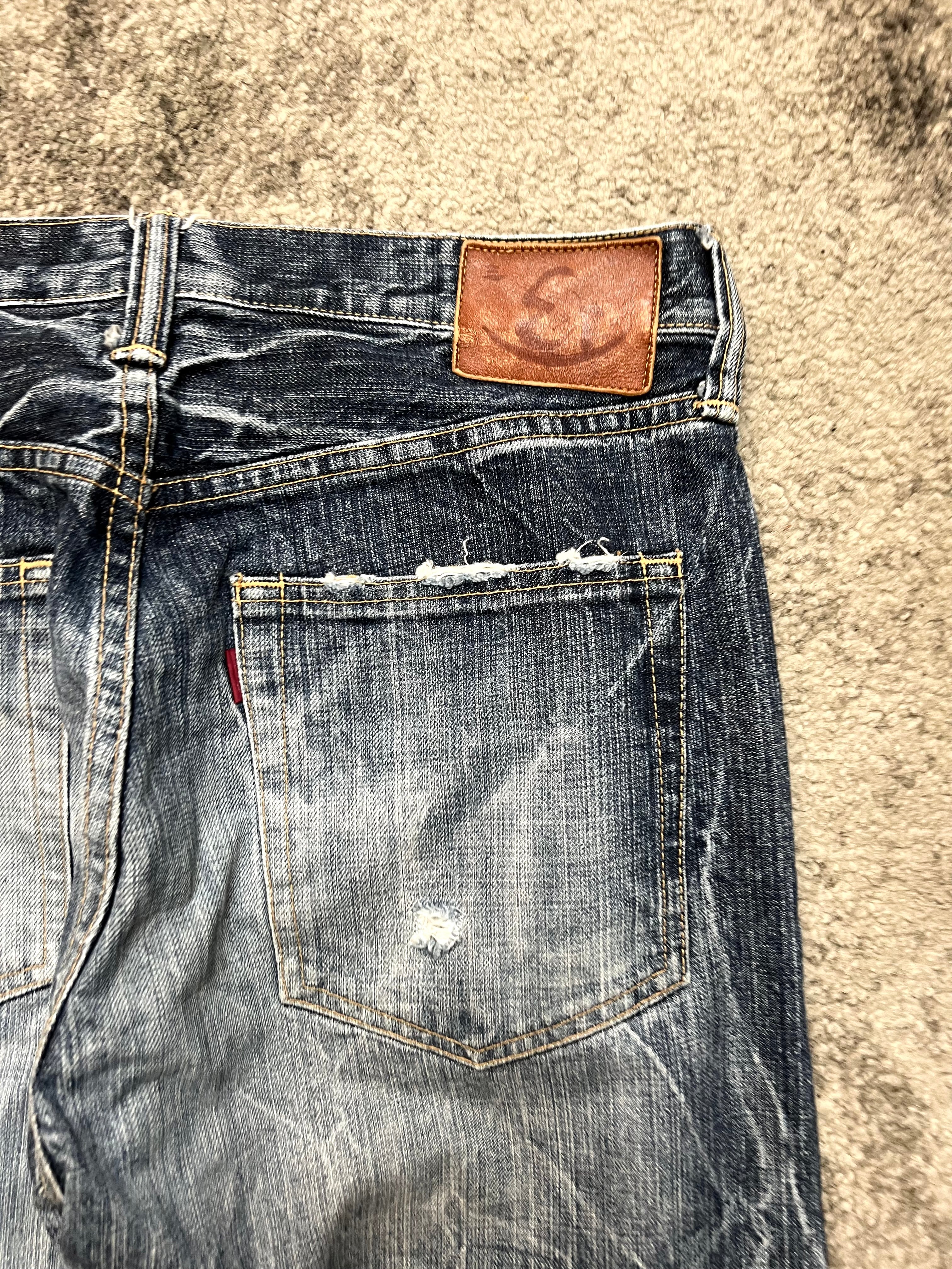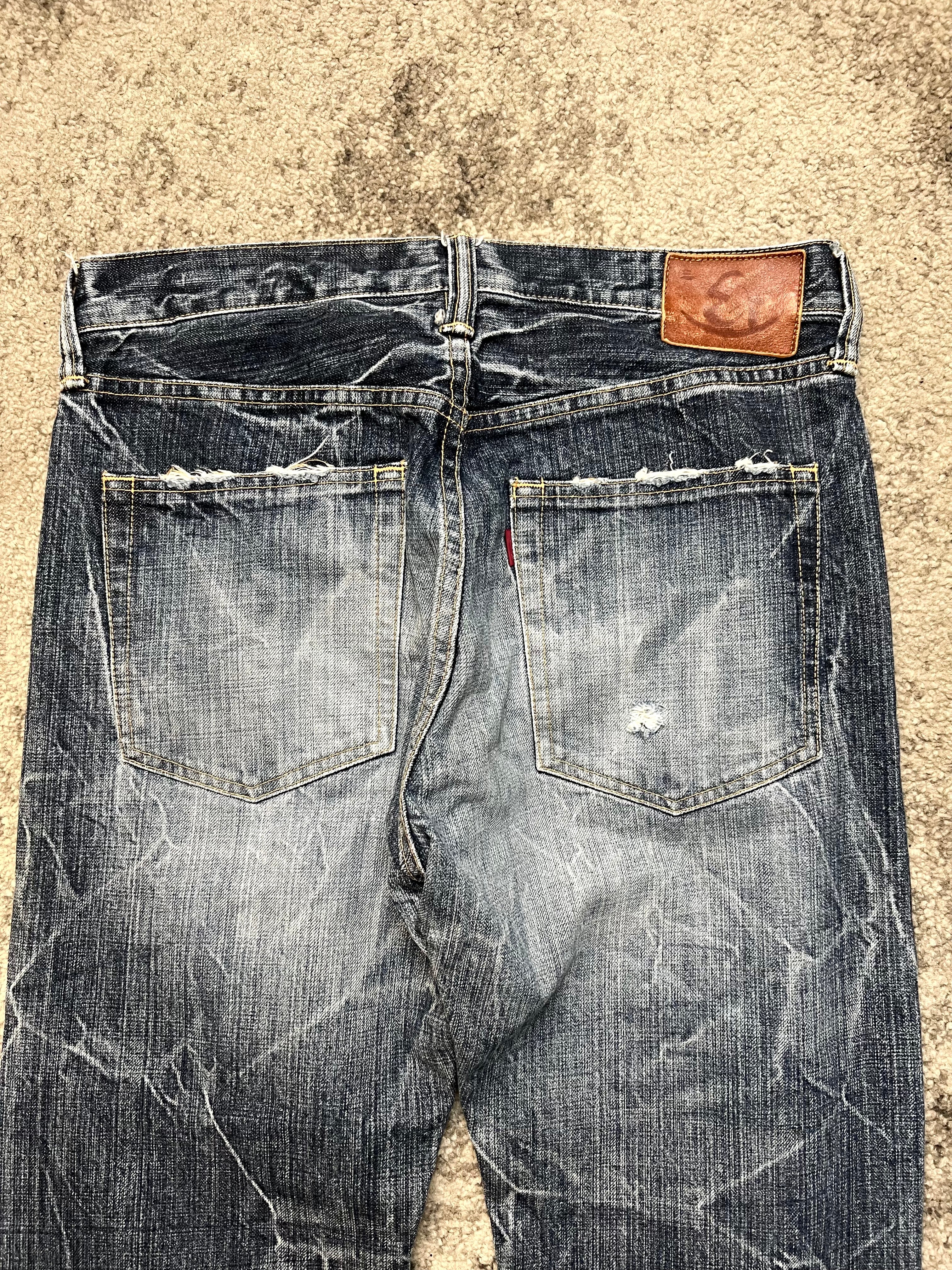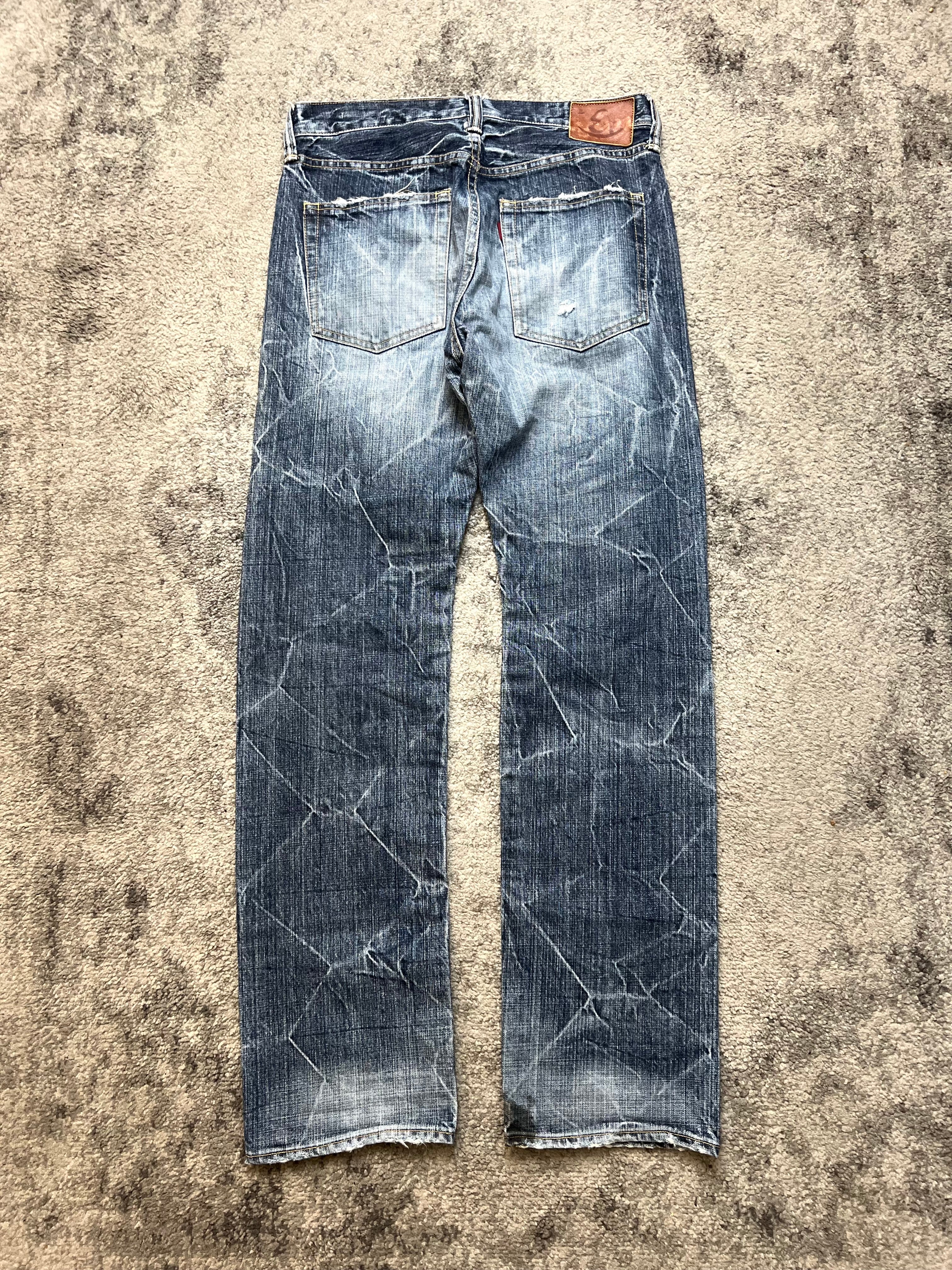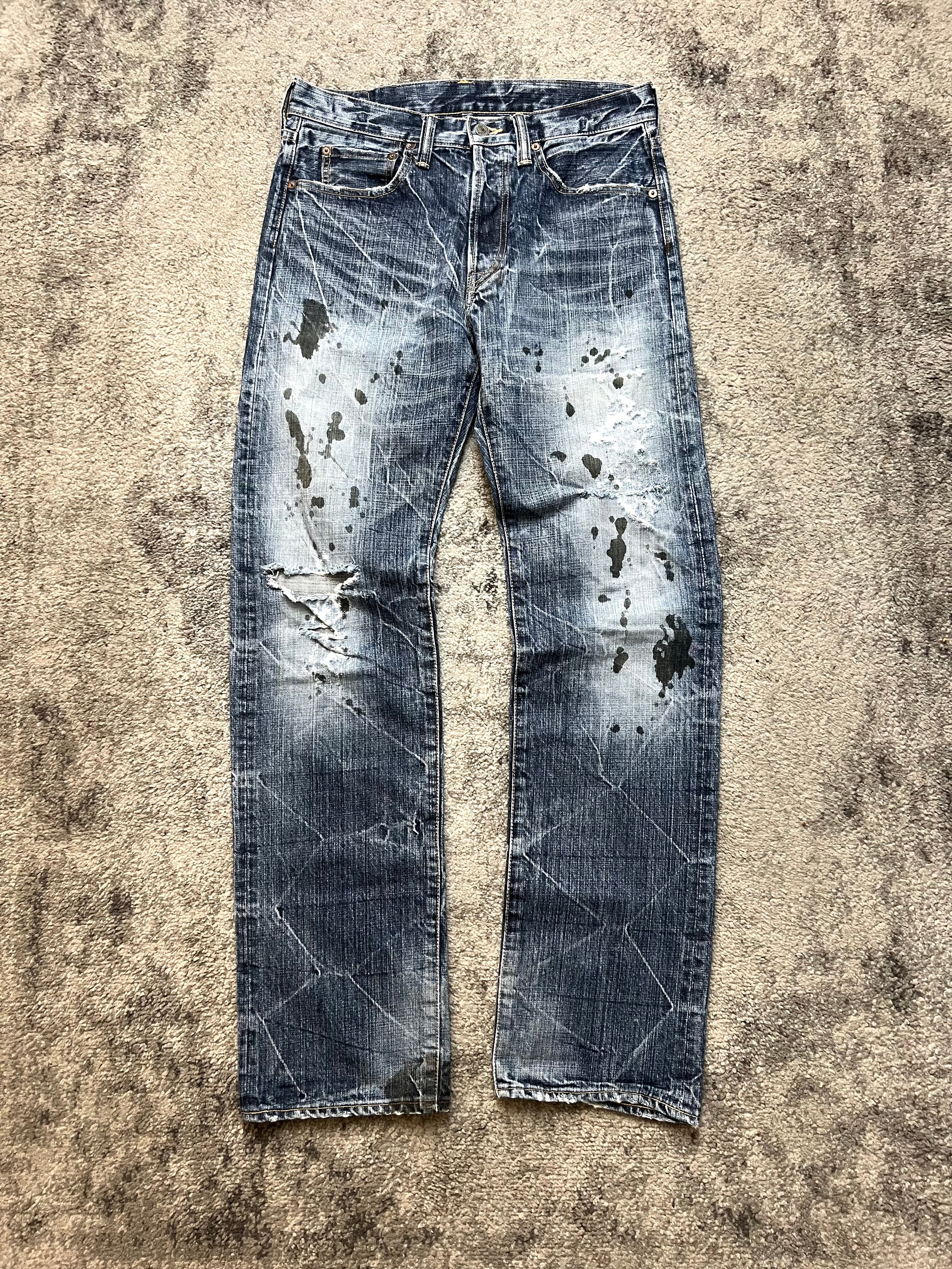 A pair that never whispers. ETERNAL takes vintage Americana and drops it into chaos — heavy contrast whiskers, bold paint splatter, and stitched geometry that looks like a denim thunderstorm. A true Japanese archive piece born from rebellion and craftsmanship.