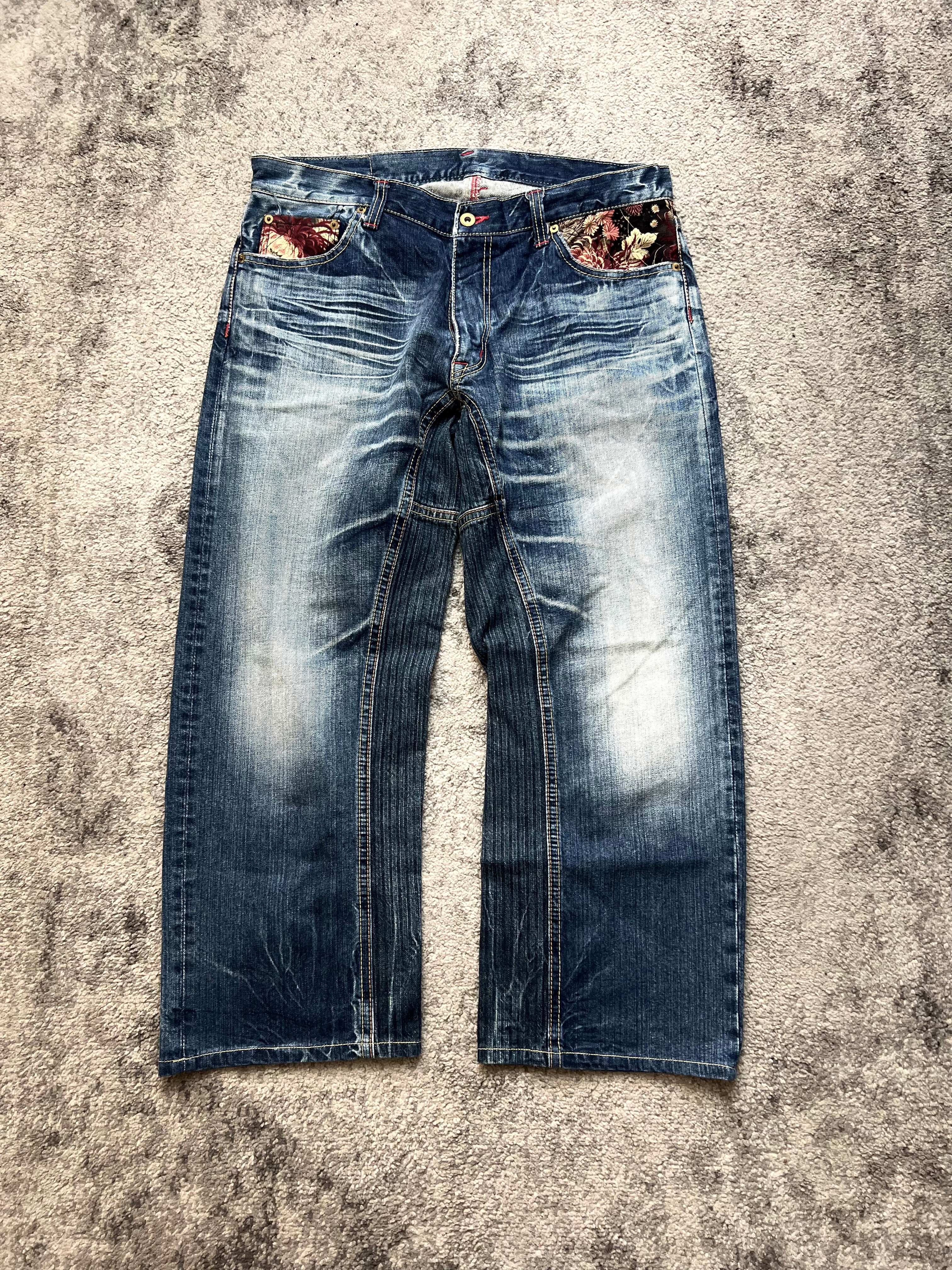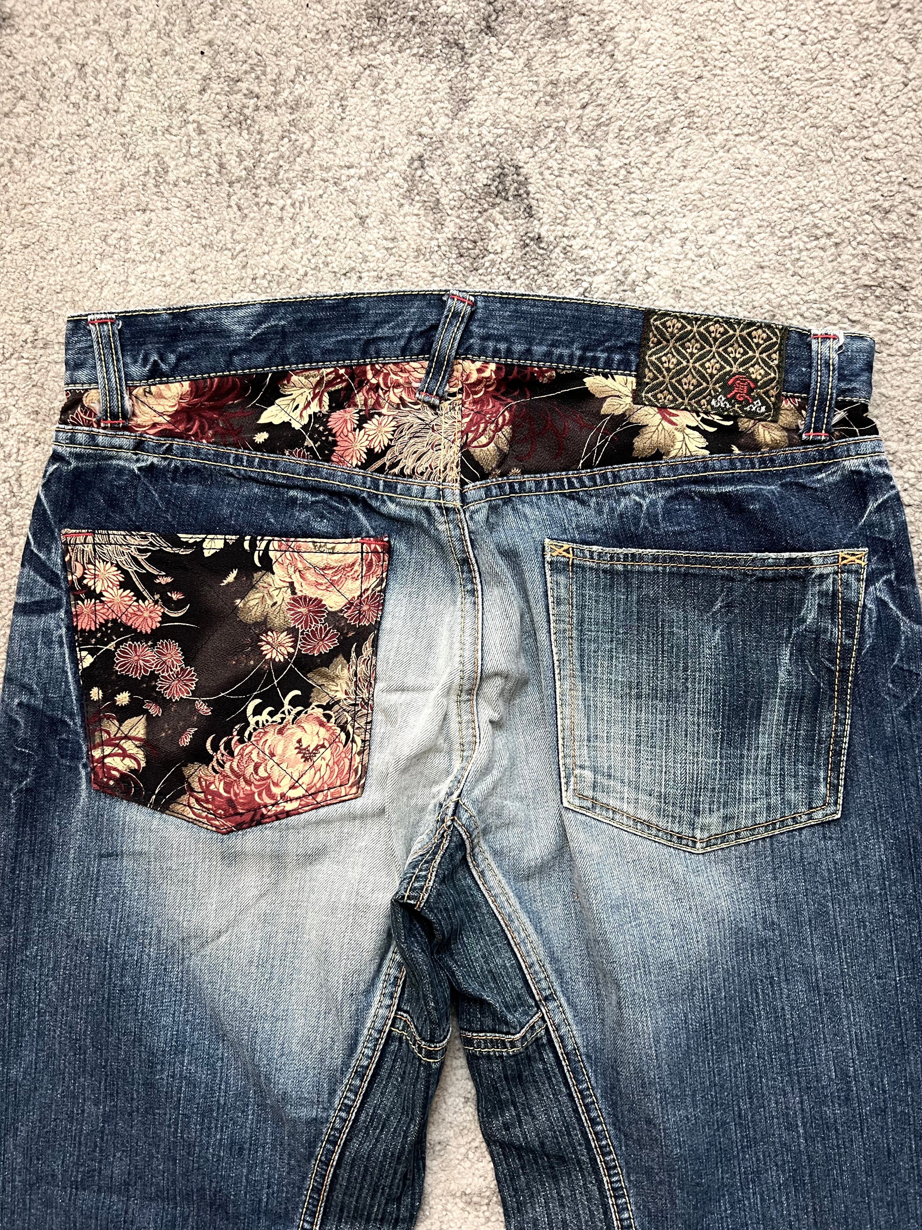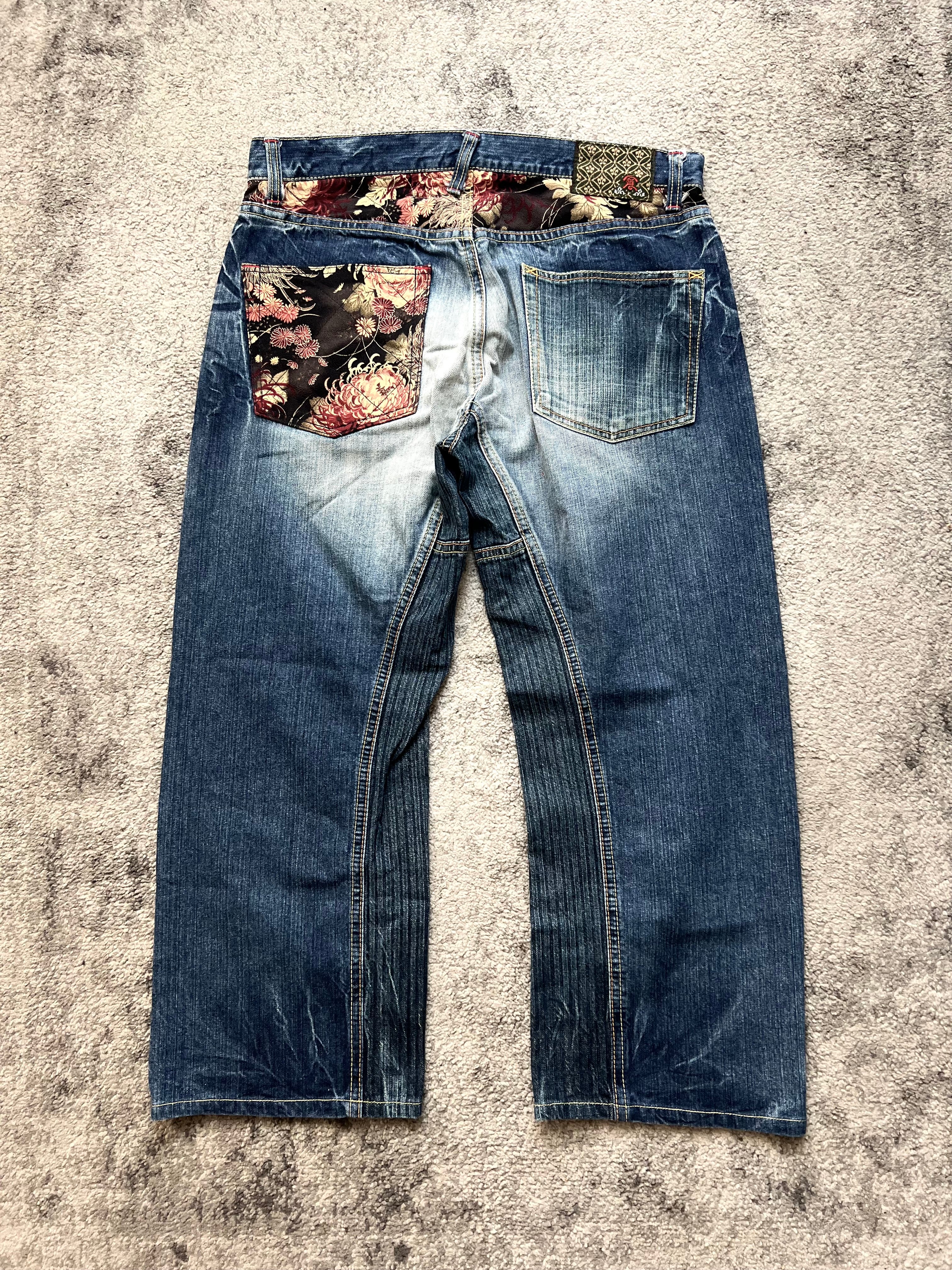 This isn’t standard denim – it’s Japan’s underground heritage stitched into fabric. Eternal crafts a wide, cropped silhouette with heavy fading, then clashes it against bold floral panels – kimono poetry meeting raw street energy.