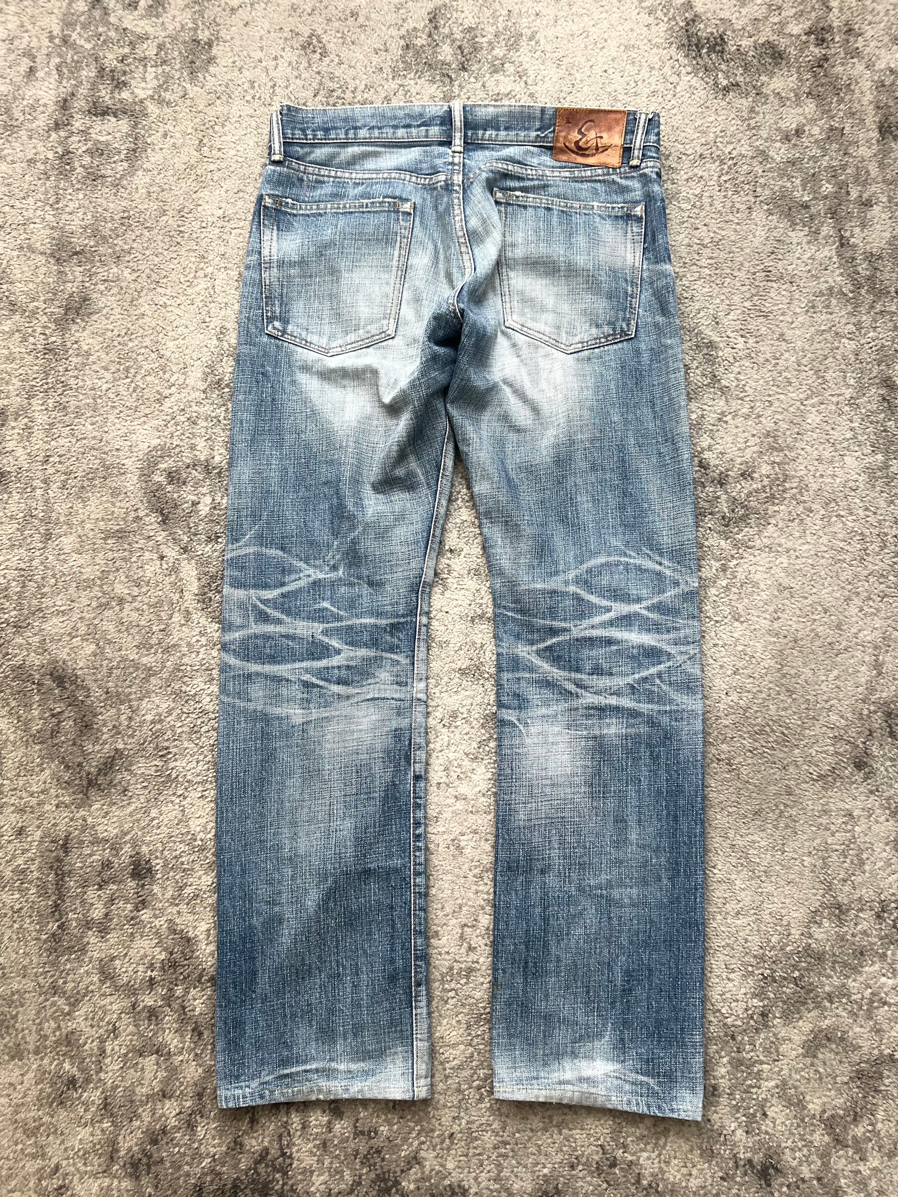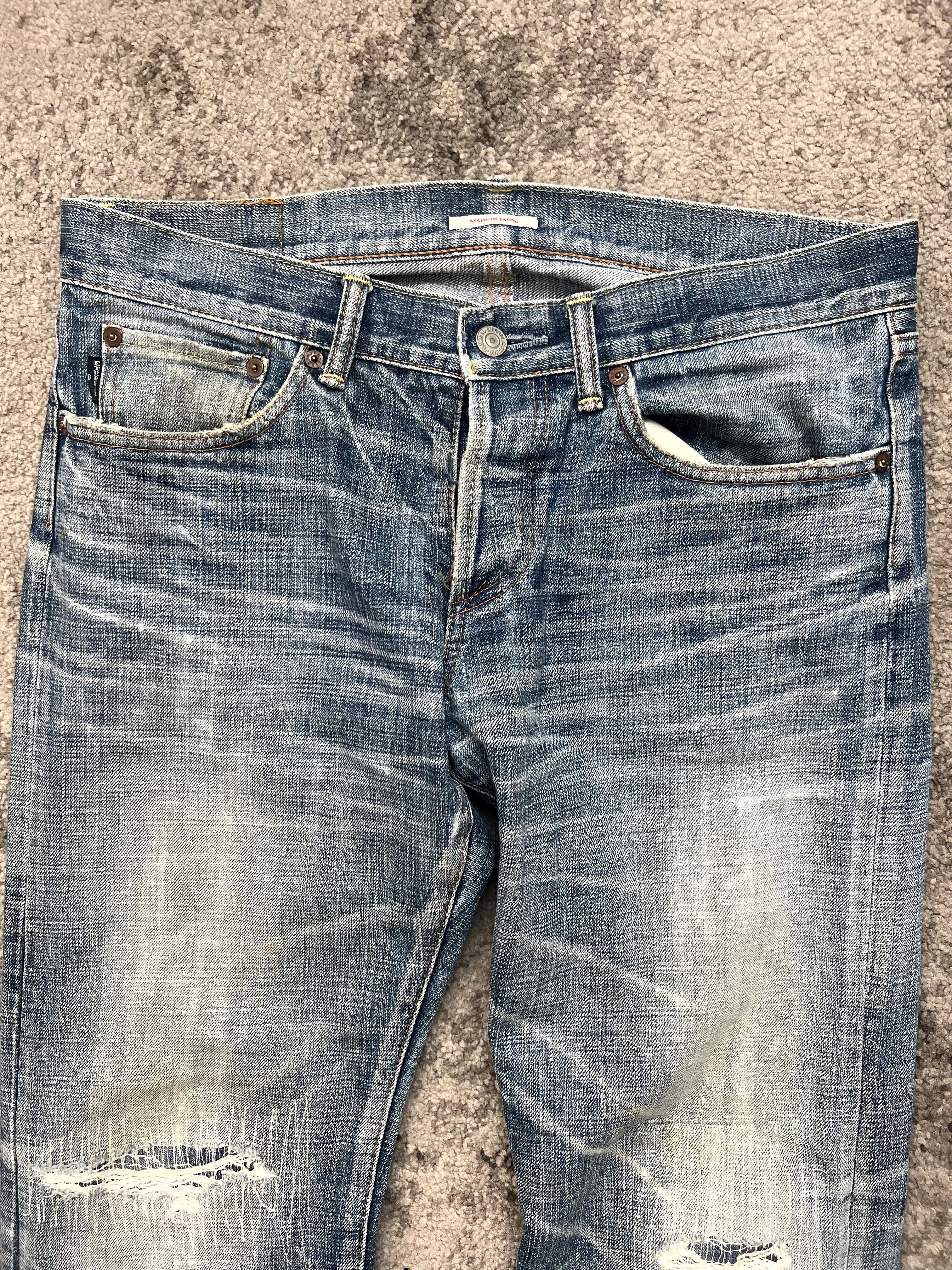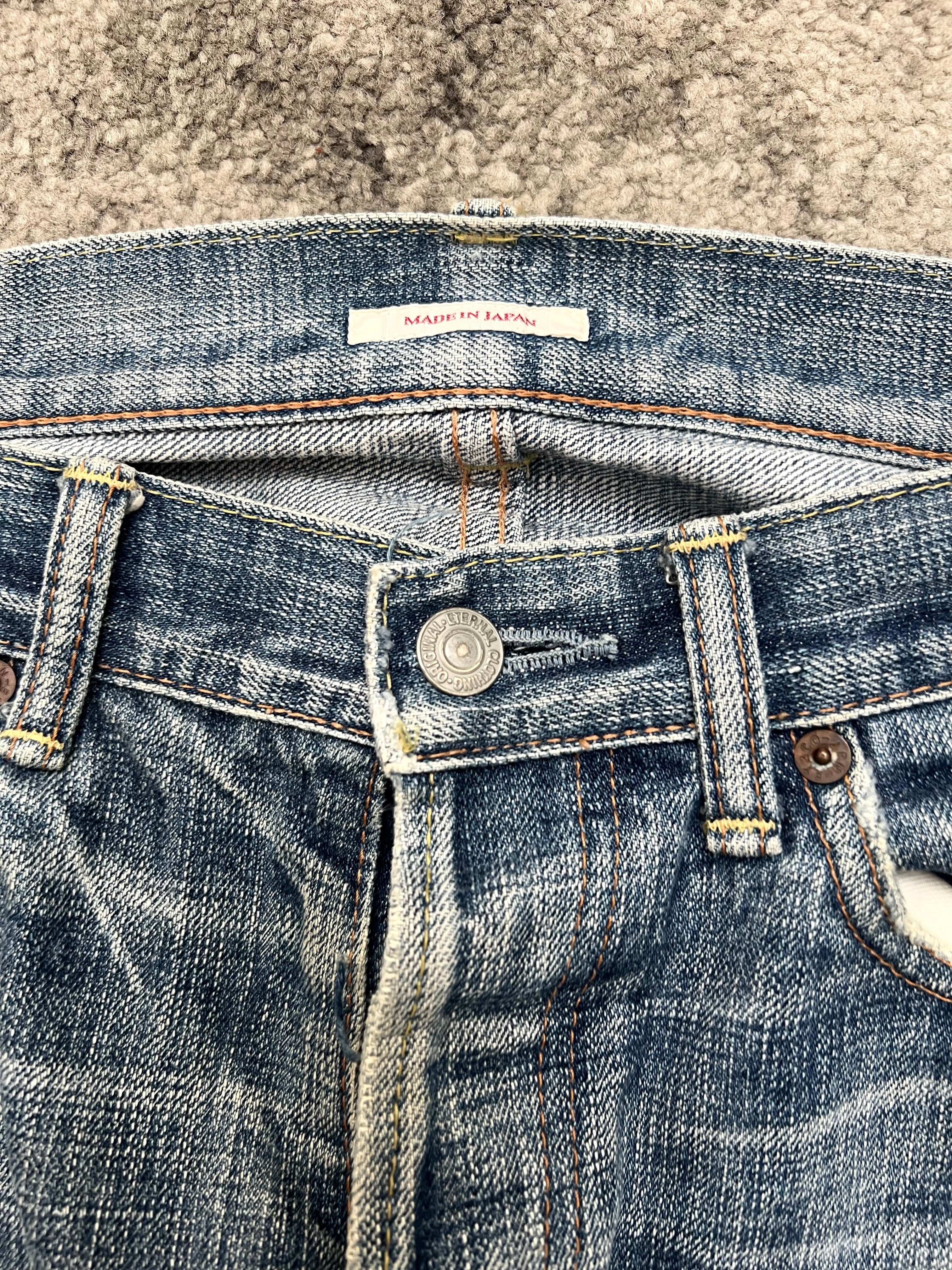 Condition: Pre-loved with strong fading, whiskers, and distressed knee abrasions. Naturally aged, no artificial gimmicks.