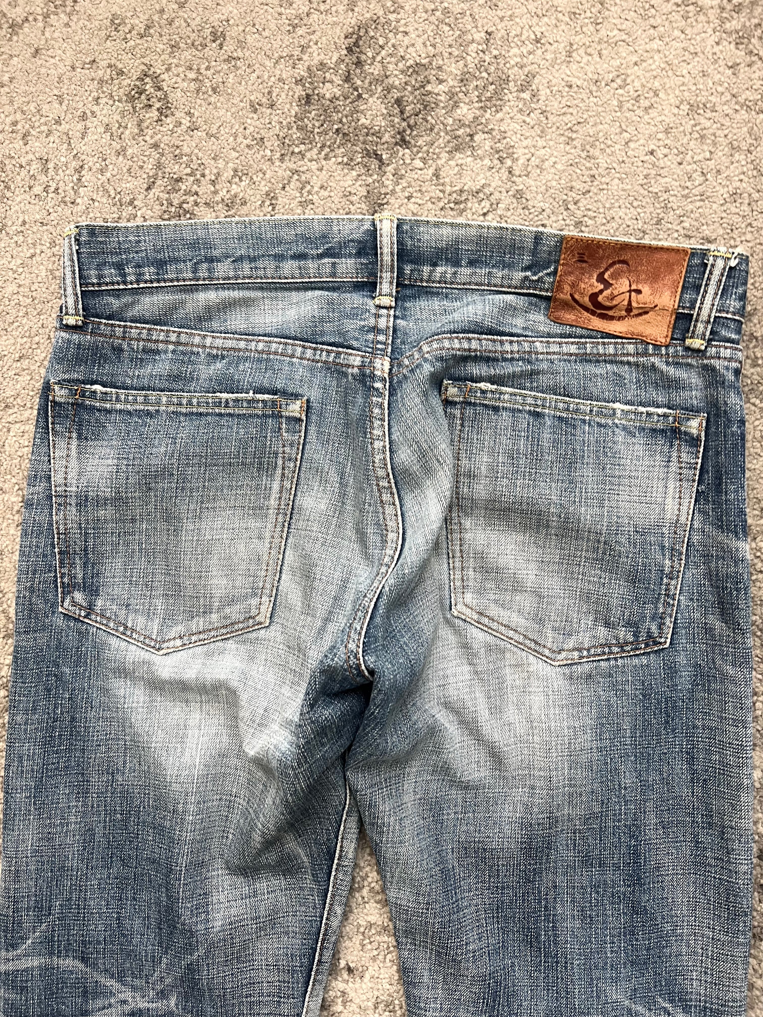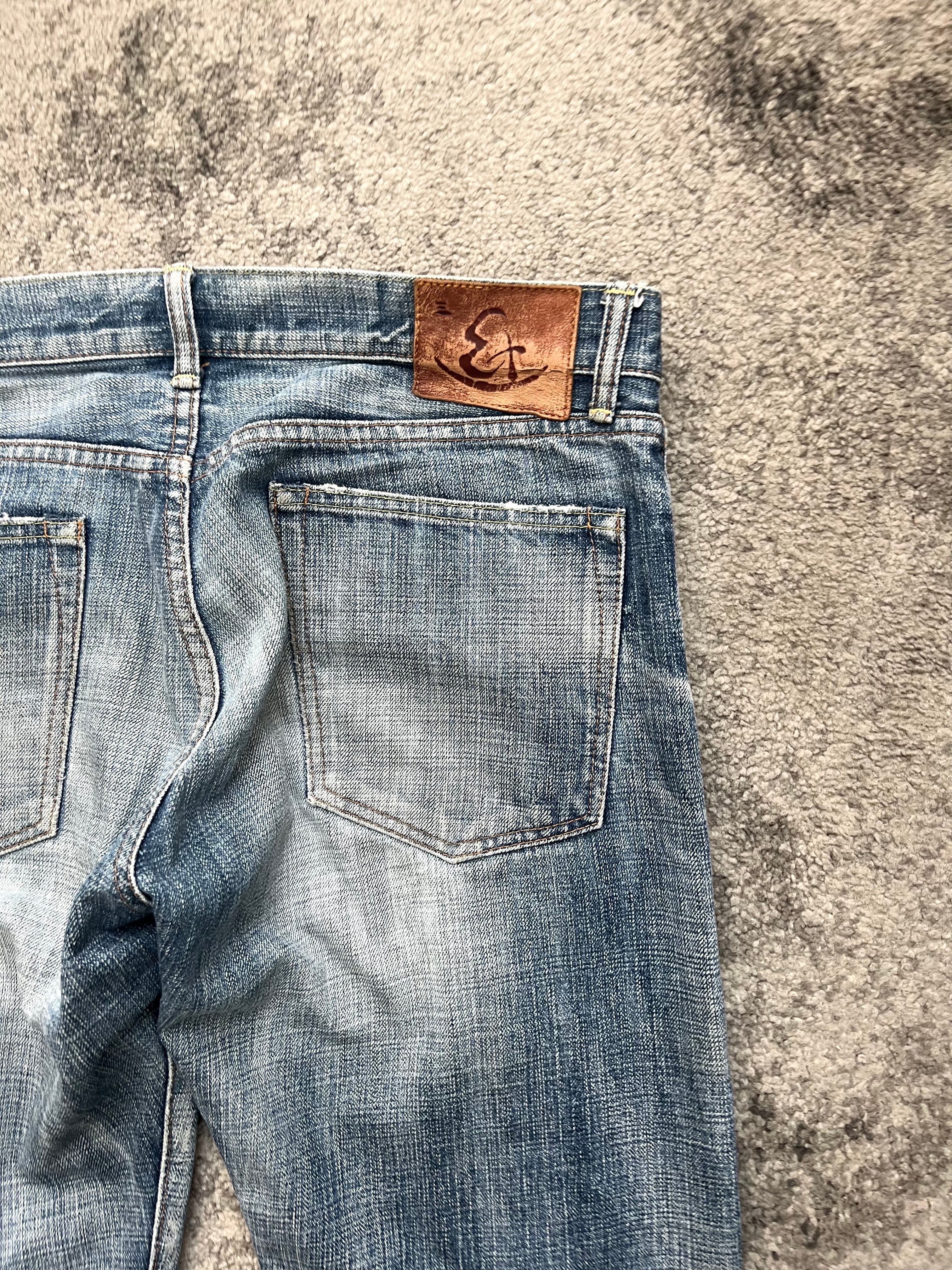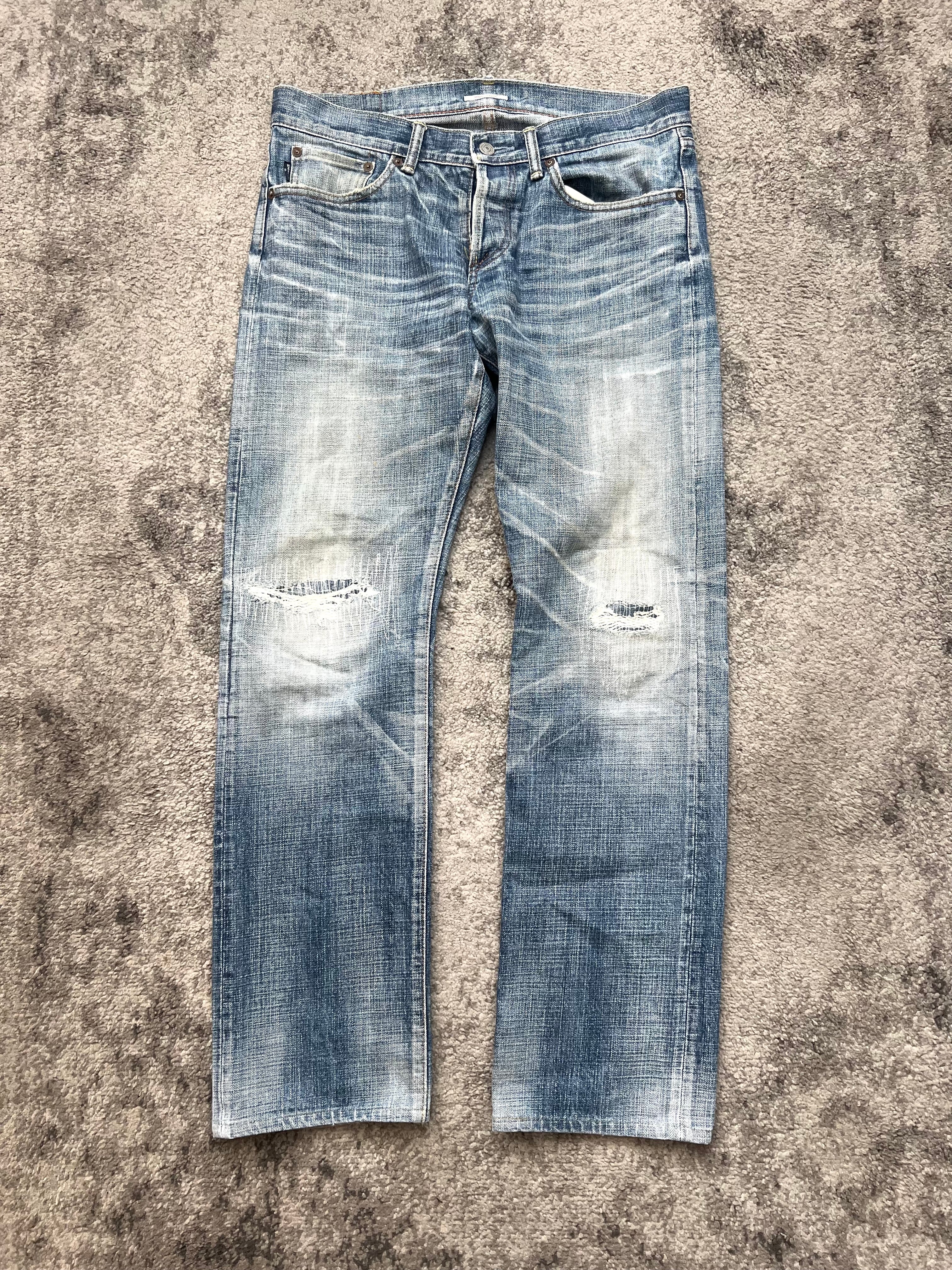 Condition: Pre-loved with strong fading, whiskers, and distressed knee abrasions. Naturally aged, no artificial gimmicks.