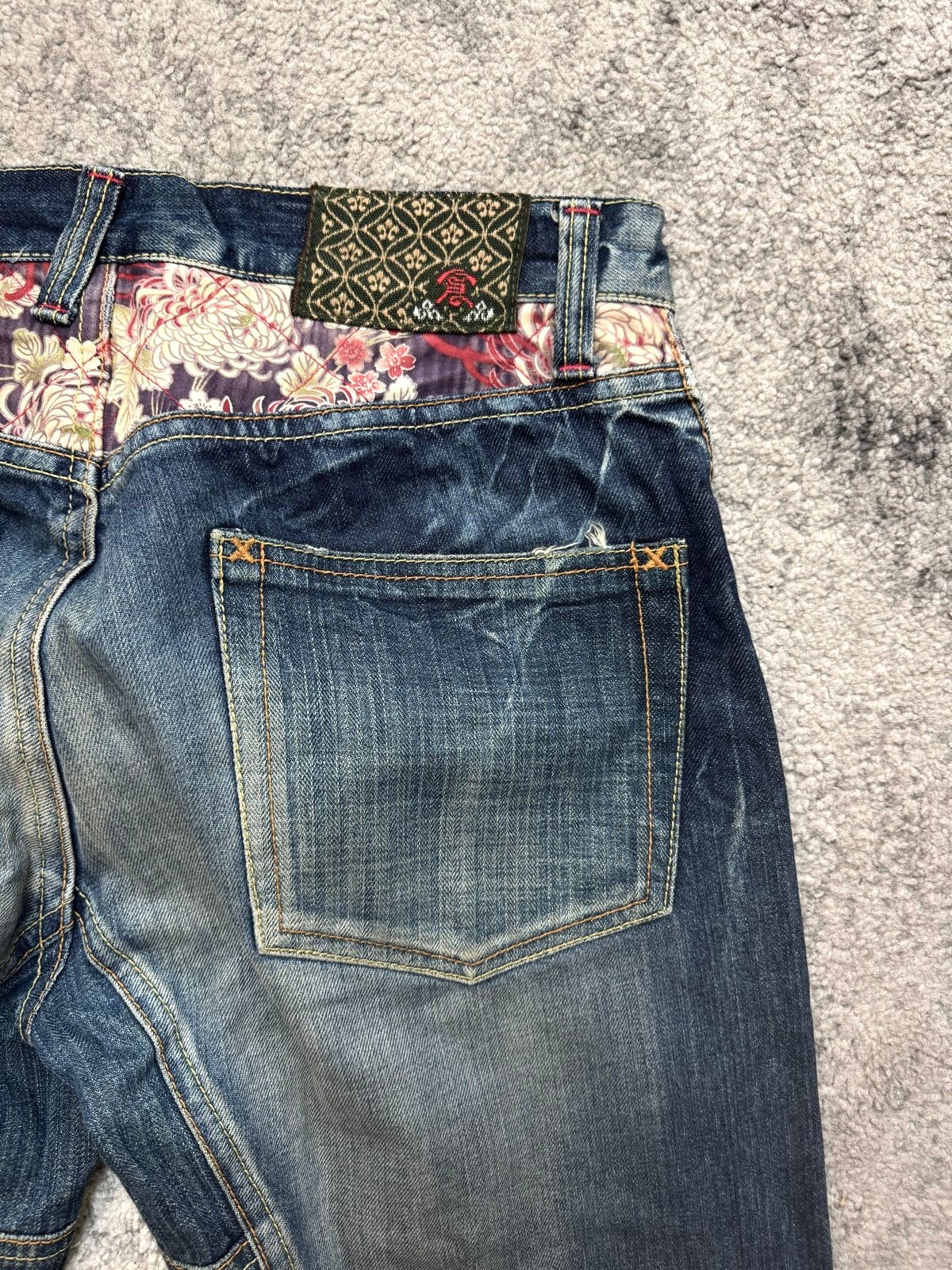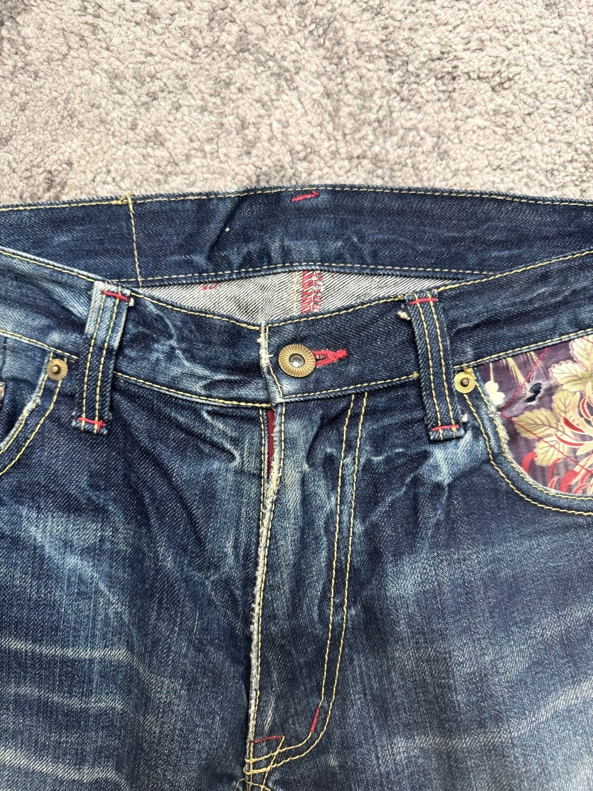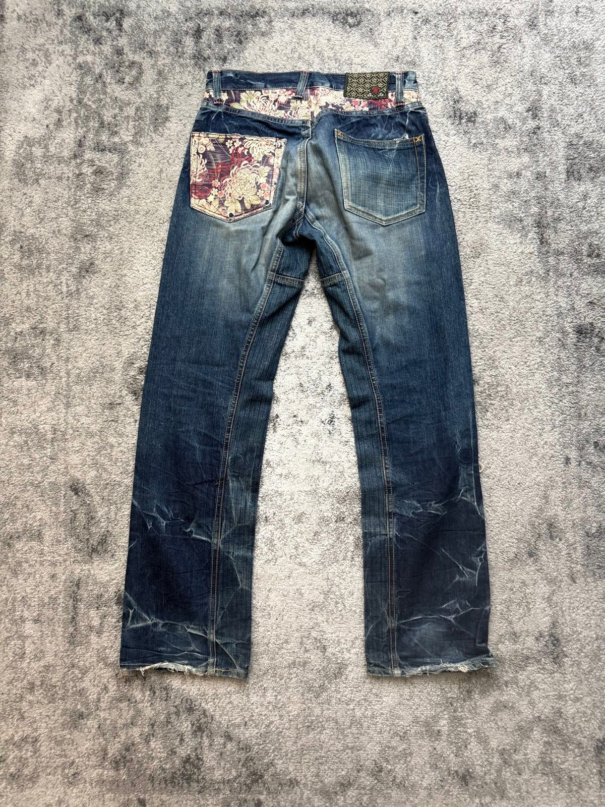 Midweight Japanese selvedge denim. Indigo base with high-contrast fades and whiskering. Reinforced with floral cotton lining at distress points.