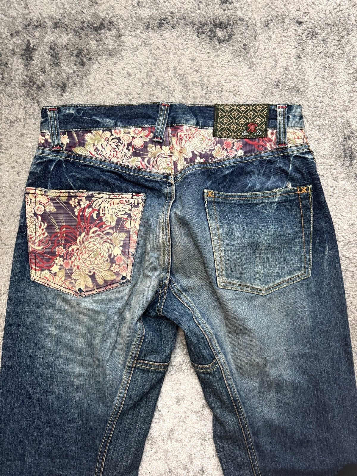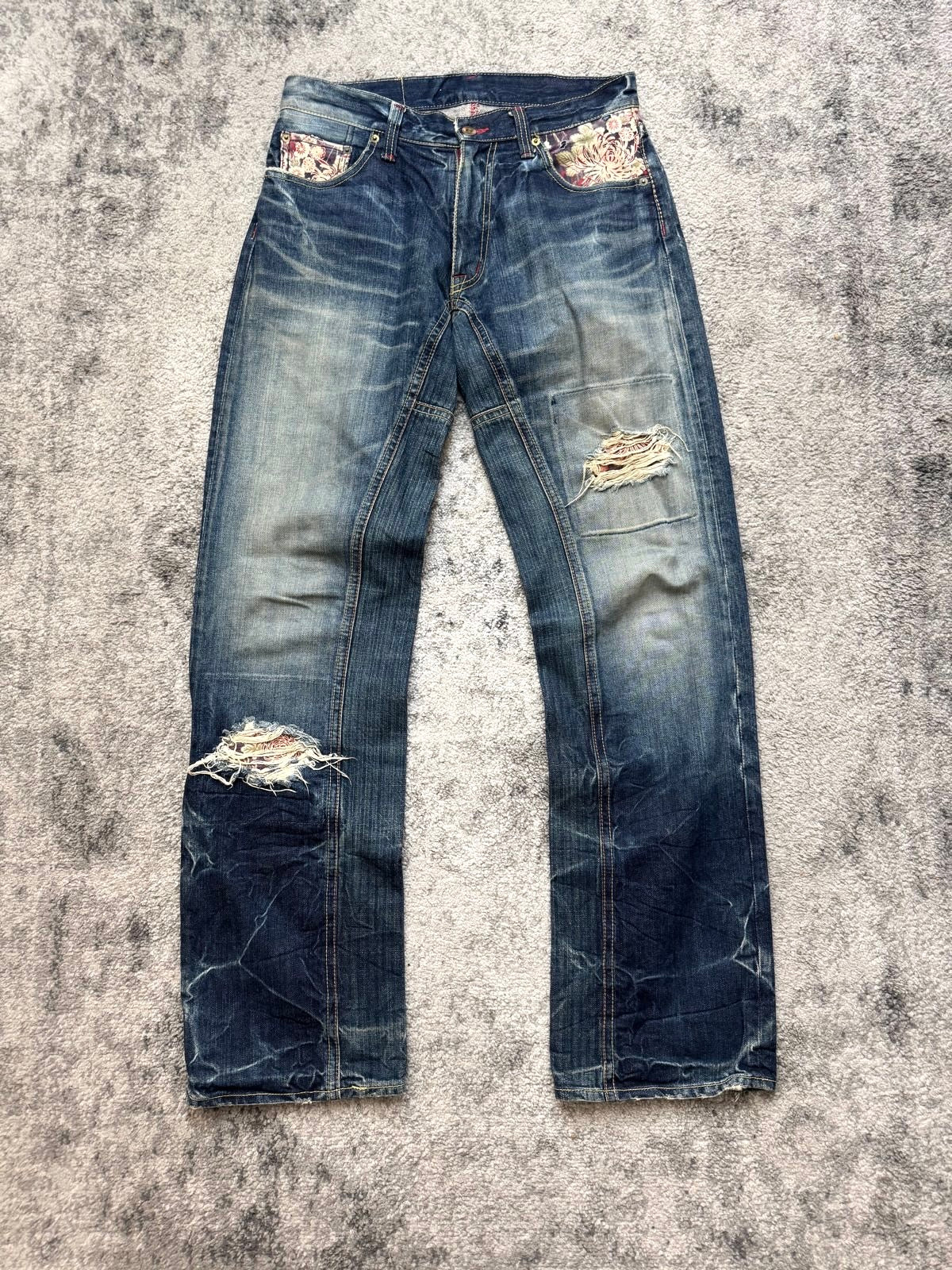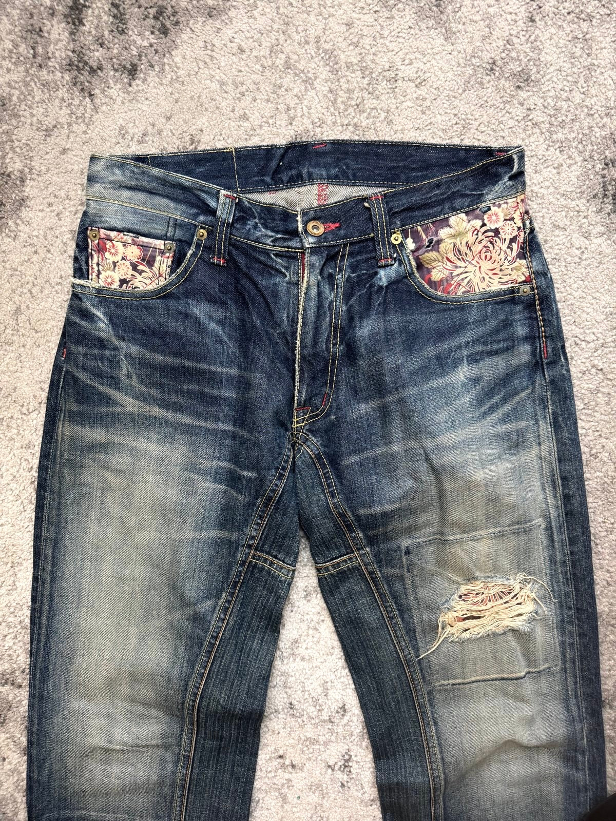 Midweight Japanese selvedge denim. Indigo base with high-contrast fades and whiskering. Reinforced with floral cotton lining at distress points.