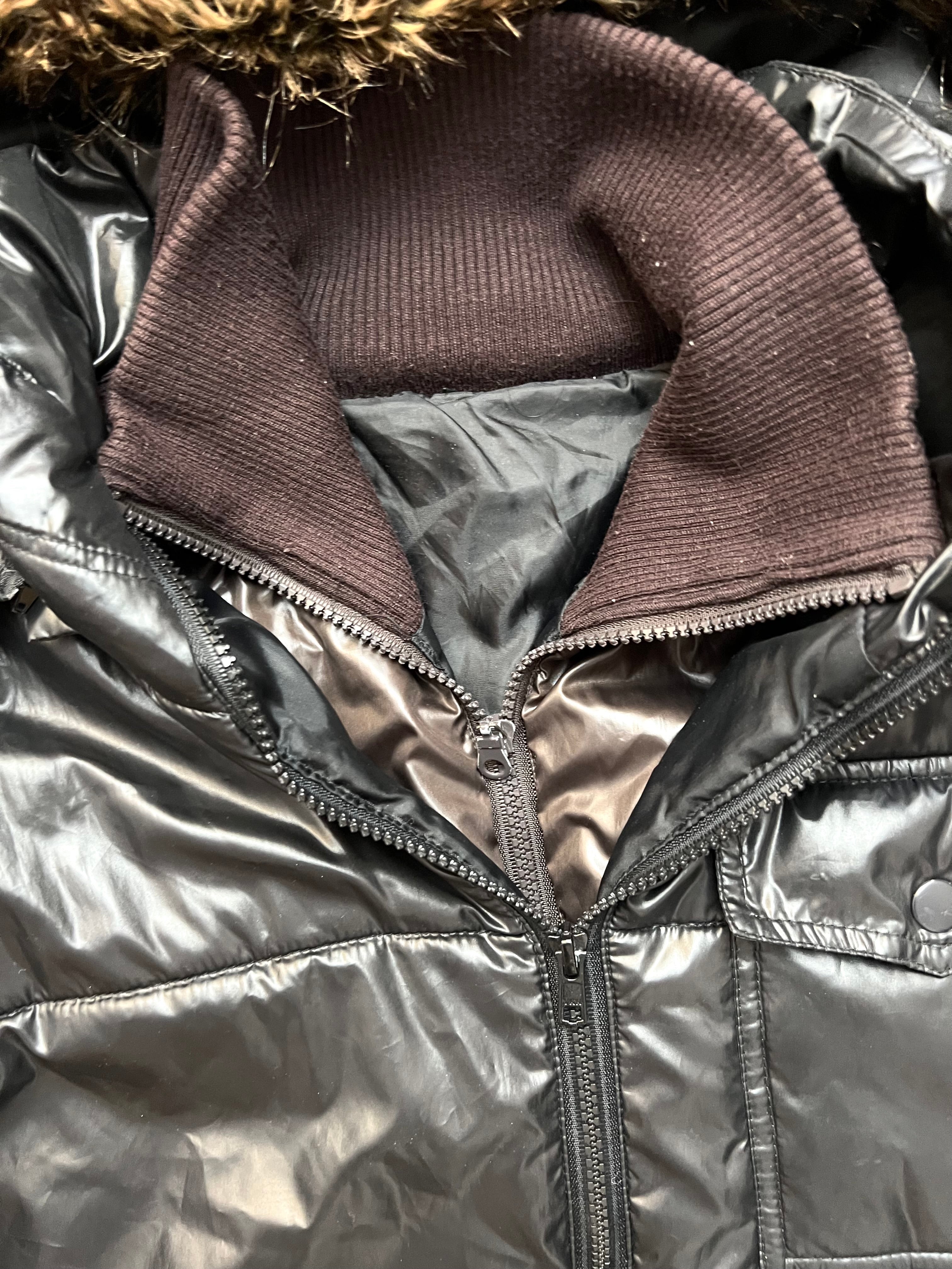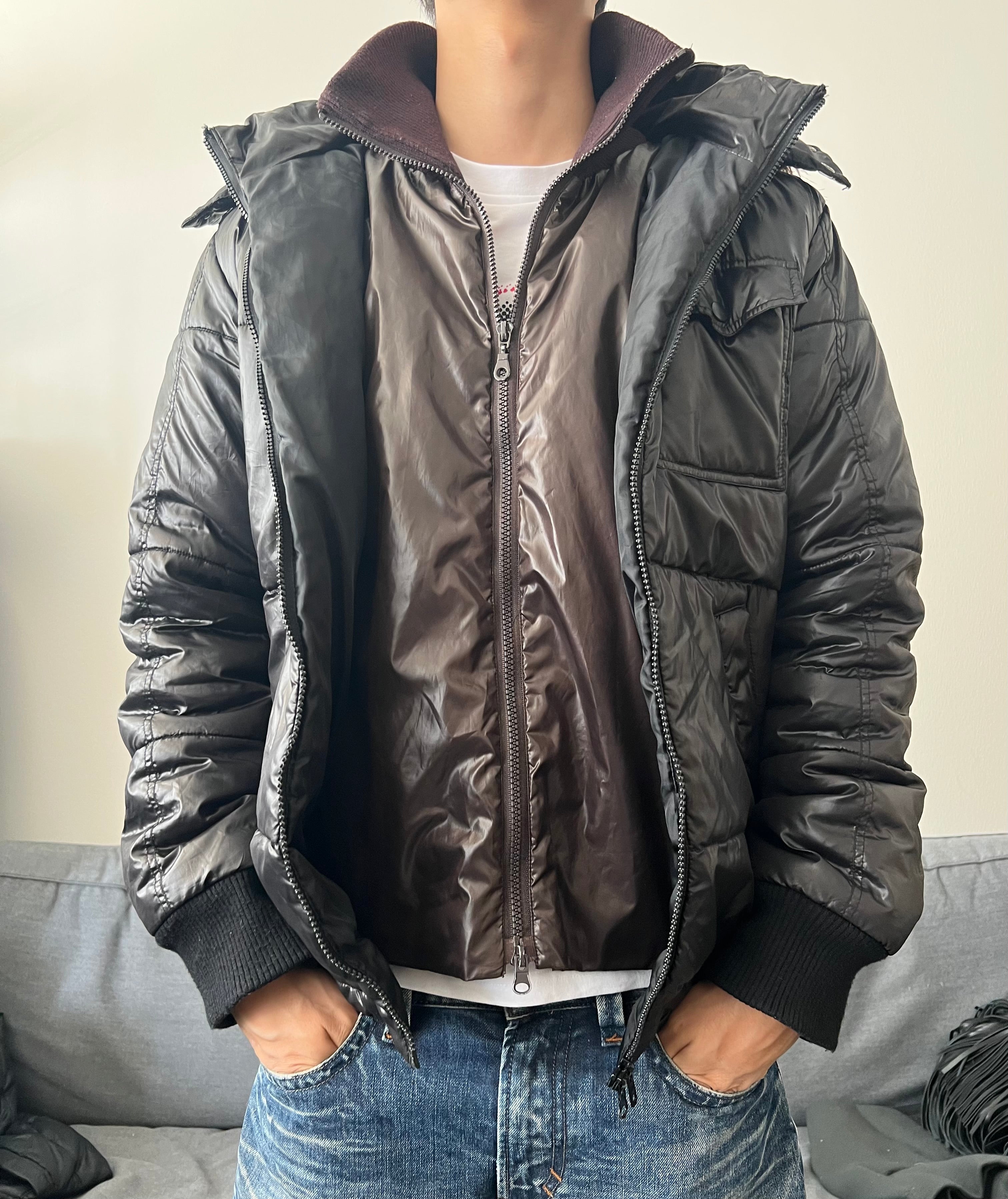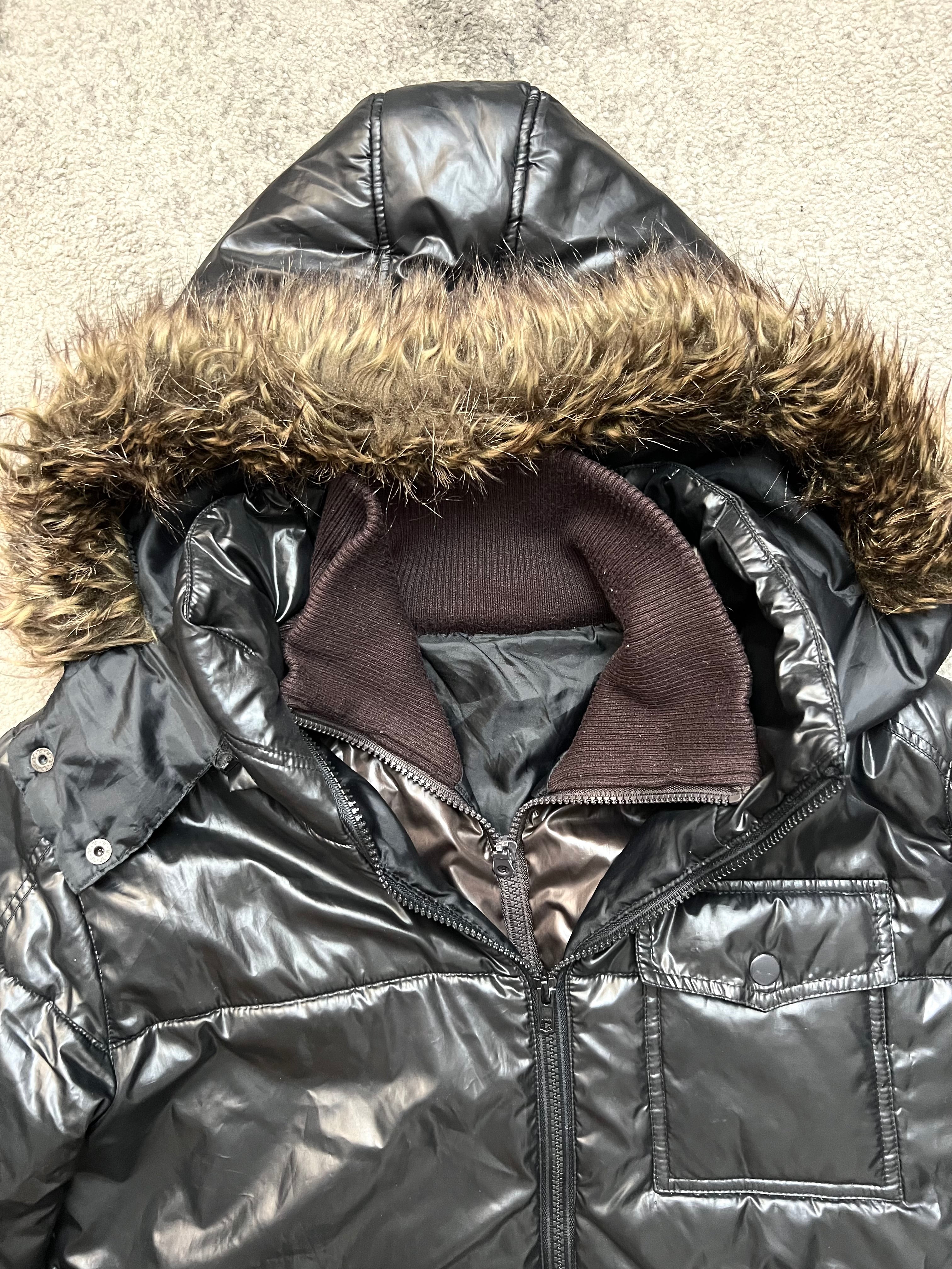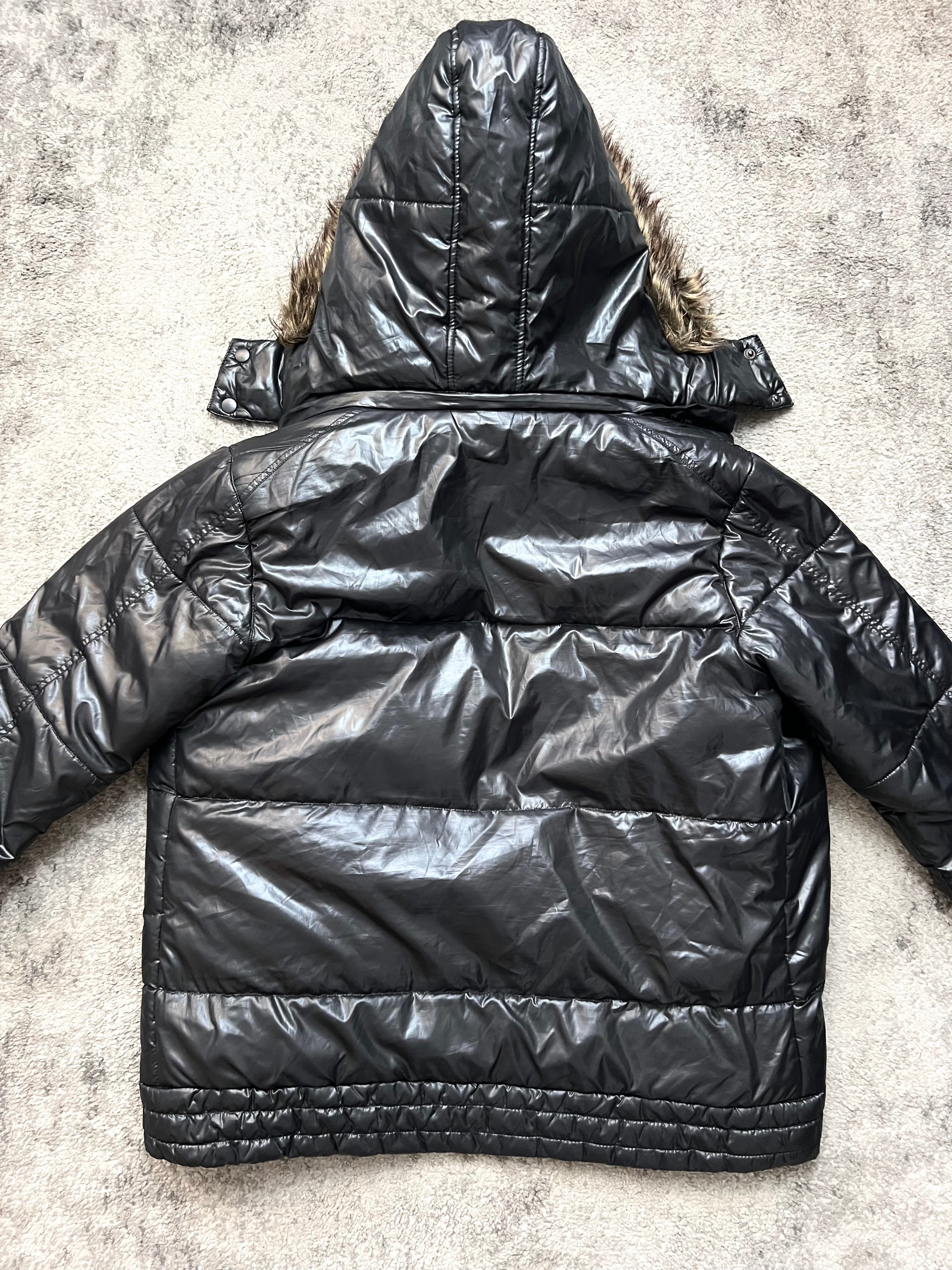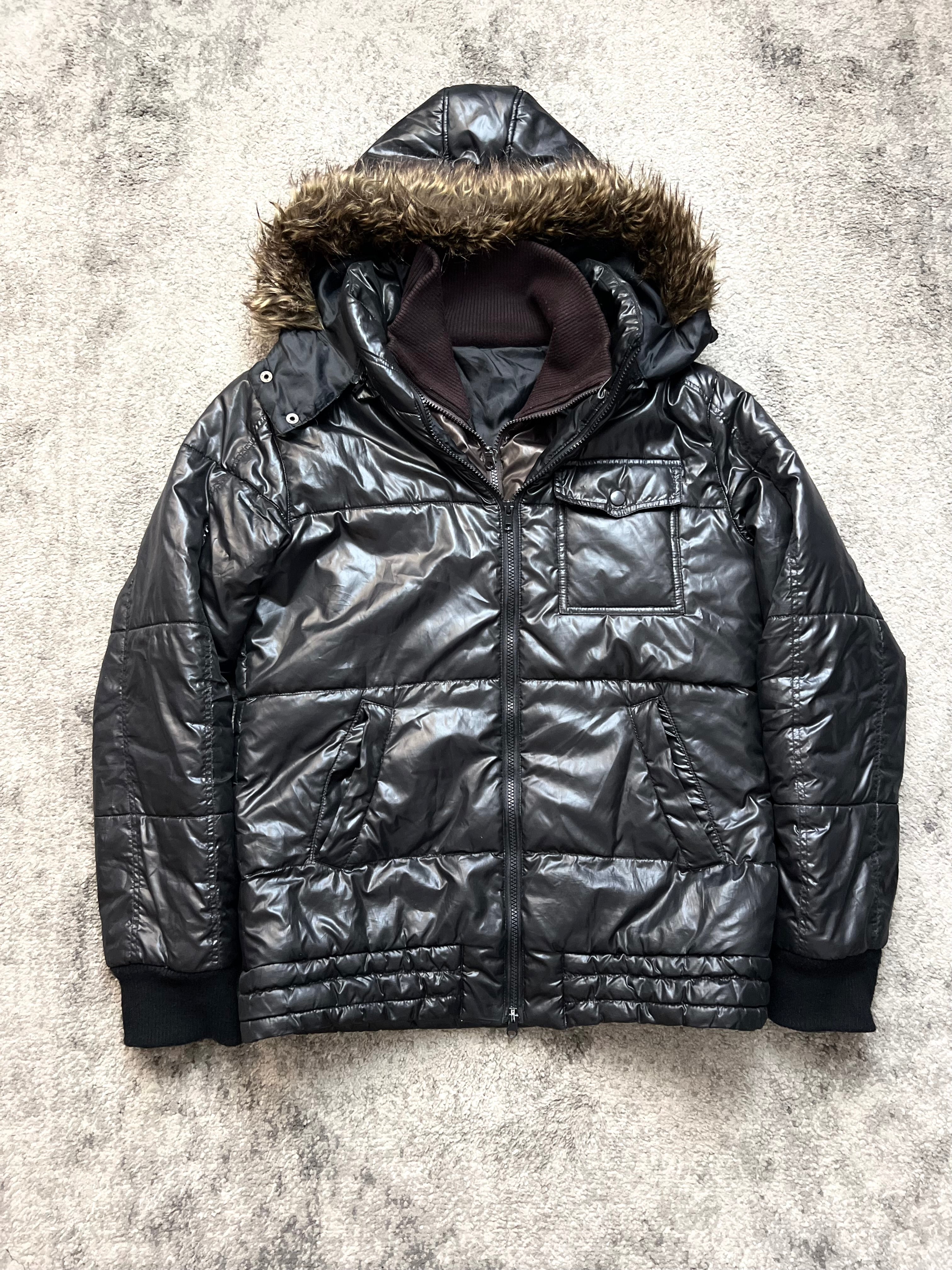 Rare Japanese outerwear piece by Exhibitionist, crafted in a glossy black shell with a subtle crinkle finish. Midweight padding offers warmth without the bulk, while the detachable faux-fur hood detail adds a rugged, early-2000s Harajuku edge. Functional details include side-zip pockets, chest flap pocket, ribbed cuffs, and an inner collar layer for extra insulation.