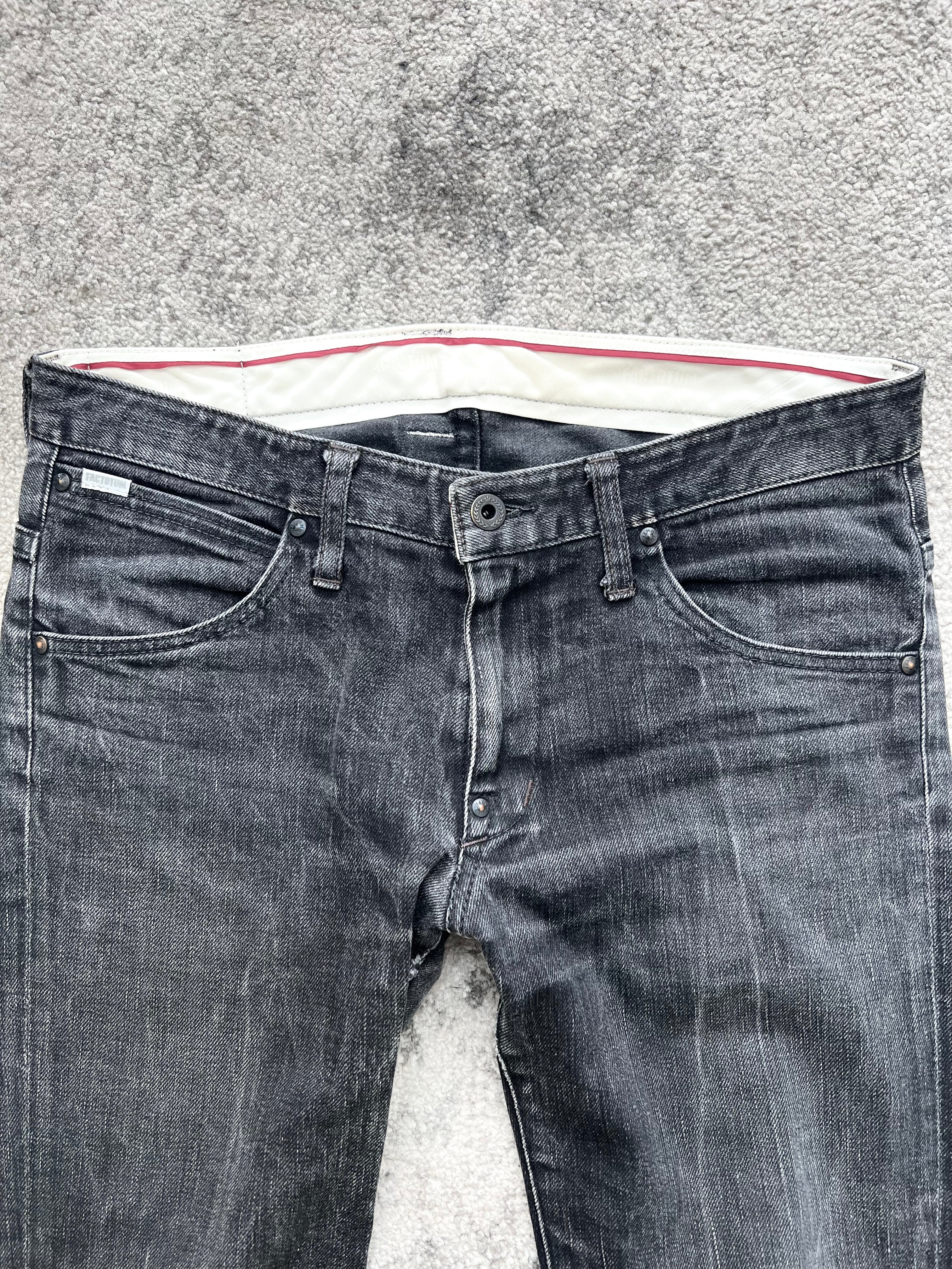 Straight slim fit with softened crease fades and tonal topstitching. Classic 5-pocket setup with minimal branding and understated details. FACTOTUM patch on back waistband, curved rear pocket seams for a hint of structure.