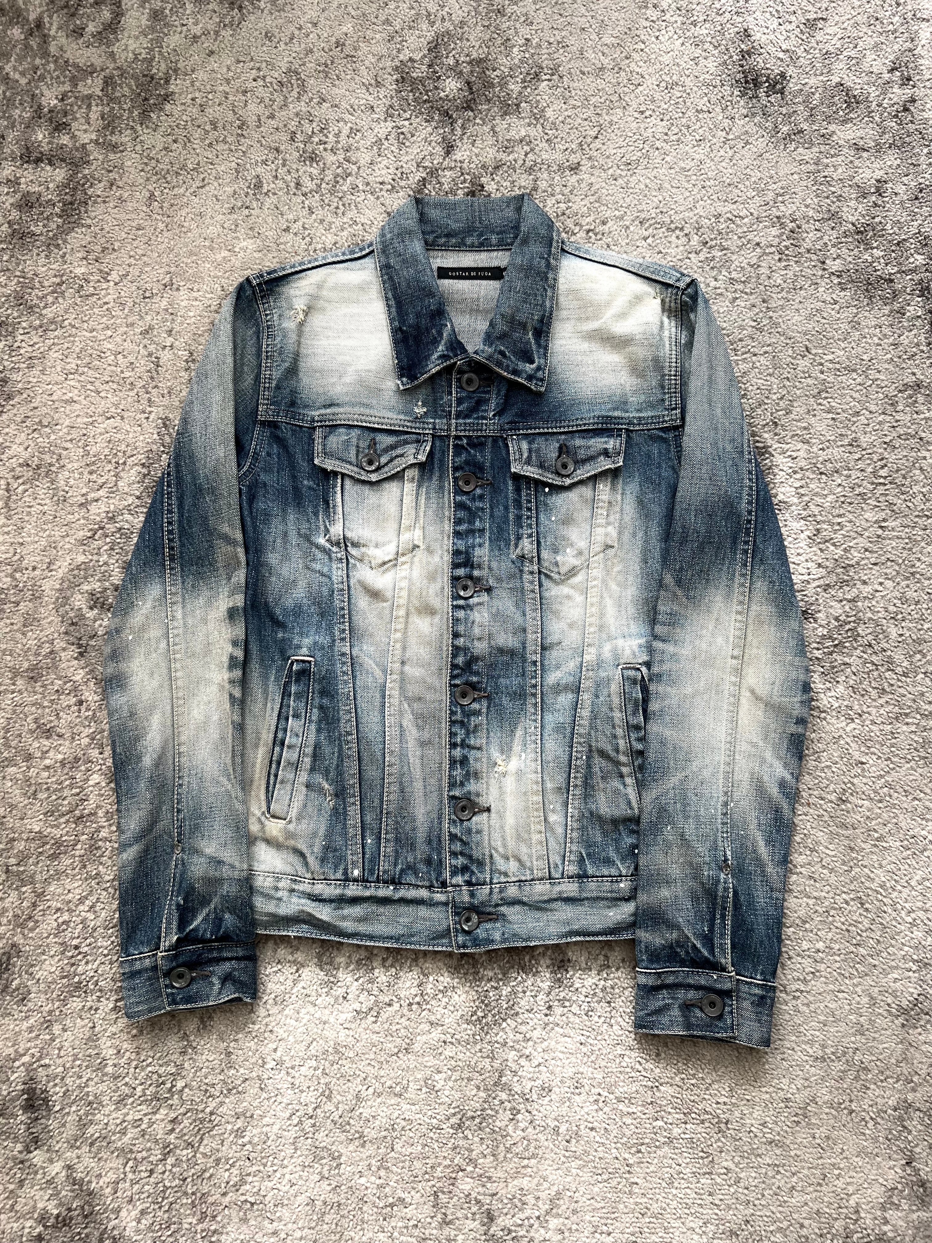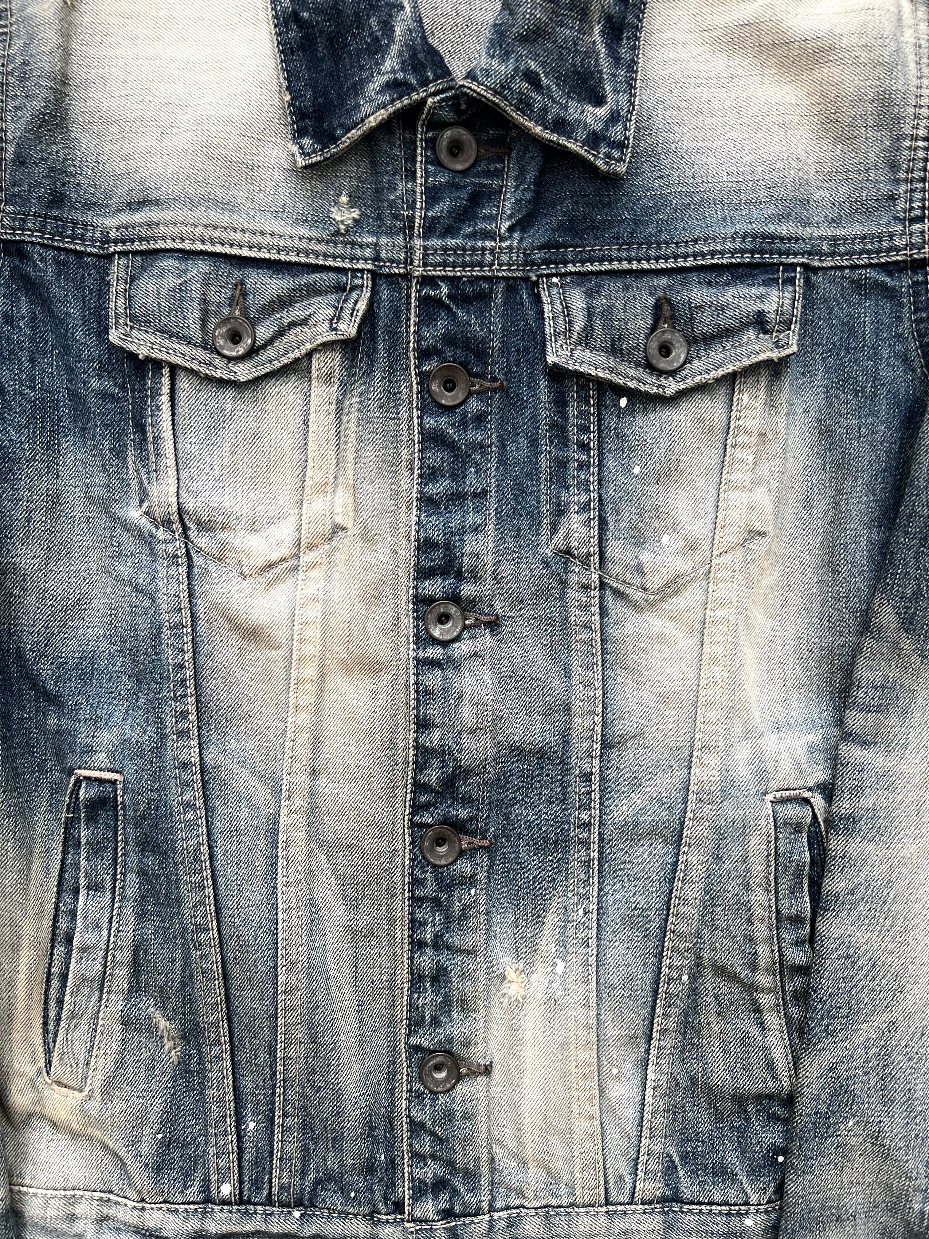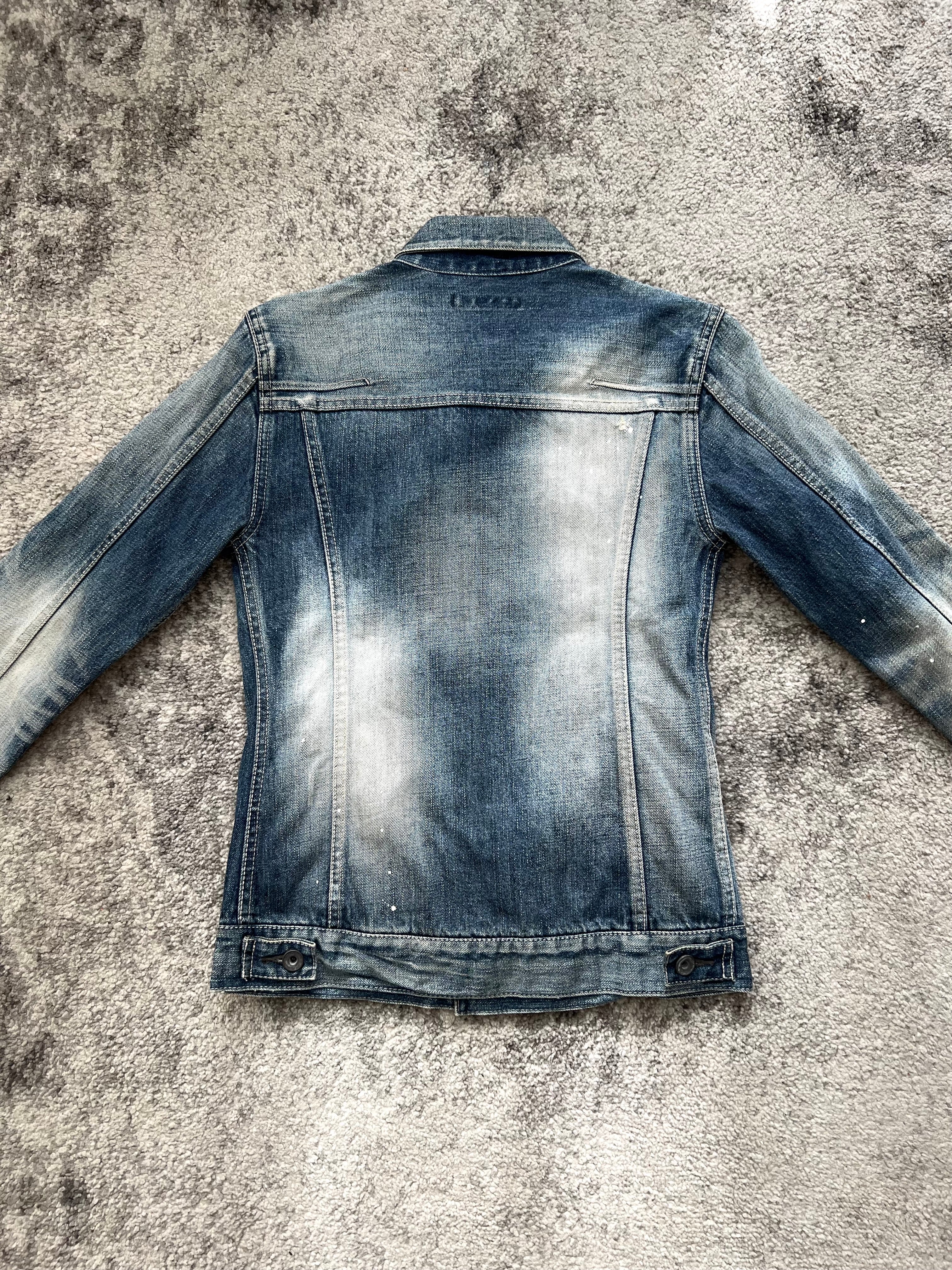 Classic trucker silhouette with a straight fit. Ice-toned fade on indigo base – distressed but composed. Like vintage Dior Homme but dipped in isolation. Perfect with flared trousers, boots, stillness.