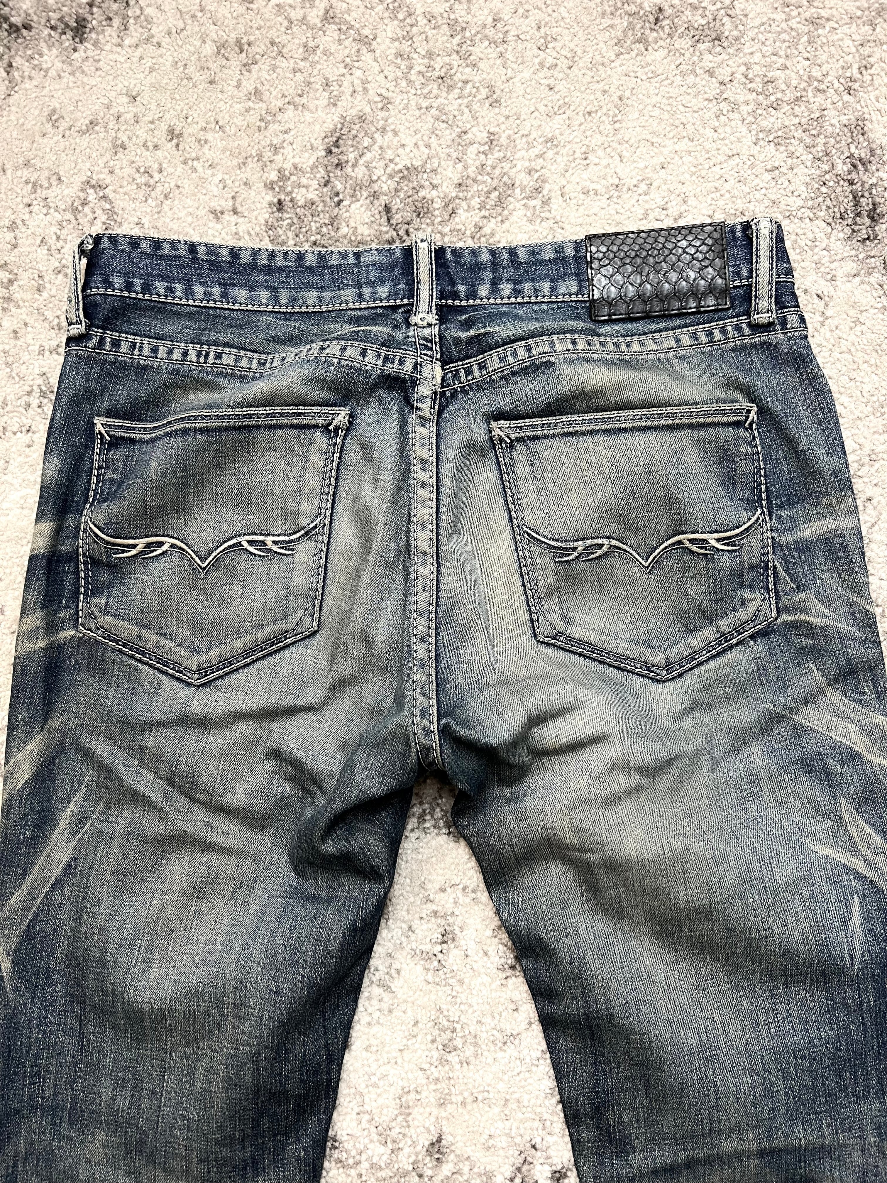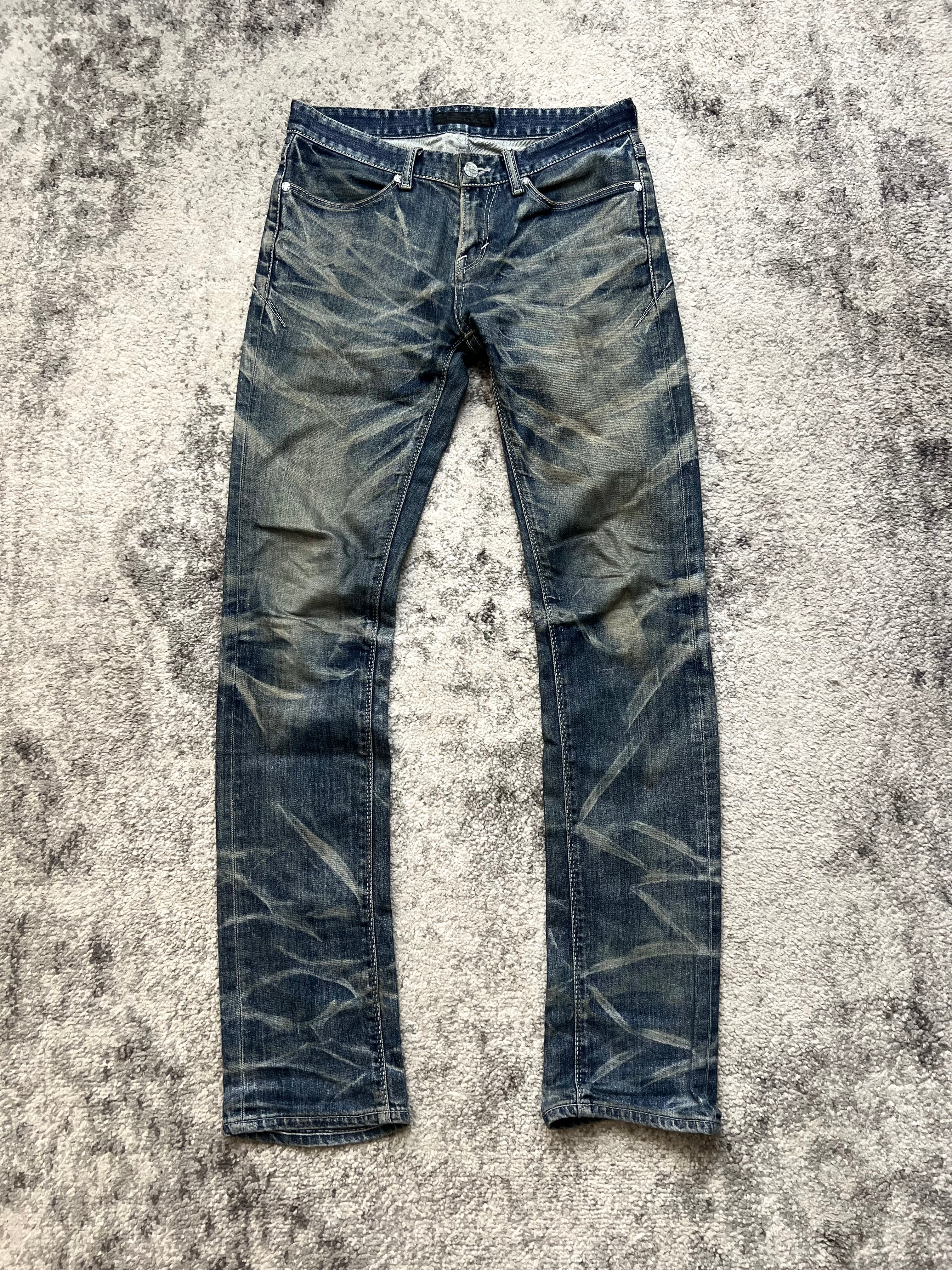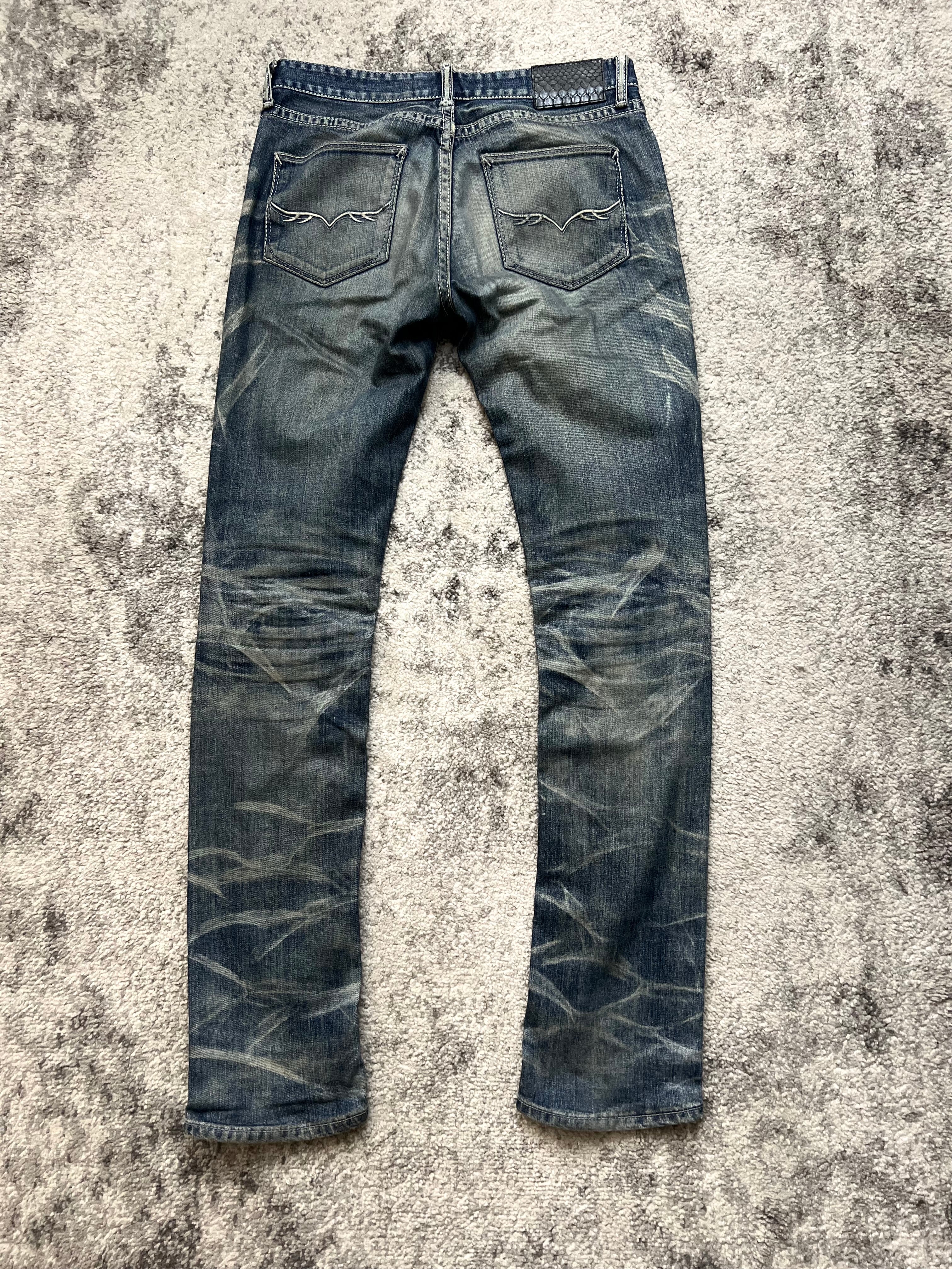 Japanese stretch denim – strong but flexible. Whiskered fade across thighs and knees, custom washed for high contrast.